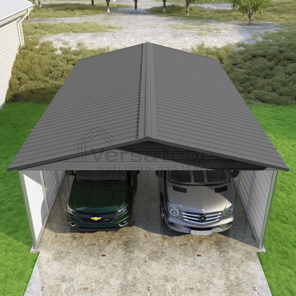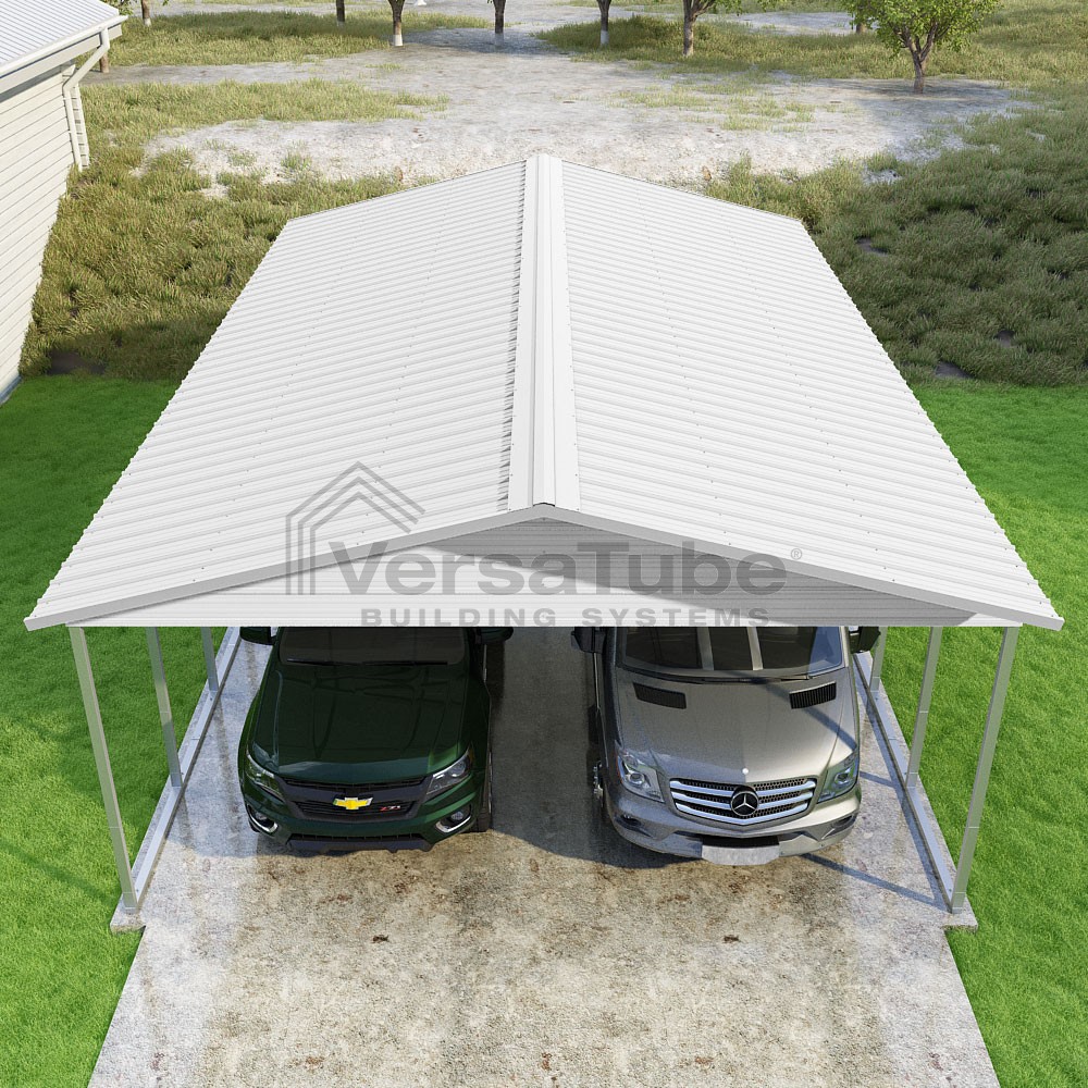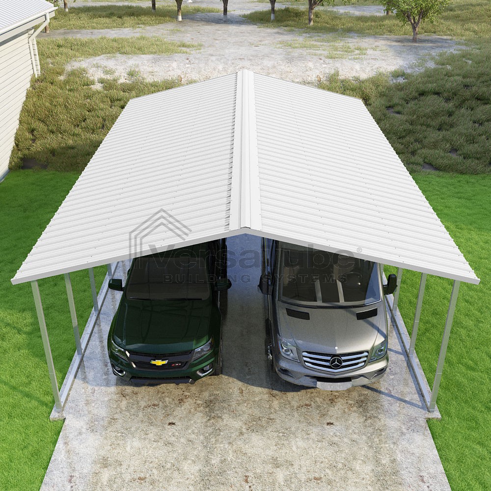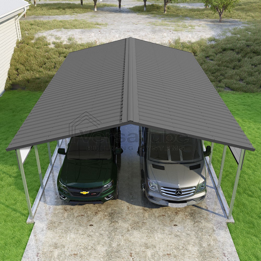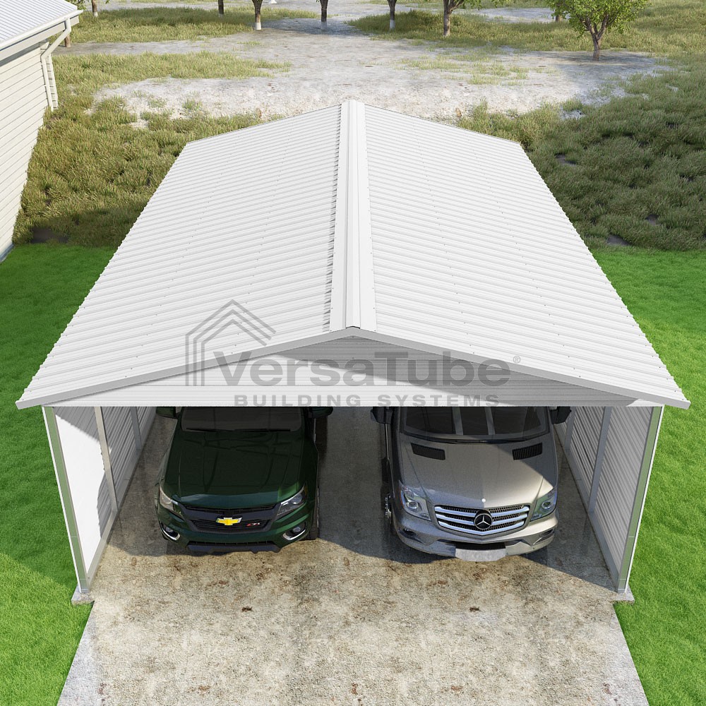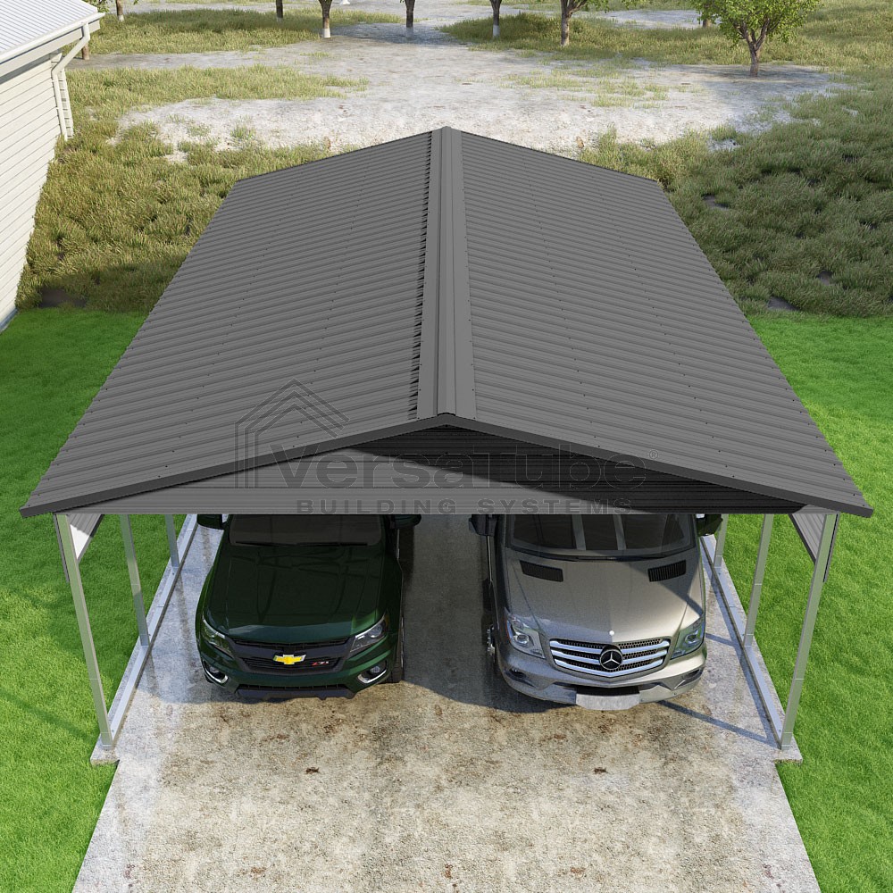 Pinnacle Series DIY carport kit features vertical sheet metal roof panels with ridge cap, gable and eave trim for an A-frame roof style and extended coverage on both ends.