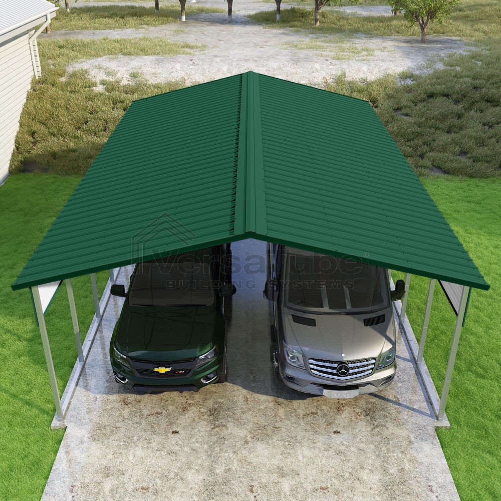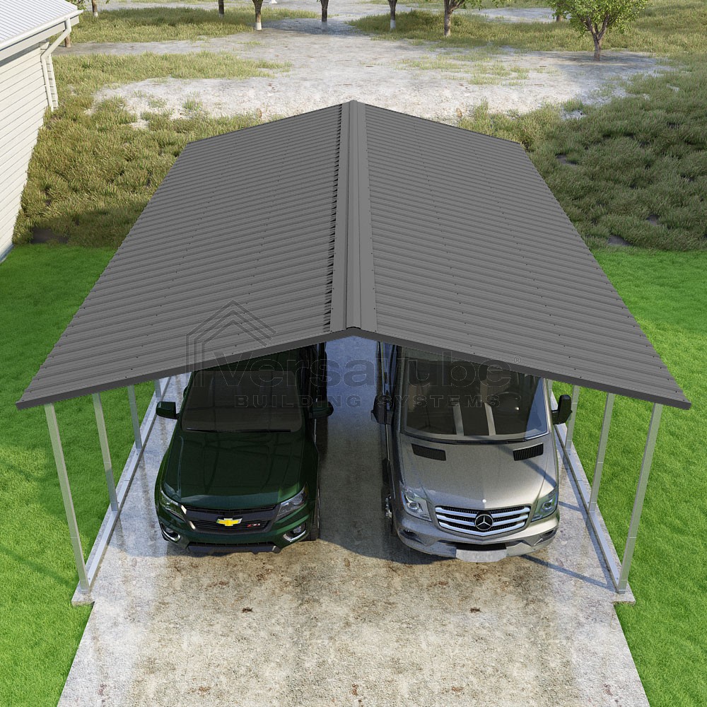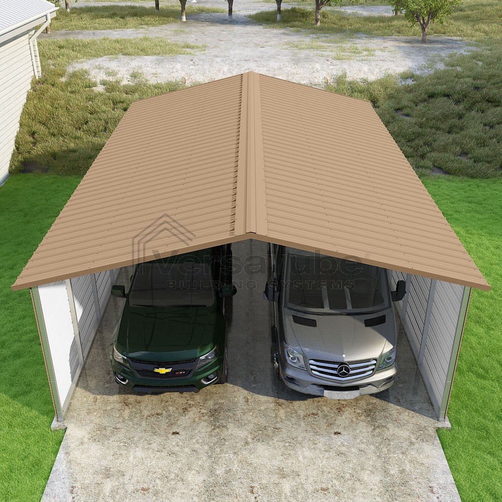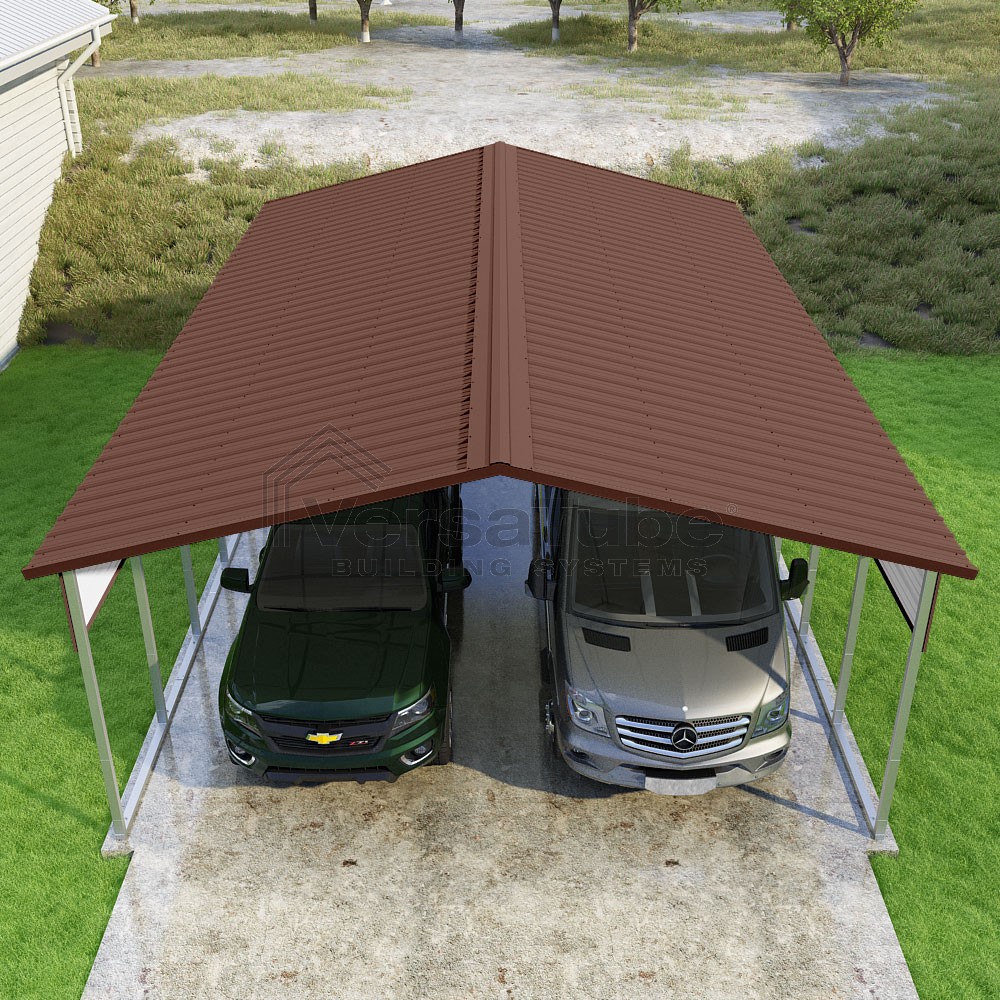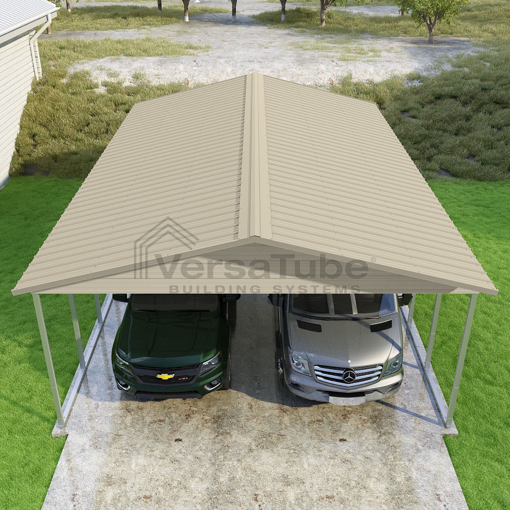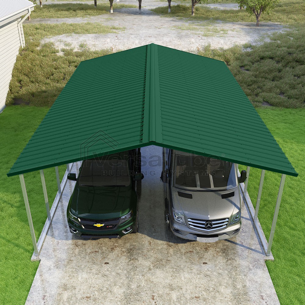 Pinnacle Series DIY carport kit features vertical sheet metal roof panels with ridge cap, gable and eave trim for an A-frame roof style and extended coverage on both ends.