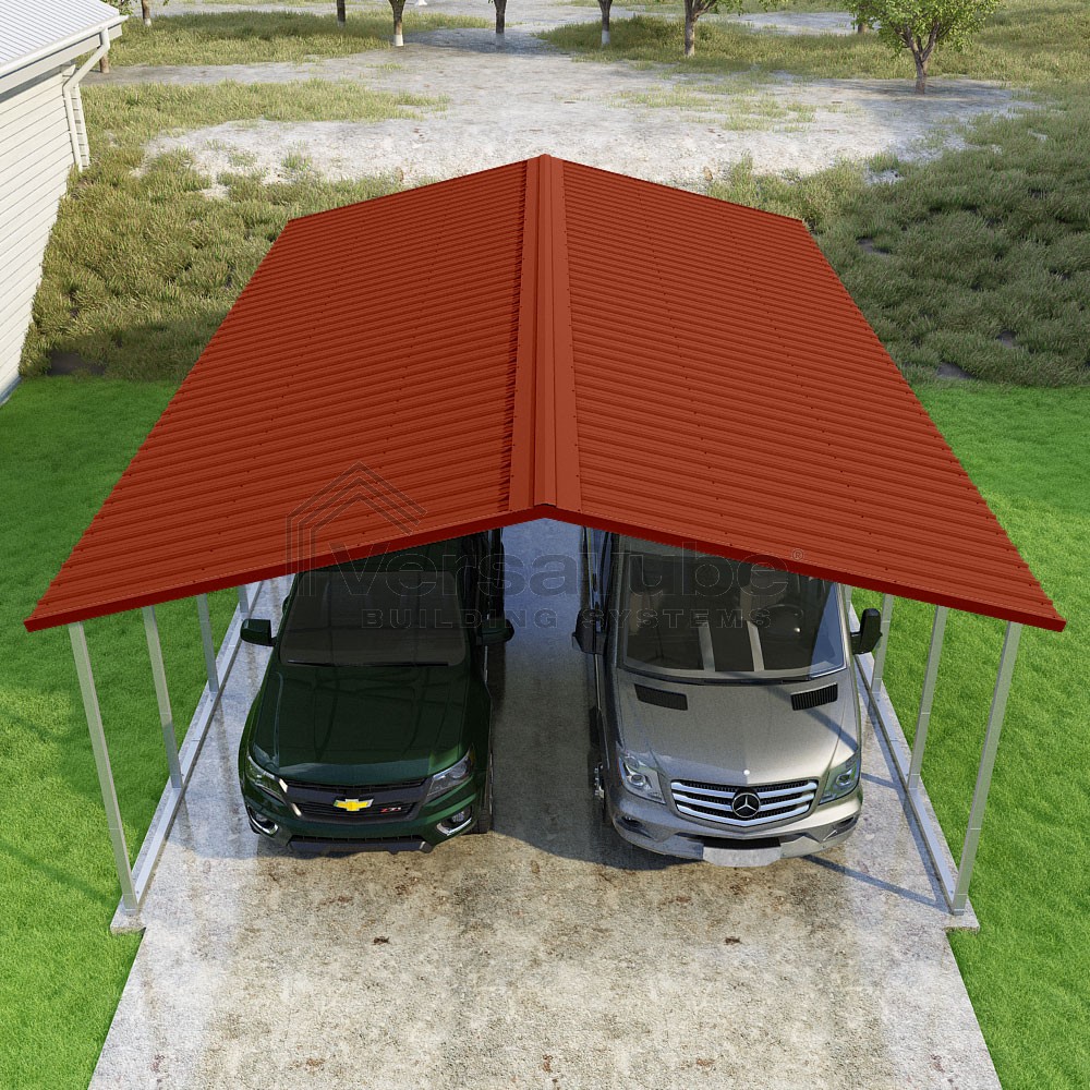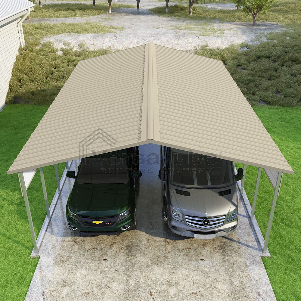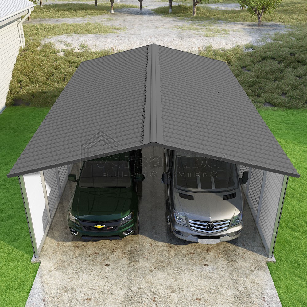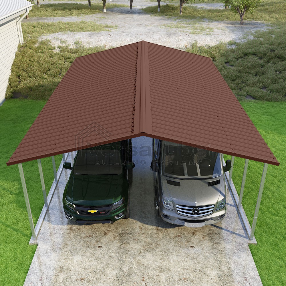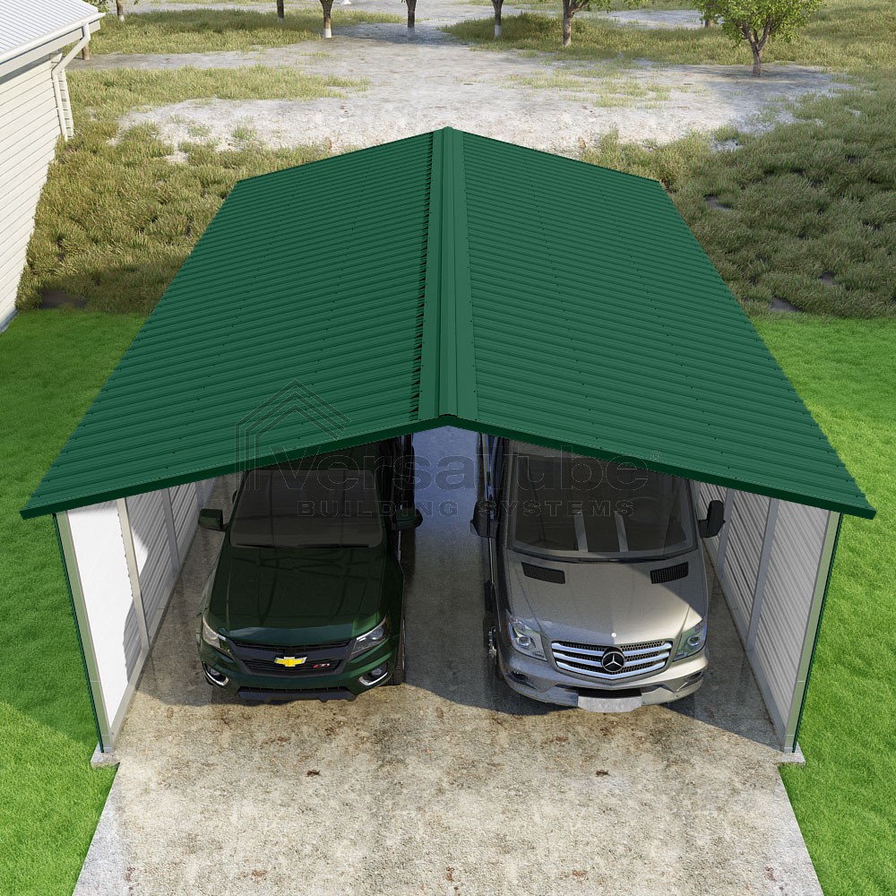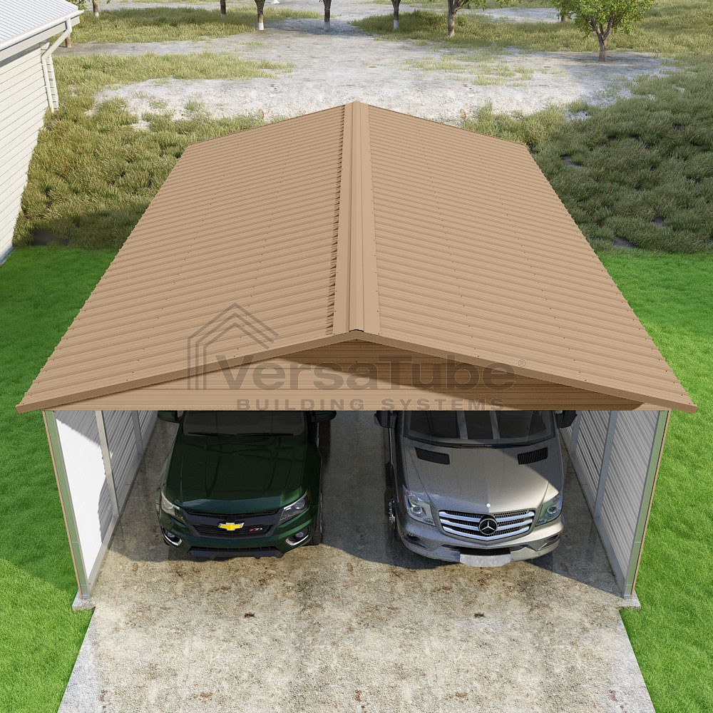 Pinnacle Series DIY carport kit features vertical sheet metal roof panels with ridge cap, gable and eave trim for an A-frame roof style and extended coverage on both ends.