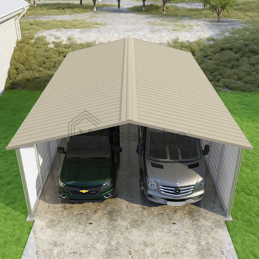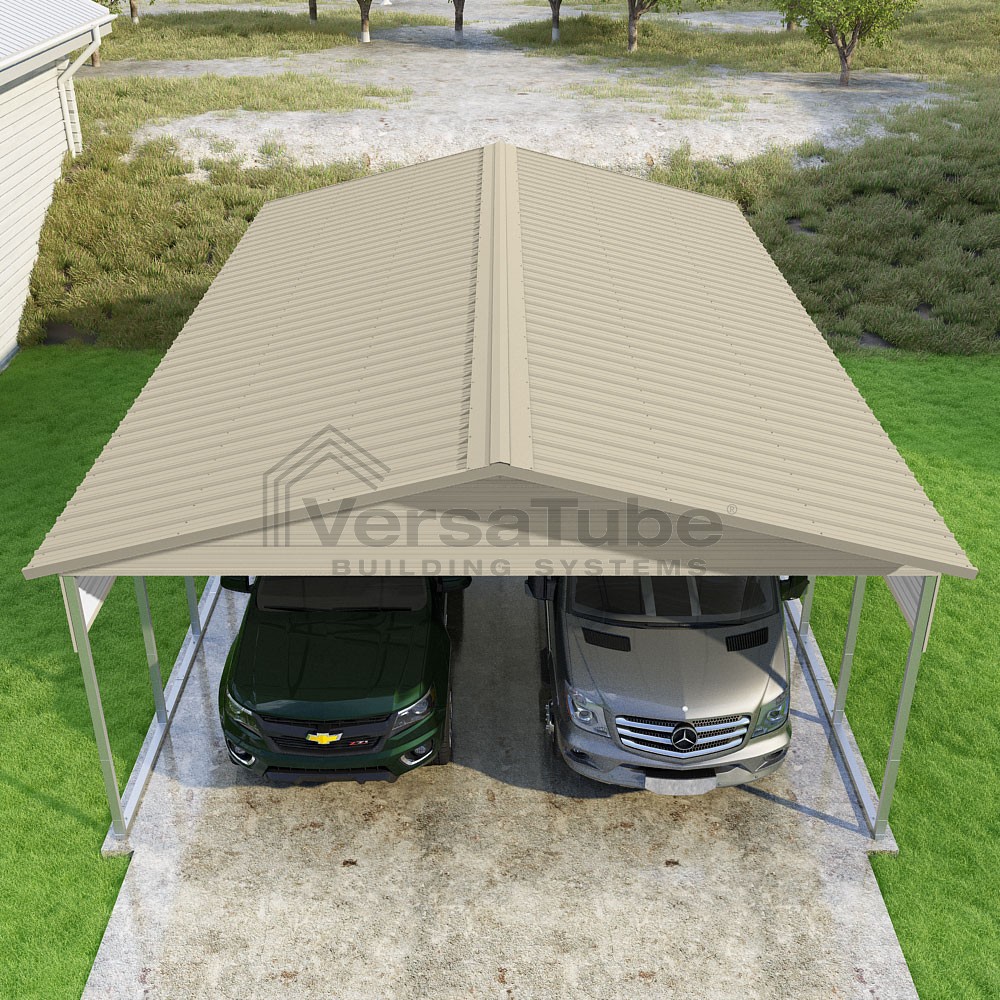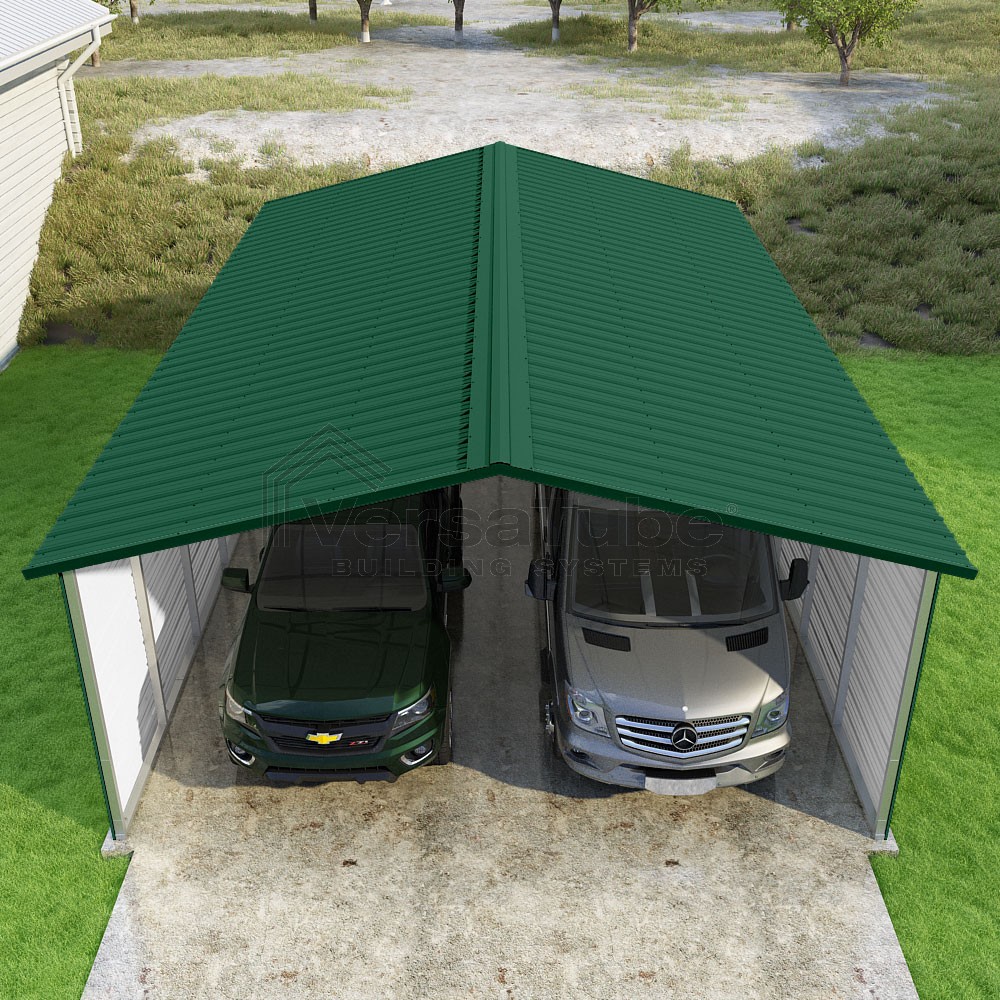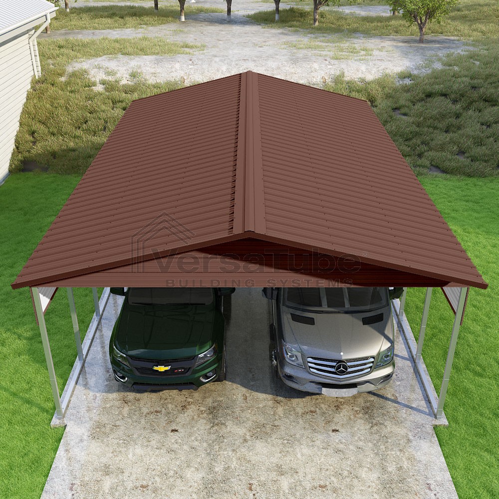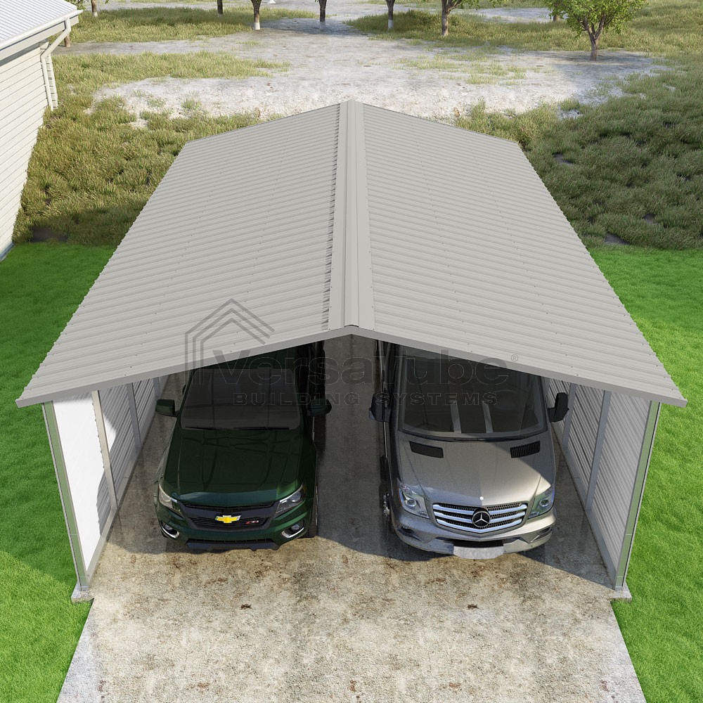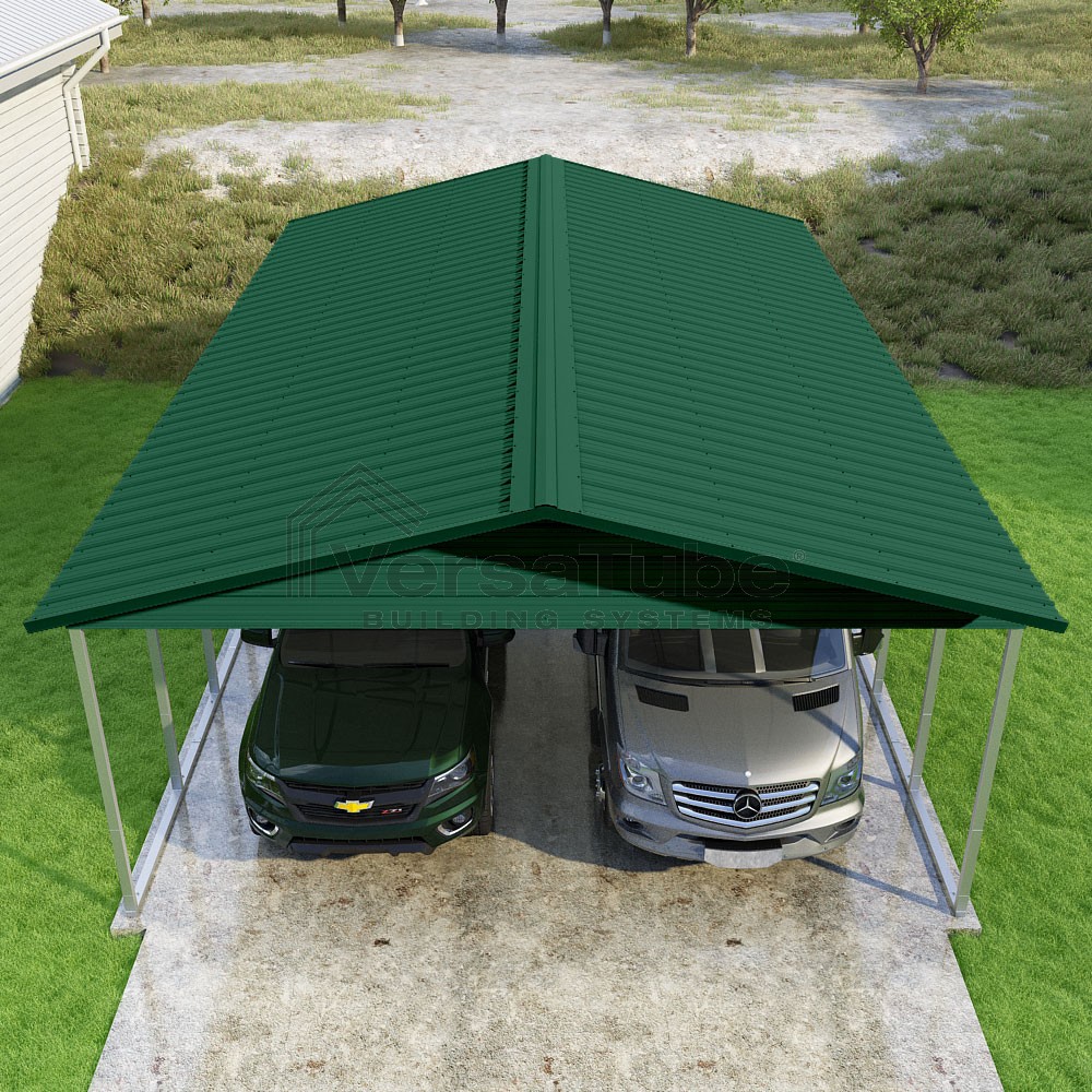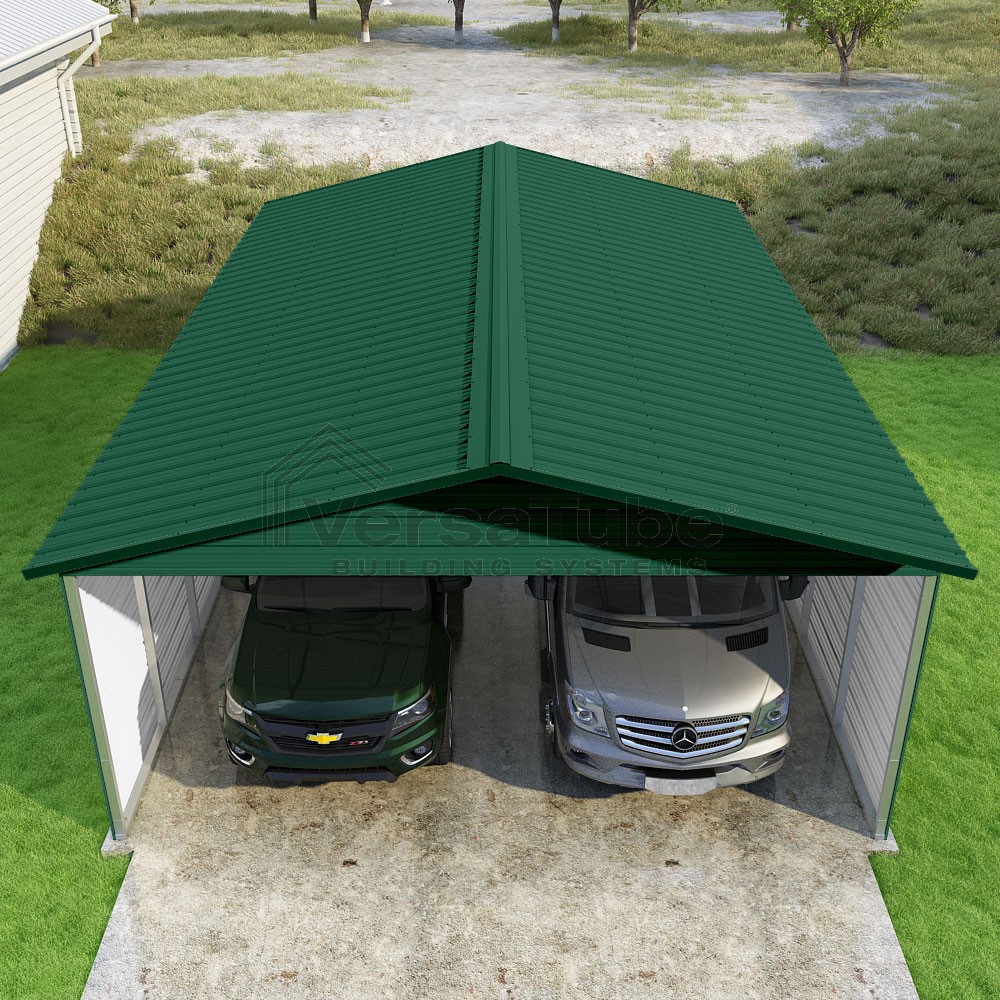 Pinnacle Series DIY carport kit features vertical sheet metal roof panels with ridge cap, gable and eave trim for an A-frame roof style and extended coverage on both ends.