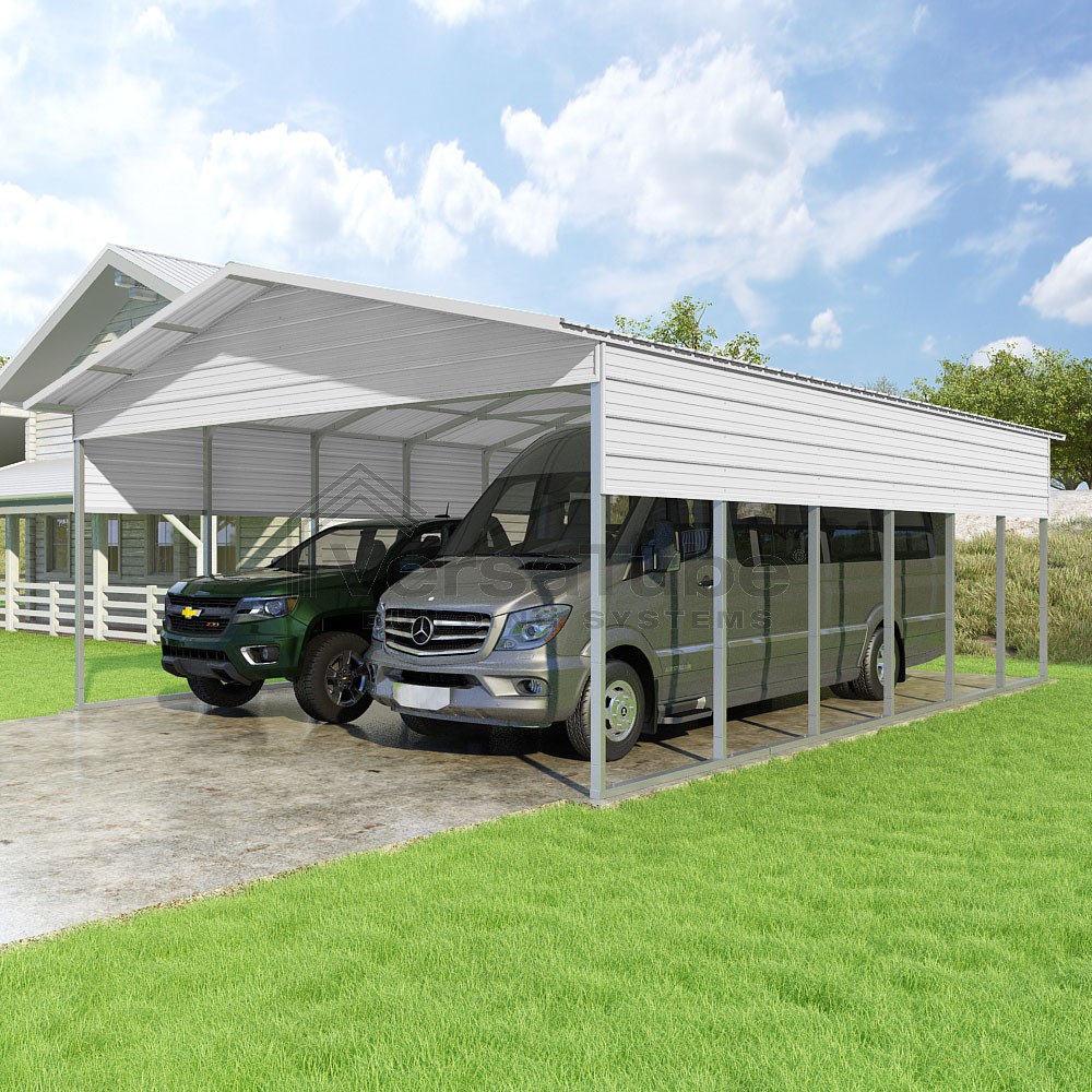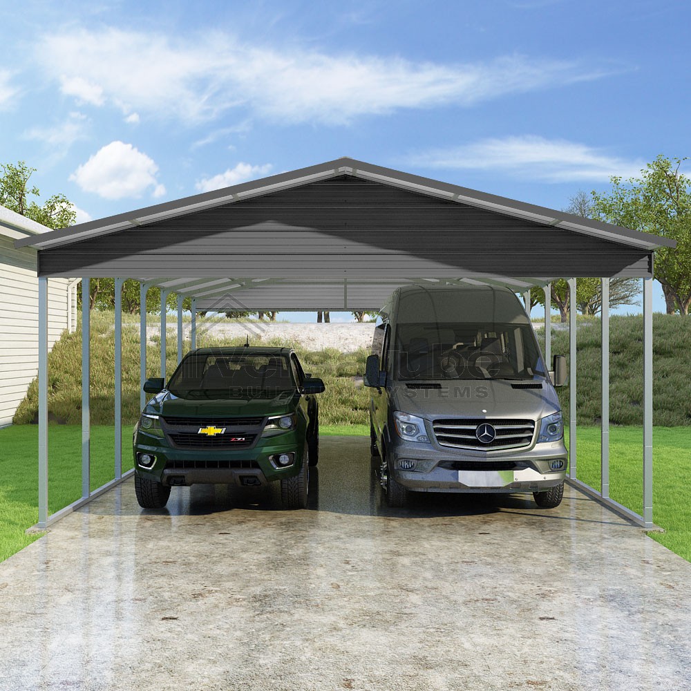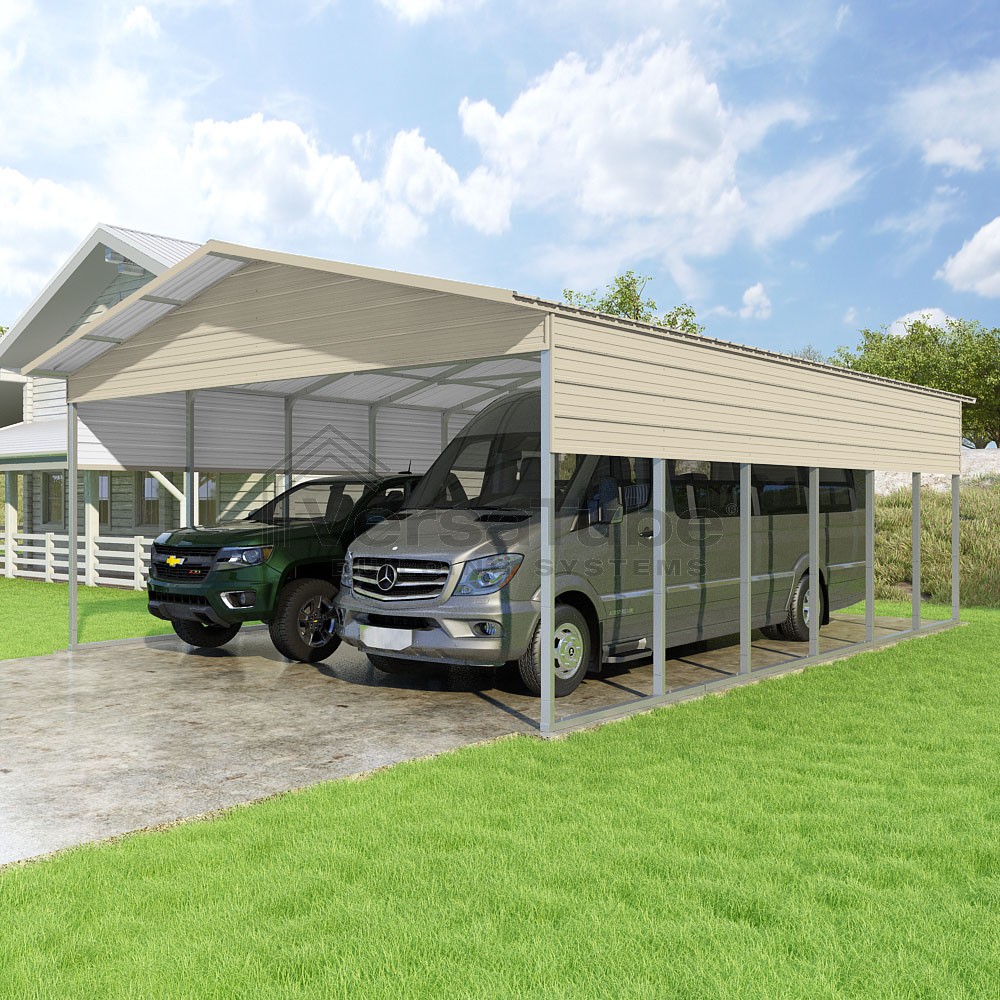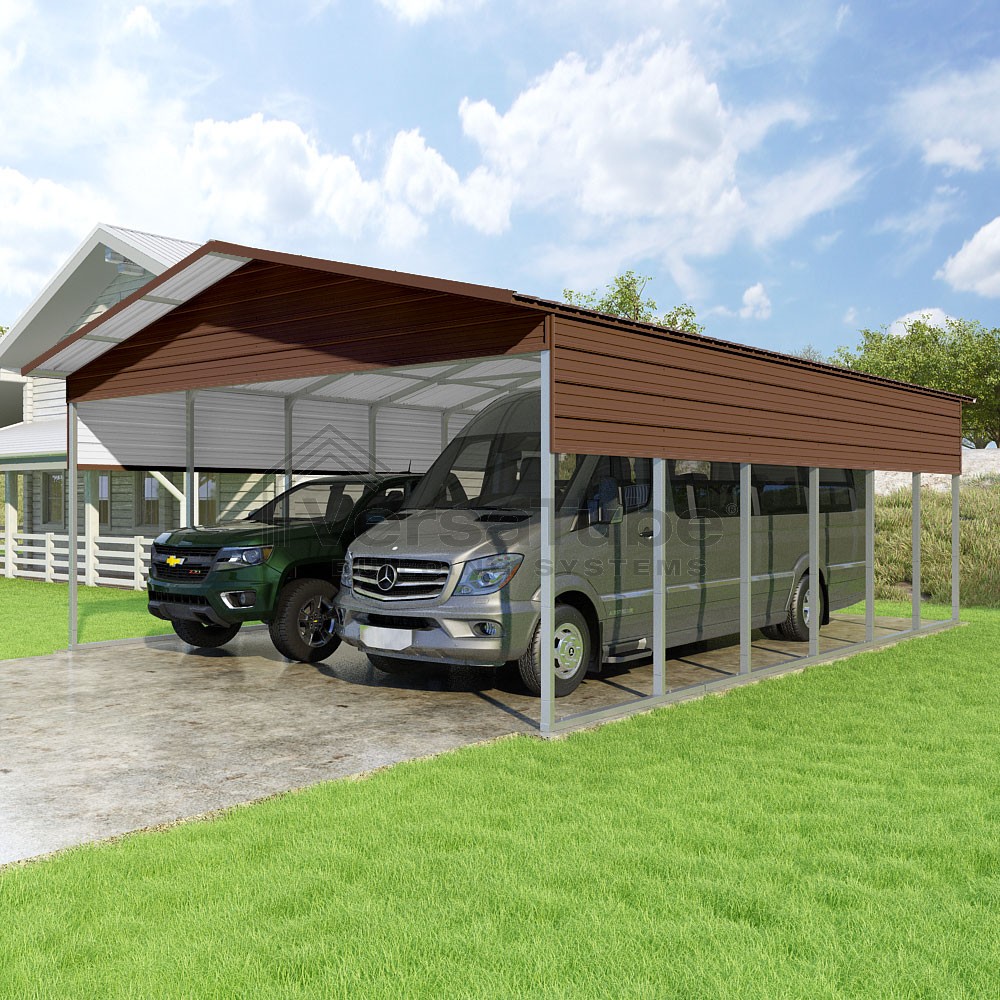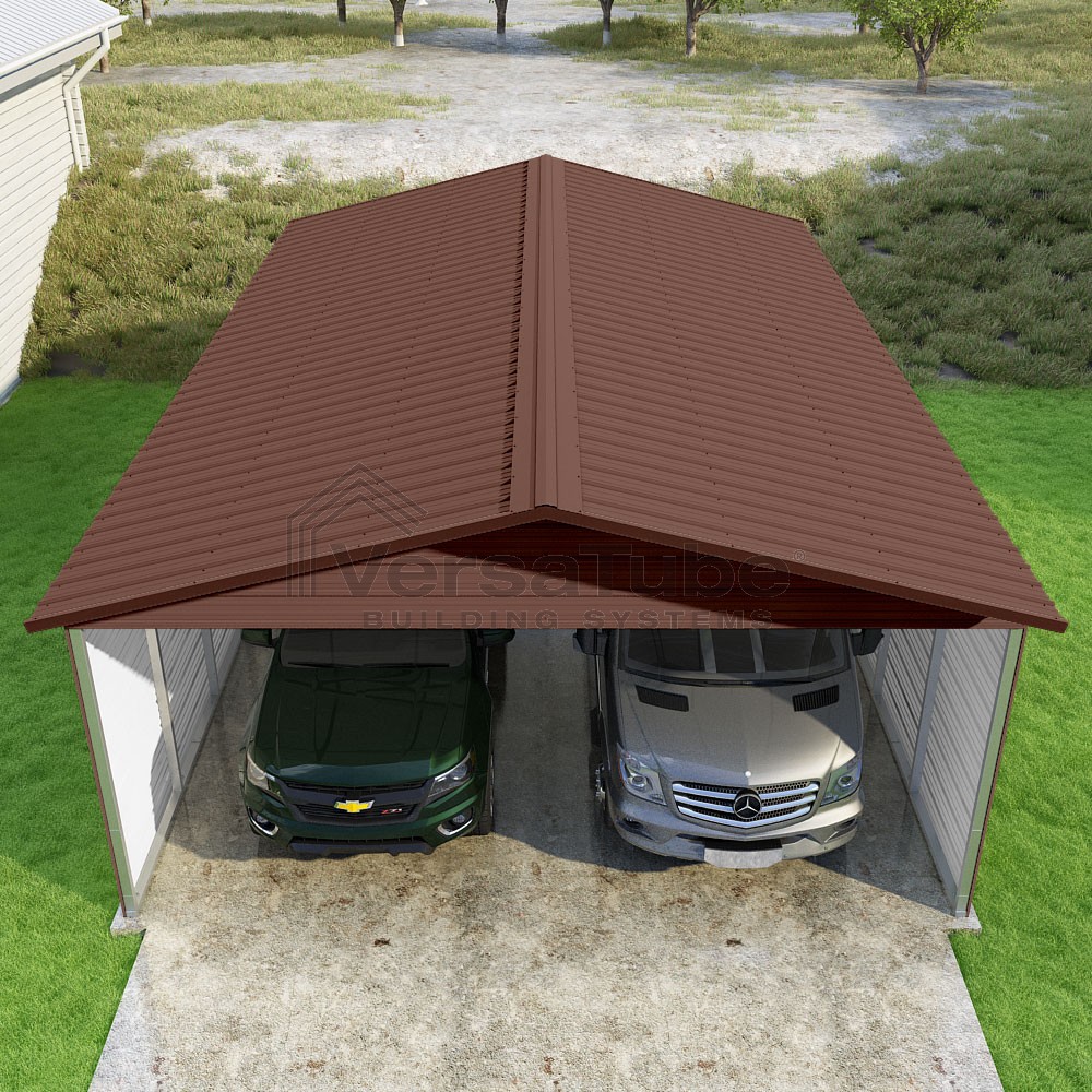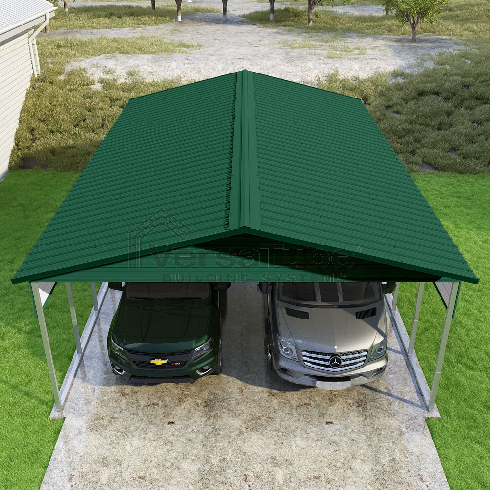 Pinnacle Series DIY carport kit features vertical sheet metal roof panels with ridge cap, gable and eave trim for an A-frame roof style and extended coverage on both ends.