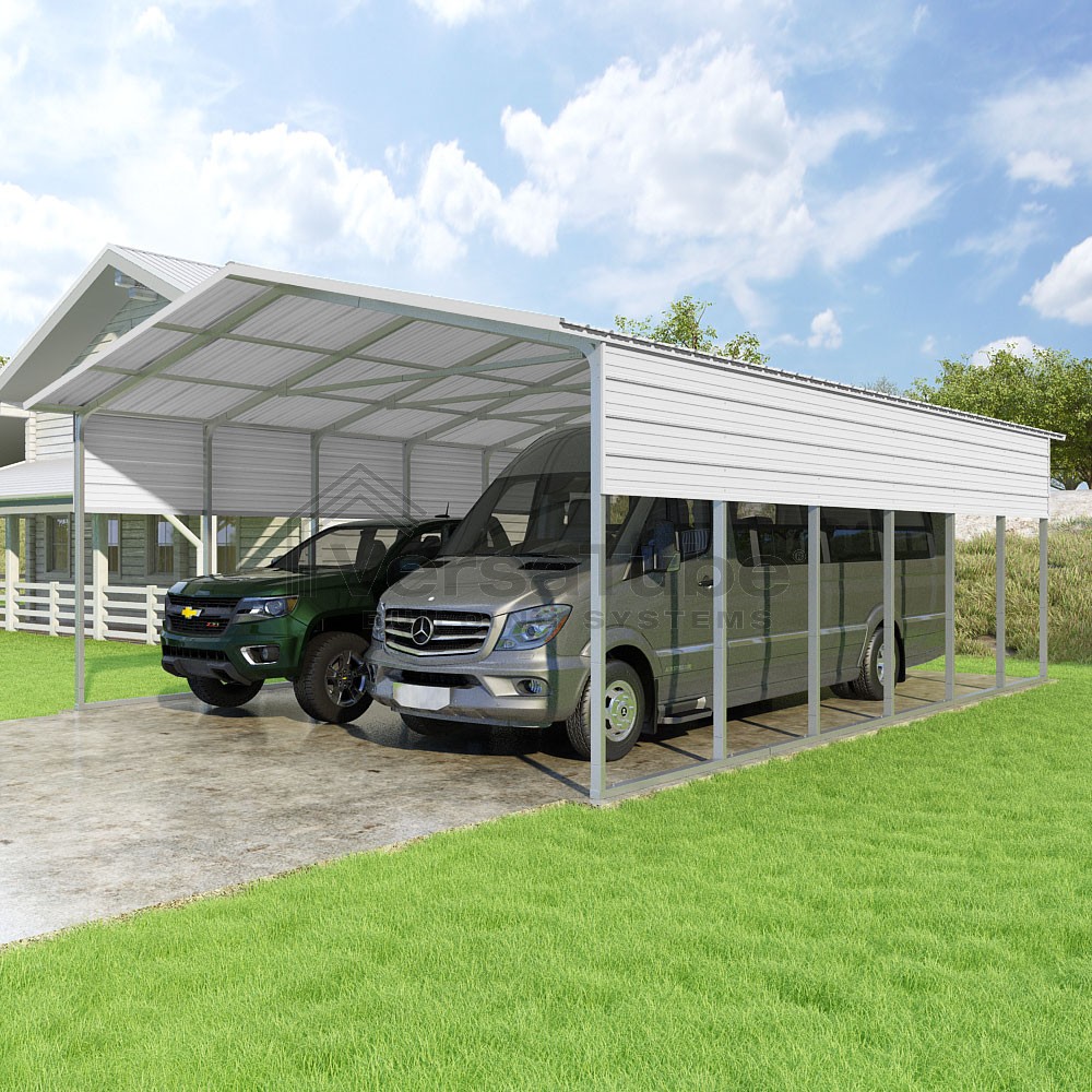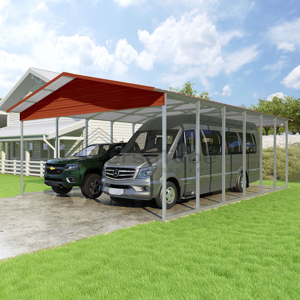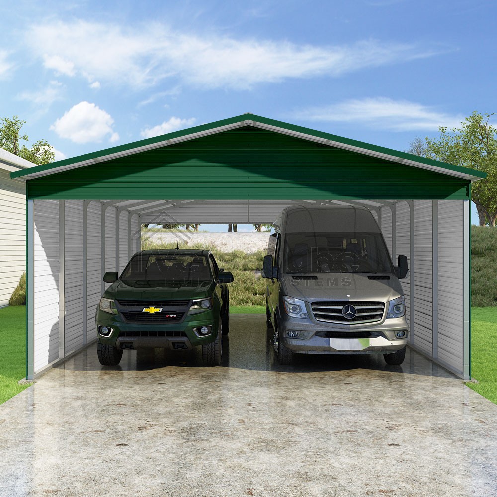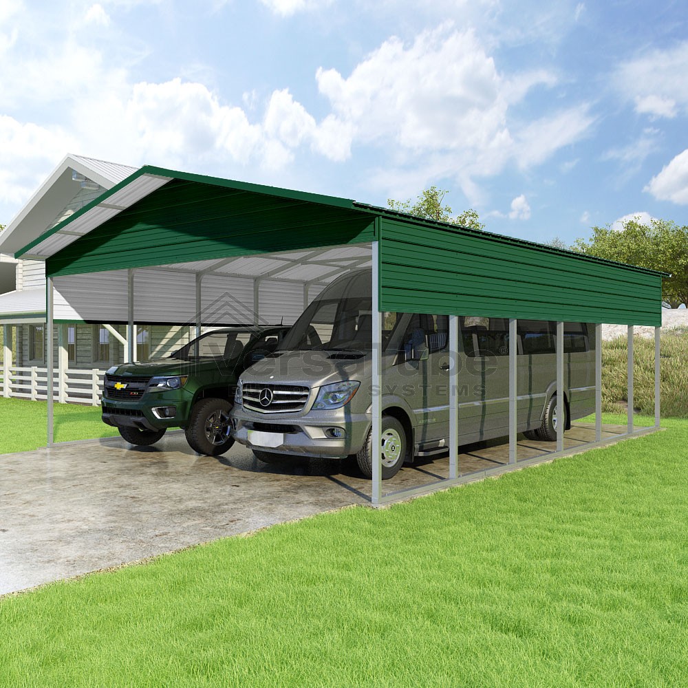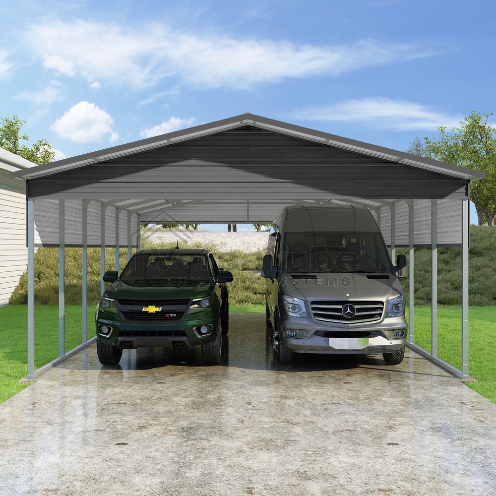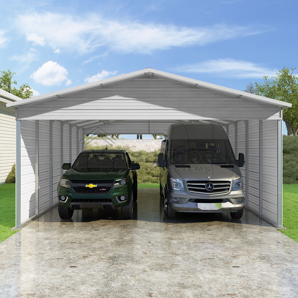 Pinnacle Series DIY carport kit features vertical sheet metal roof panels with ridge cap, gable and eave trim for an A-frame roof style and extended coverage on both ends.