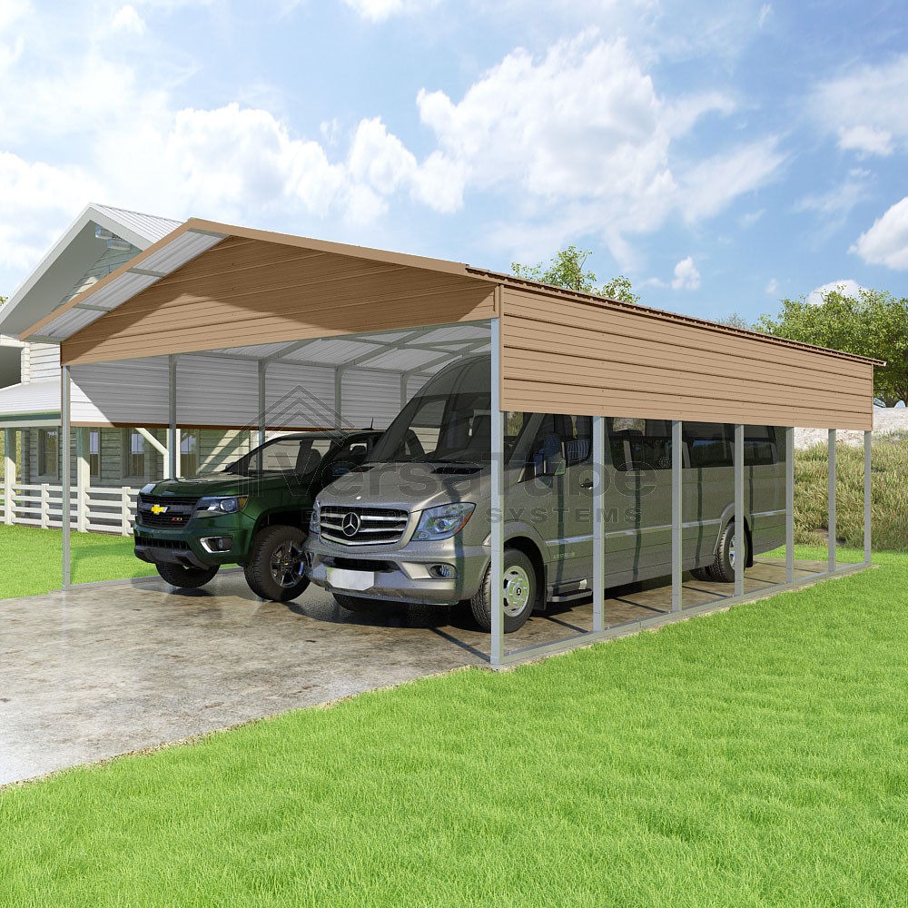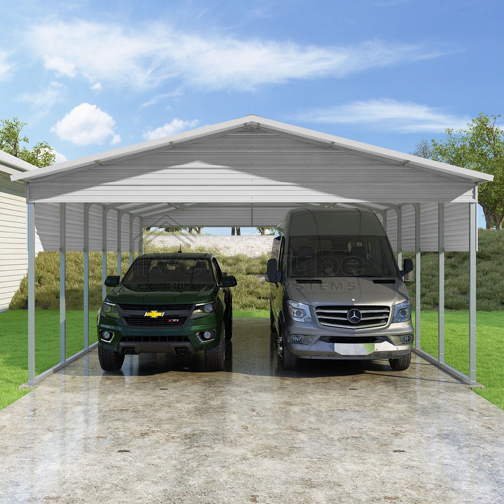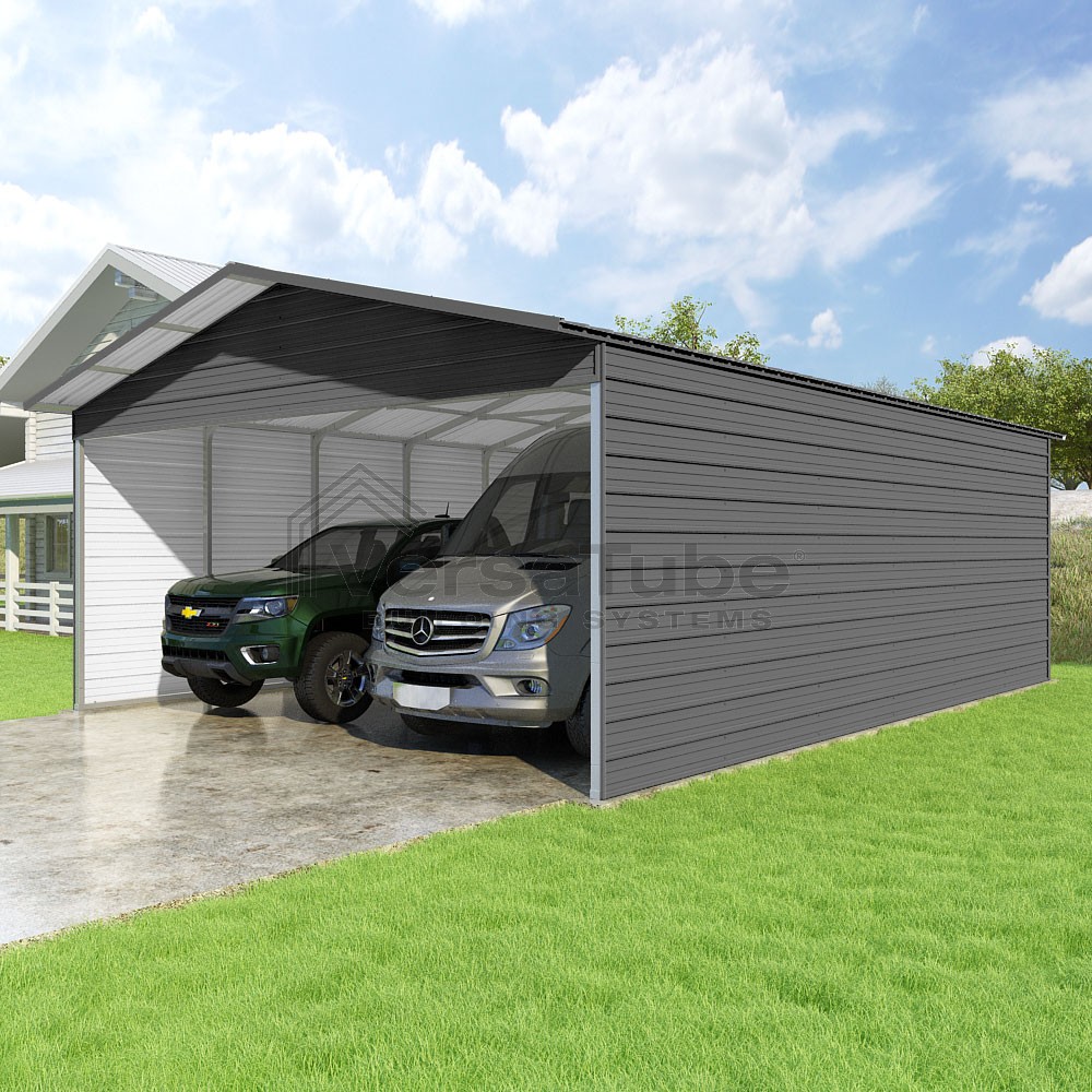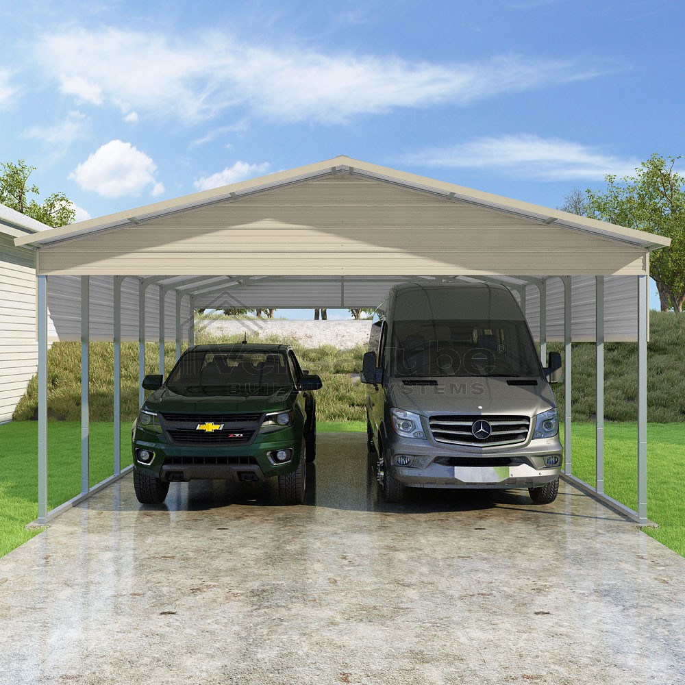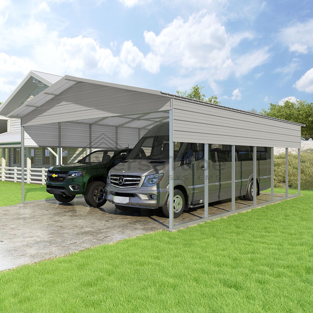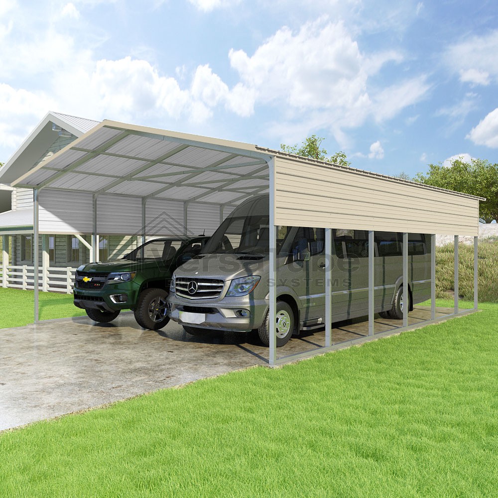 Pinnacle Series DIY carport kit features vertical sheet metal roof panels with ridge cap, gable and eave trim for an A-frame roof style and extended coverage on both ends.