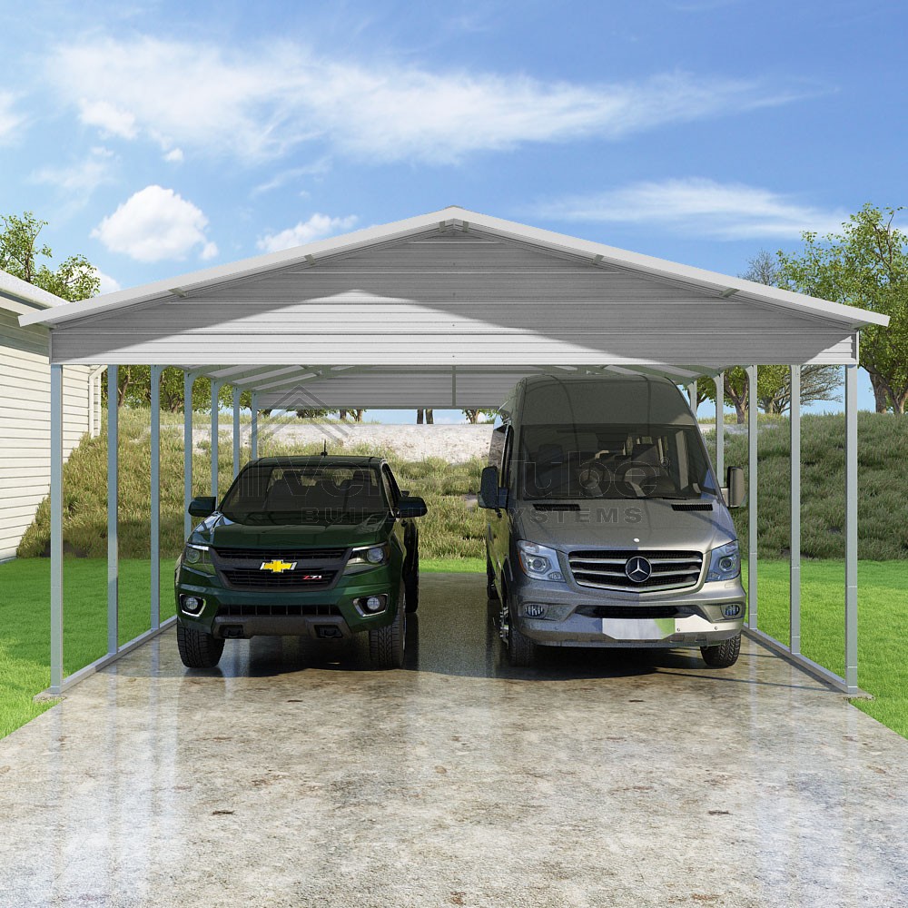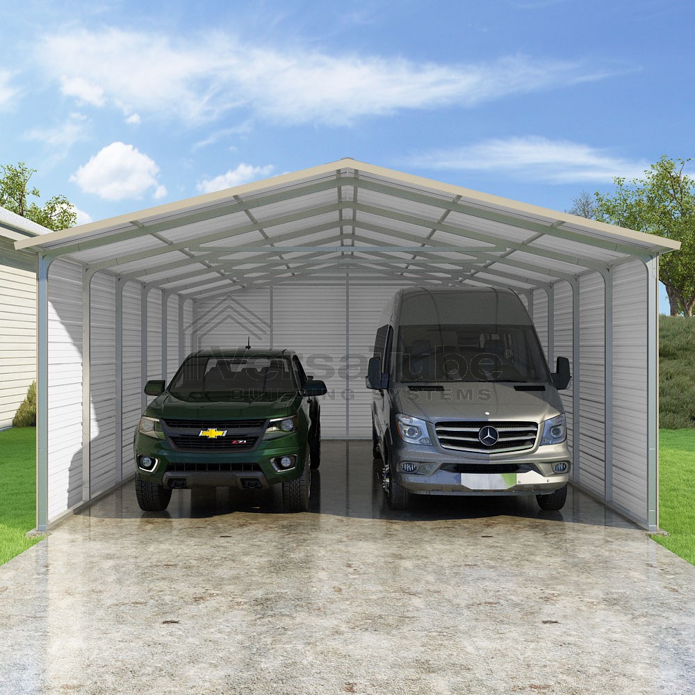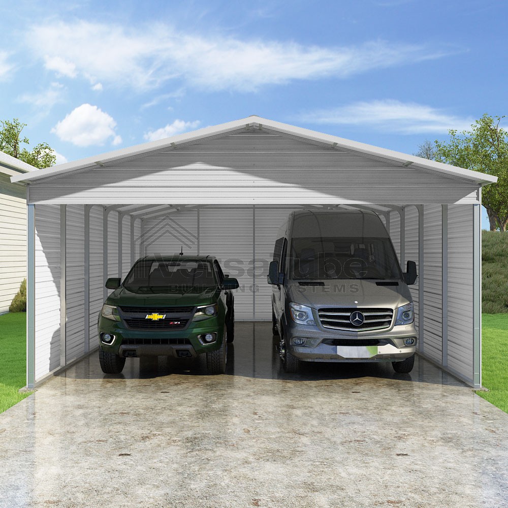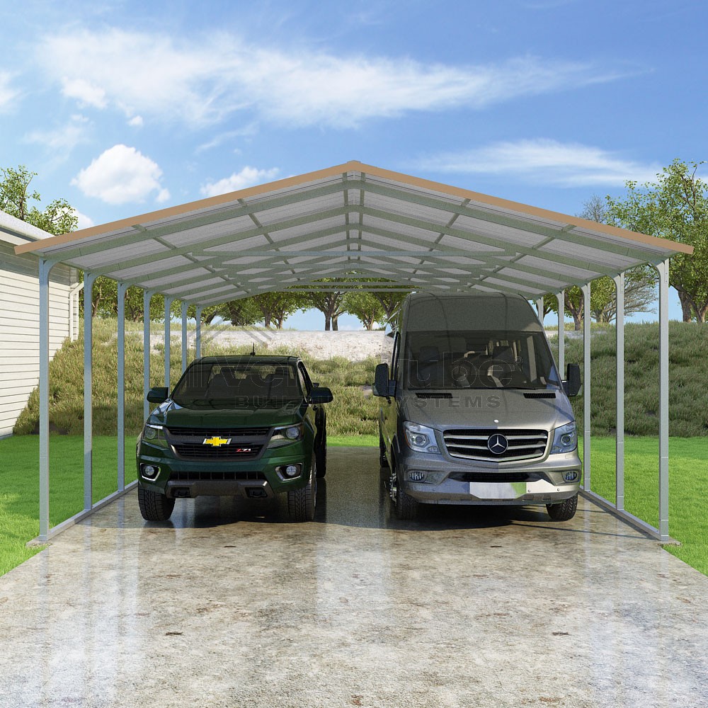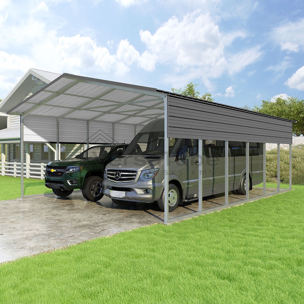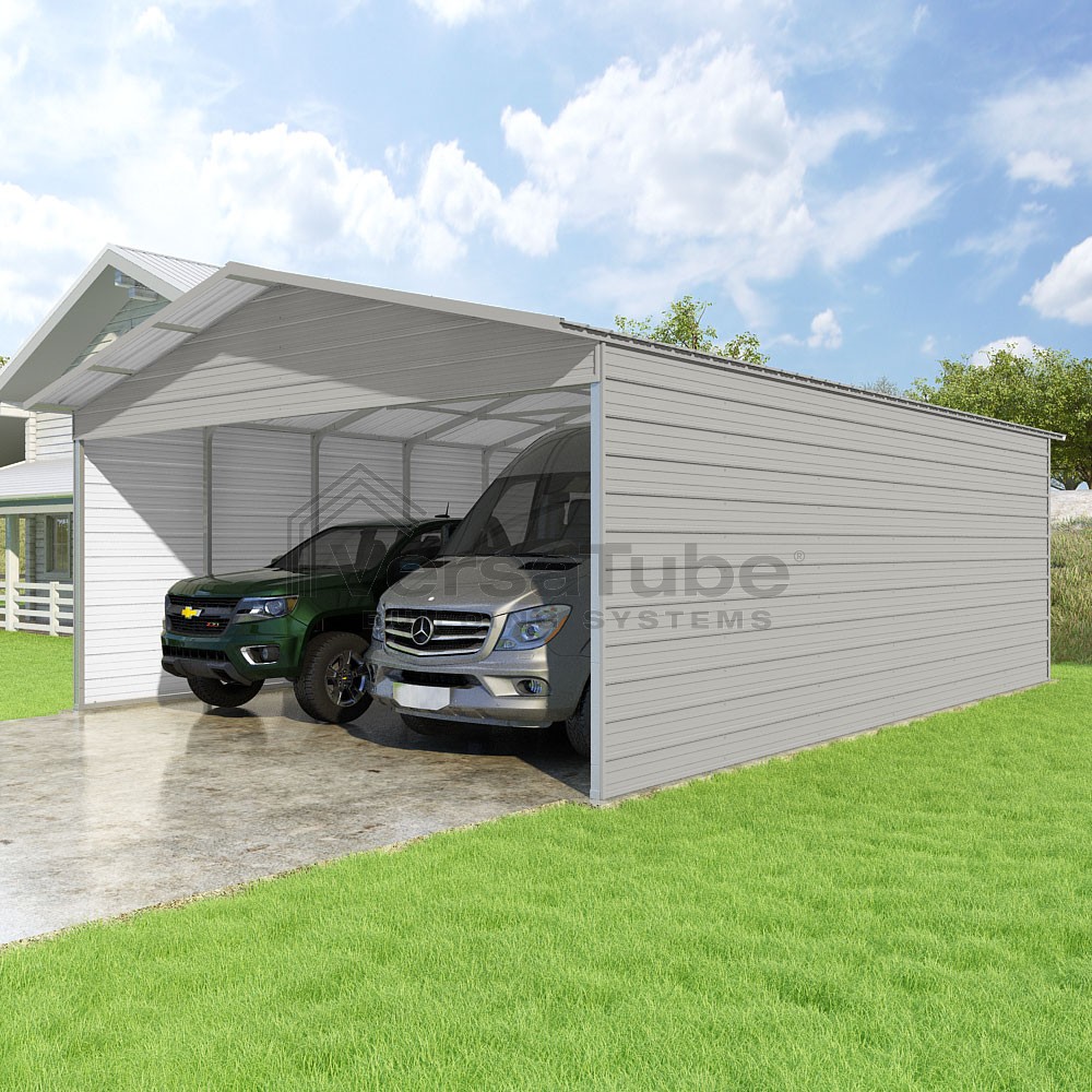 Pinnacle Series DIY carport kit features vertical sheet metal roof panels with ridge cap, gable and eave trim for an A-frame roof style and extended coverage on both ends.
