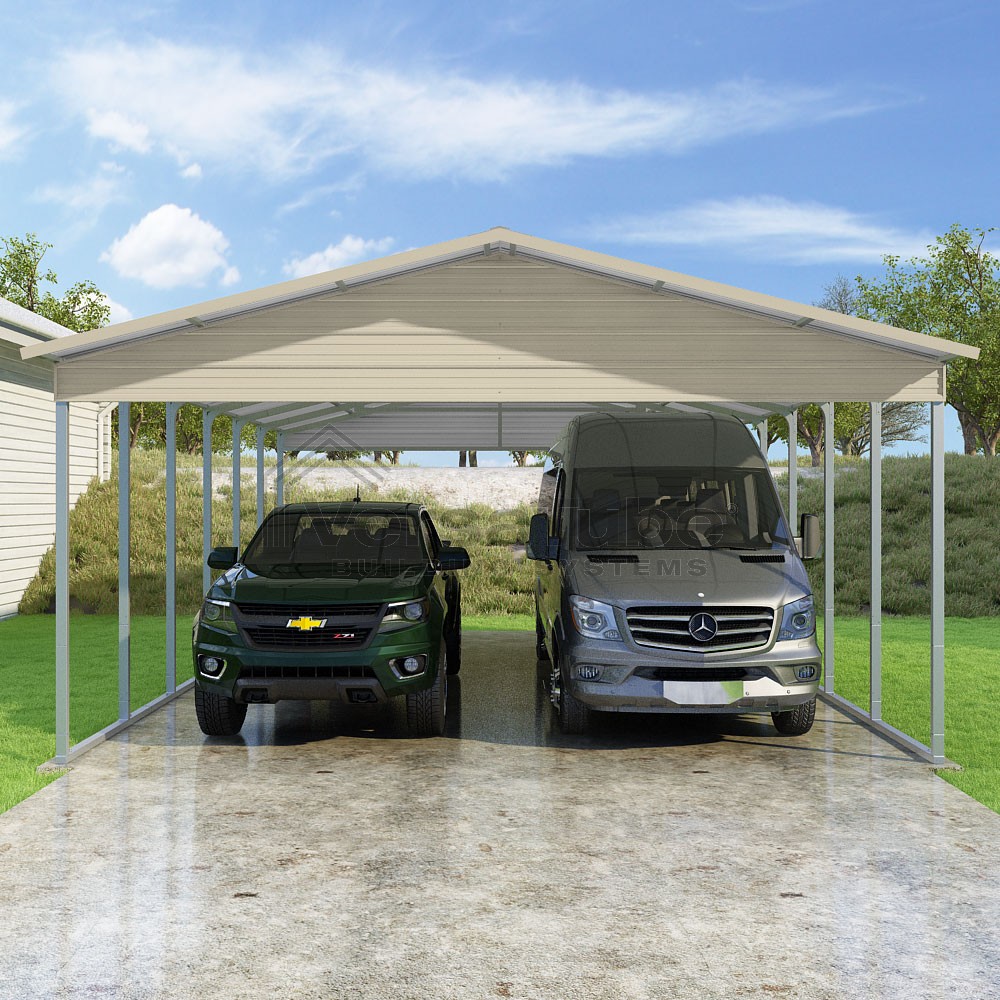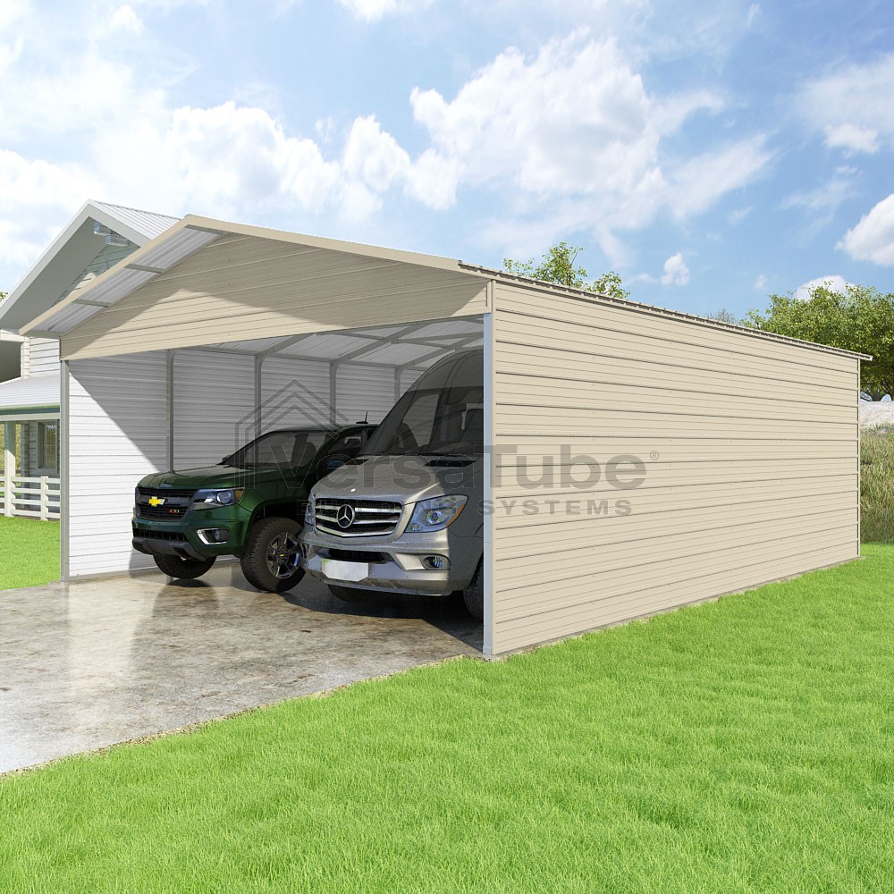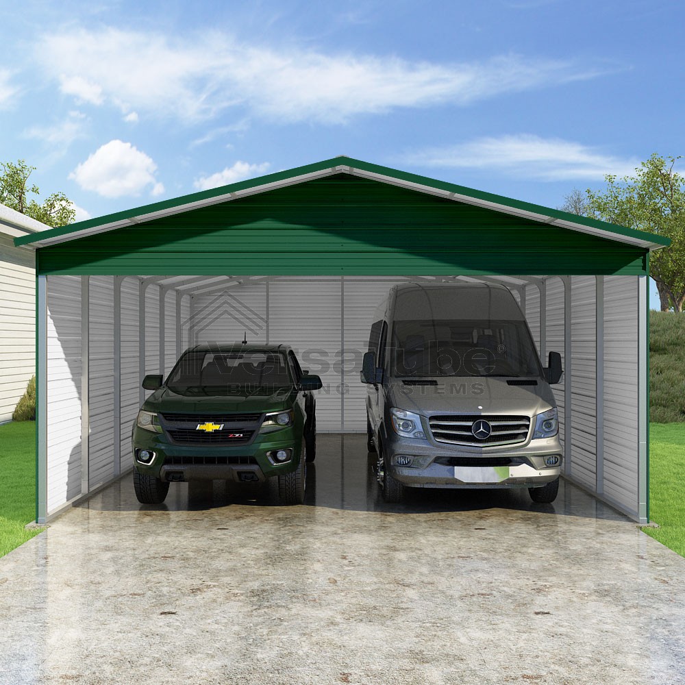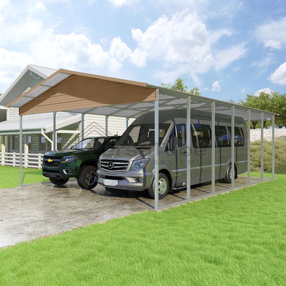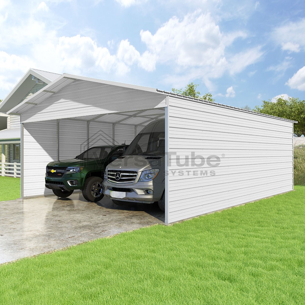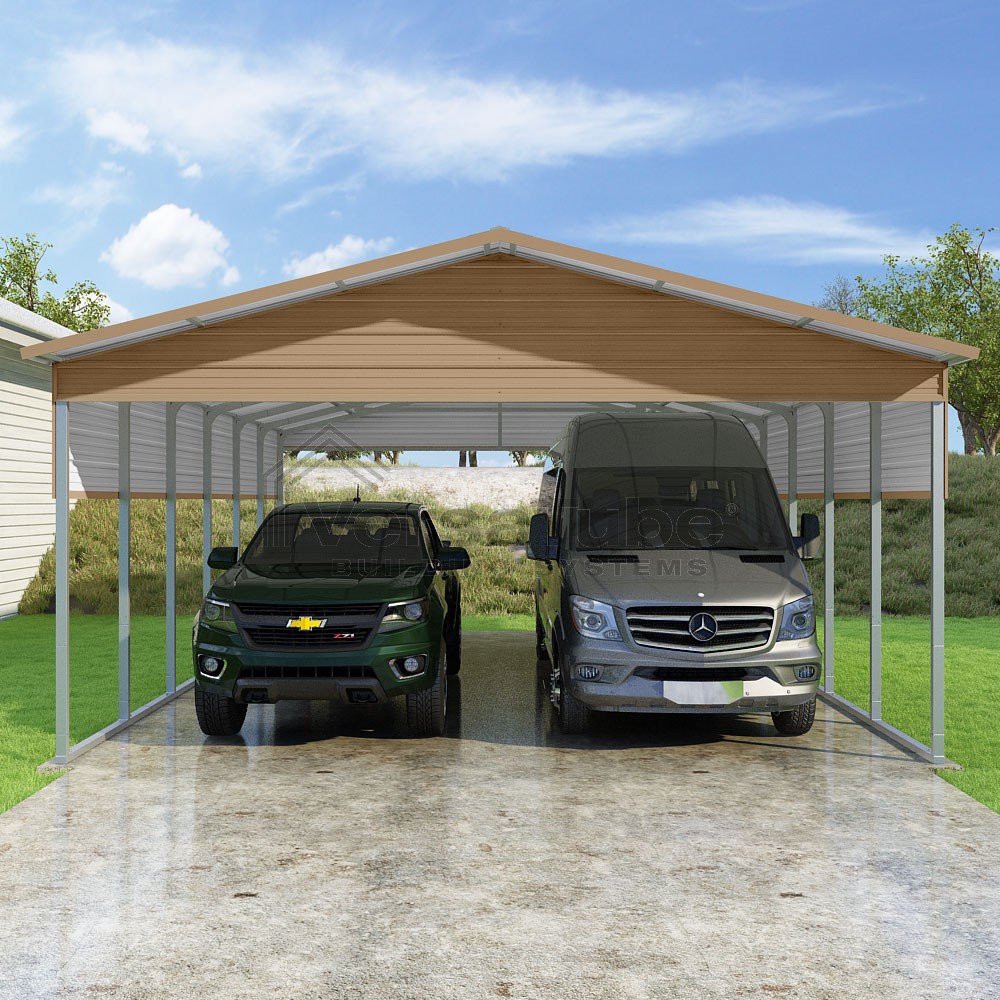Pinnacle Series DIY carport kit features vertical sheet metal roof panels with ridge cap, gable and eave trim for an A-frame roof style and extended coverage on both ends.