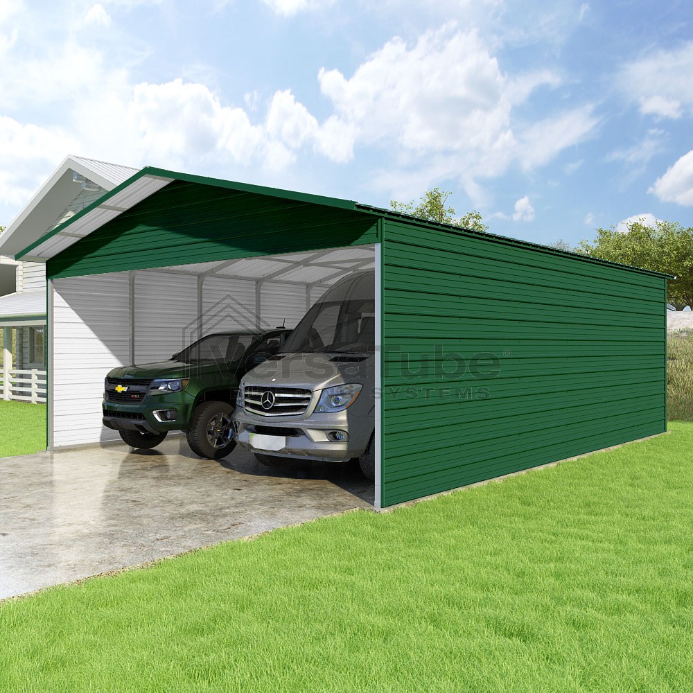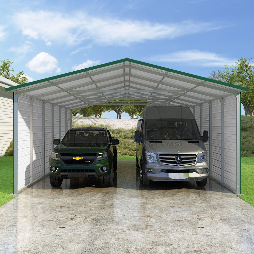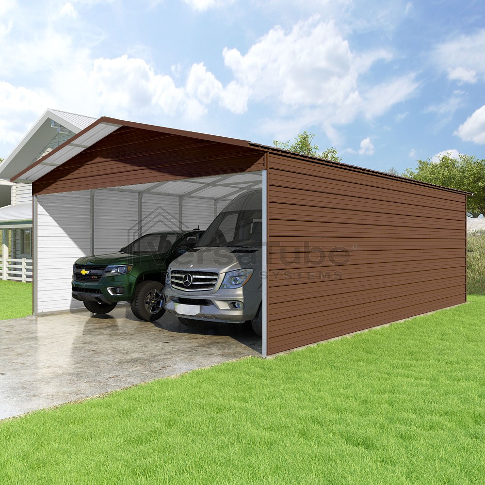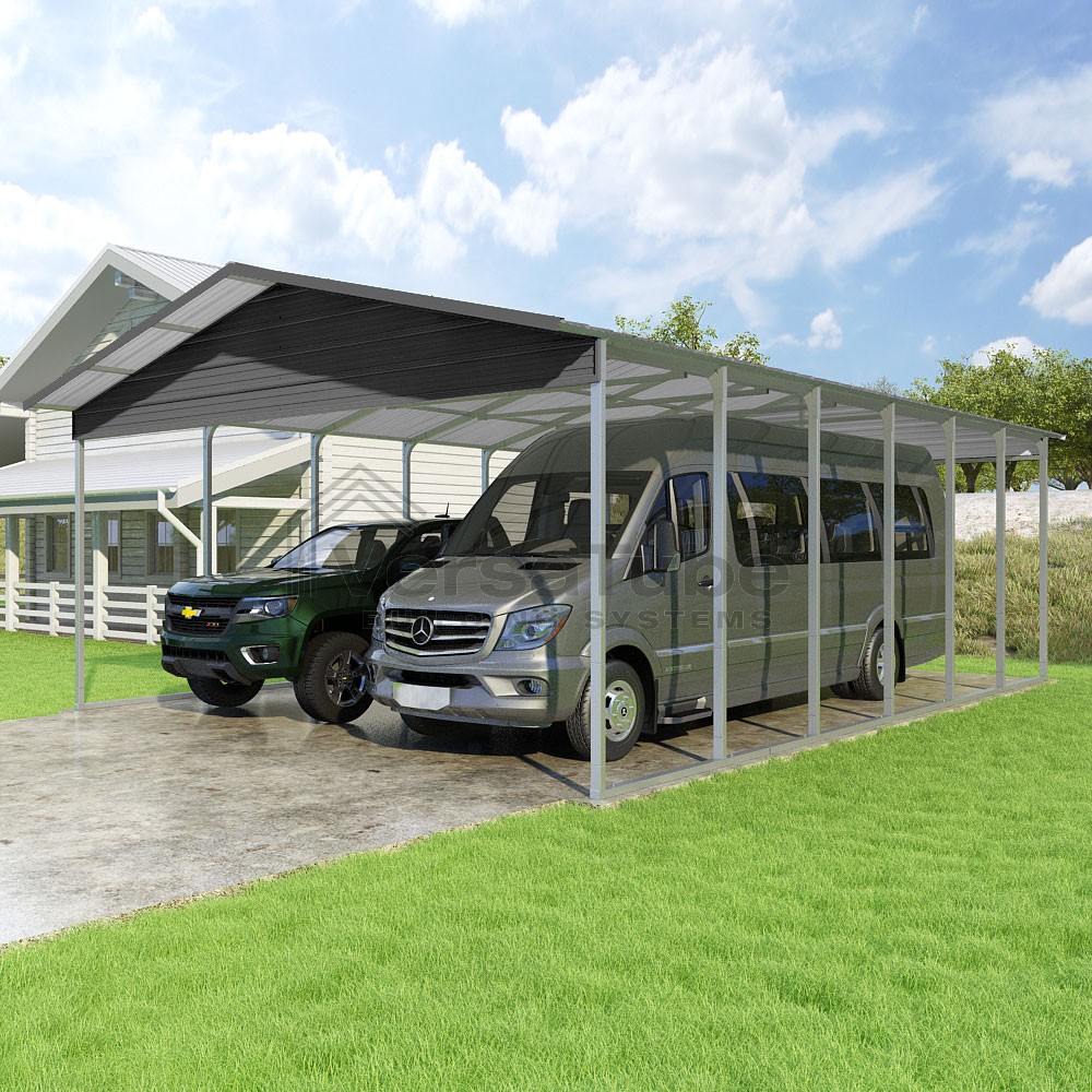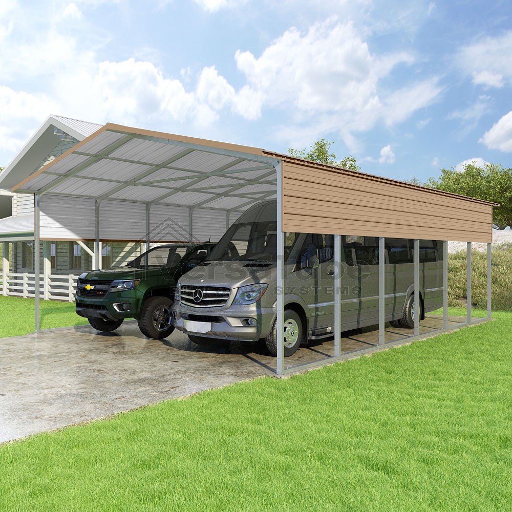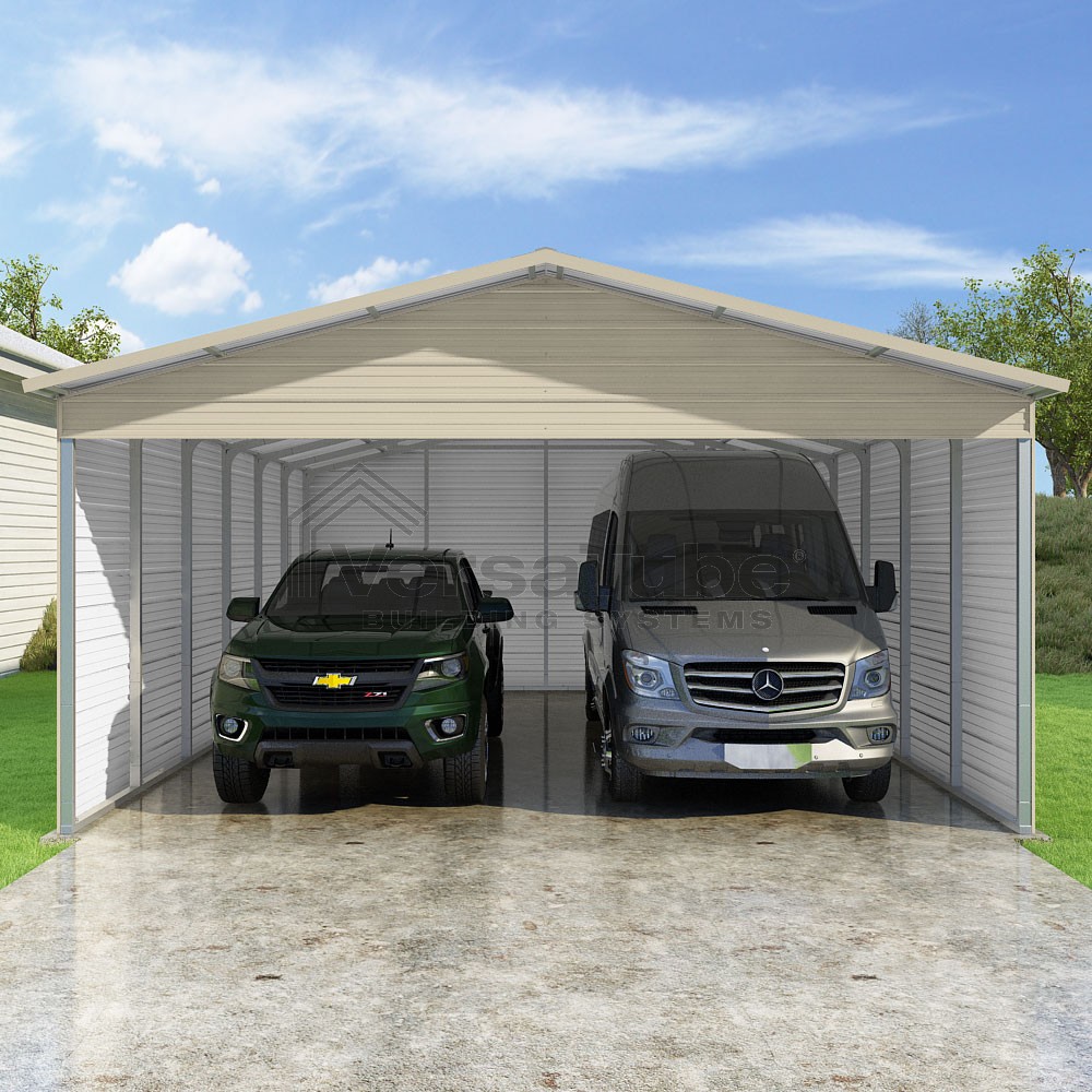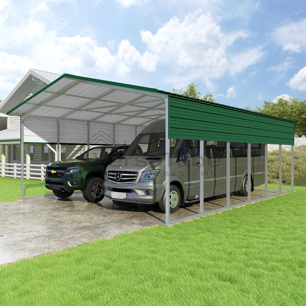 Pinnacle Series DIY carport kit features vertical sheet metal roof panels with ridge cap, gable and eave trim for an A-frame roof style and extended coverage on both ends.