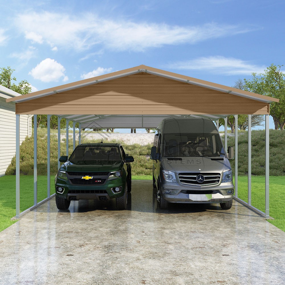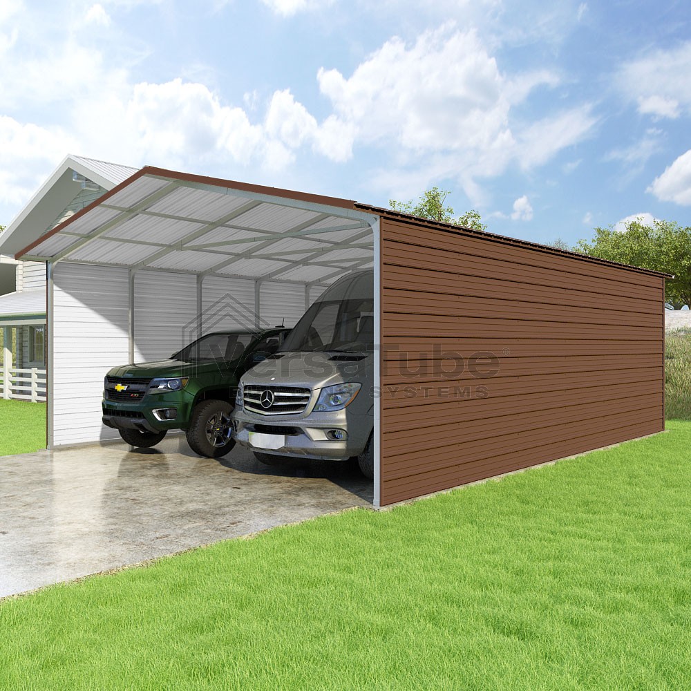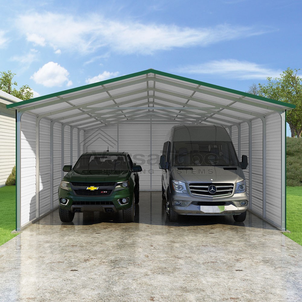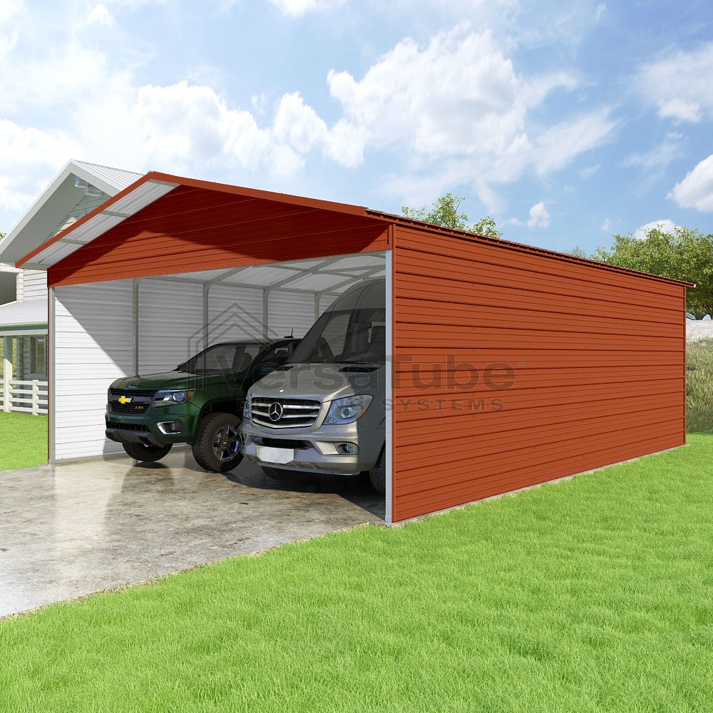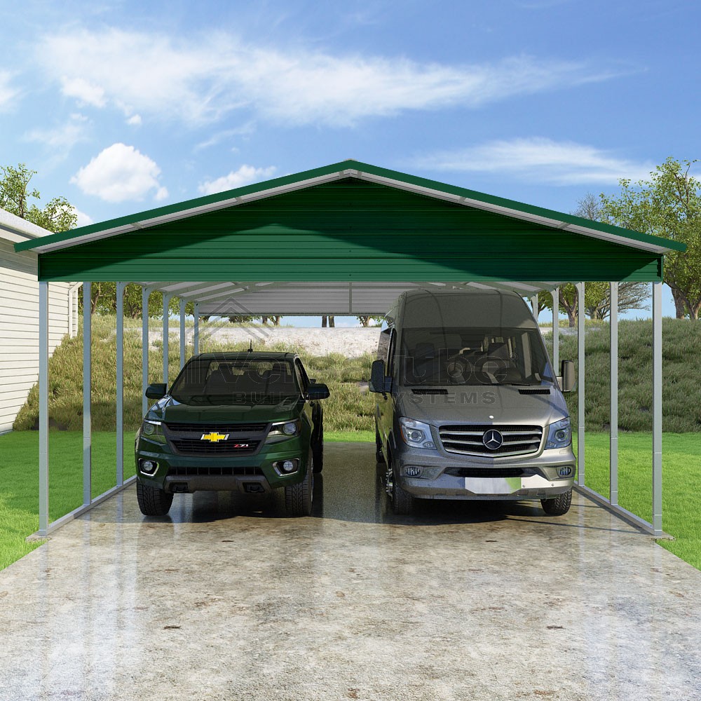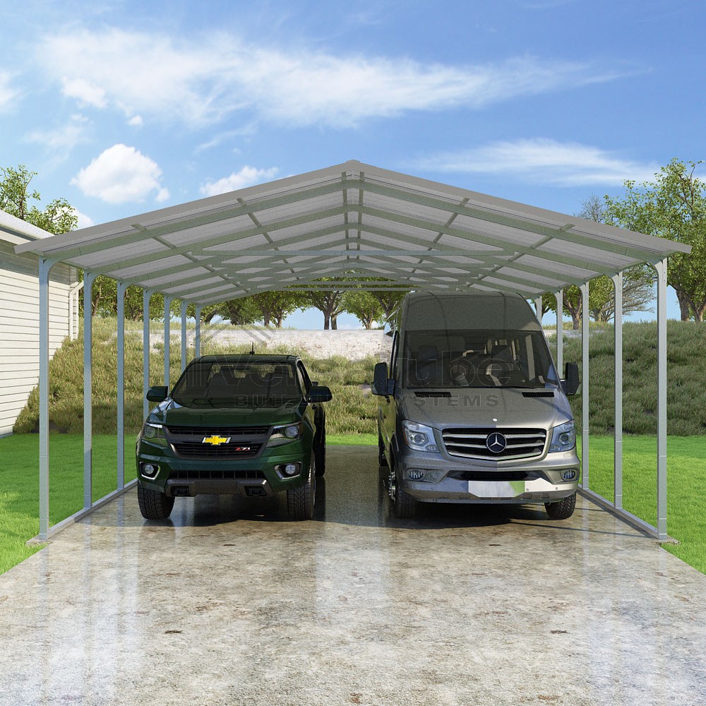 Pinnacle Series DIY carport kit features vertical sheet metal roof panels with ridge cap, gable and eave trim for an A-frame roof style and extended coverage on both ends.