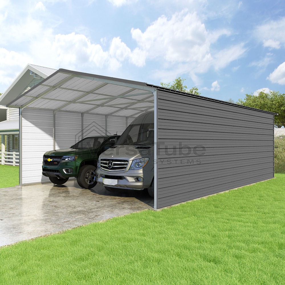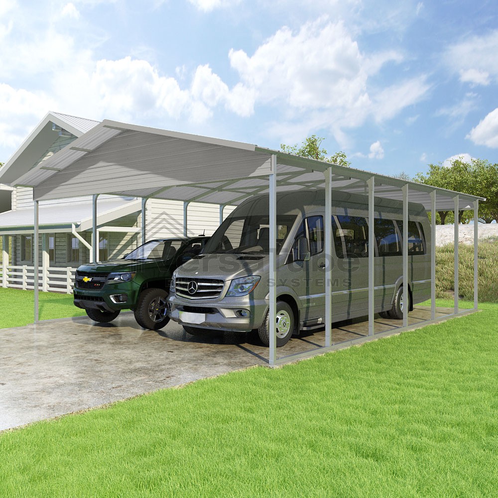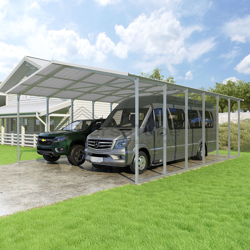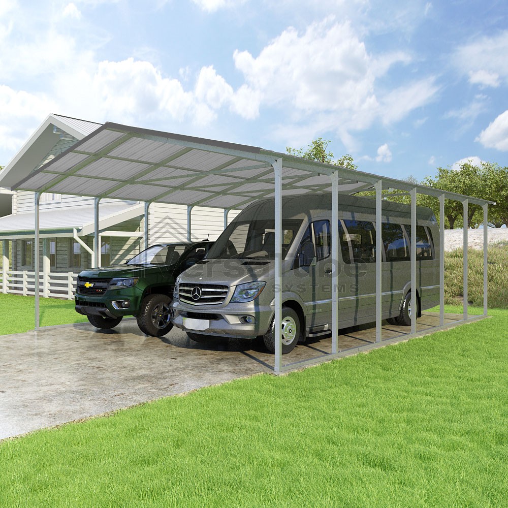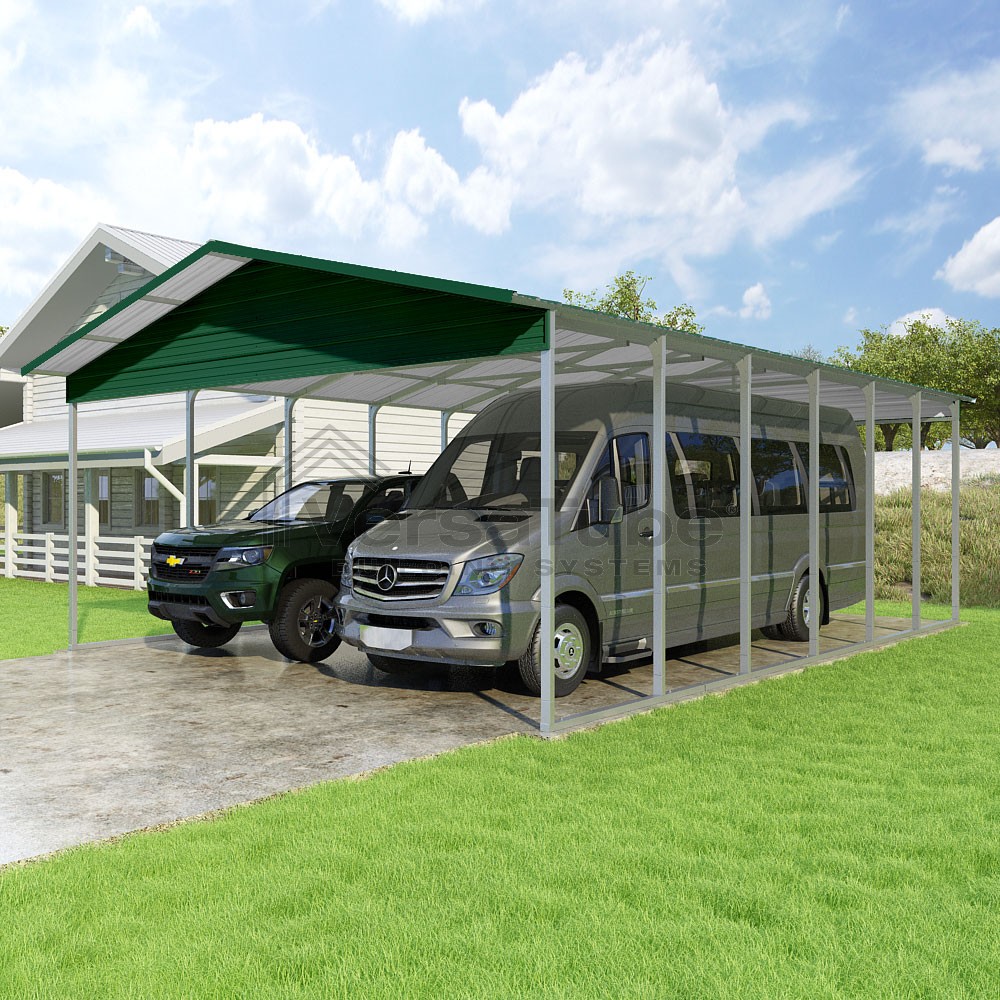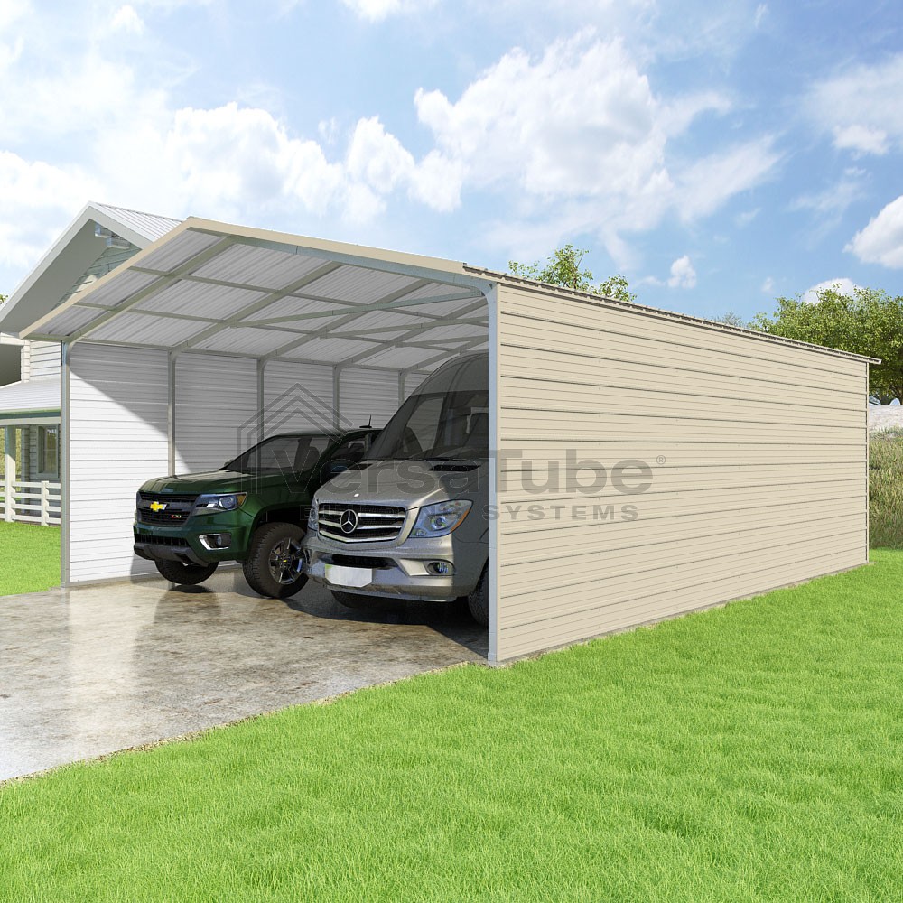 Pinnacle Series DIY carport kit features vertical sheet metal roof panels with ridge cap, gable and eave trim for an A-frame roof style and extended coverage on both ends.