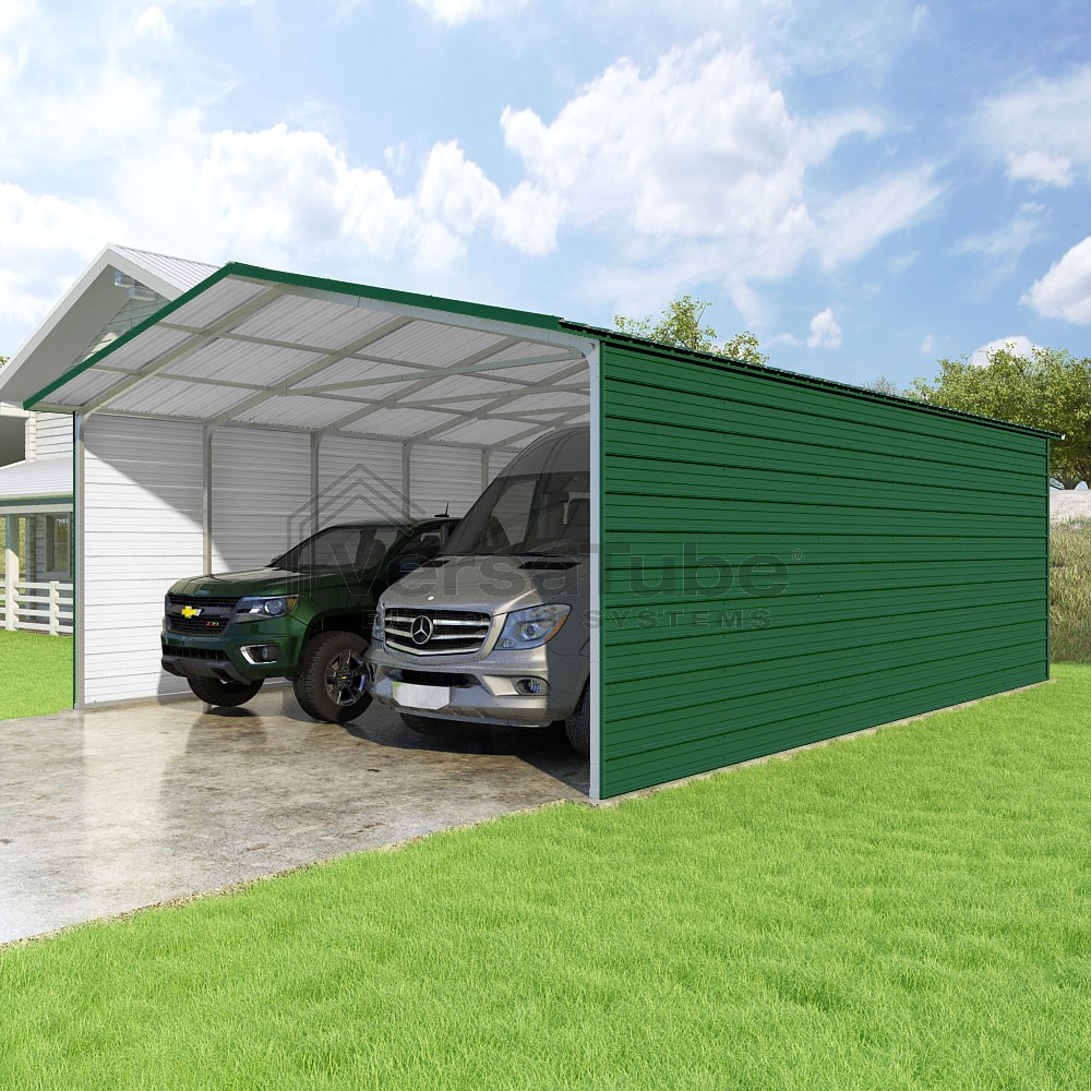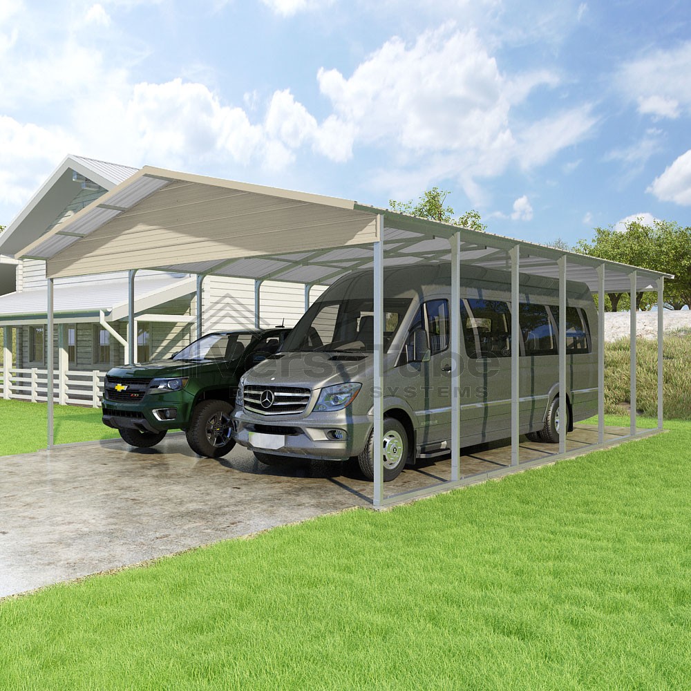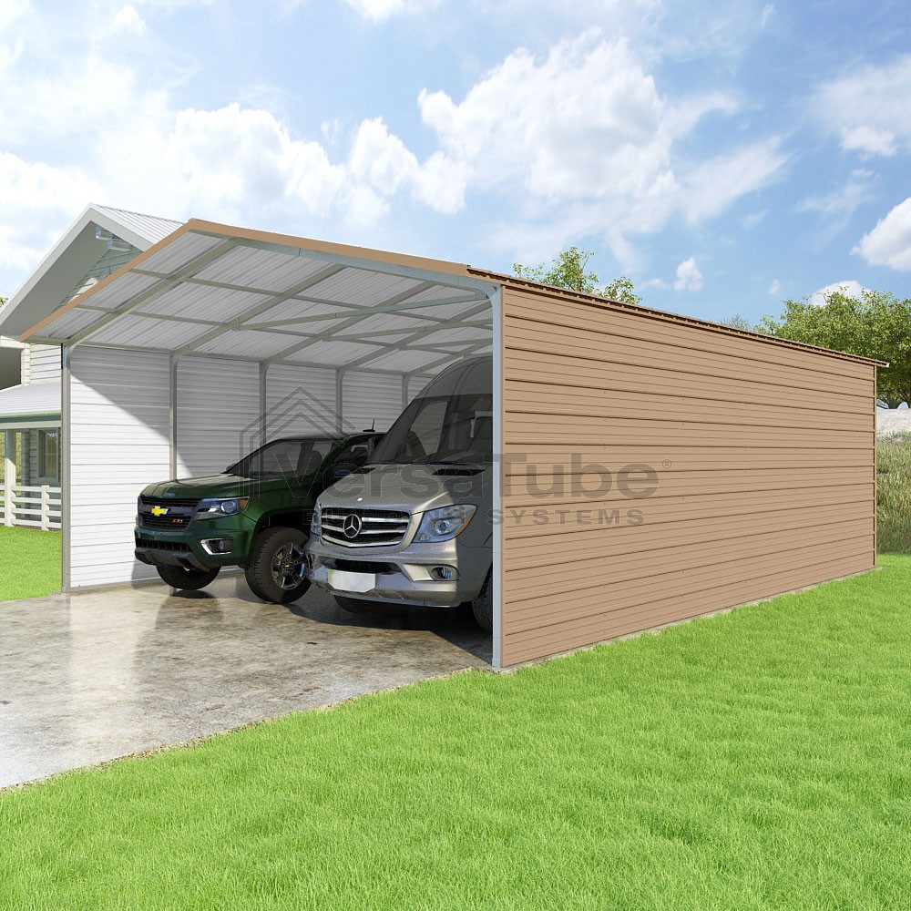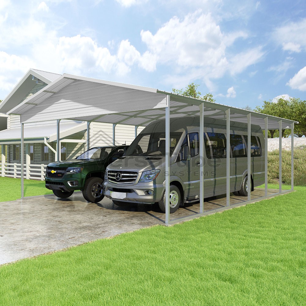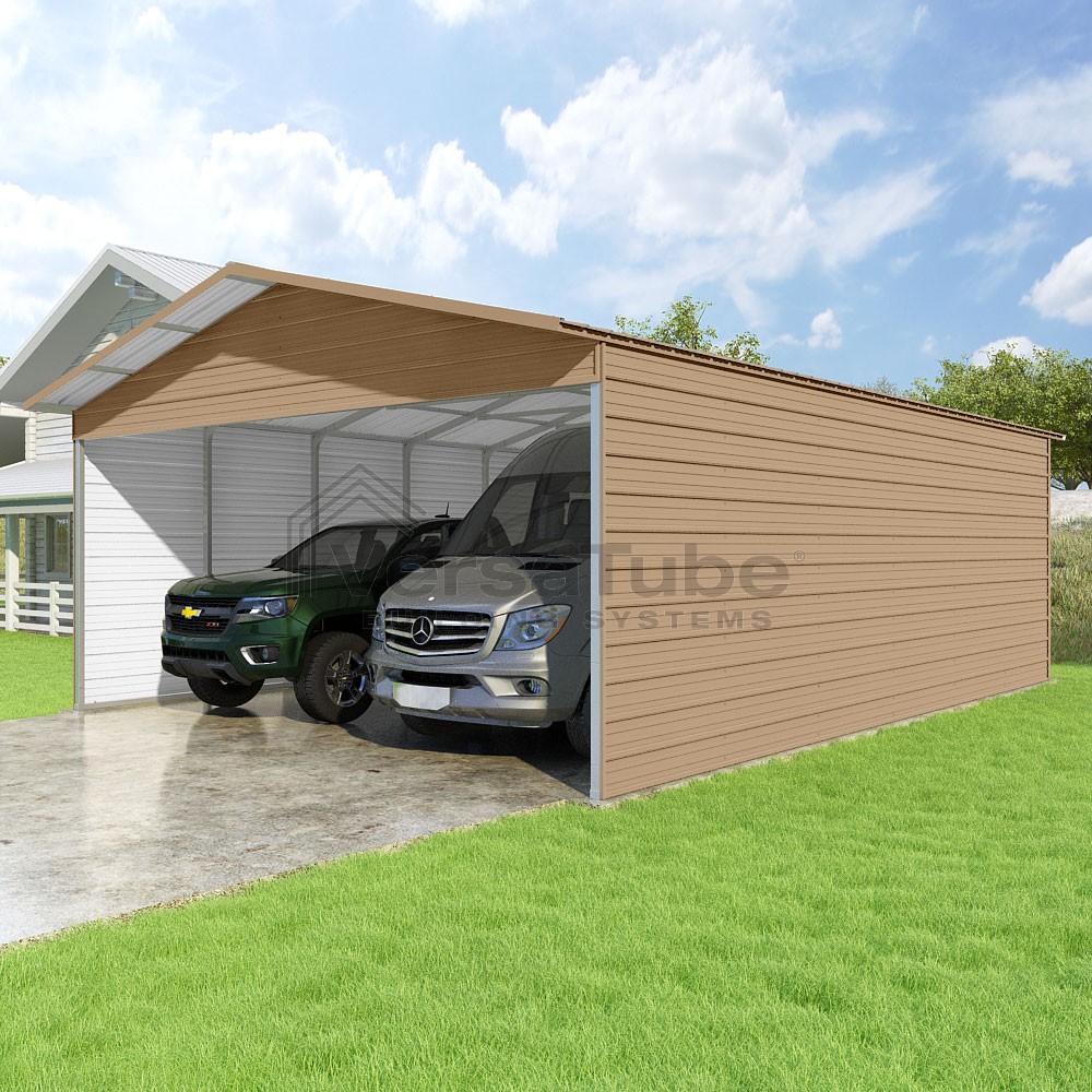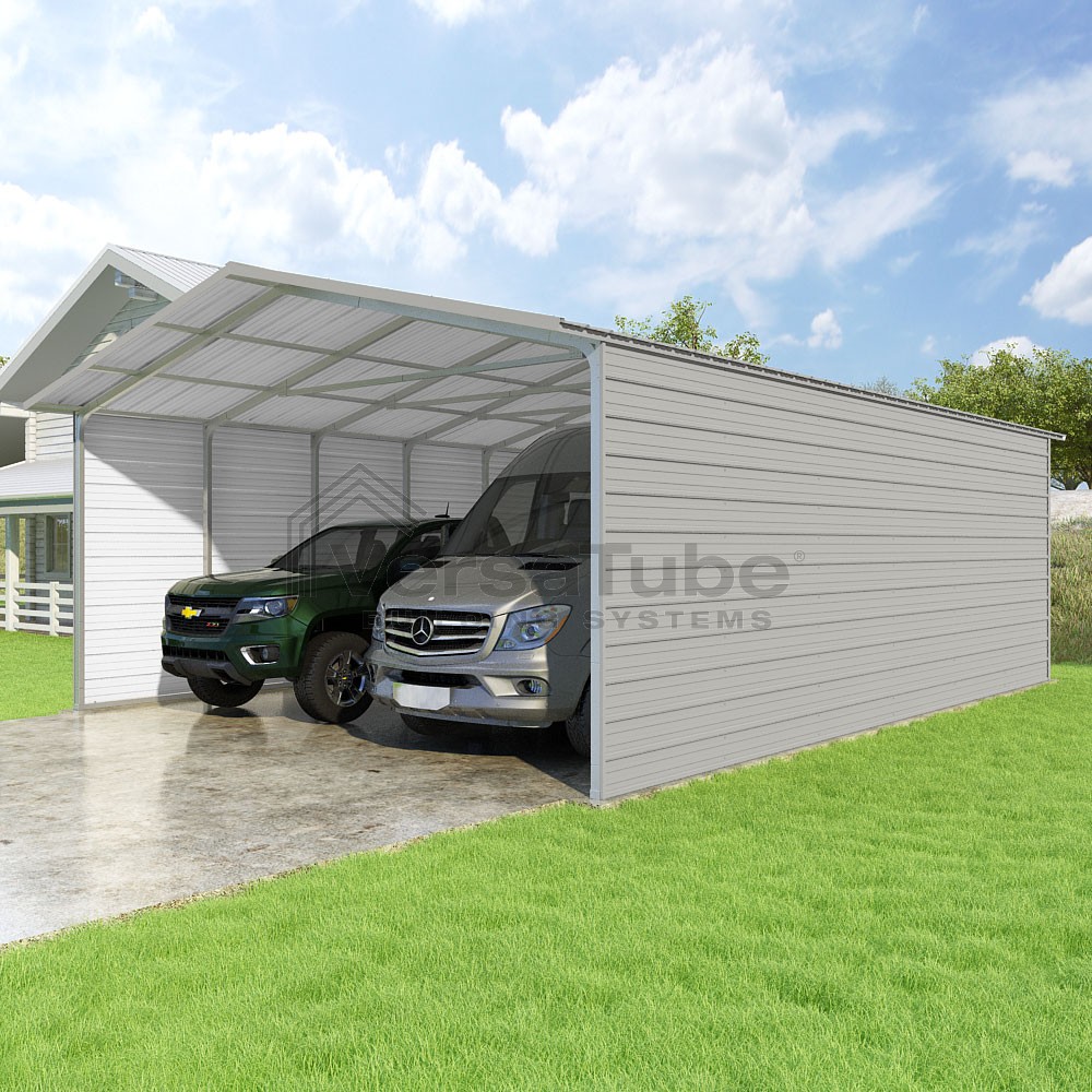 Pinnacle Series DIY carport kit features vertical sheet metal roof panels with ridge cap, gable and eave trim for an A-frame roof style and extended coverage on both ends.