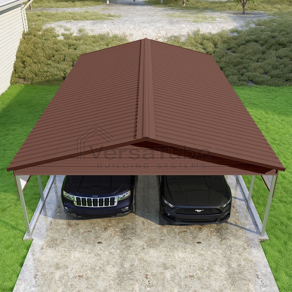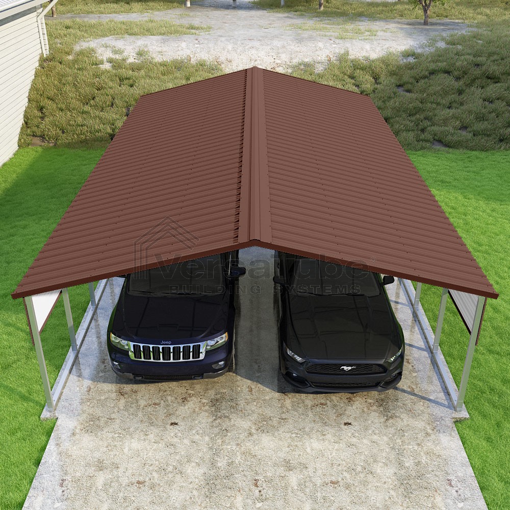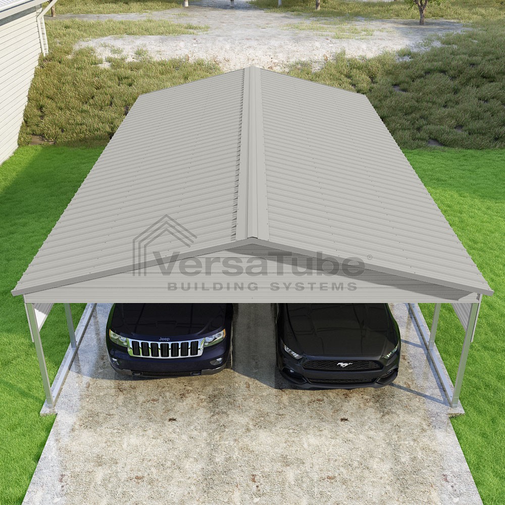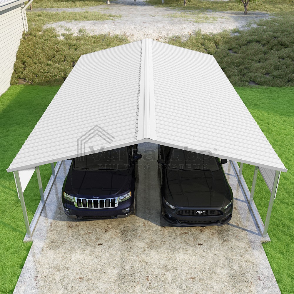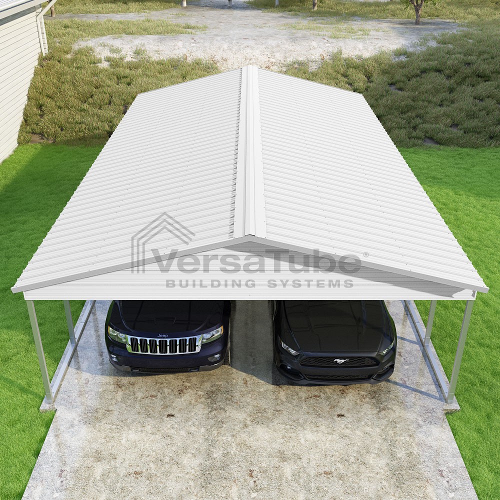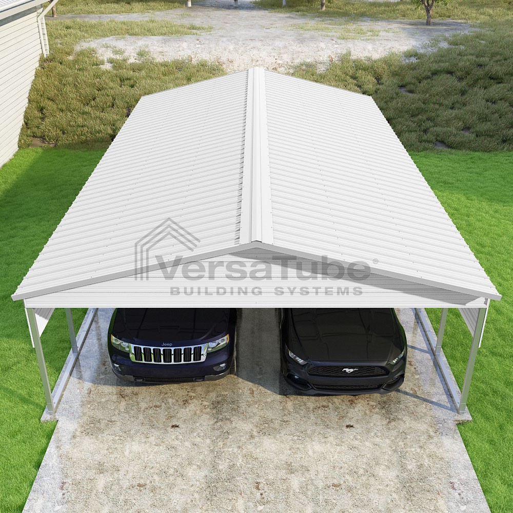Pinnacle Series DIY carport kit features vertical sheet metal roof panels with ridge cap, gable and eave trim for an A-frame roof style and extended coverage on both ends.