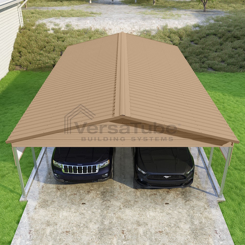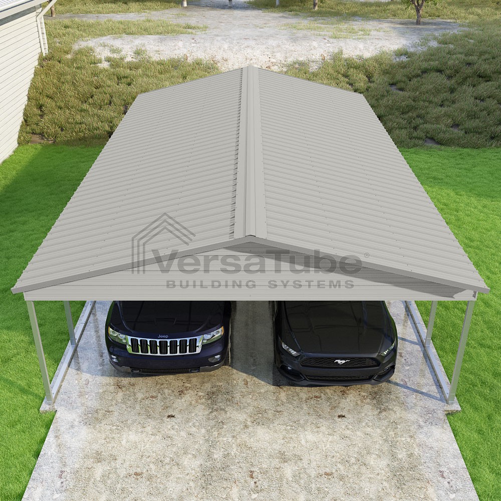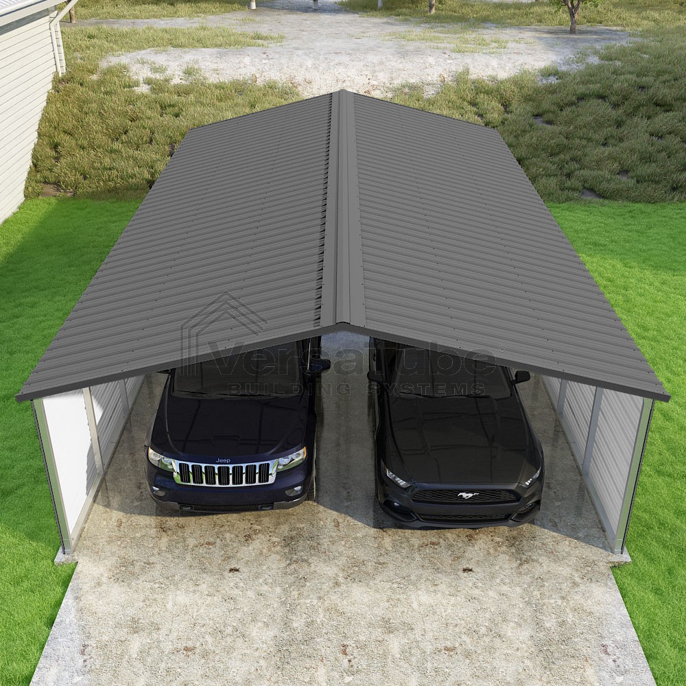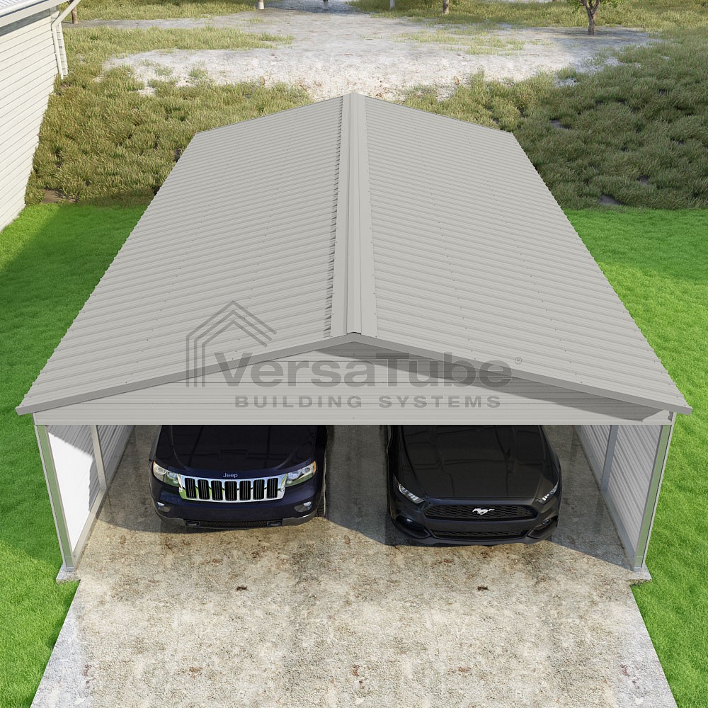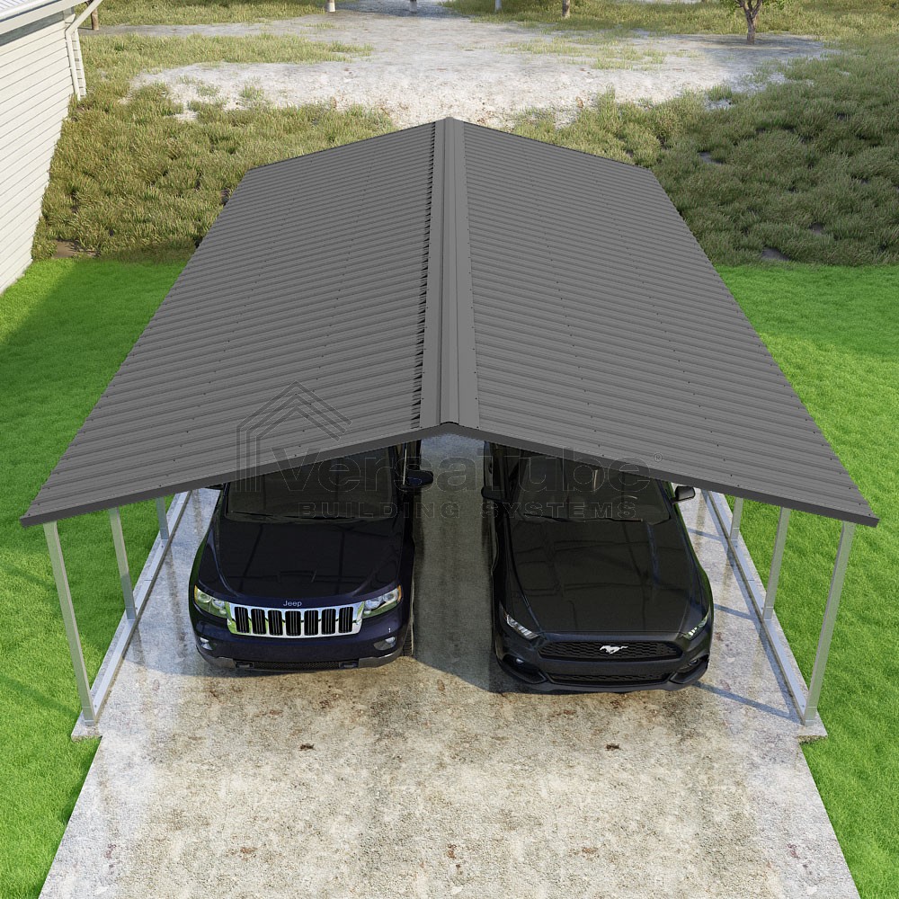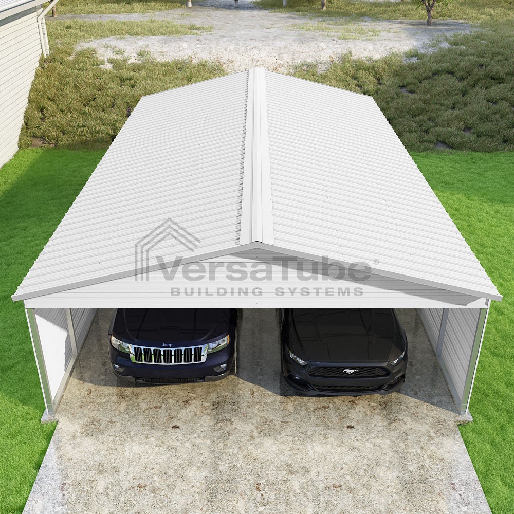 Pinnacle Series DIY carport kit features vertical sheet metal roof panels with ridge cap, gable and eave trim for an A-frame roof style and extended coverage on both ends.