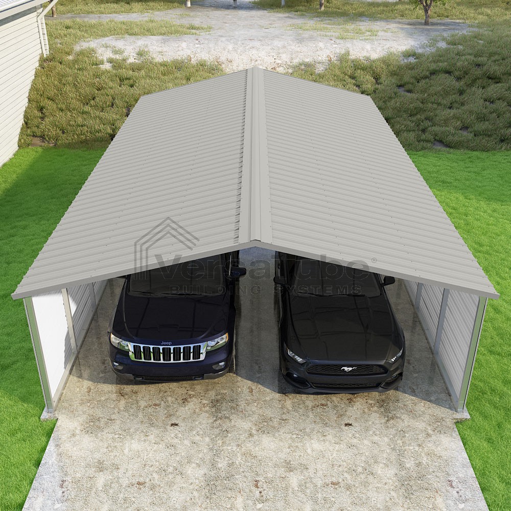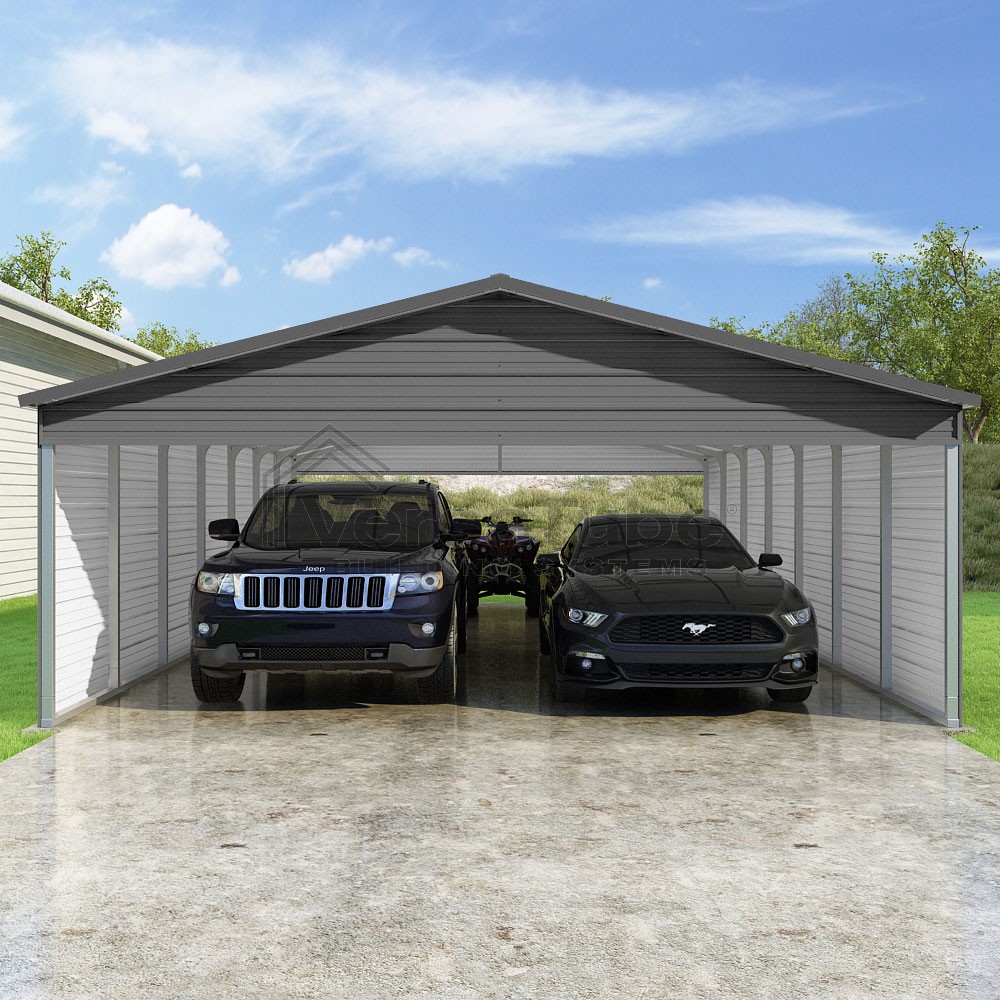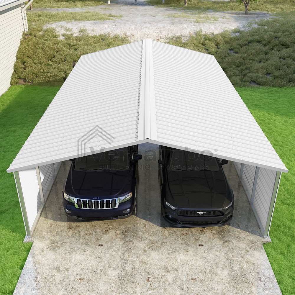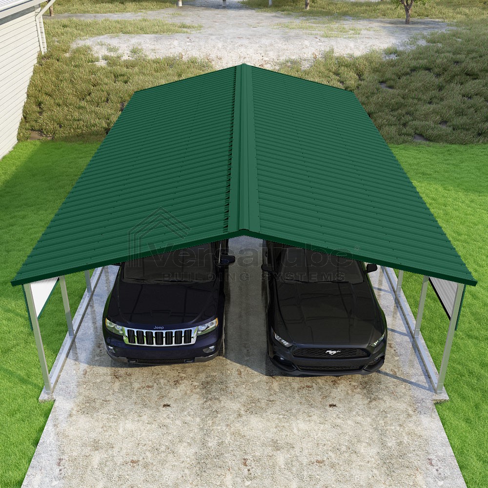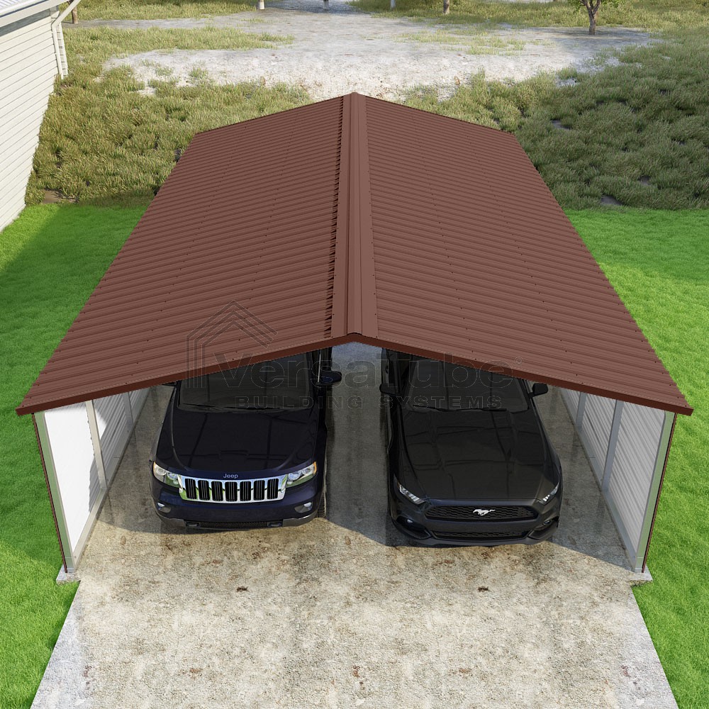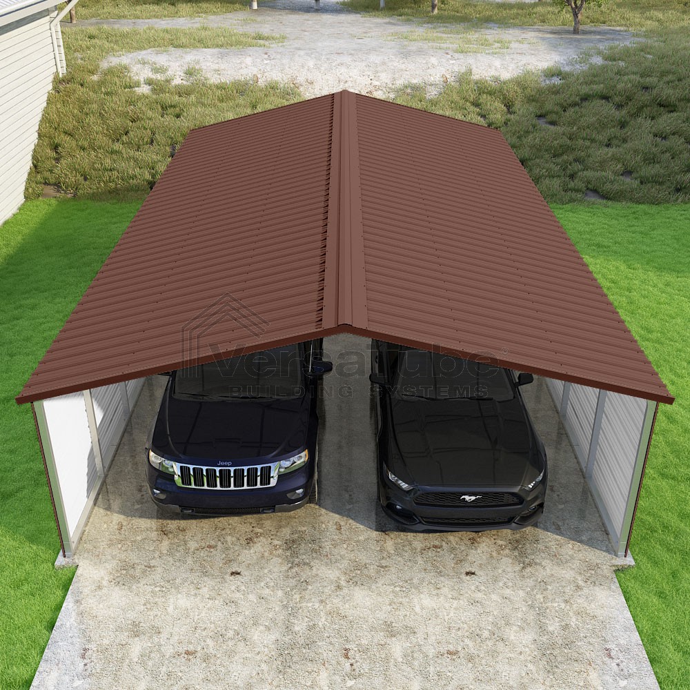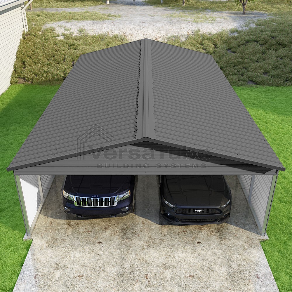 Pinnacle Series DIY carport kit features vertical sheet metal roof panels with ridge cap, gable and eave trim for an A-frame roof style and extended coverage on both ends.
