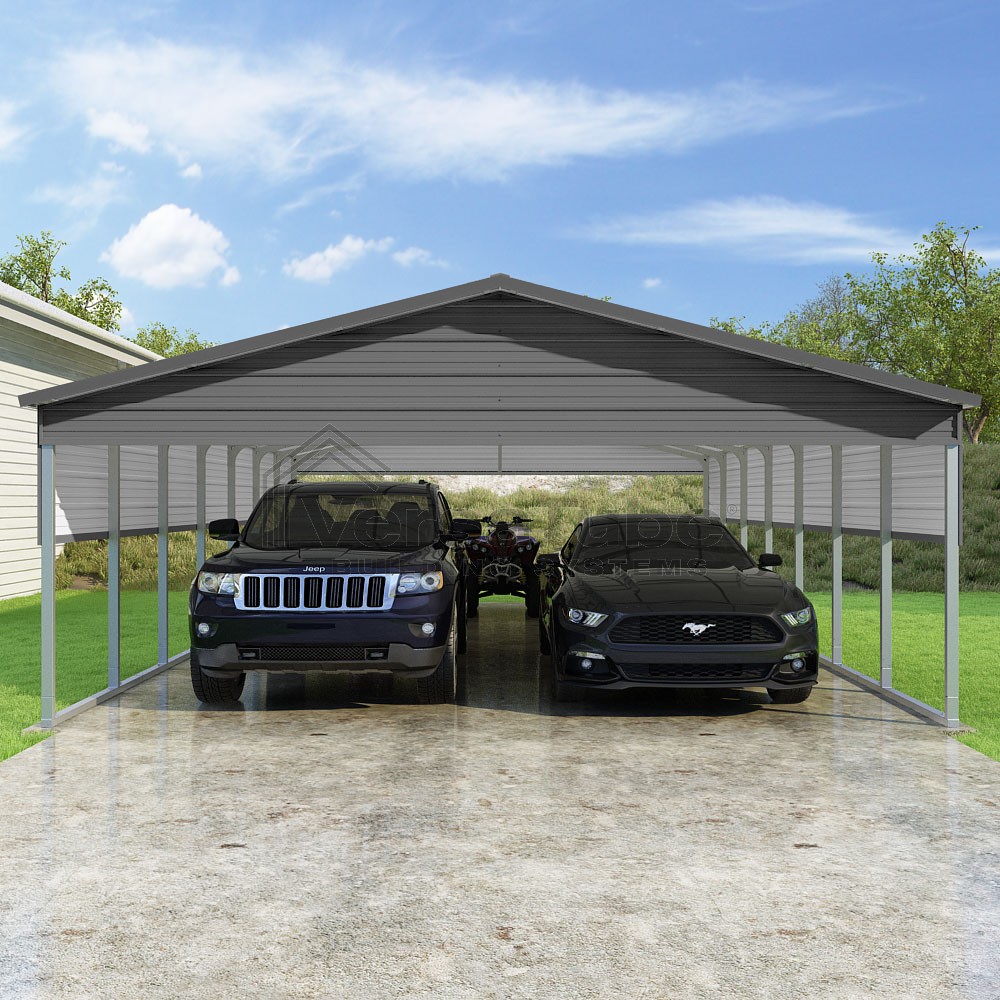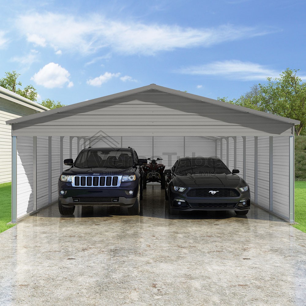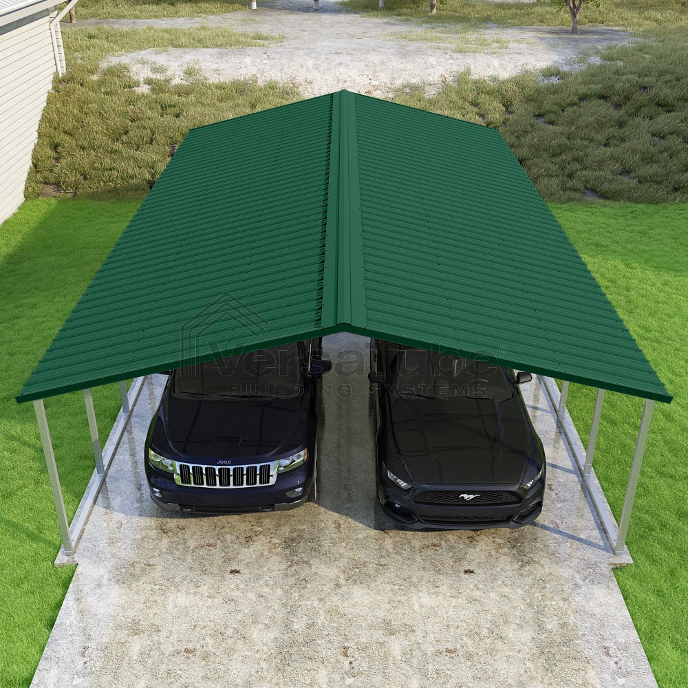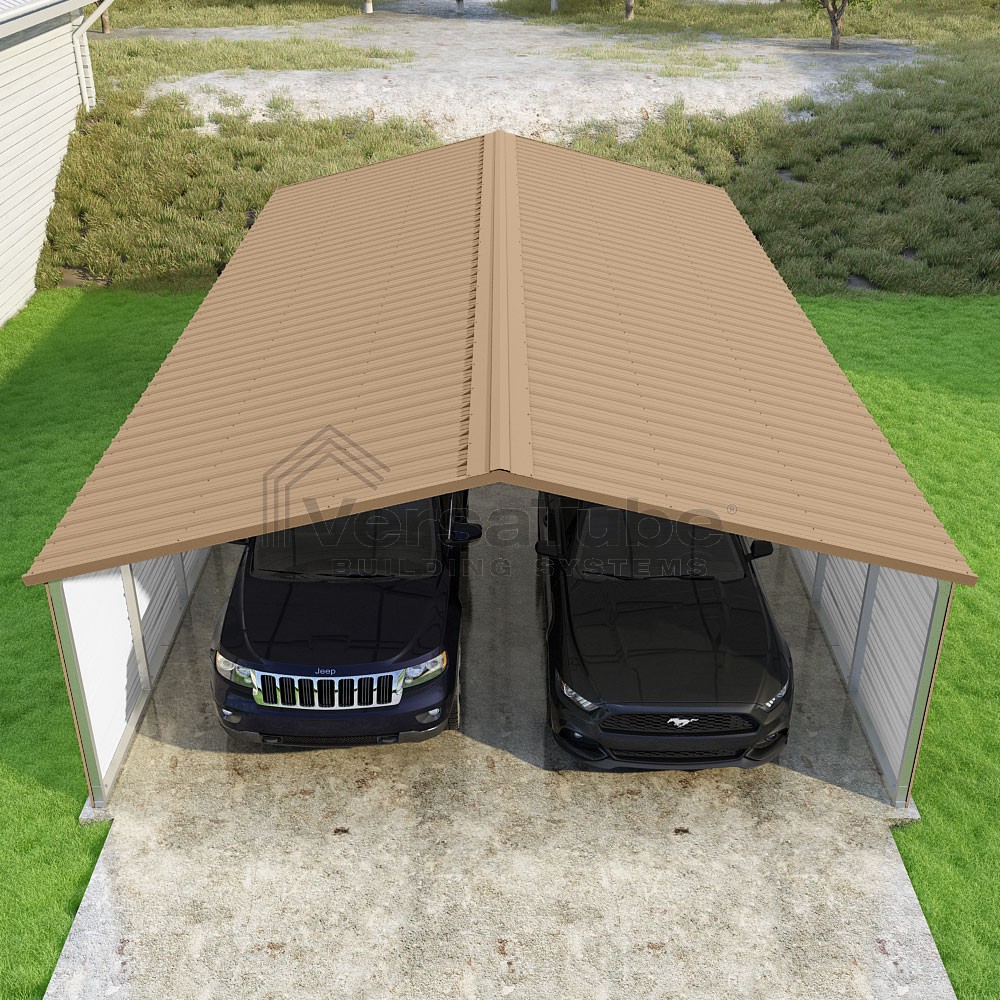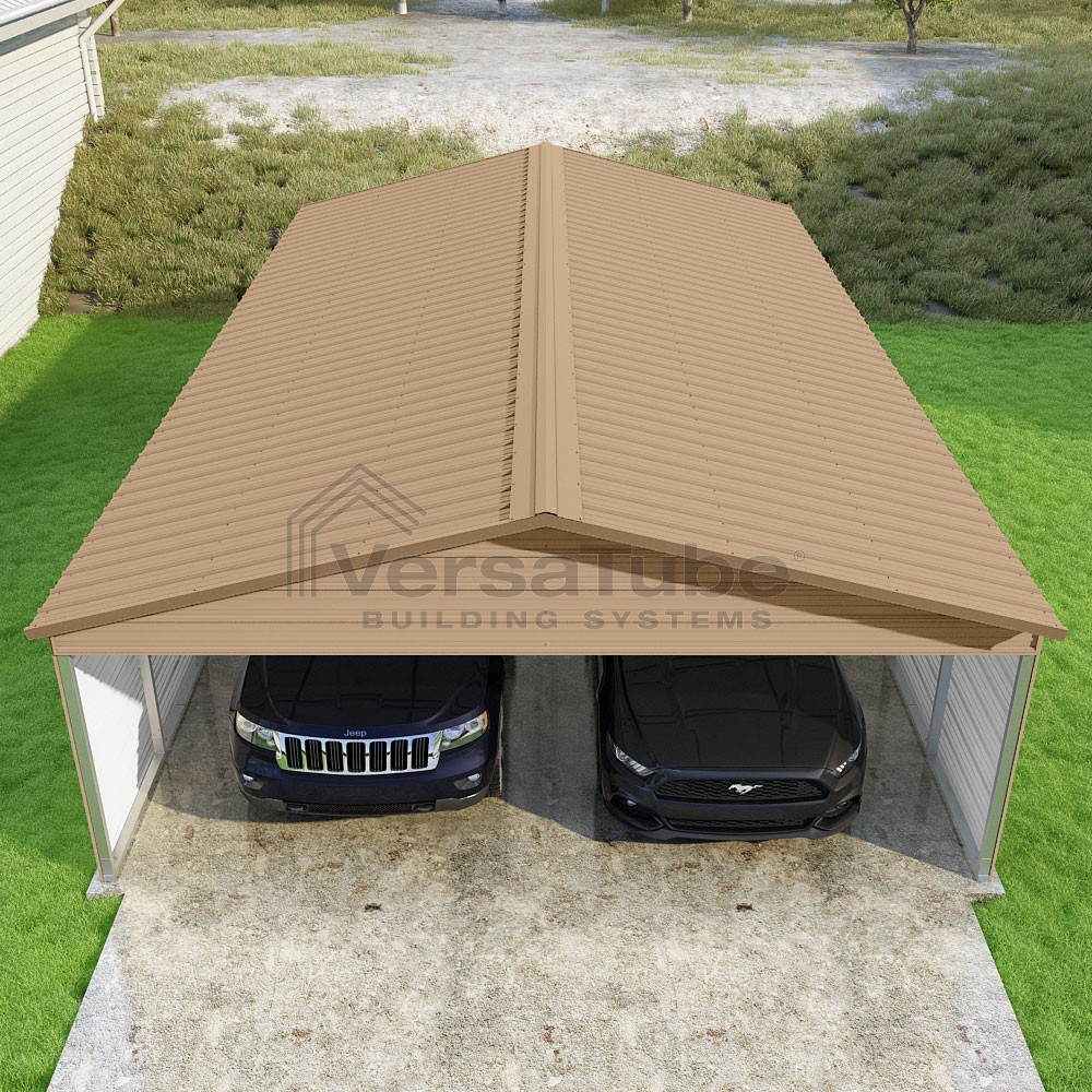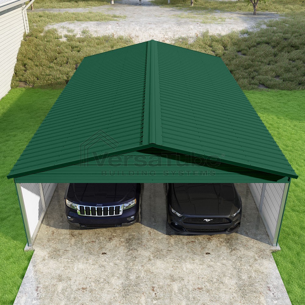 Pinnacle Series DIY carport kit features vertical sheet metal roof panels with ridge cap, gable and eave trim for an A-frame roof style and extended coverage on both ends.