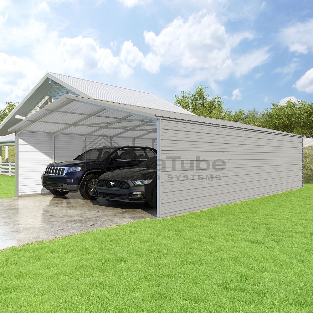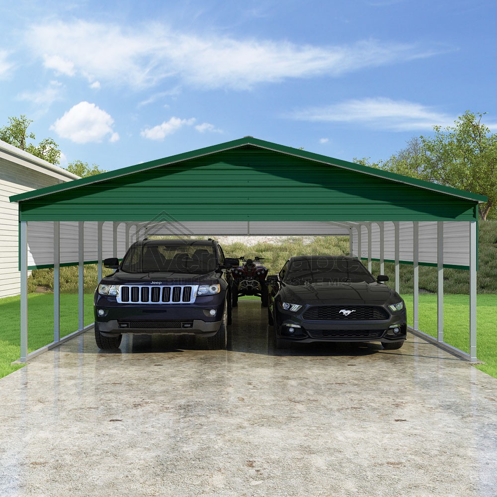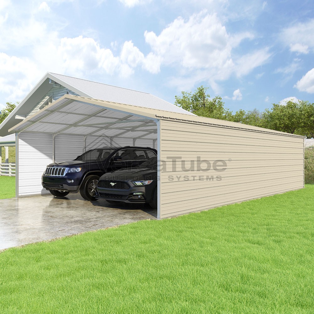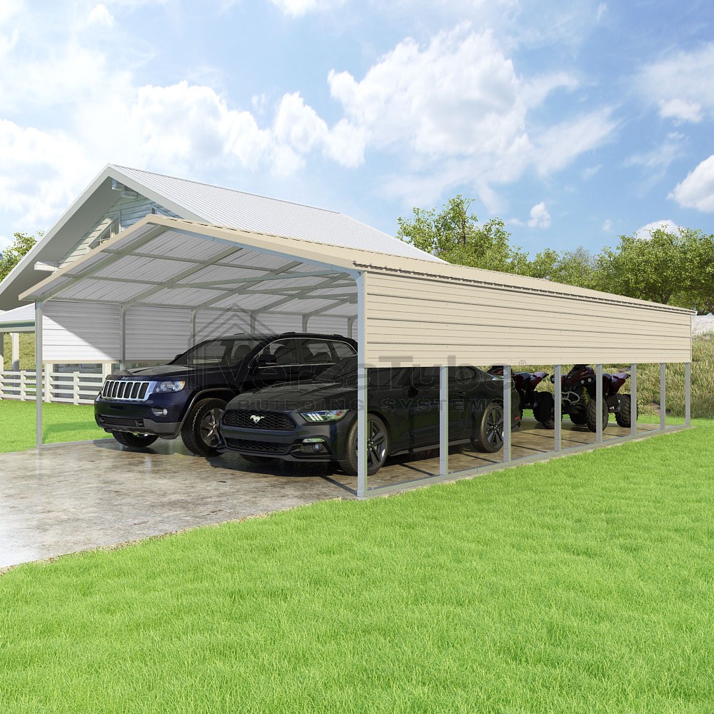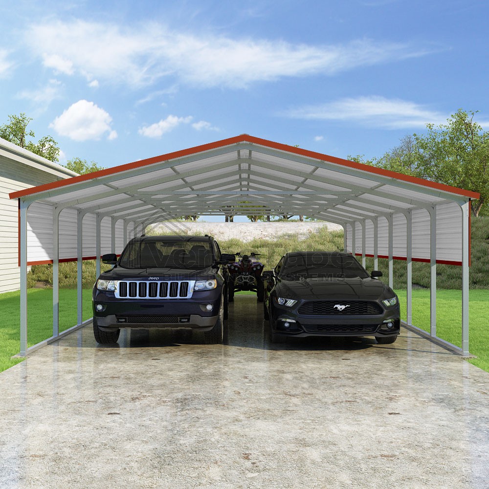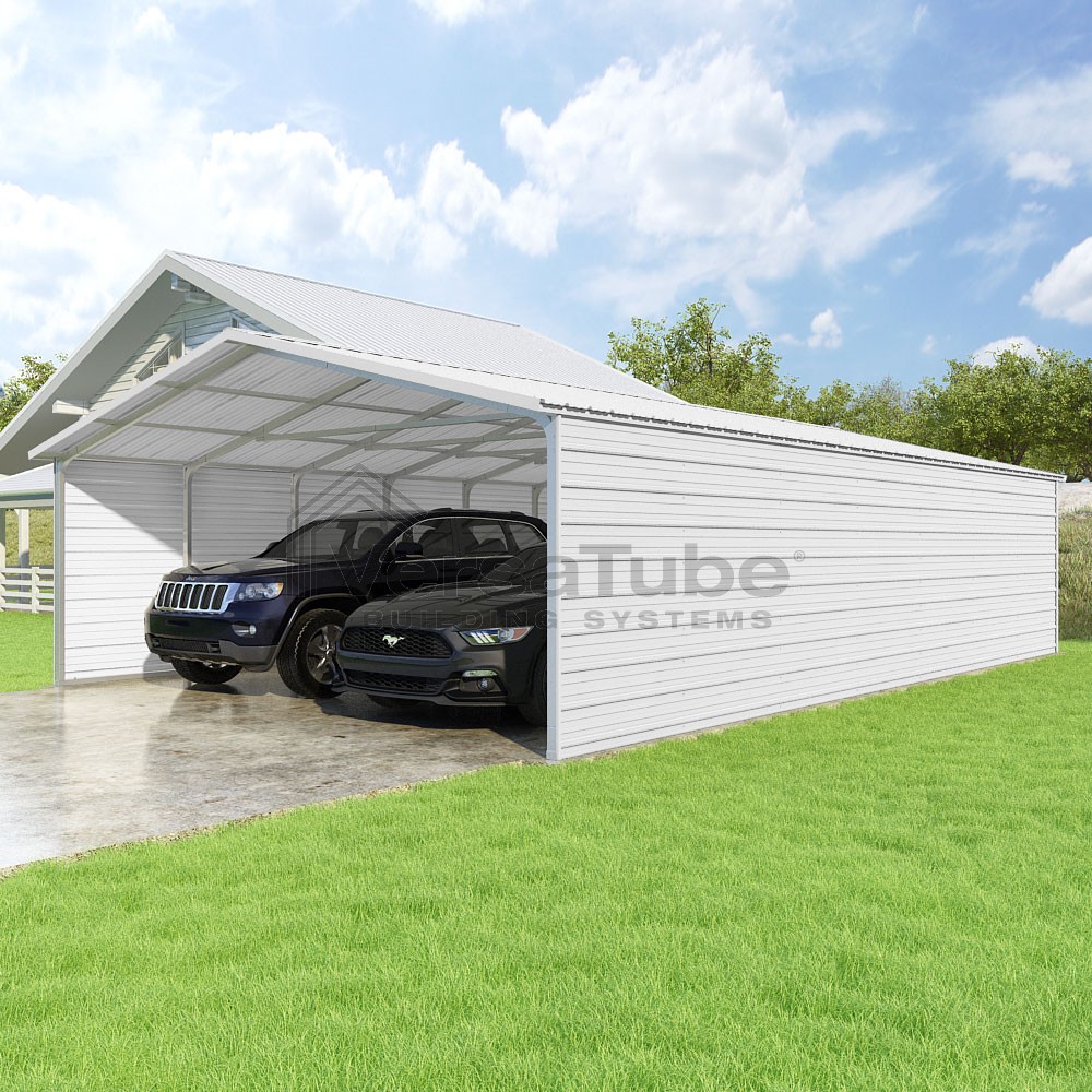 Pinnacle Series DIY carport kit features vertical sheet metal roof panels with ridge cap, gable and eave trim for an A-frame roof style and extended coverage on both ends.