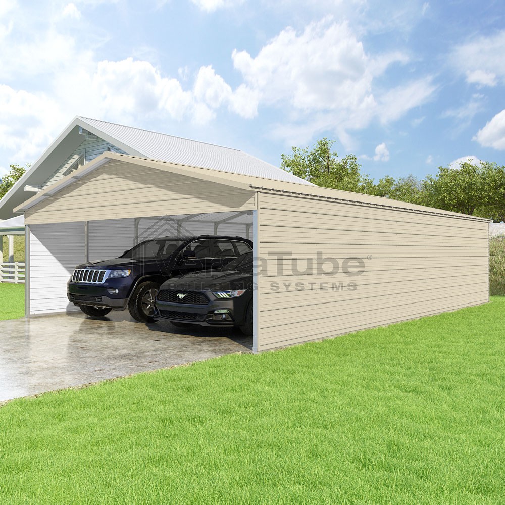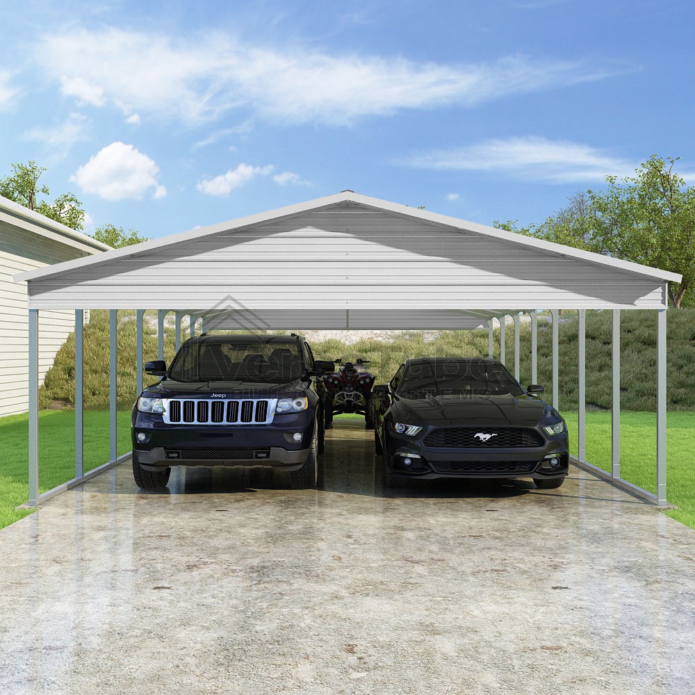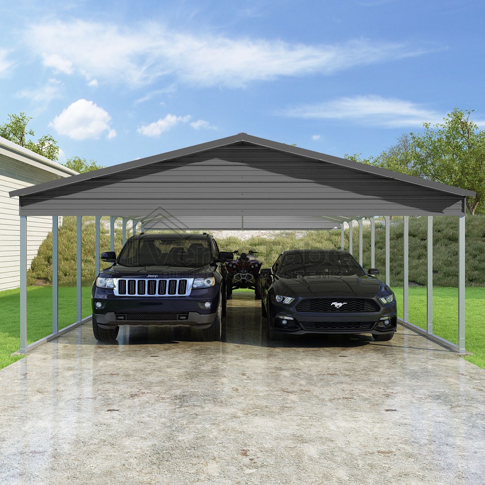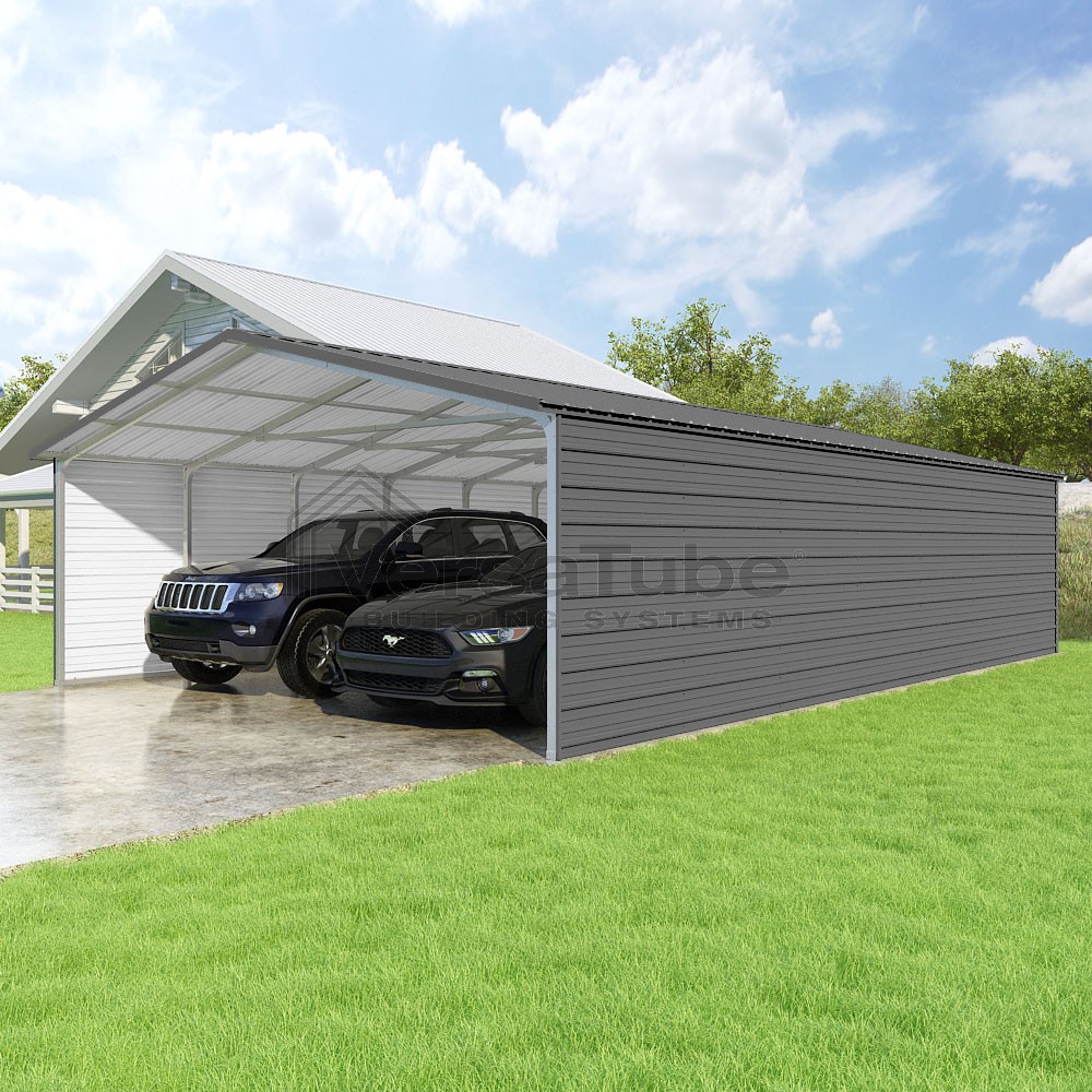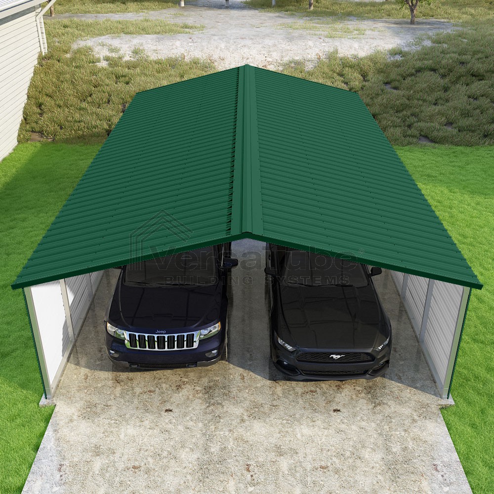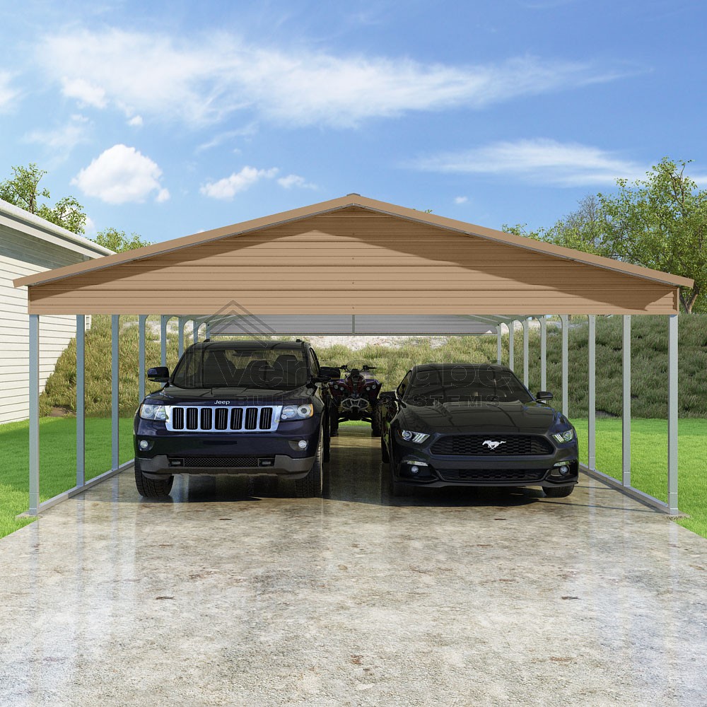 Pinnacle Series DIY carport kit features vertical sheet metal roof panels with ridge cap, gable and eave trim for an A-frame roof style and extended coverage on both ends.