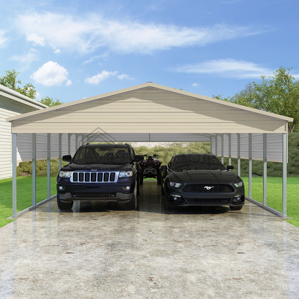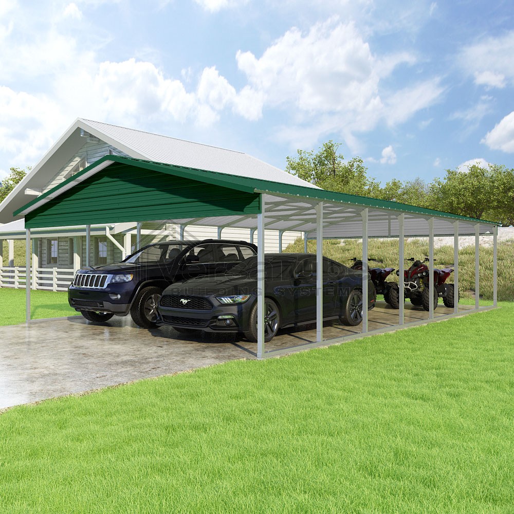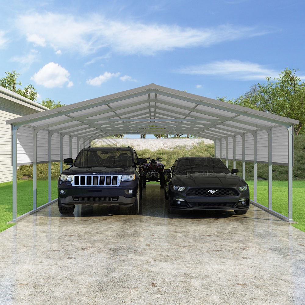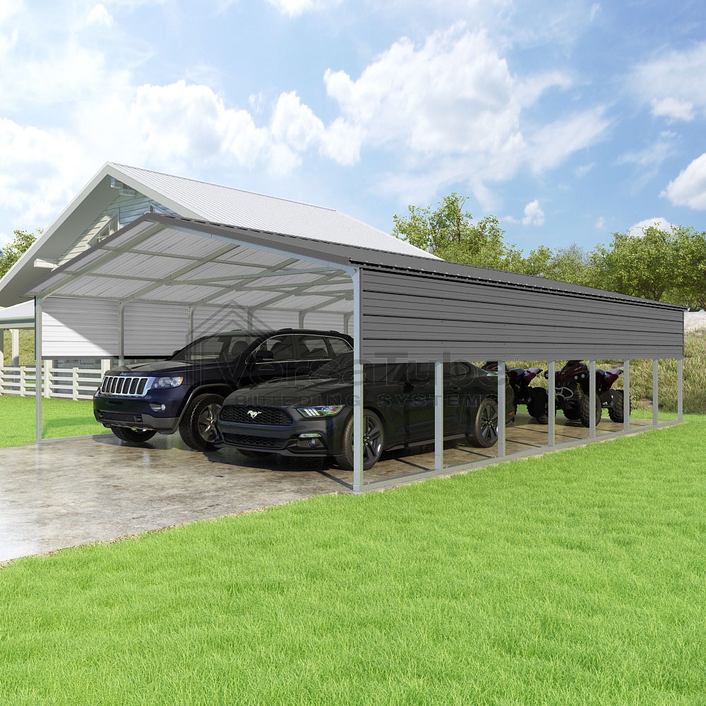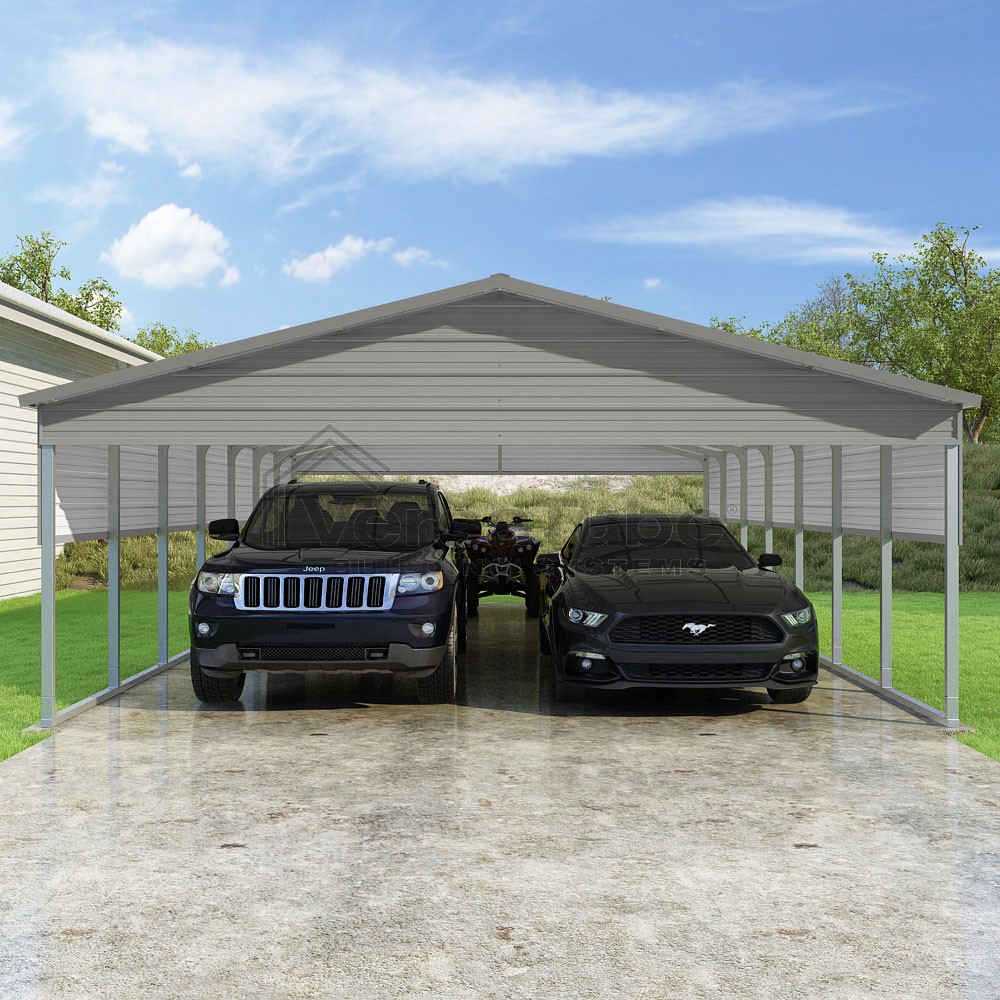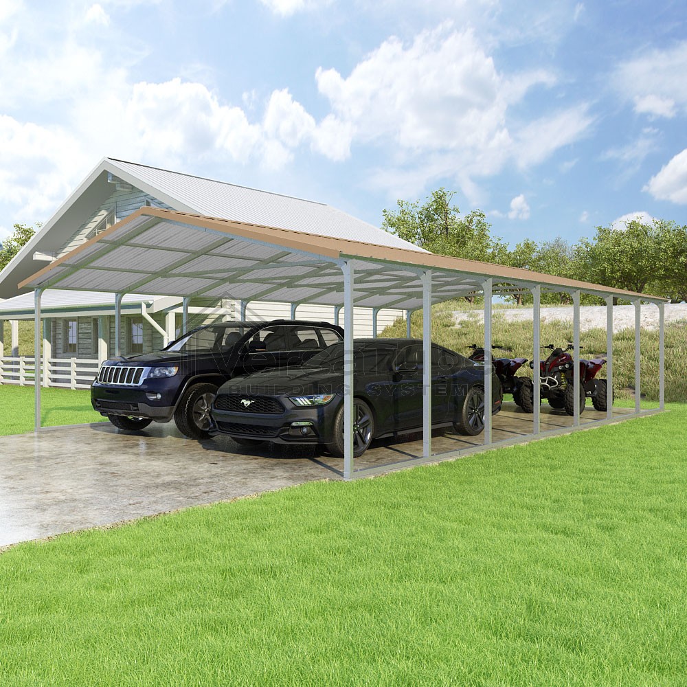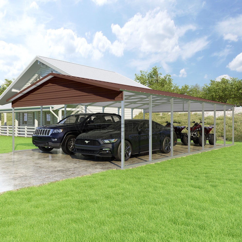 Pinnacle Series DIY carport kit features vertical sheet metal roof panels with ridge cap, gable and eave trim for an A-frame roof style and extended coverage on both ends.