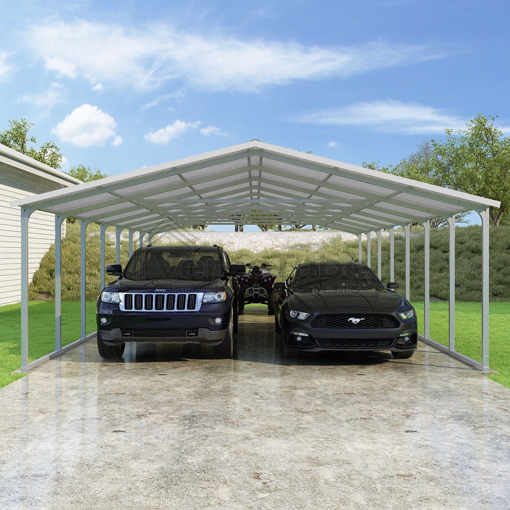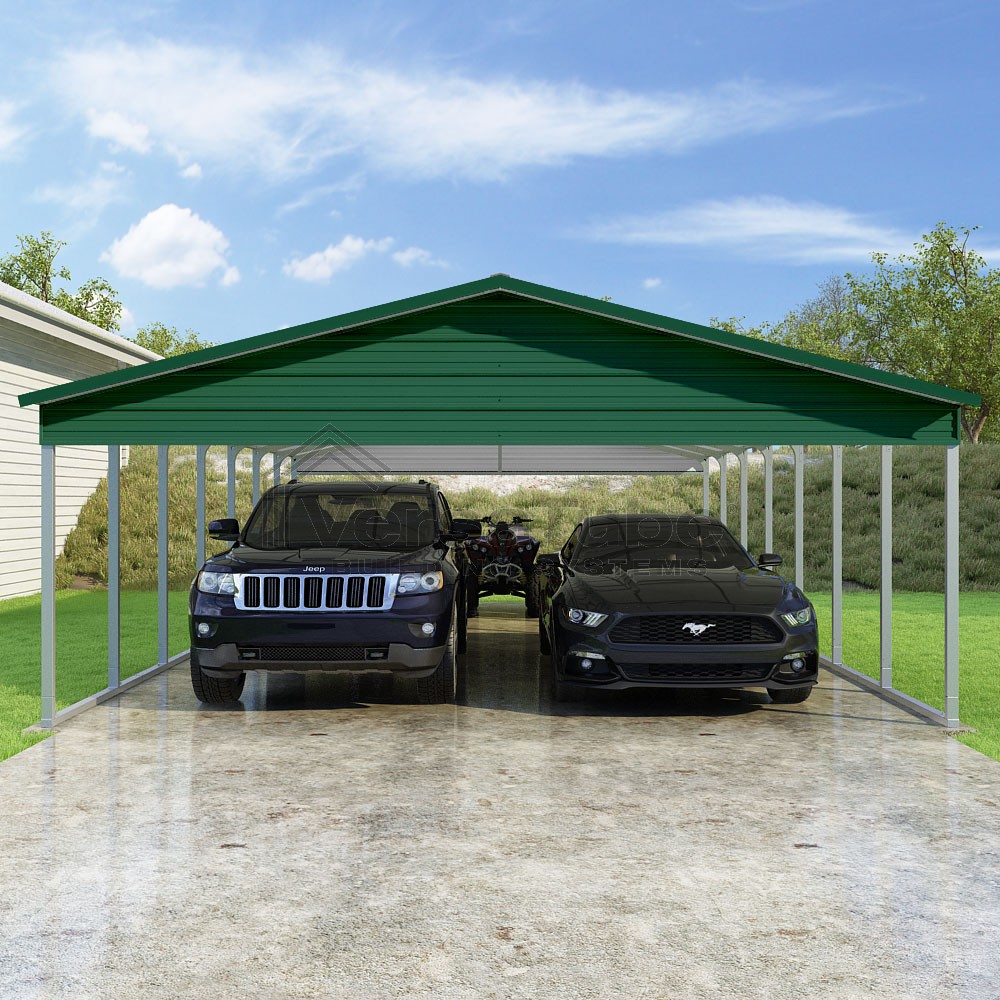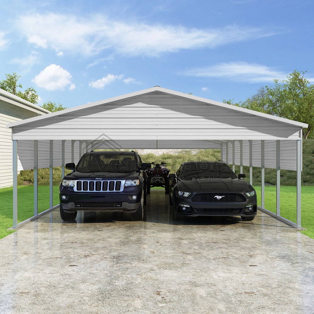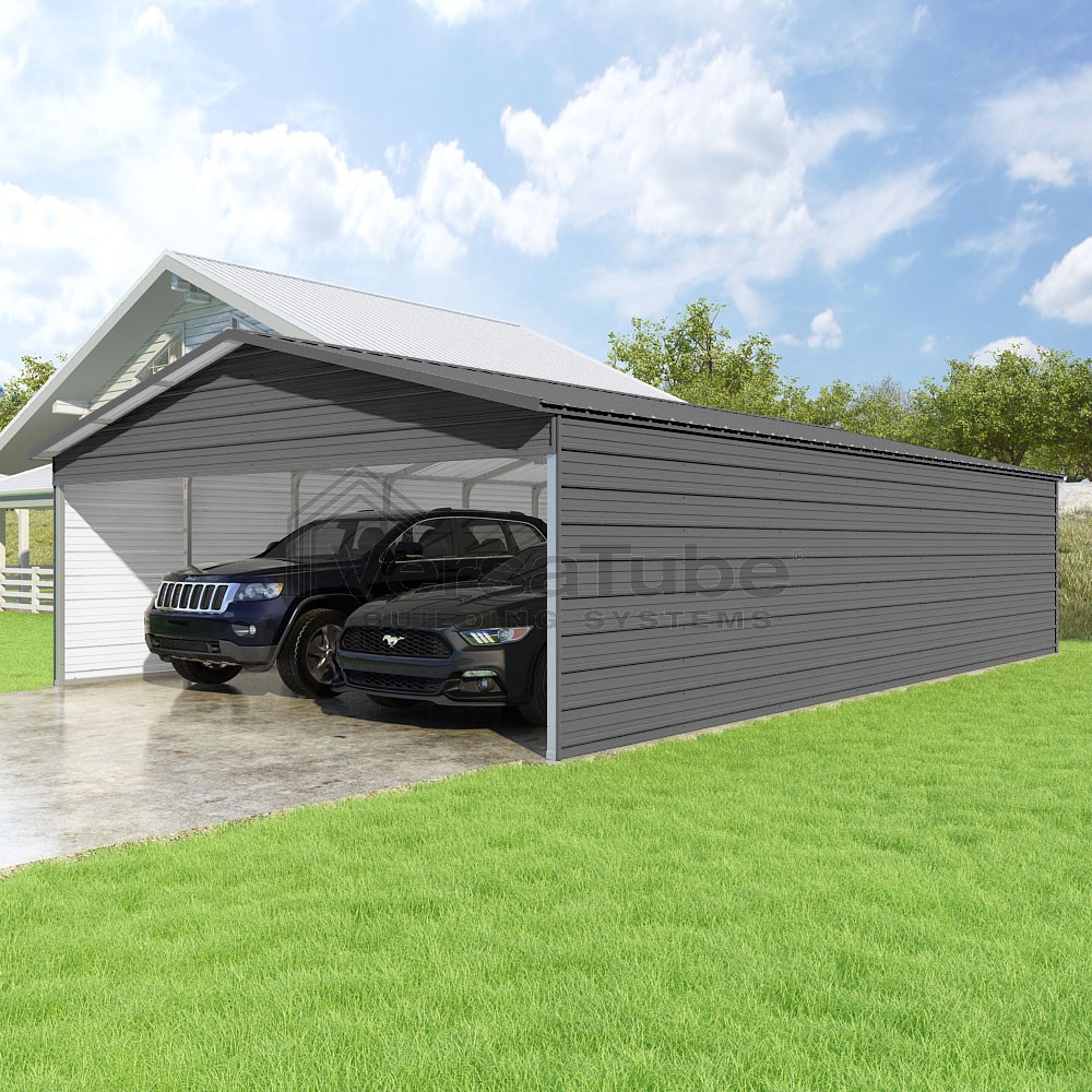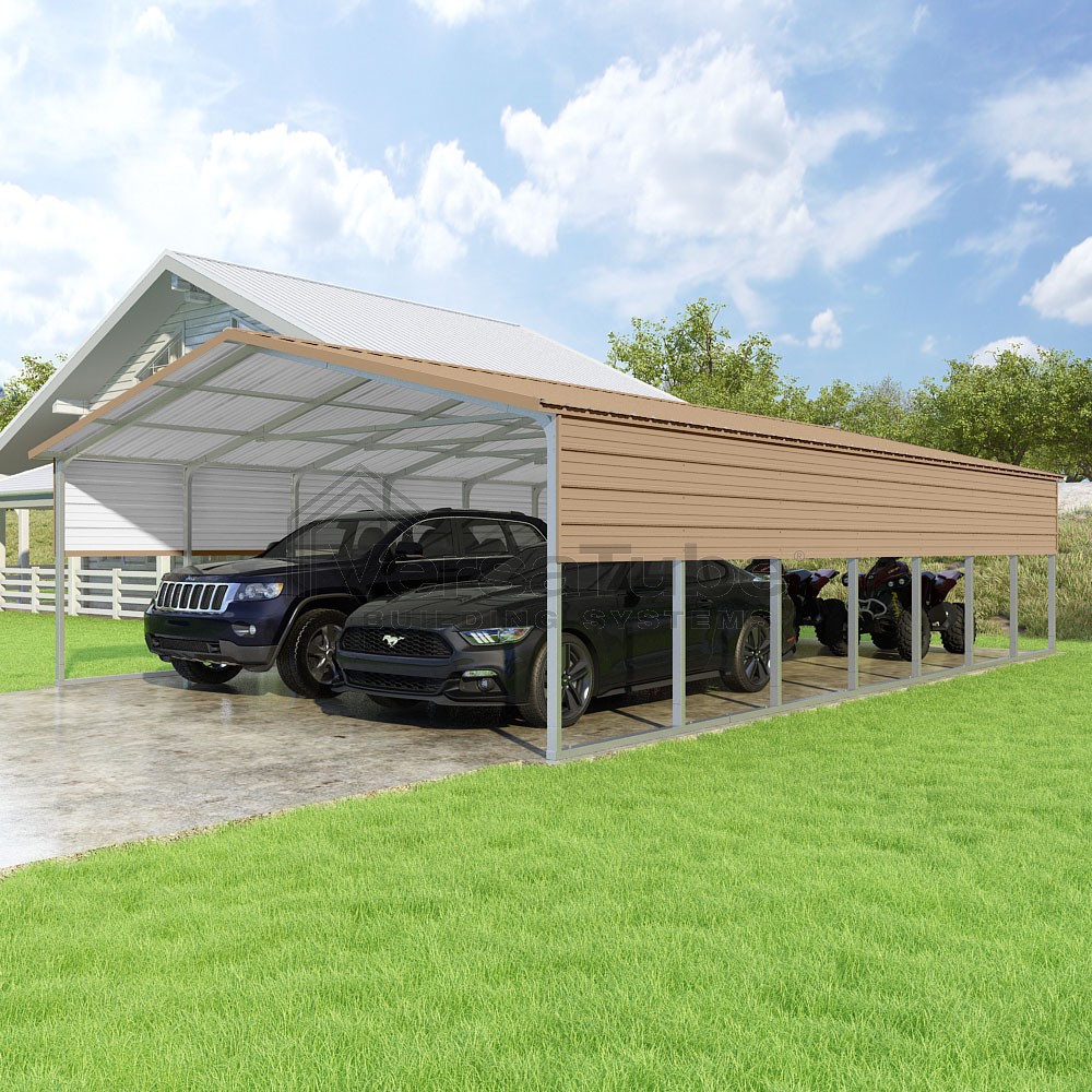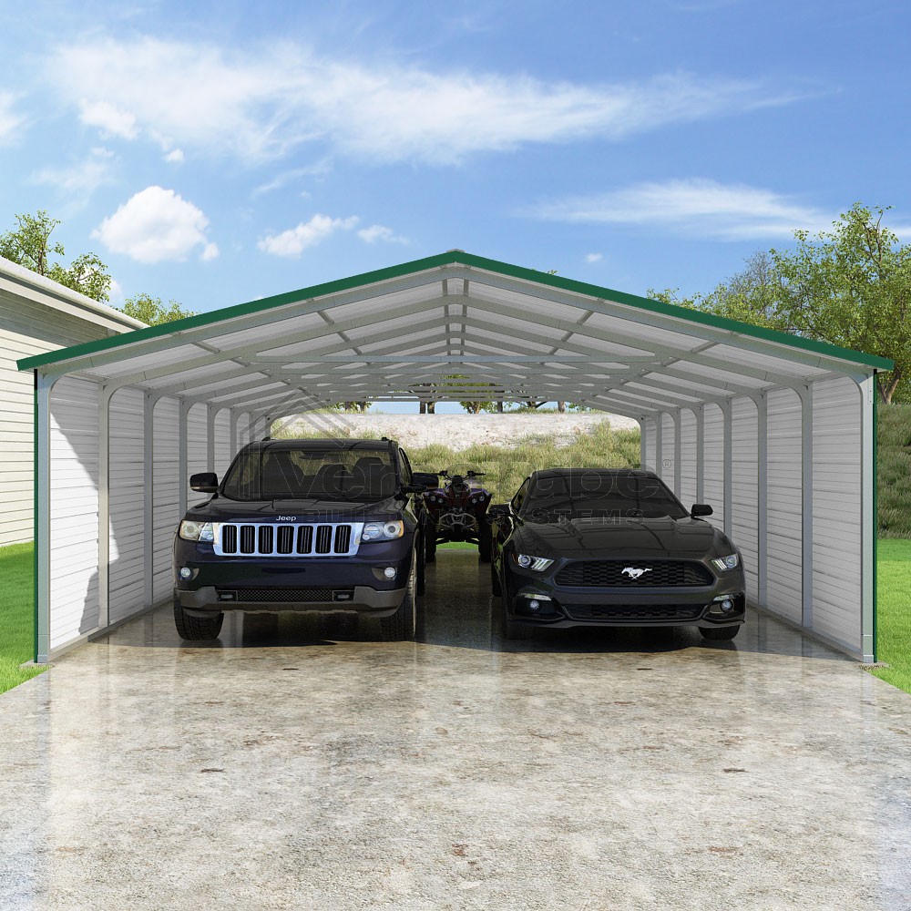 Pinnacle Series DIY carport kit features vertical sheet metal roof panels with ridge cap, gable and eave trim for an A-frame roof style and extended coverage on both ends.
