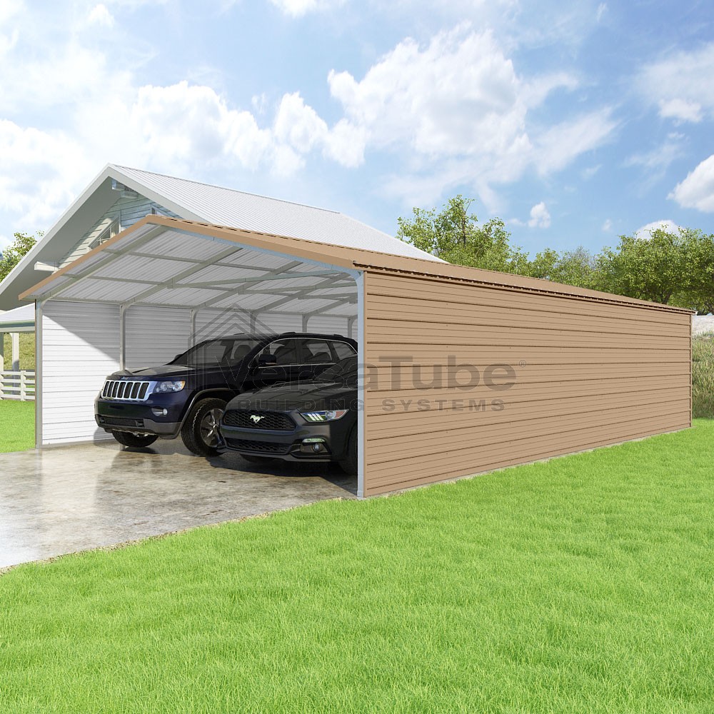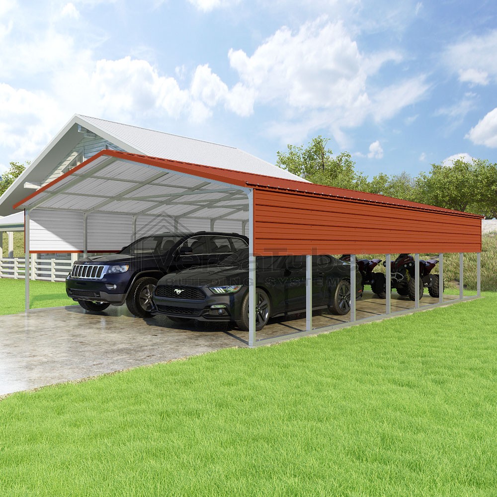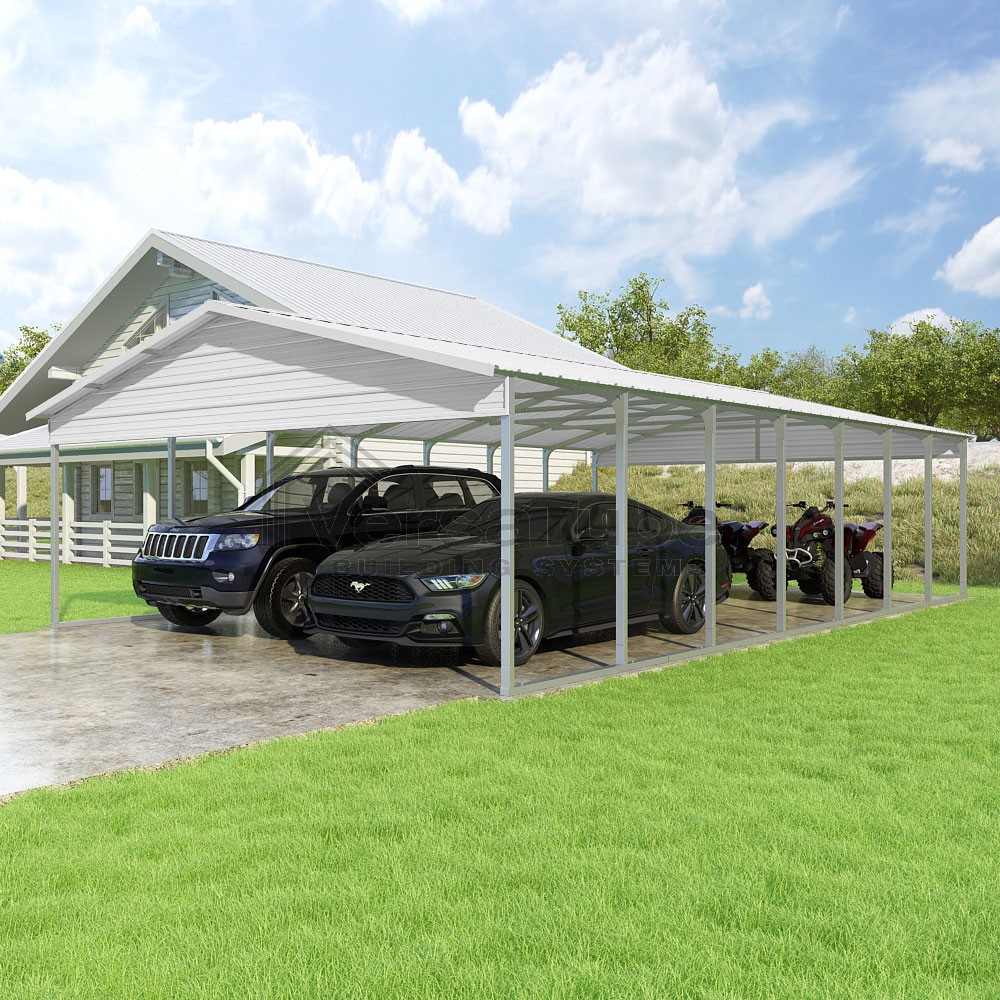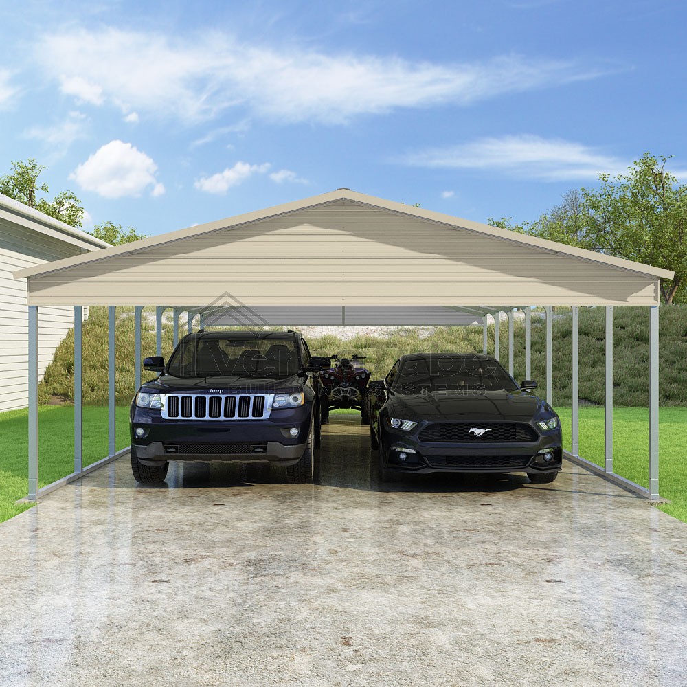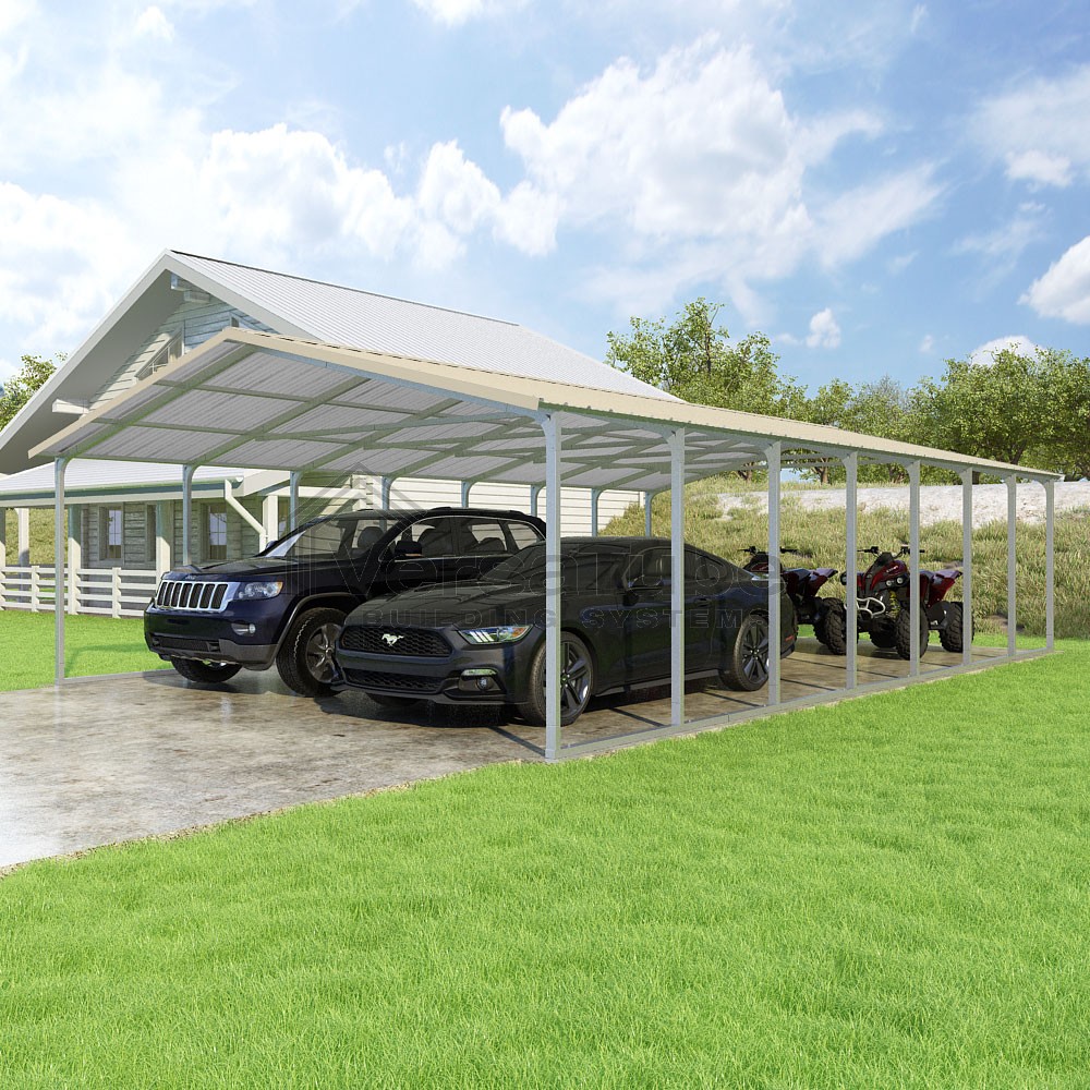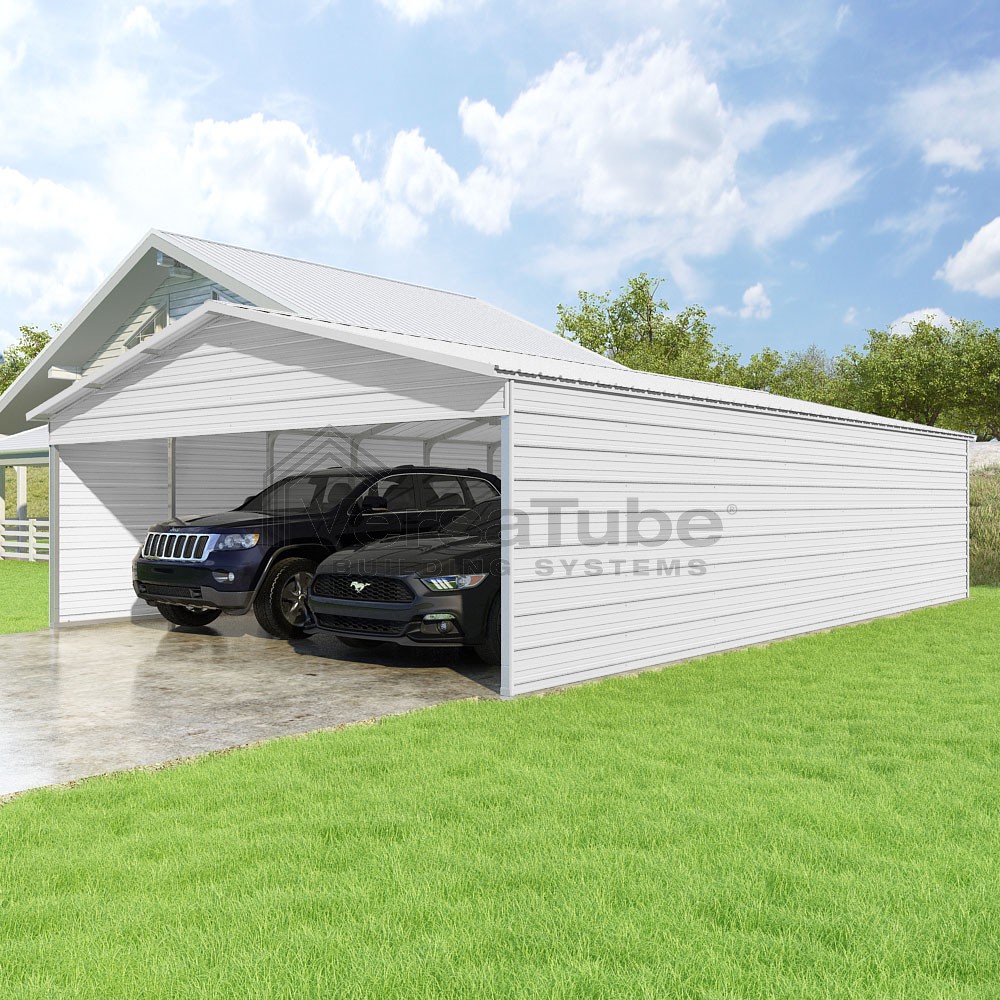 Pinnacle Series DIY carport kit features vertical sheet metal roof panels with ridge cap, gable and eave trim for an A-frame roof style and extended coverage on both ends.