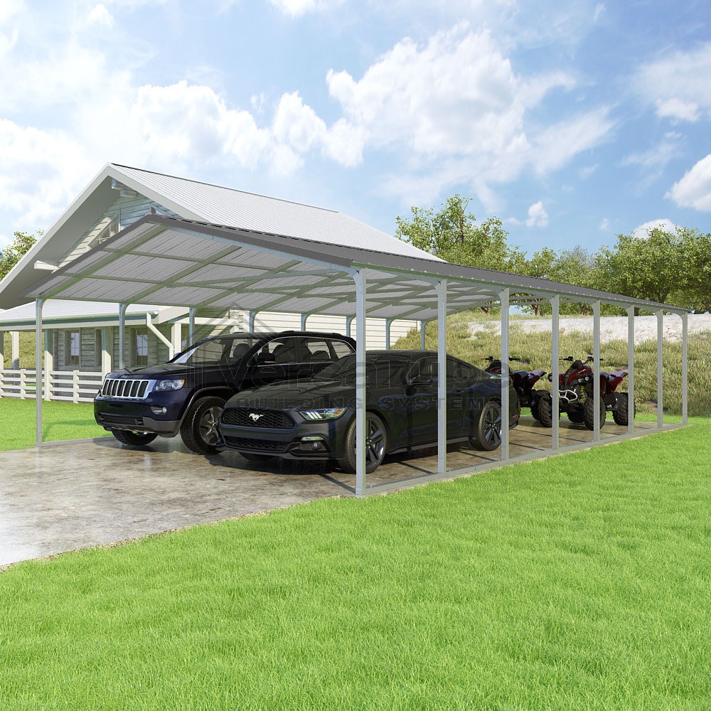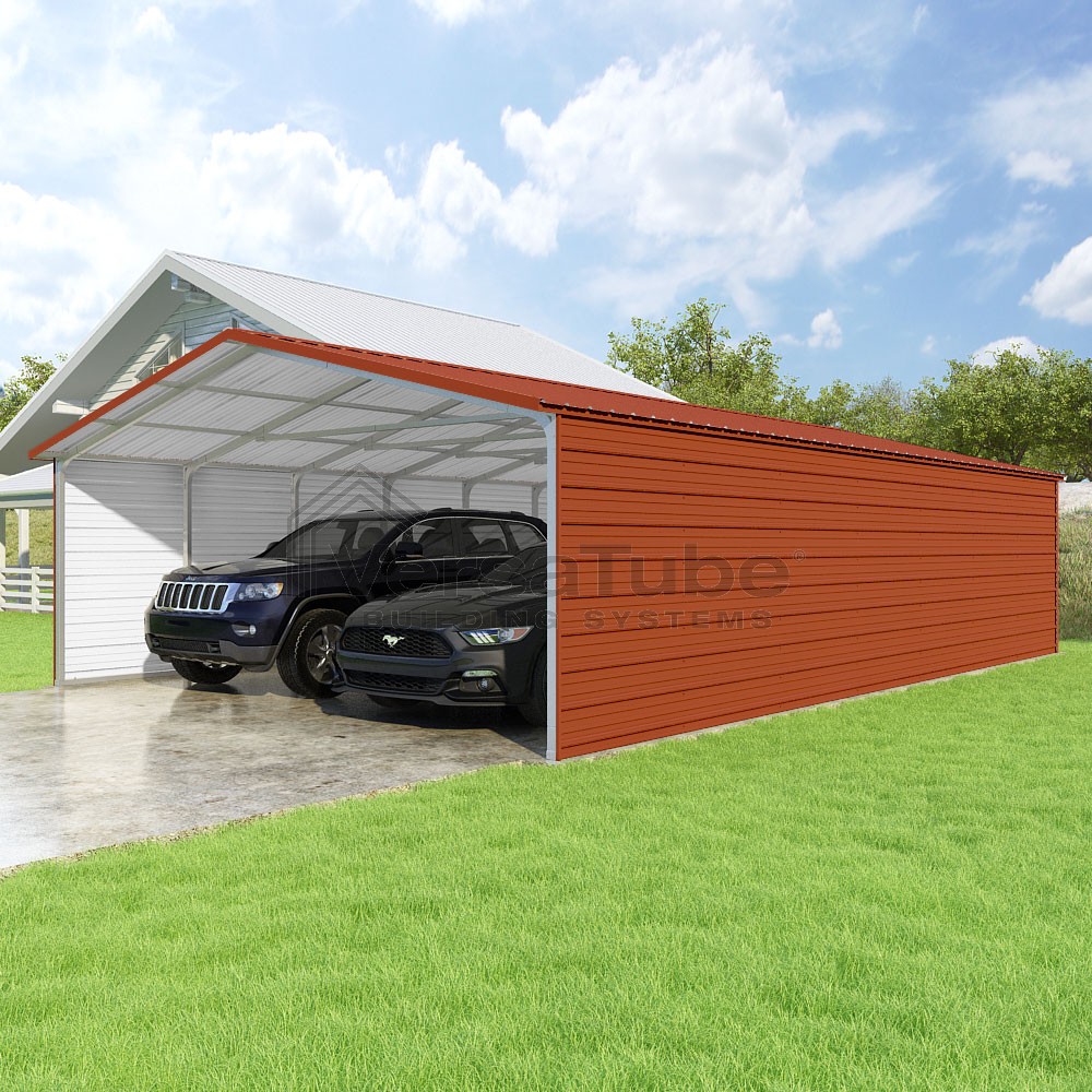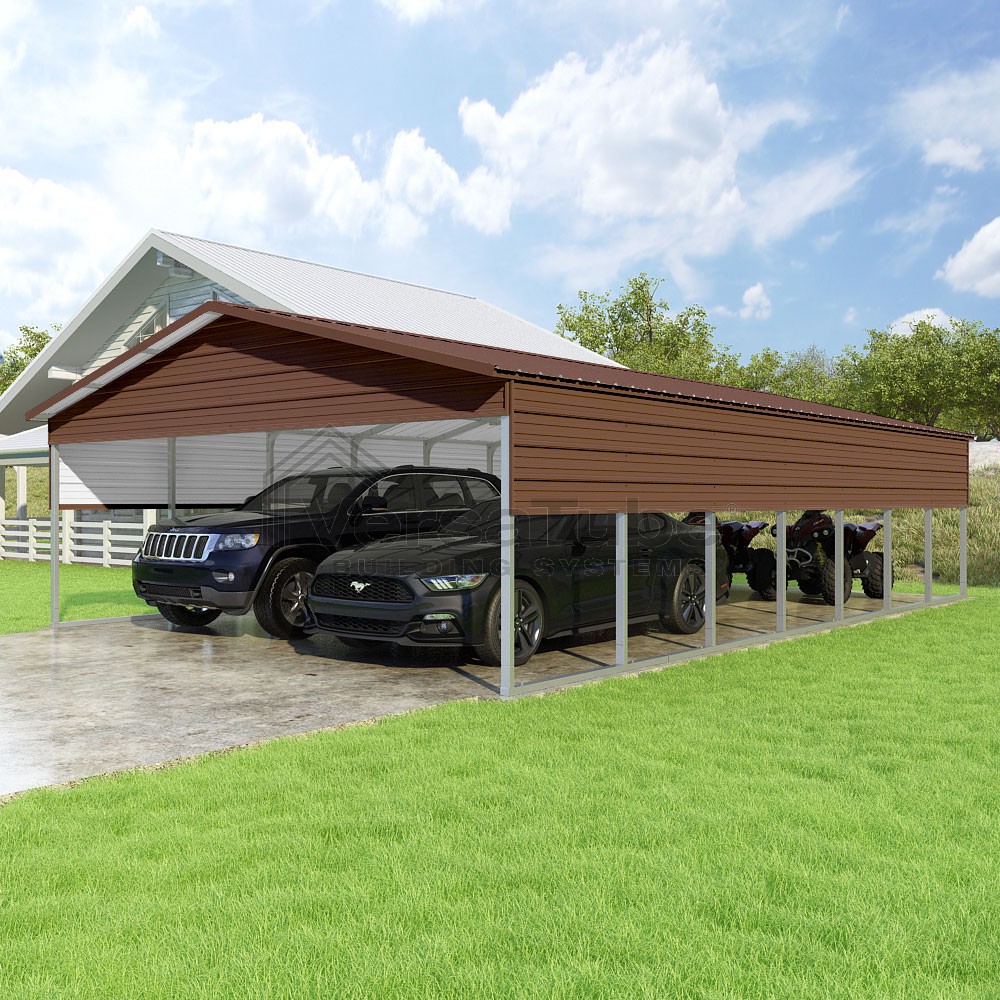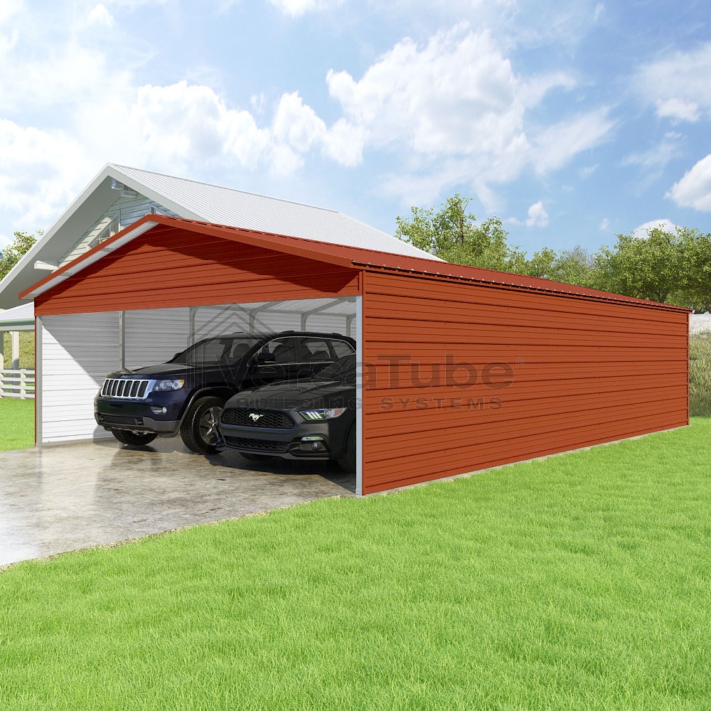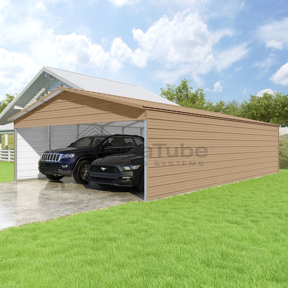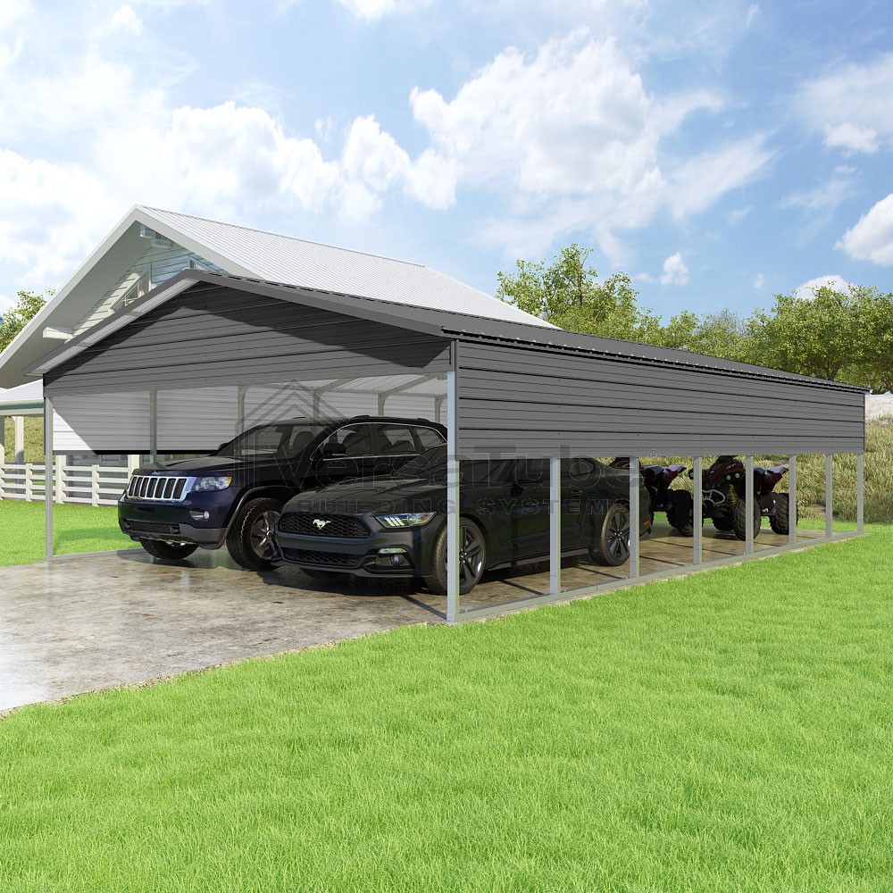 Pinnacle Series DIY carport kit features vertical sheet metal roof panels with ridge cap, gable and eave trim for an A-frame roof style and extended coverage on both ends.