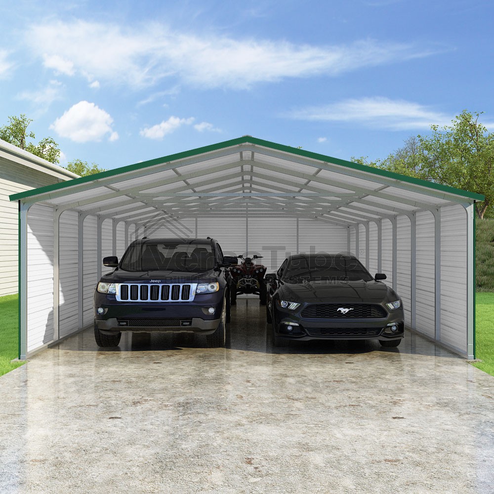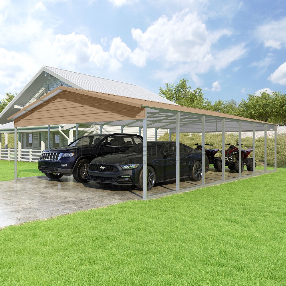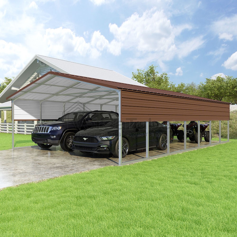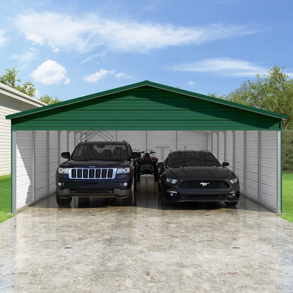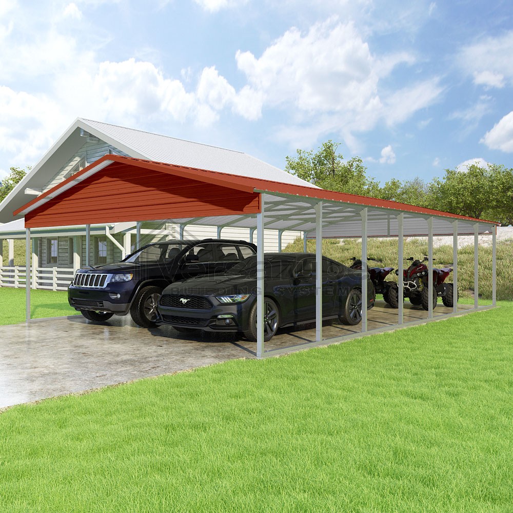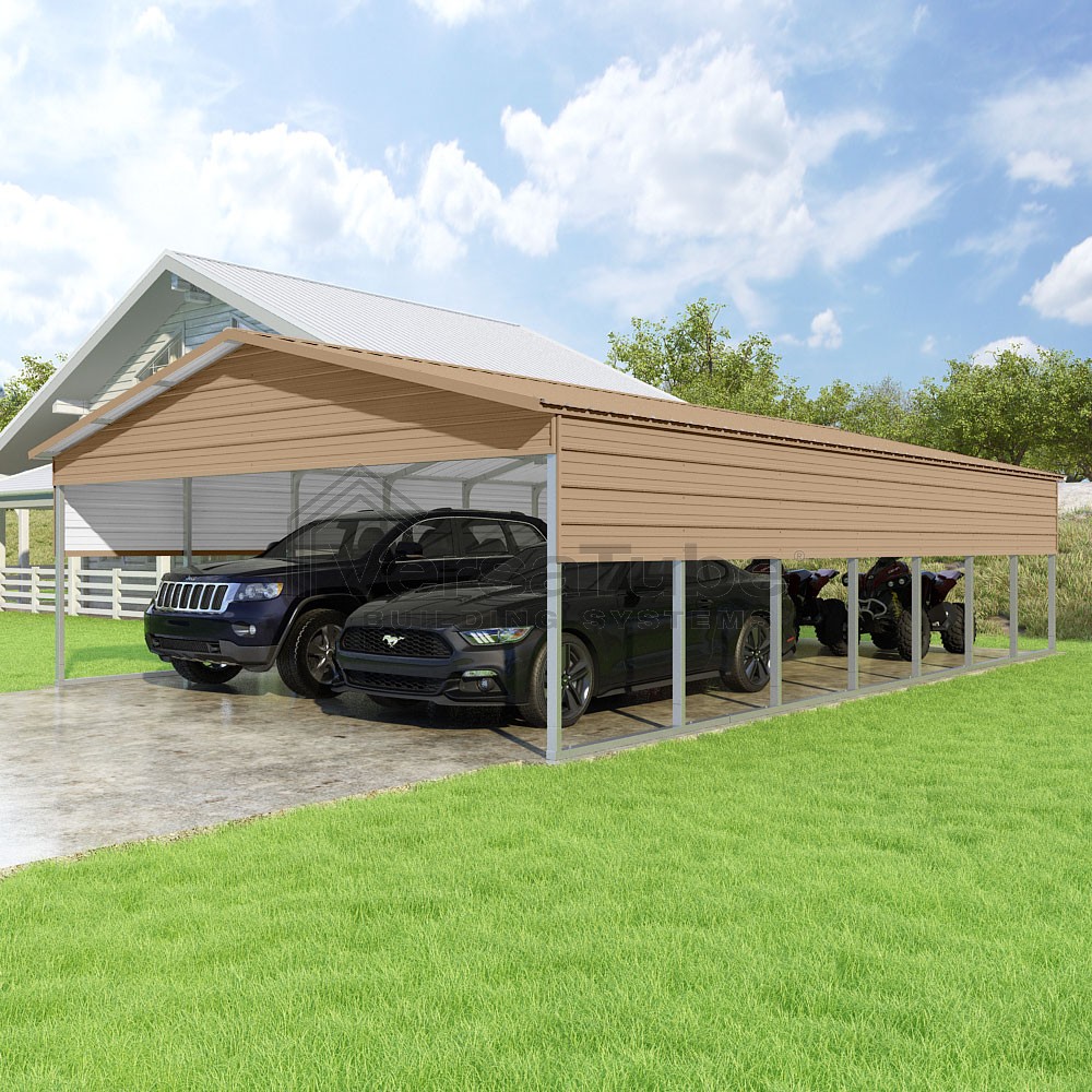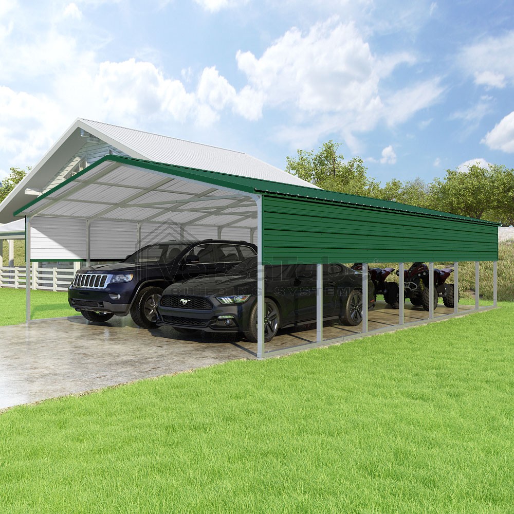 Pinnacle Series DIY carport kit features vertical sheet metal roof panels with ridge cap, gable and eave trim for an A-frame roof style and extended coverage on both ends.