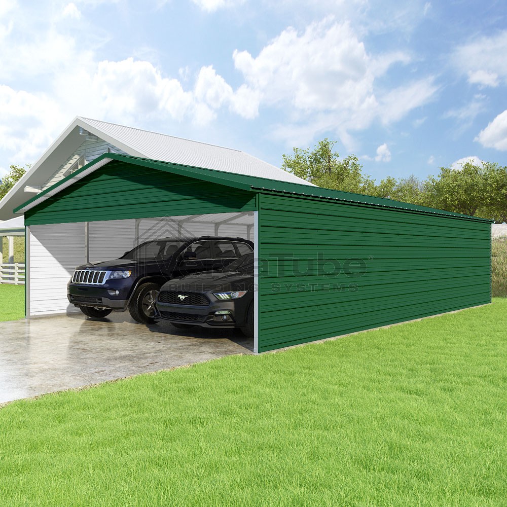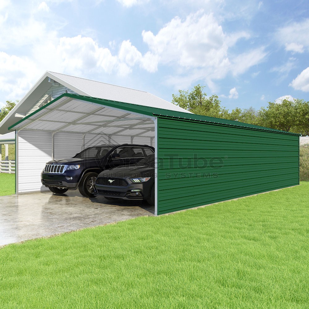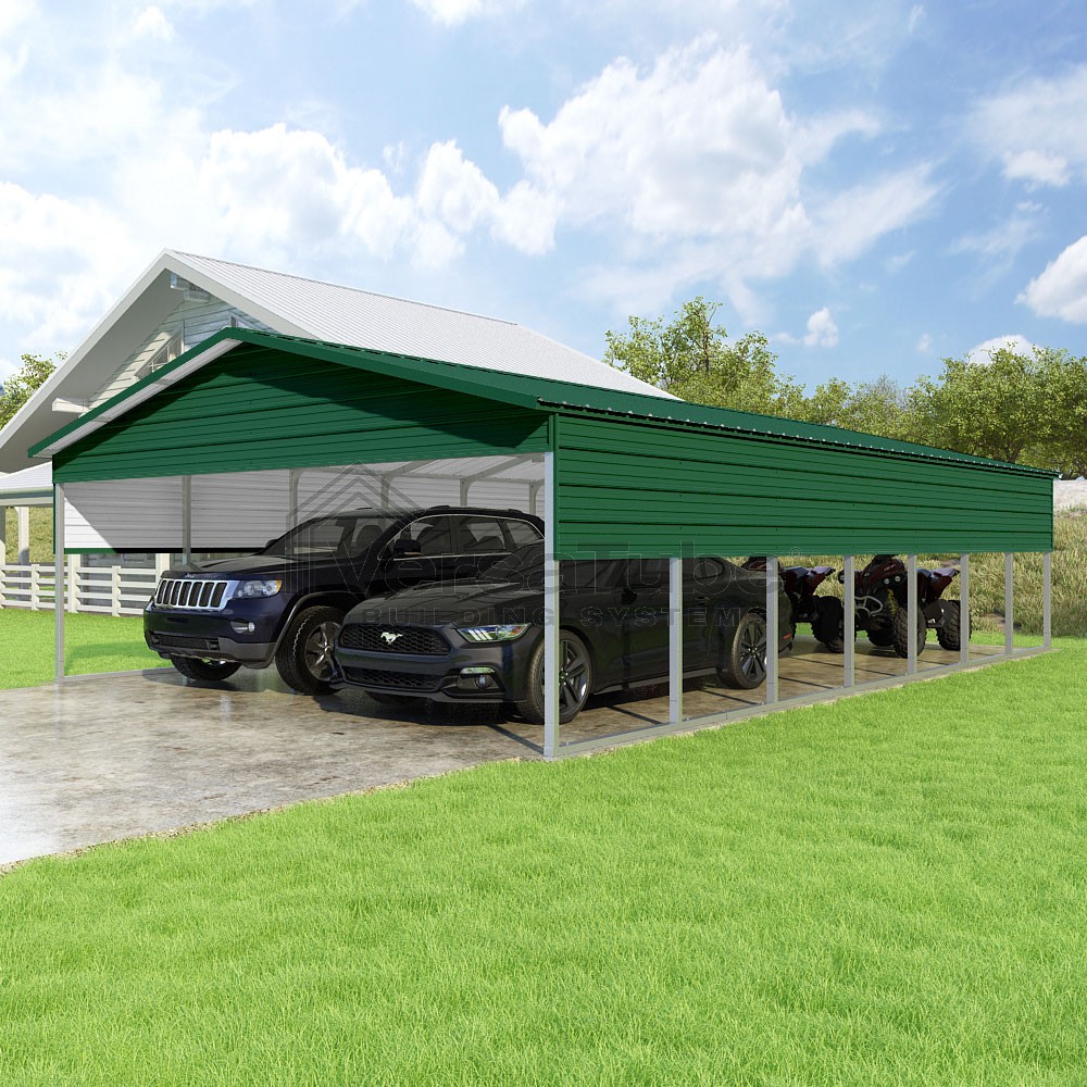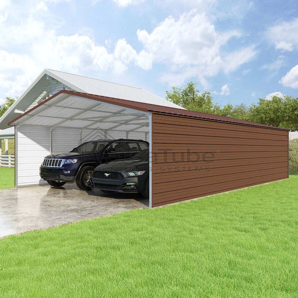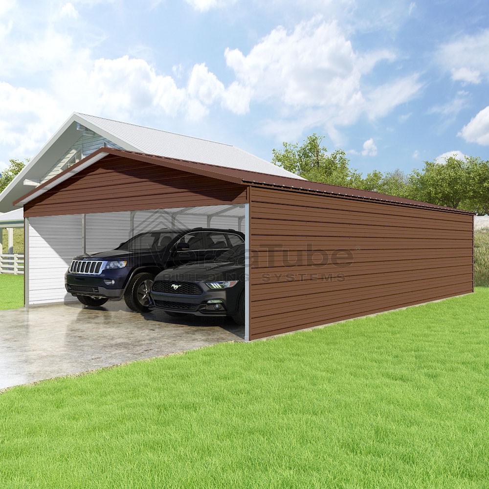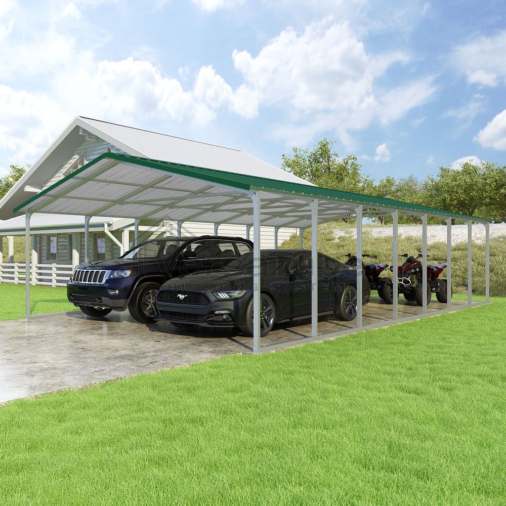 Pinnacle Series DIY carport kit features vertical sheet metal roof panels with ridge cap, gable and eave trim for an A-frame roof style and extended coverage on both ends.