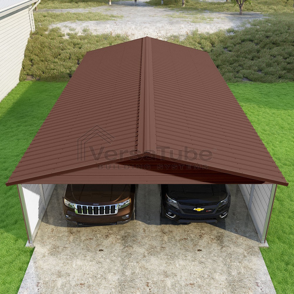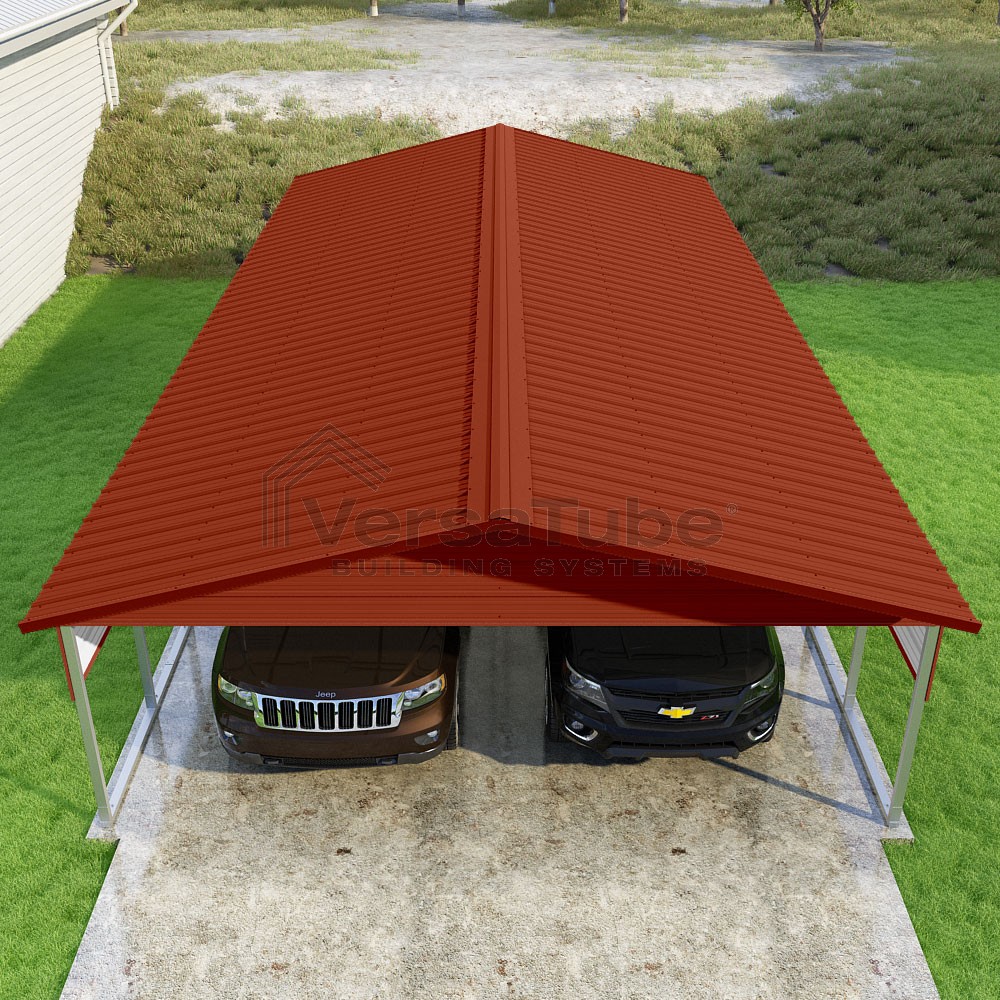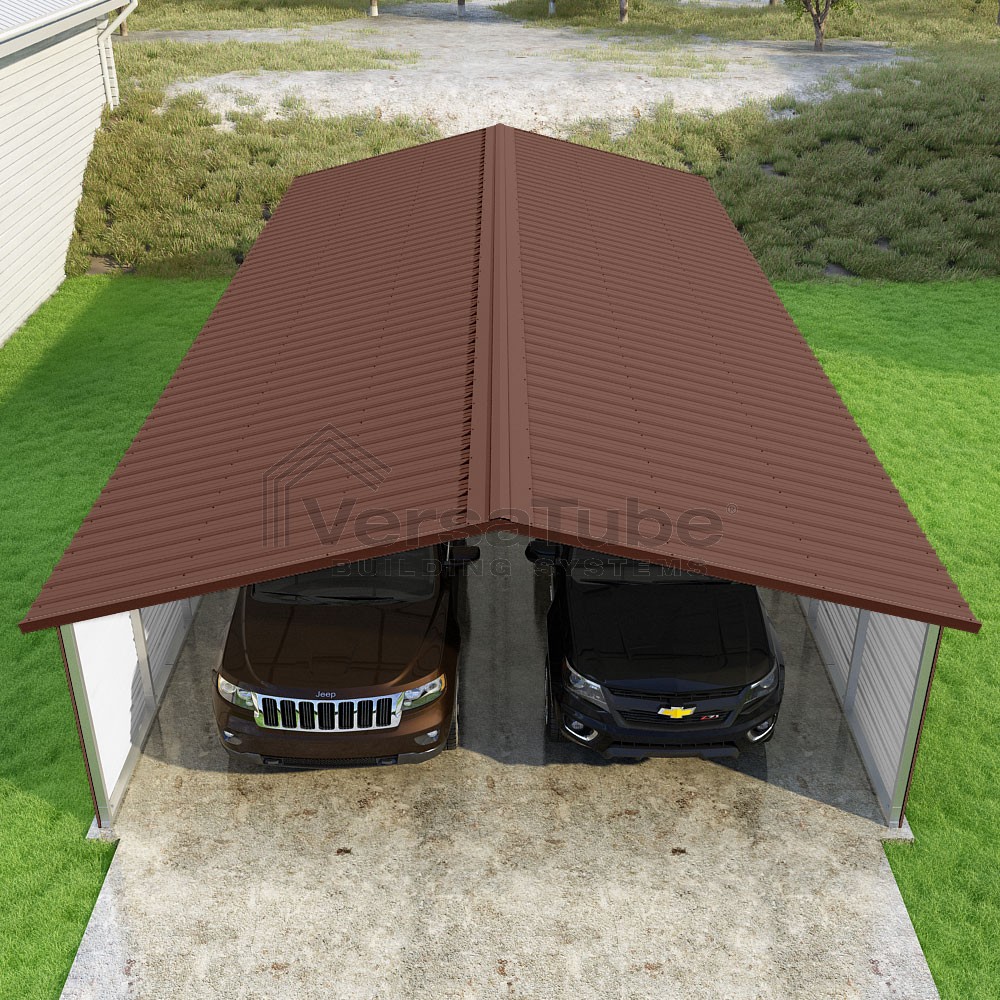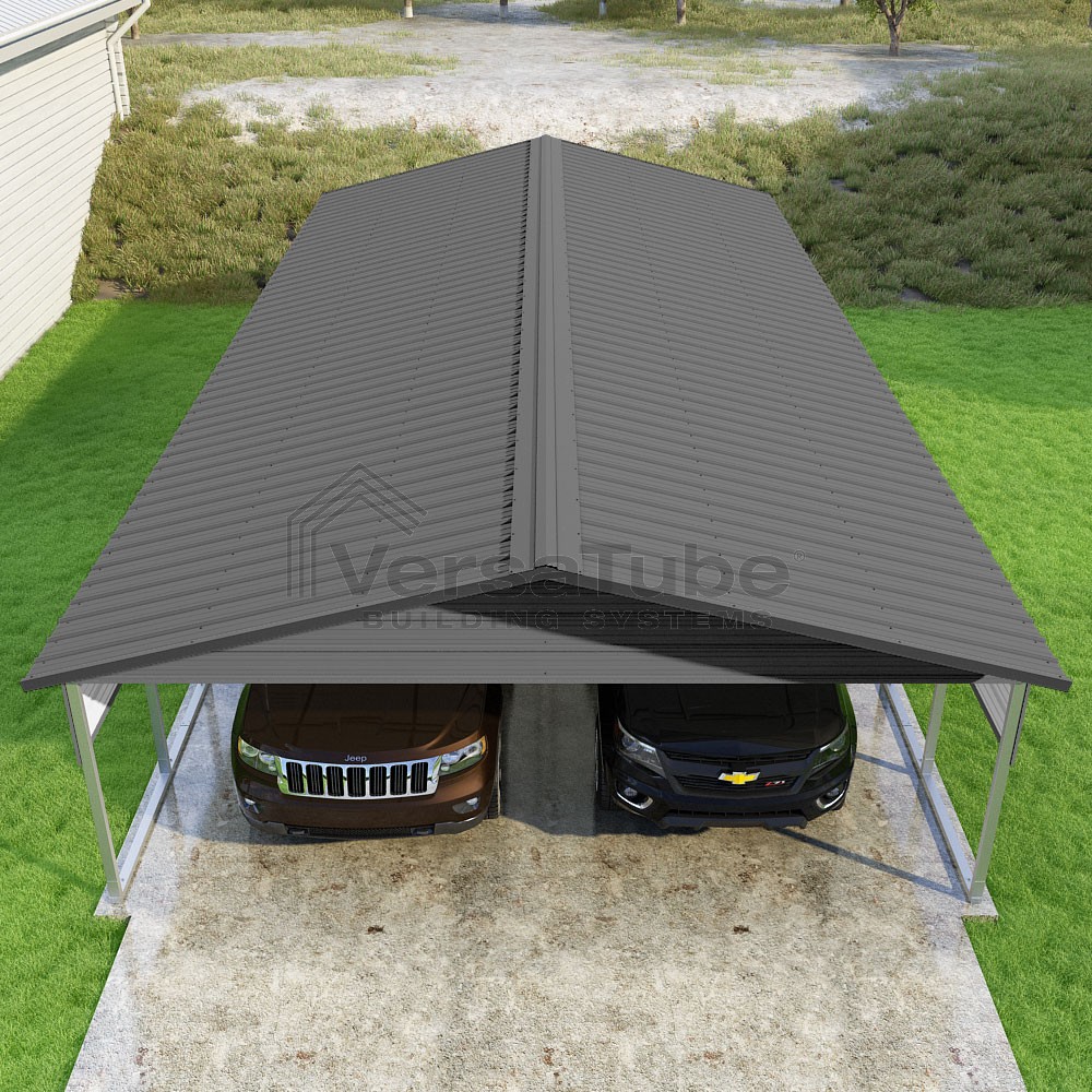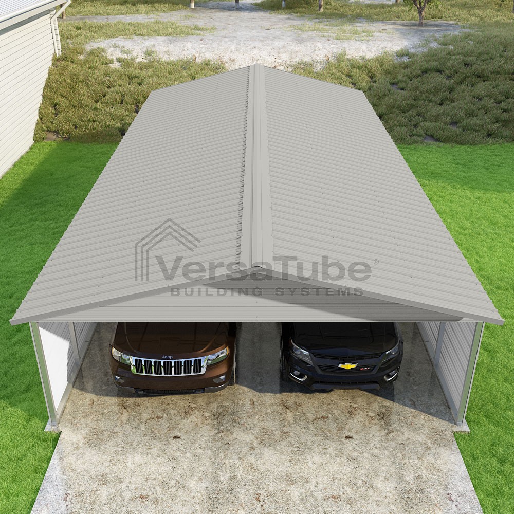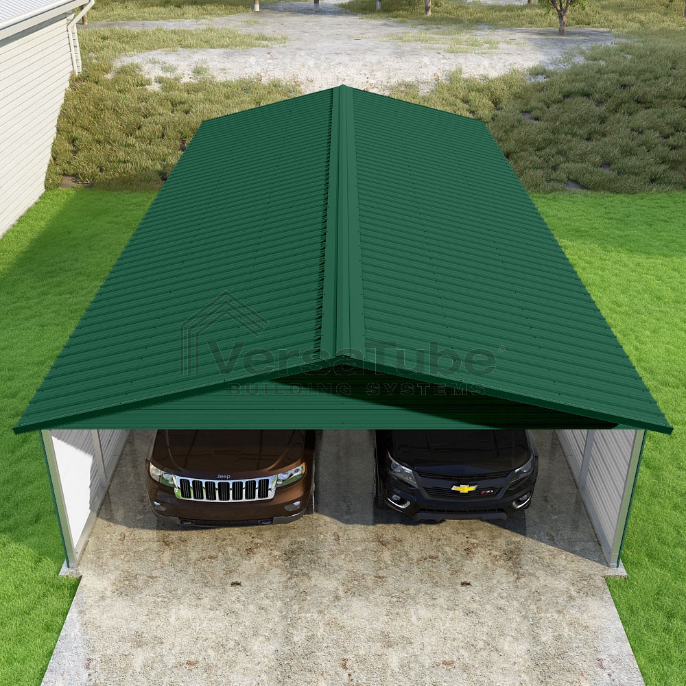 Pinnacle Series DIY carport kit features vertical sheet metal roof panels with ridge cap, gable and eave trim for an A-frame roof style and extended coverage on both ends.