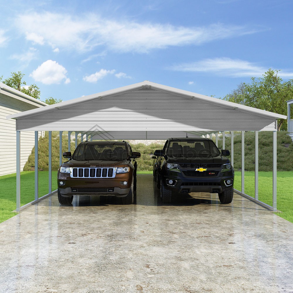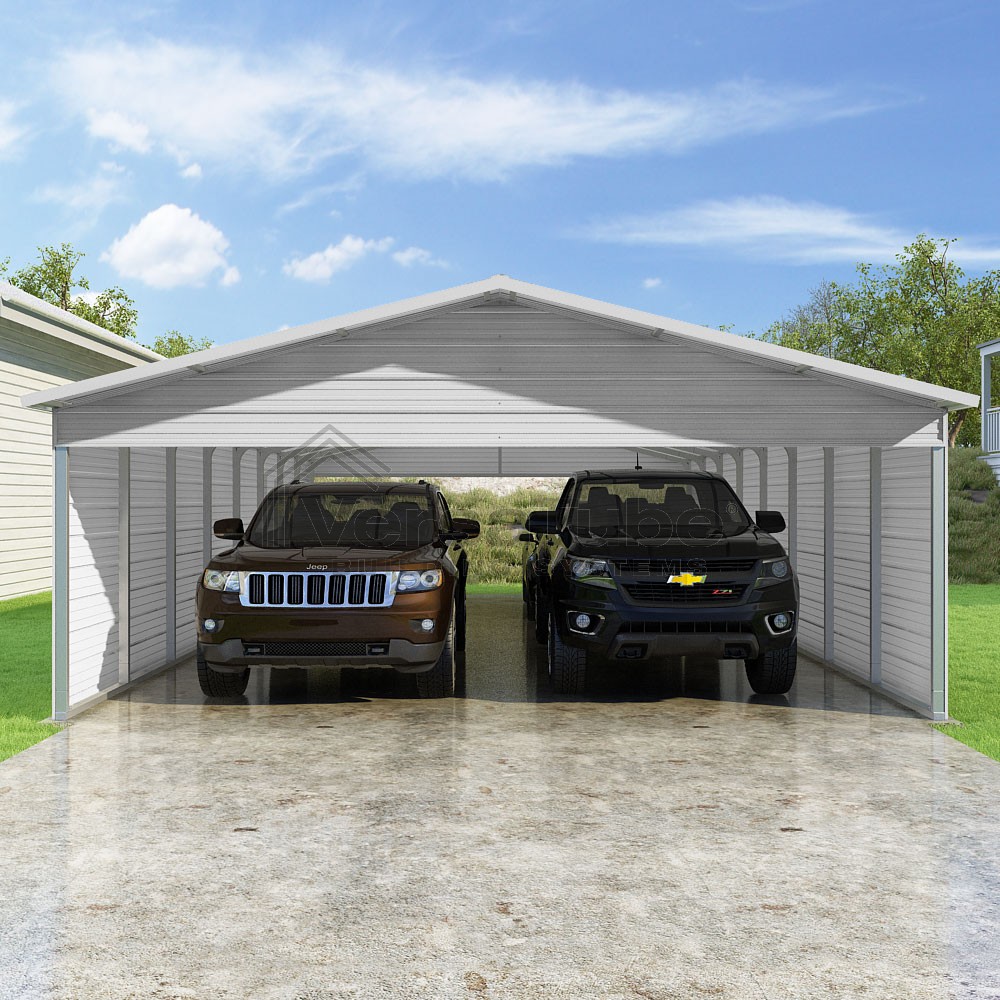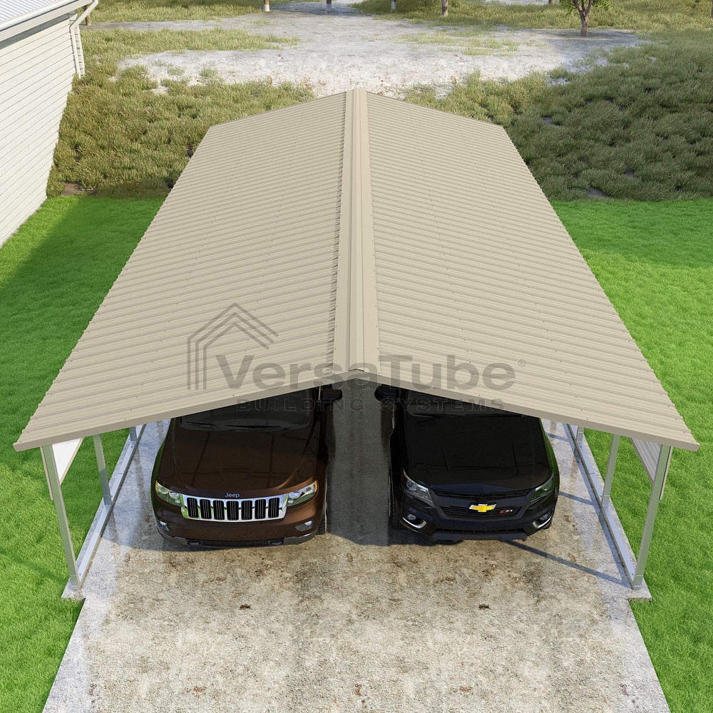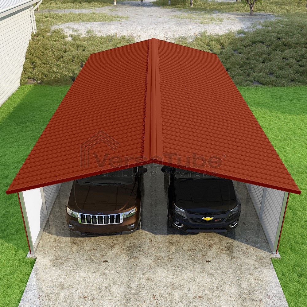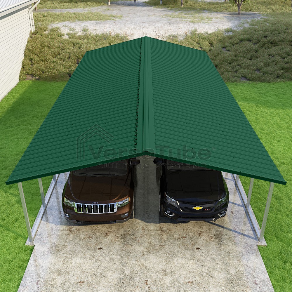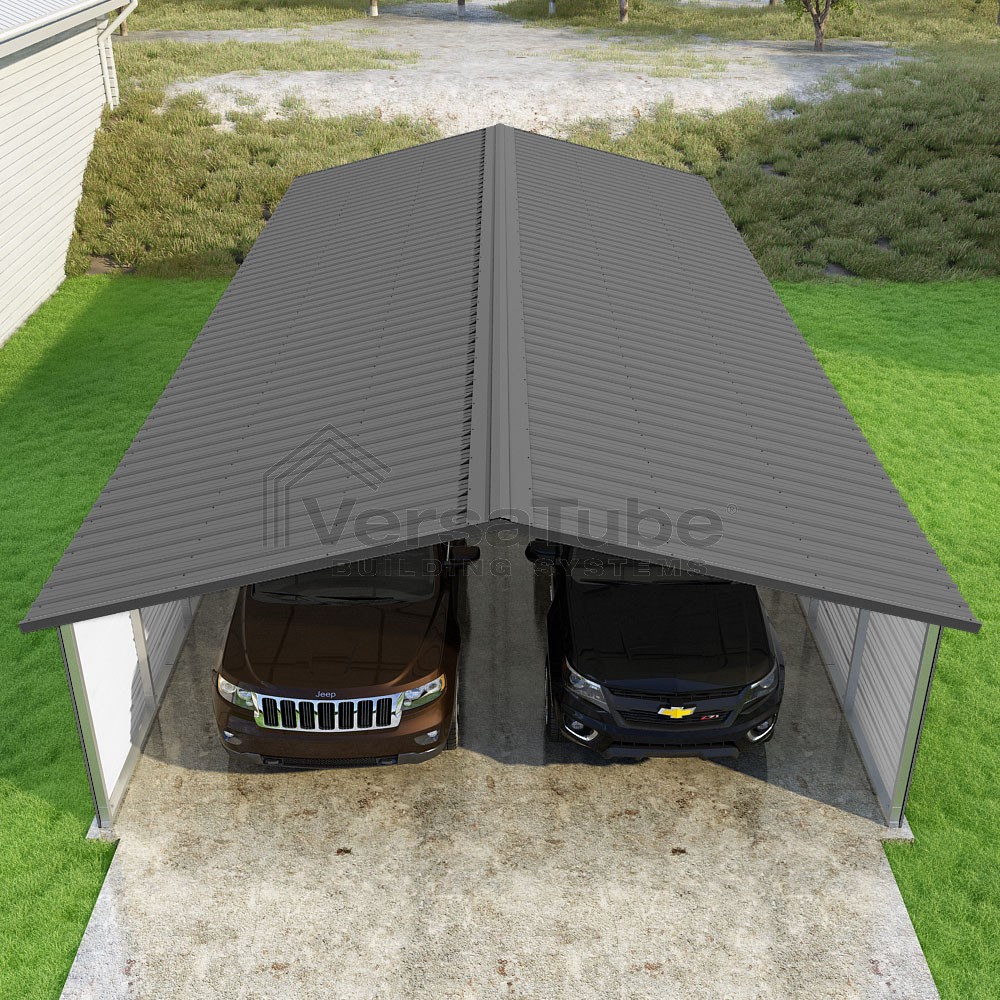 Pinnacle Series DIY carport kit features vertical sheet metal roof panels with ridge cap, gable and eave trim for an A-frame roof style and extended coverage on both ends.