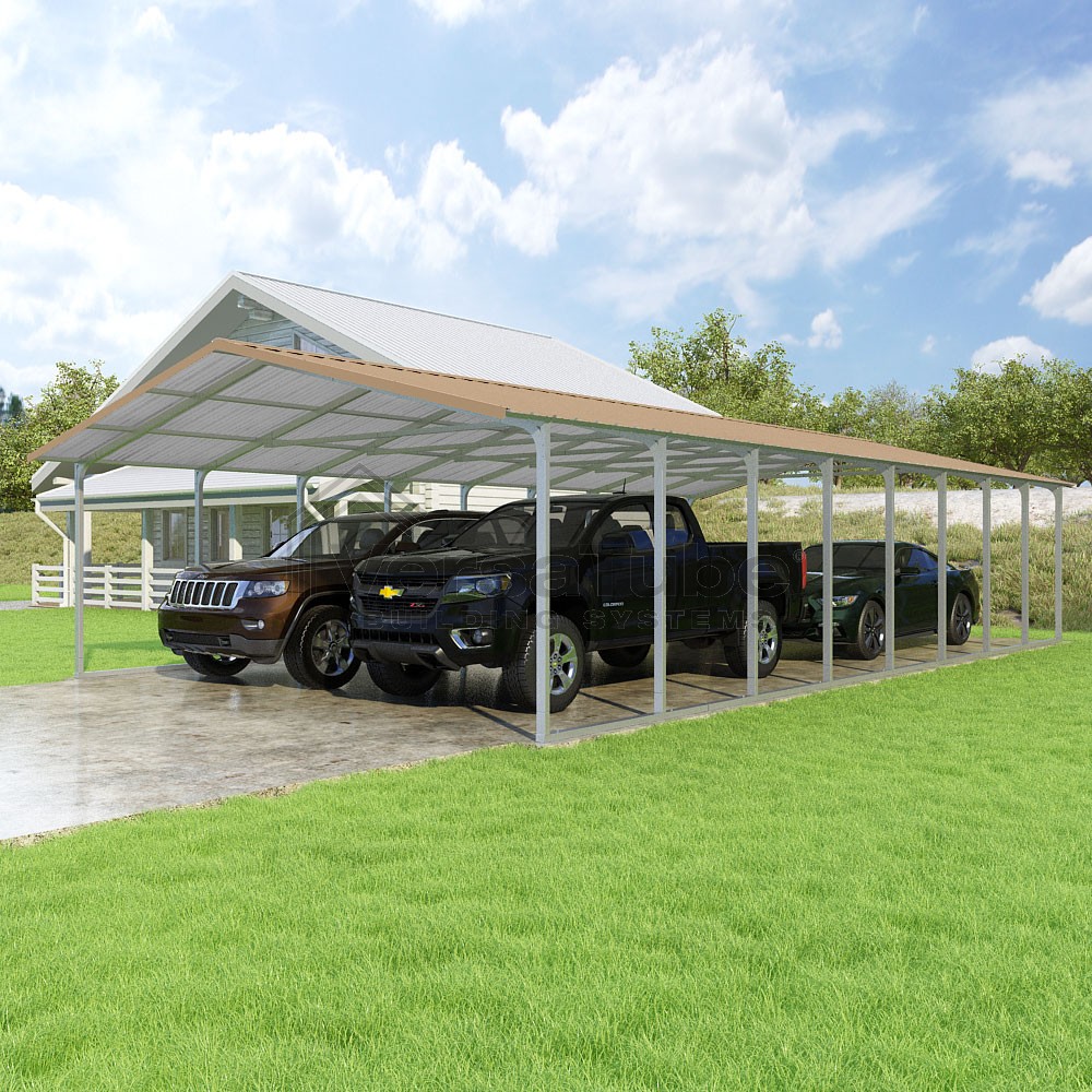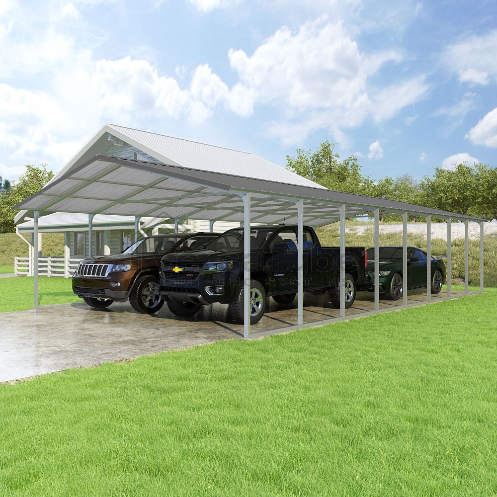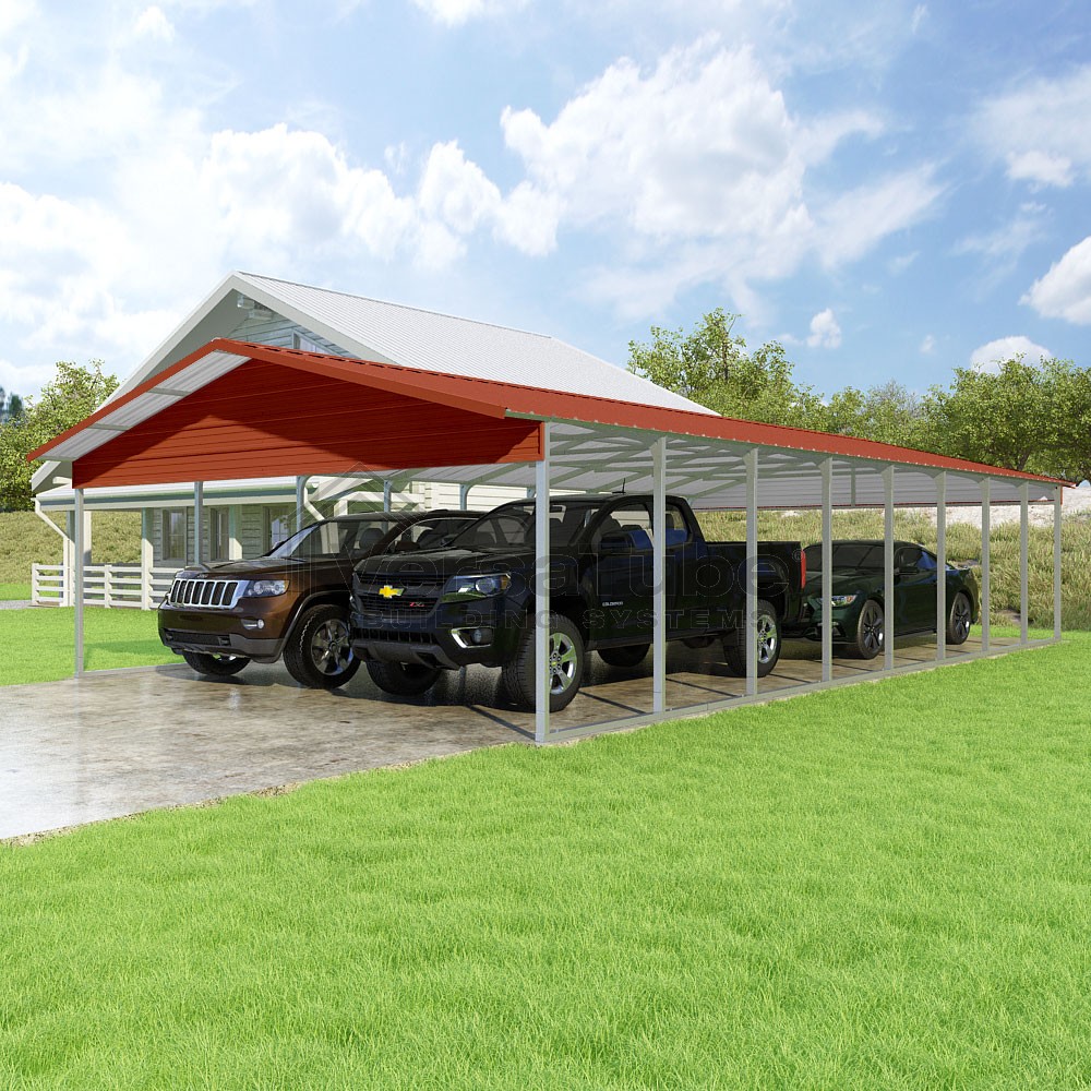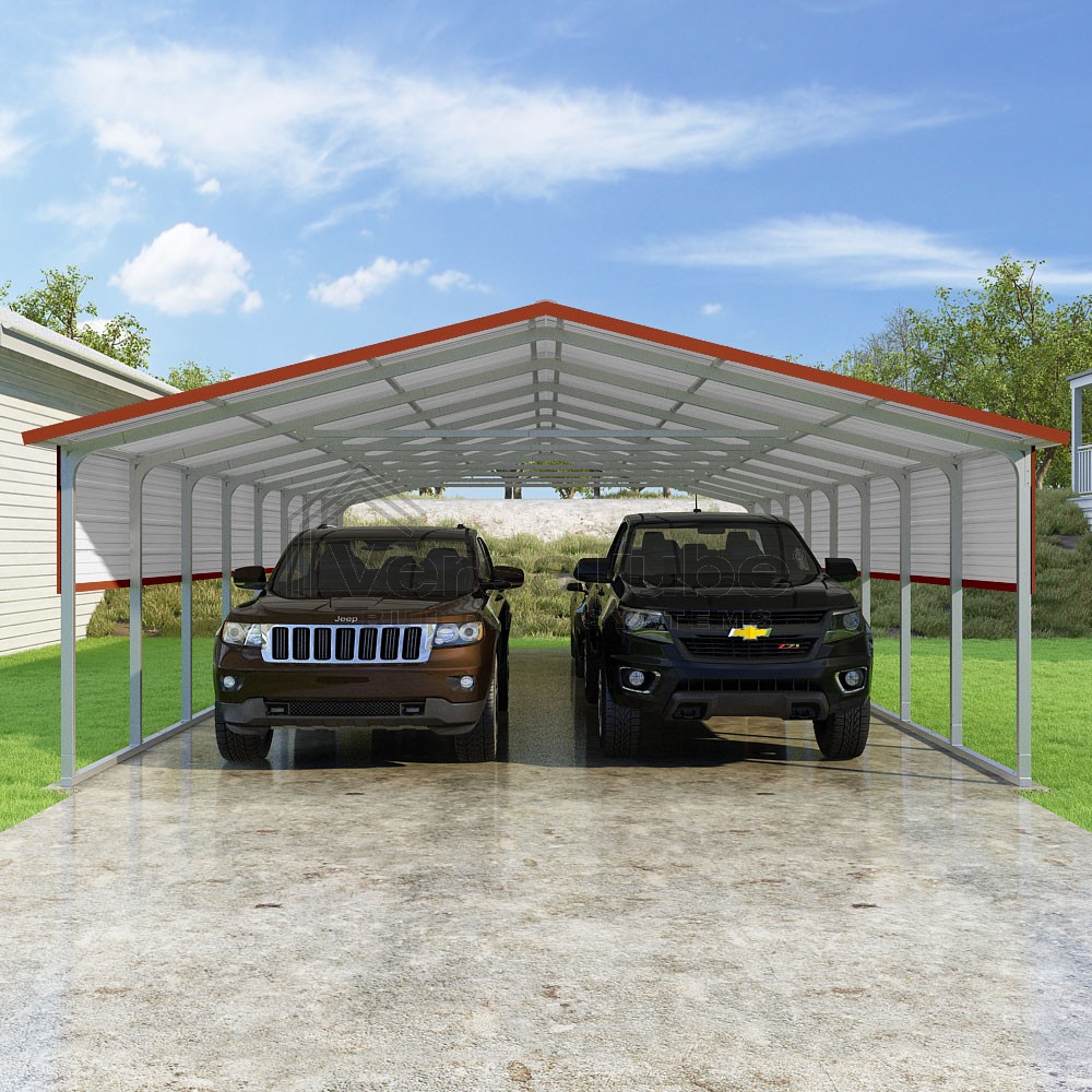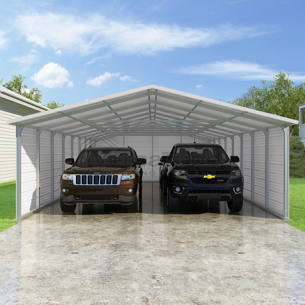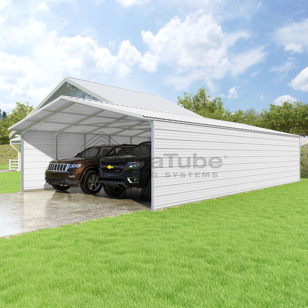 Pinnacle Series DIY carport kit features vertical sheet metal roof panels with ridge cap, gable and eave trim for an A-frame roof style and extended coverage on both ends.