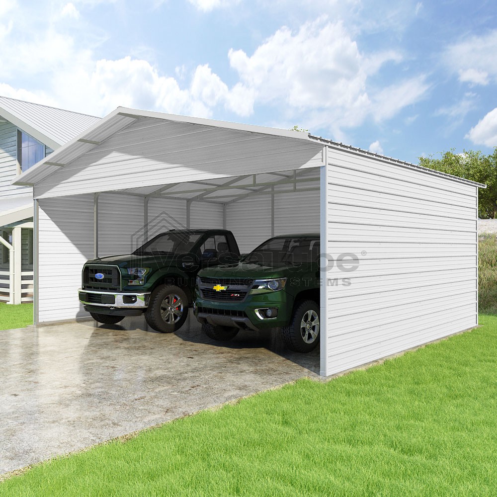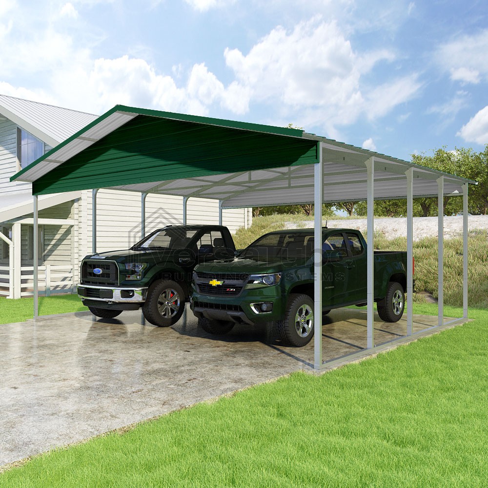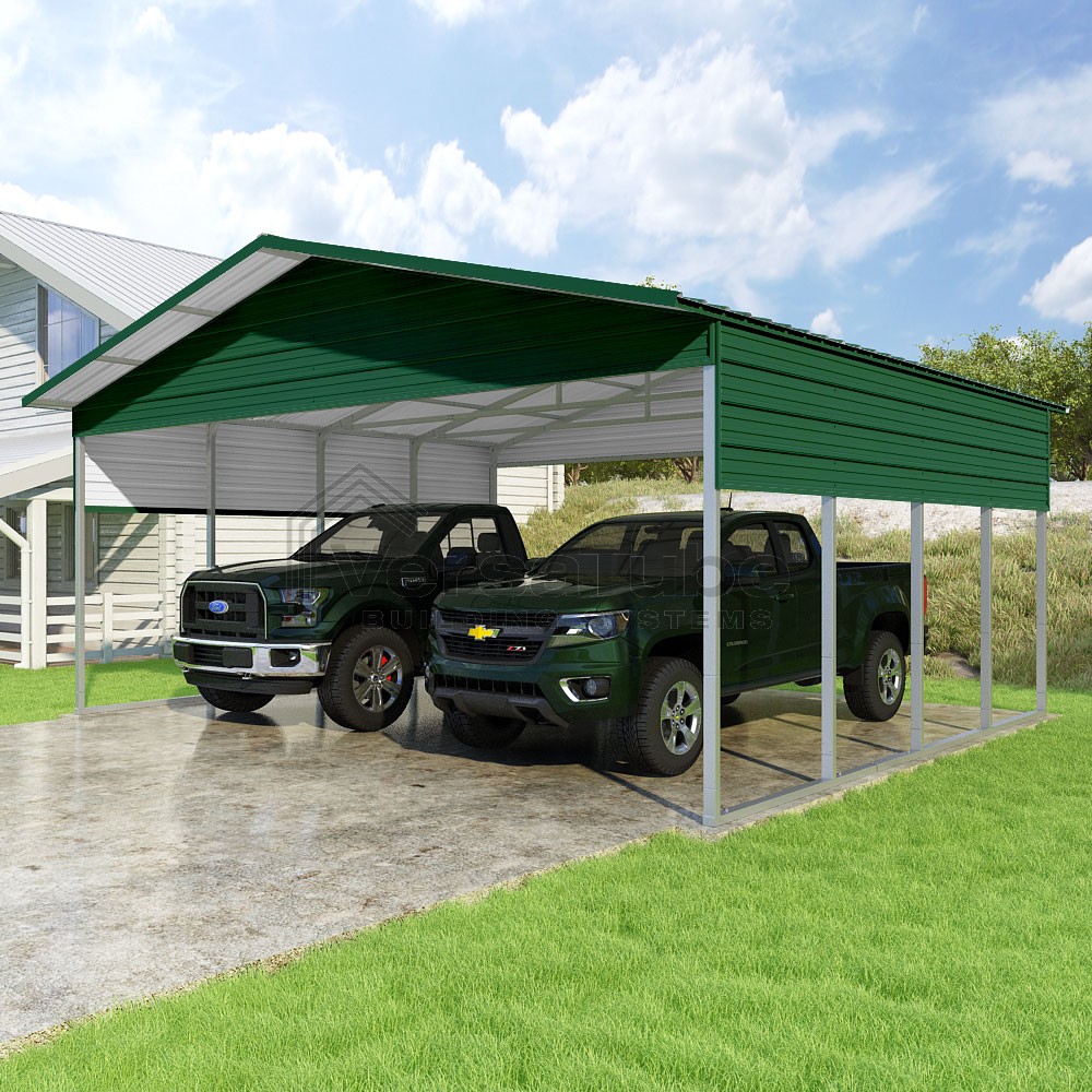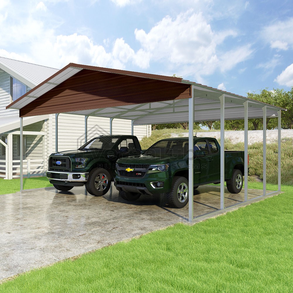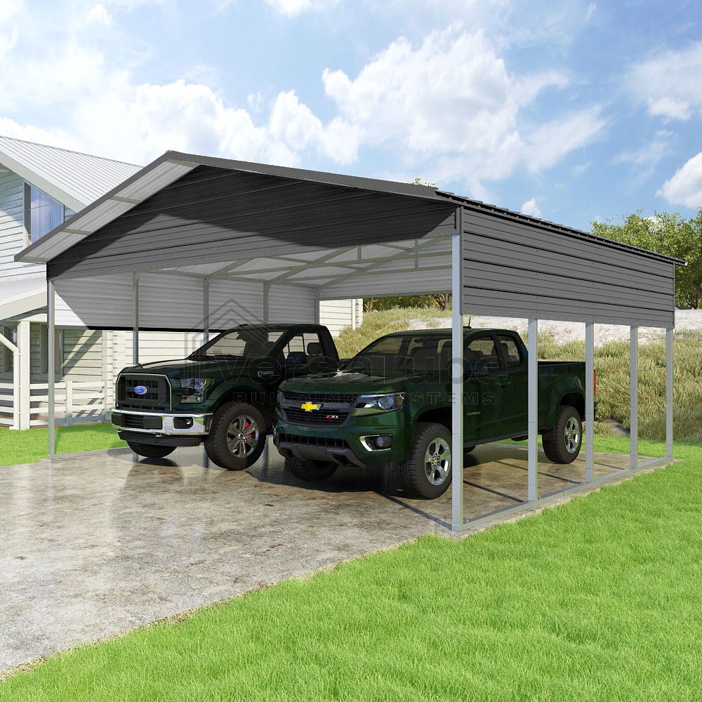 Pinnacle Series DIY carport kit features vertical sheet metal roof panels with ridge cap, gable and eave trim for an A-frame roof style and extended coverage on both ends.