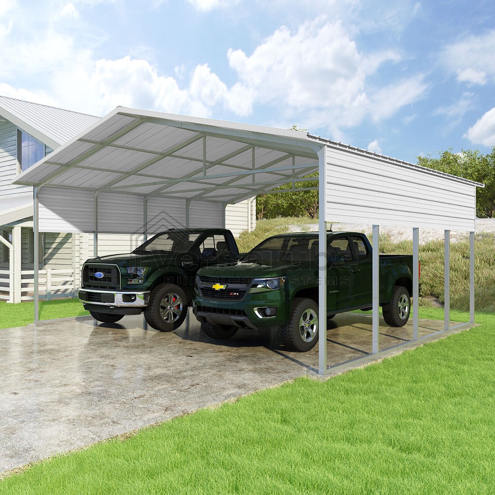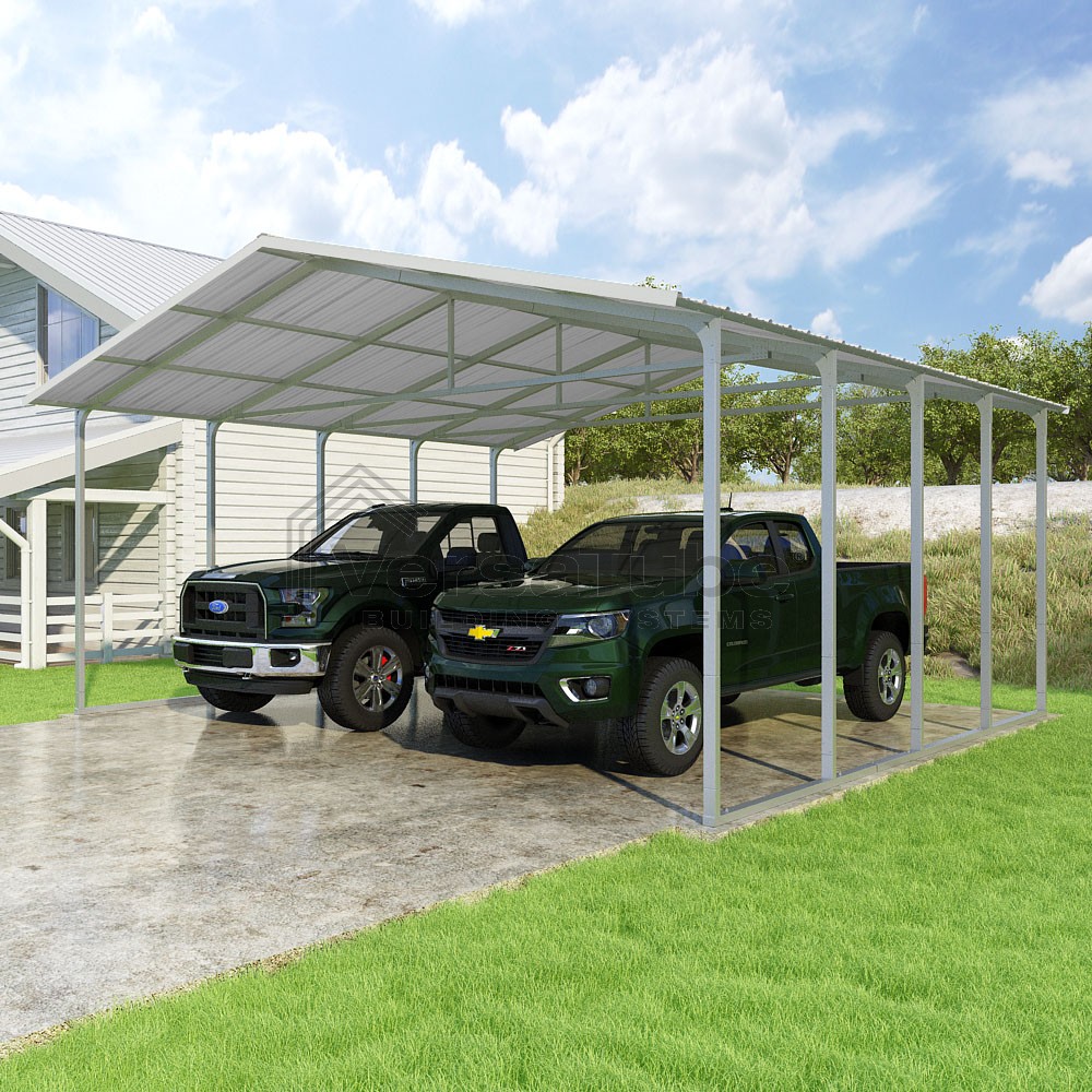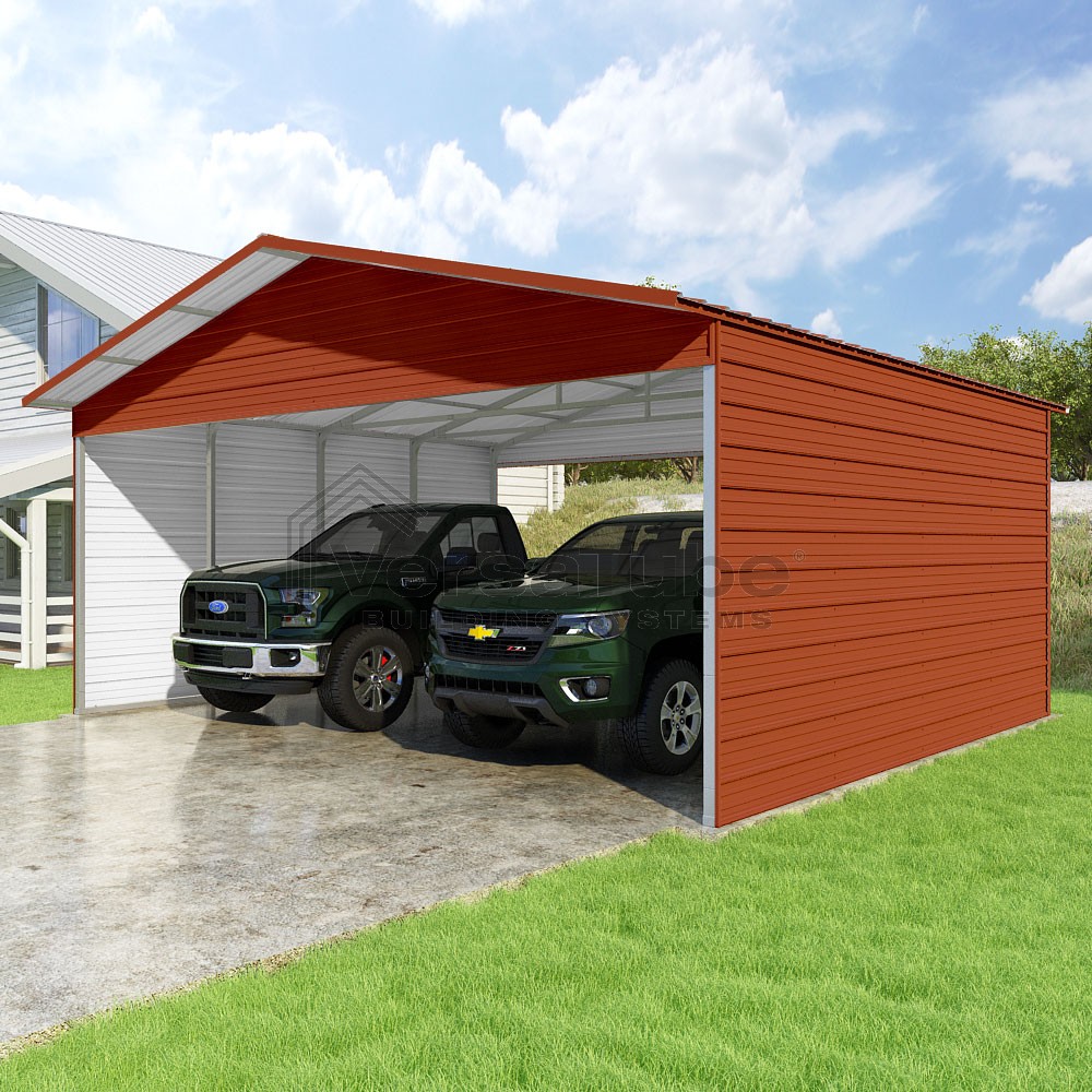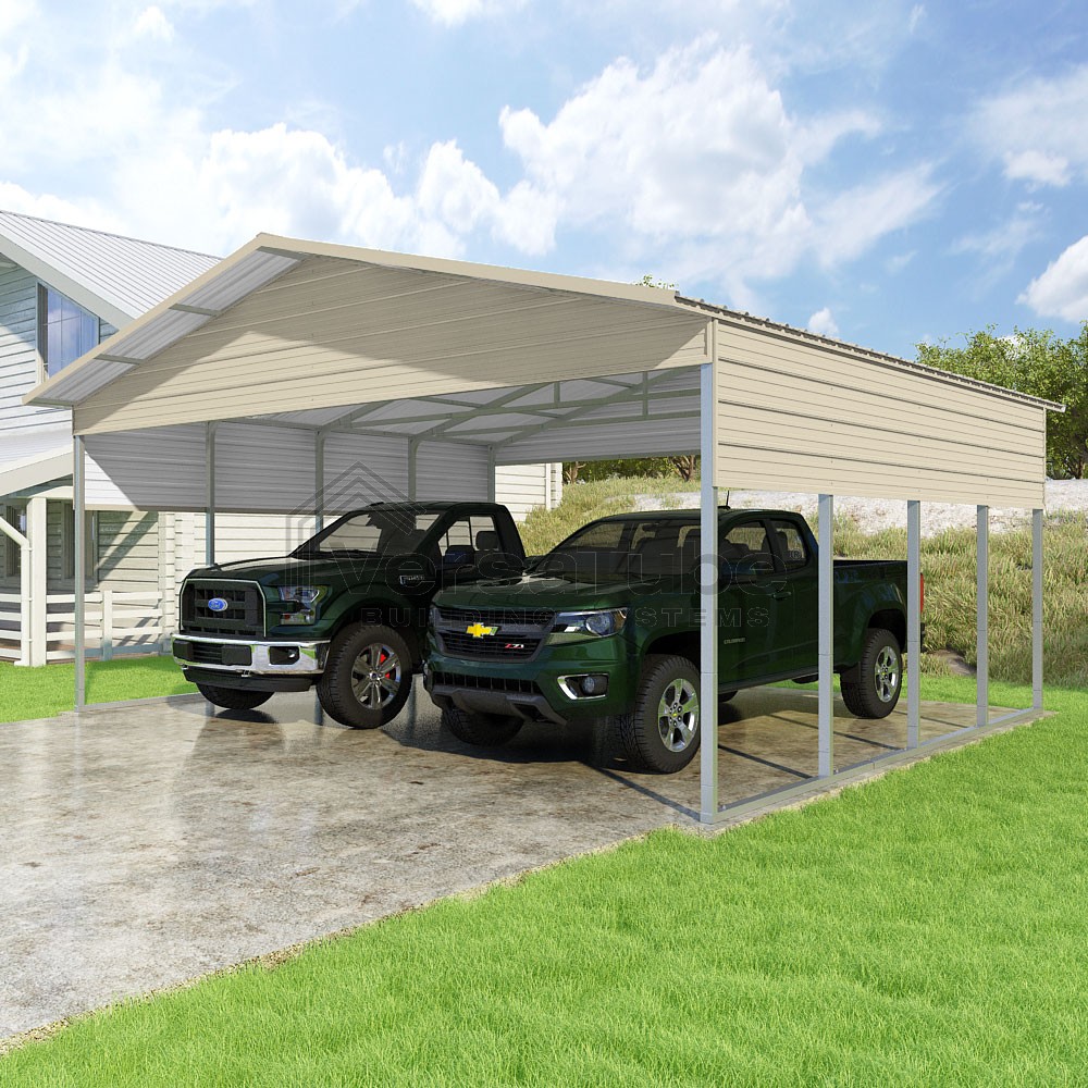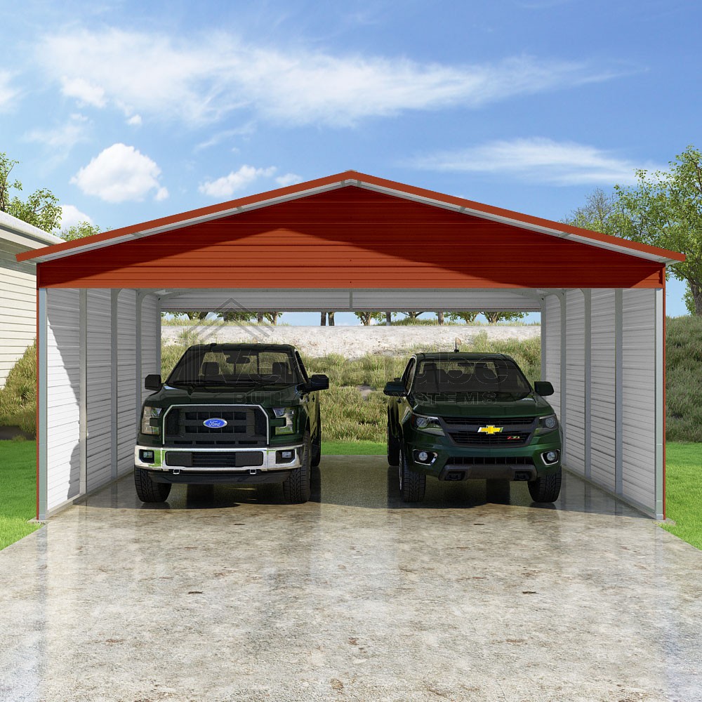 Pinnacle Series DIY carport kit features vertical sheet metal roof panels with ridge cap, gable and eave trim for an A-frame roof style and extended coverage on both ends.