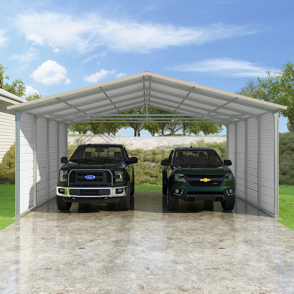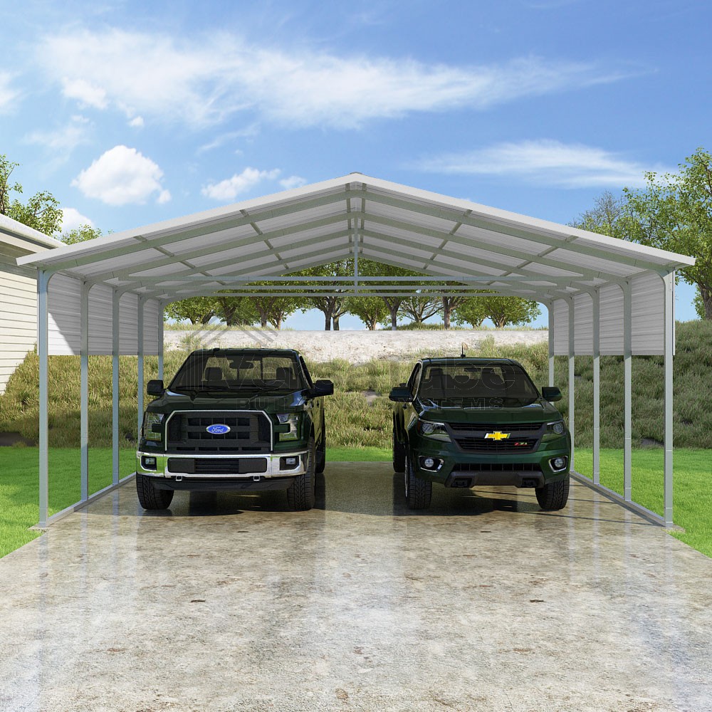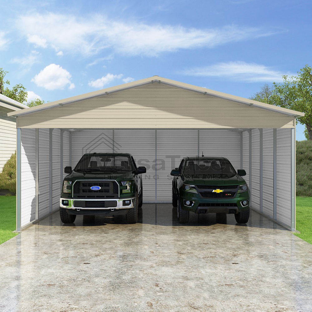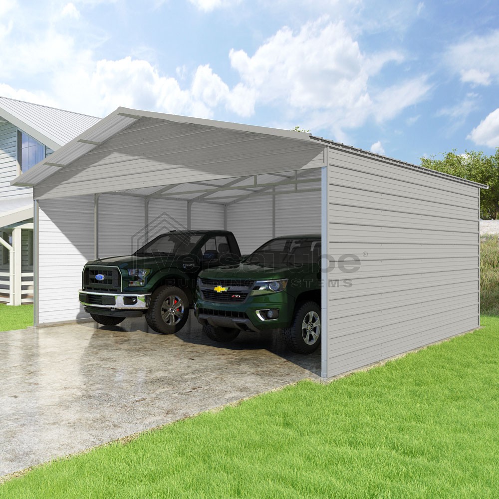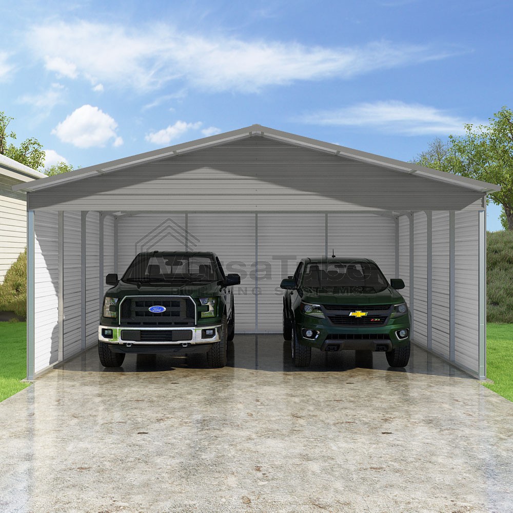 Pinnacle Series DIY carport kit features vertical sheet metal roof panels with ridge cap, gable and eave trim for an A-frame roof style and extended coverage on both ends.