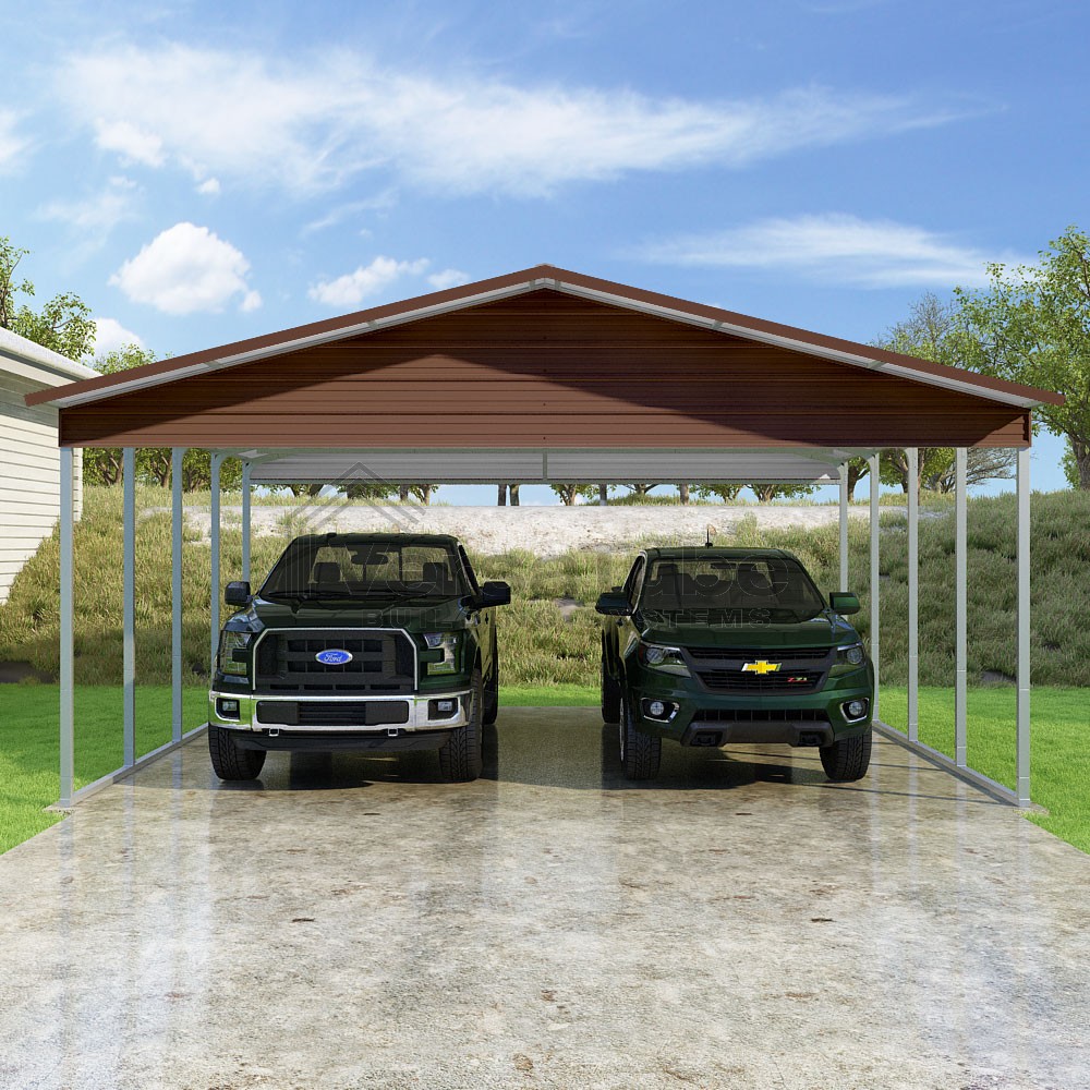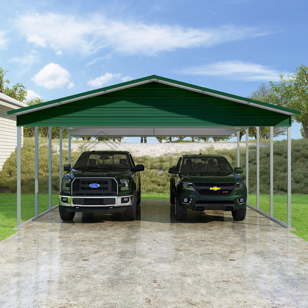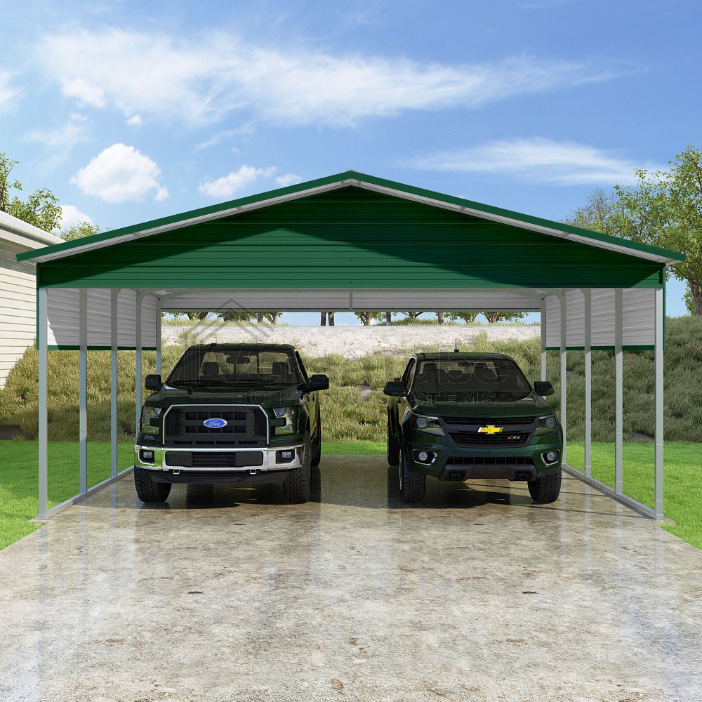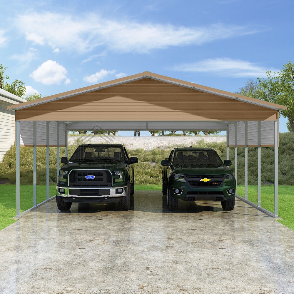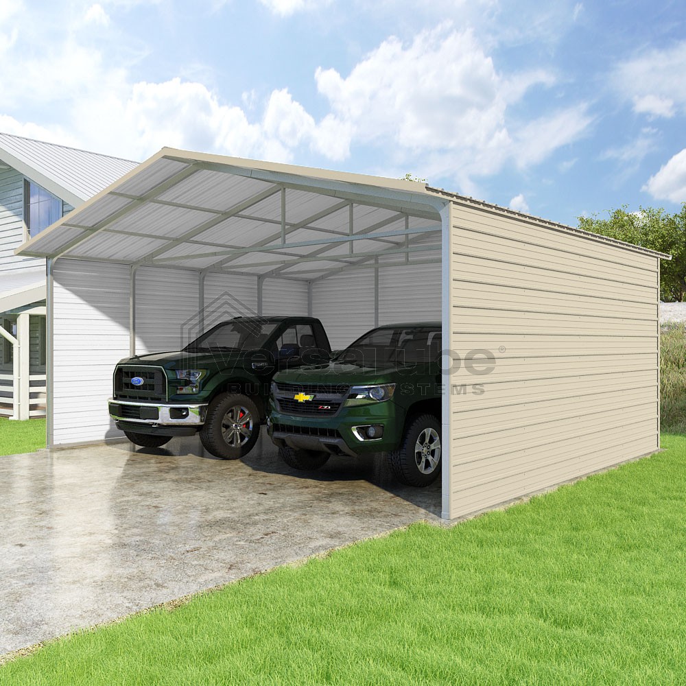 Pinnacle Series DIY carport kit features vertical sheet metal roof panels with ridge cap, gable and eave trim for an A-frame roof style and extended coverage on both ends.
