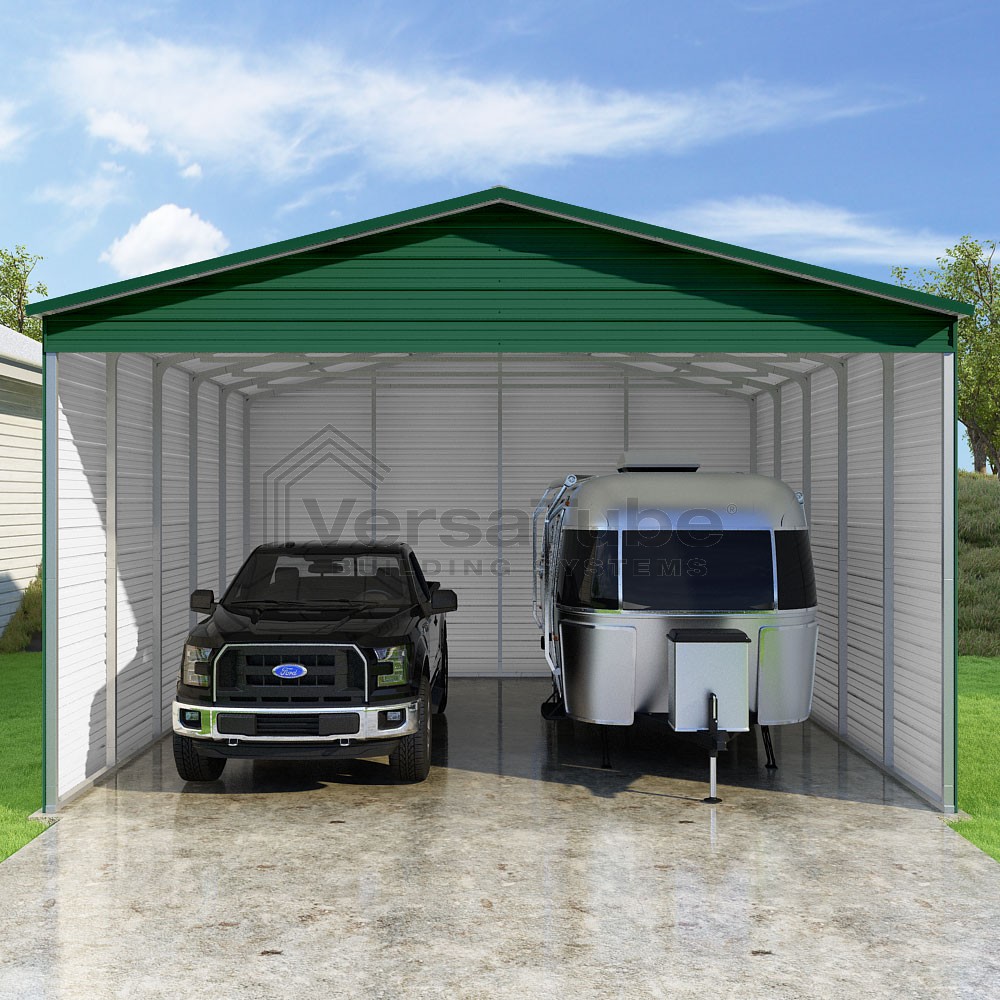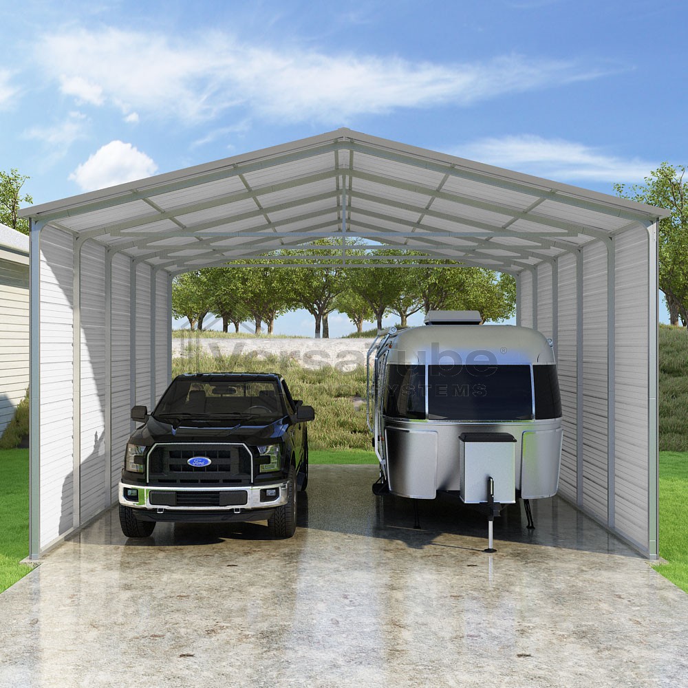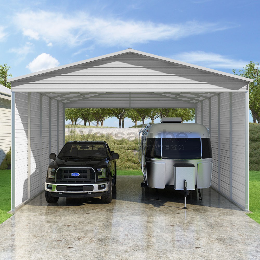 Pinnacle Series DIY carport kit features vertical sheet metal roof panels with ridge cap, gable and eave trim for an A-frame roof style and extended coverage on both ends.