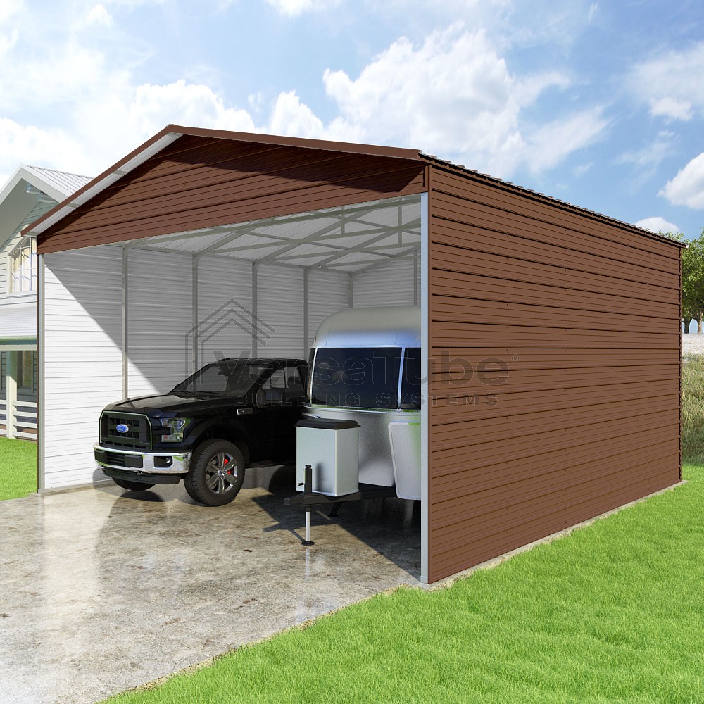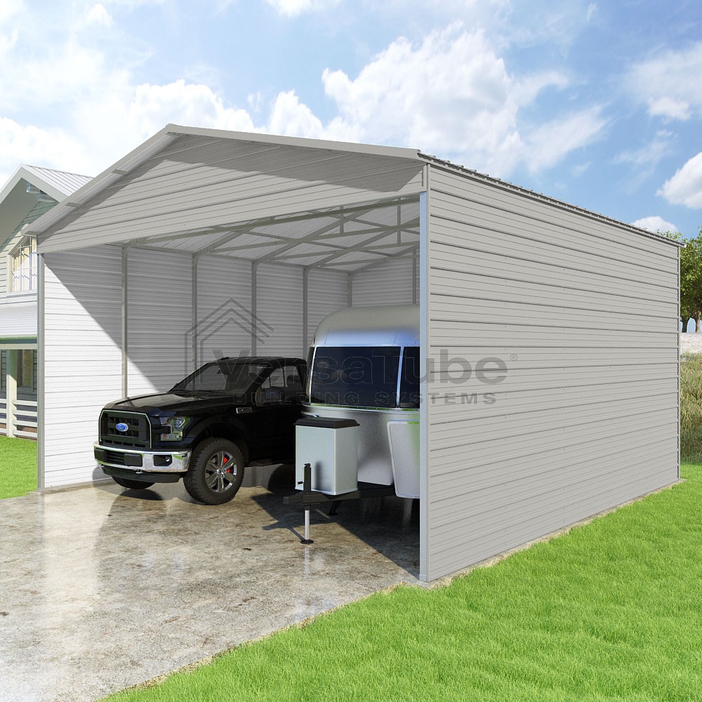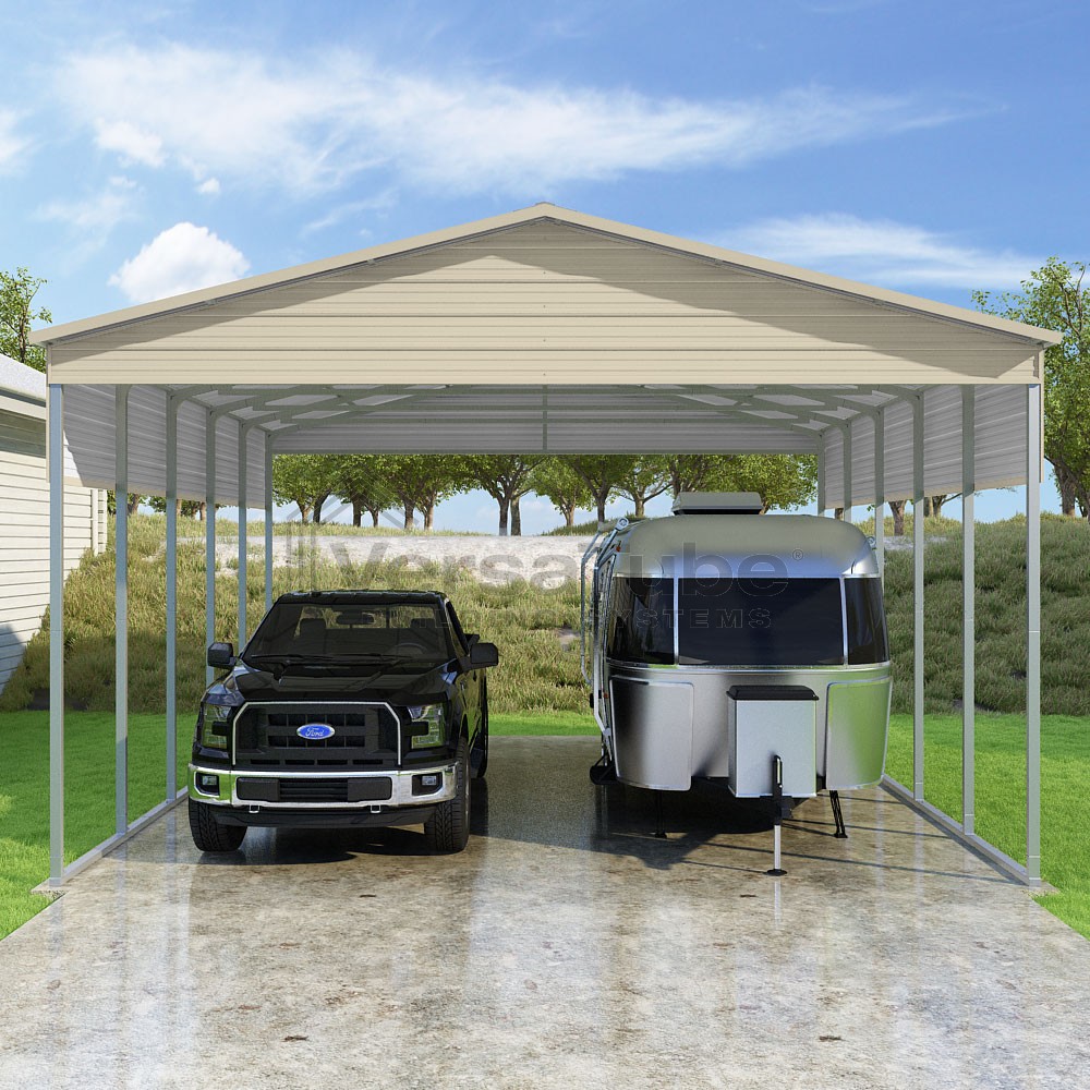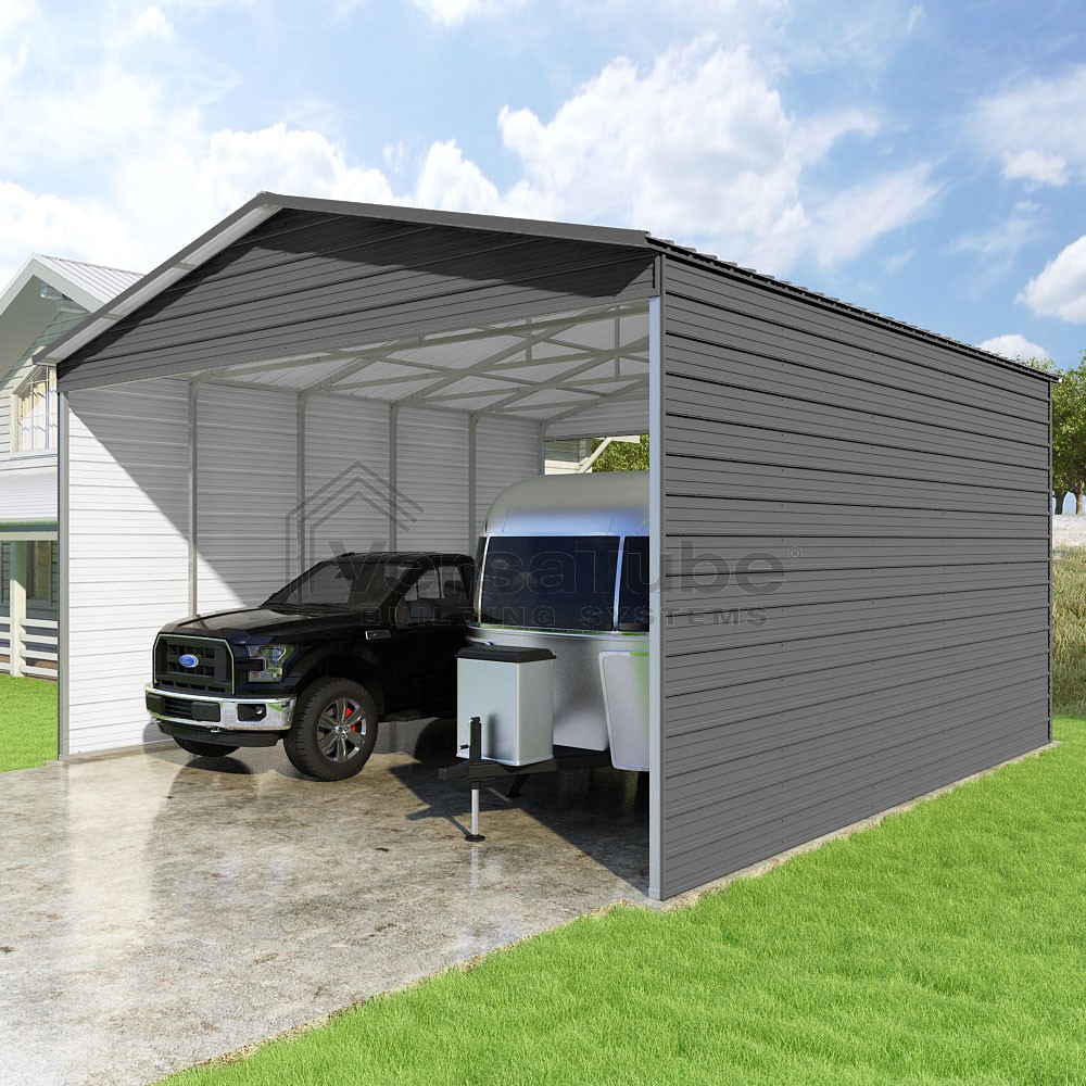Pinnacle Series DIY carport kit features vertical sheet metal roof panels with ridge cap, gable and eave trim for an A-frame roof style and extended coverage on both ends.