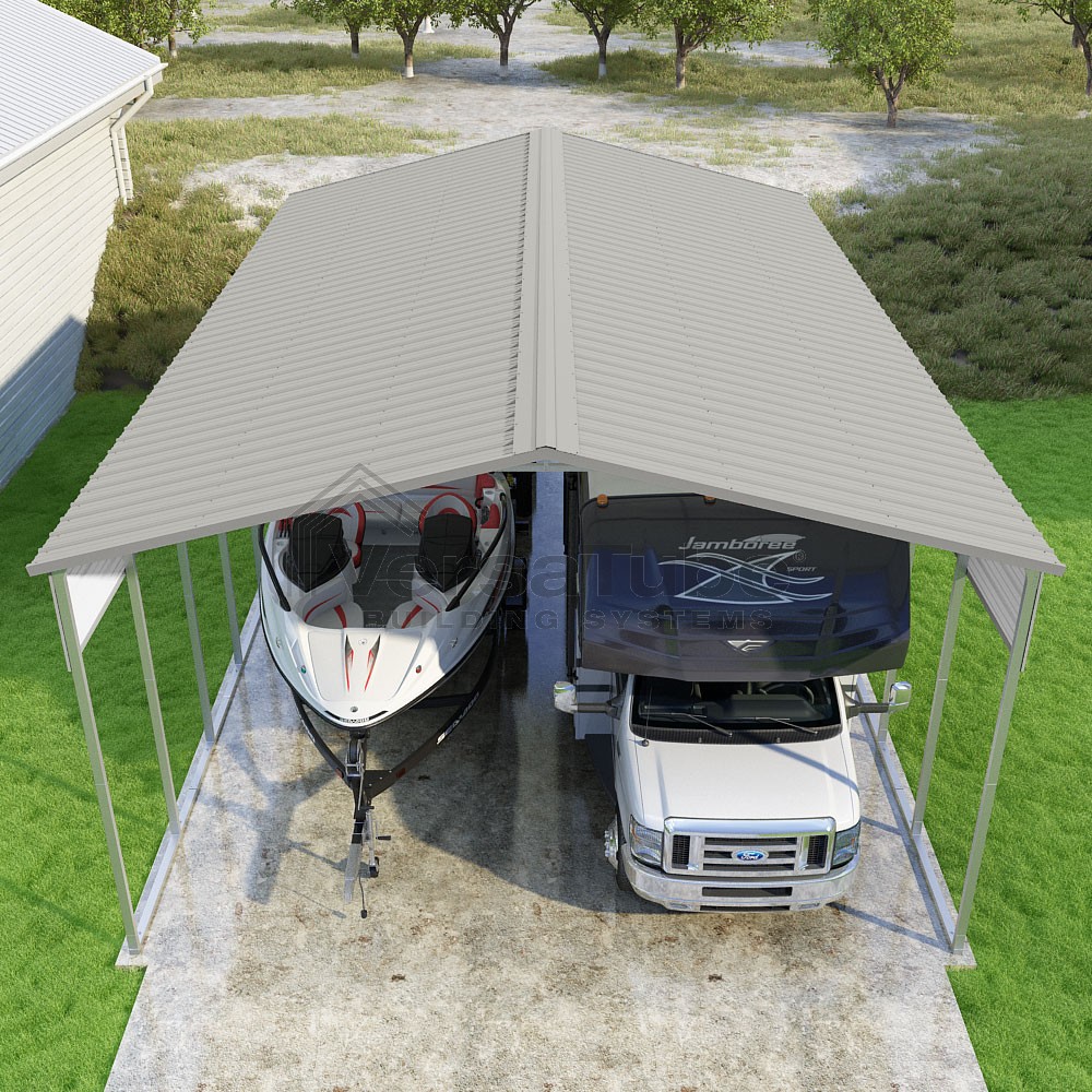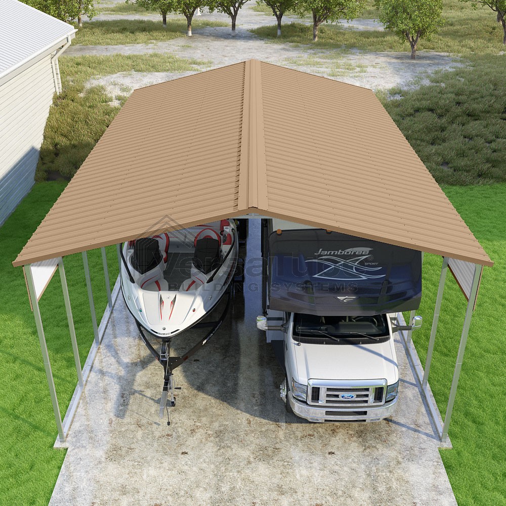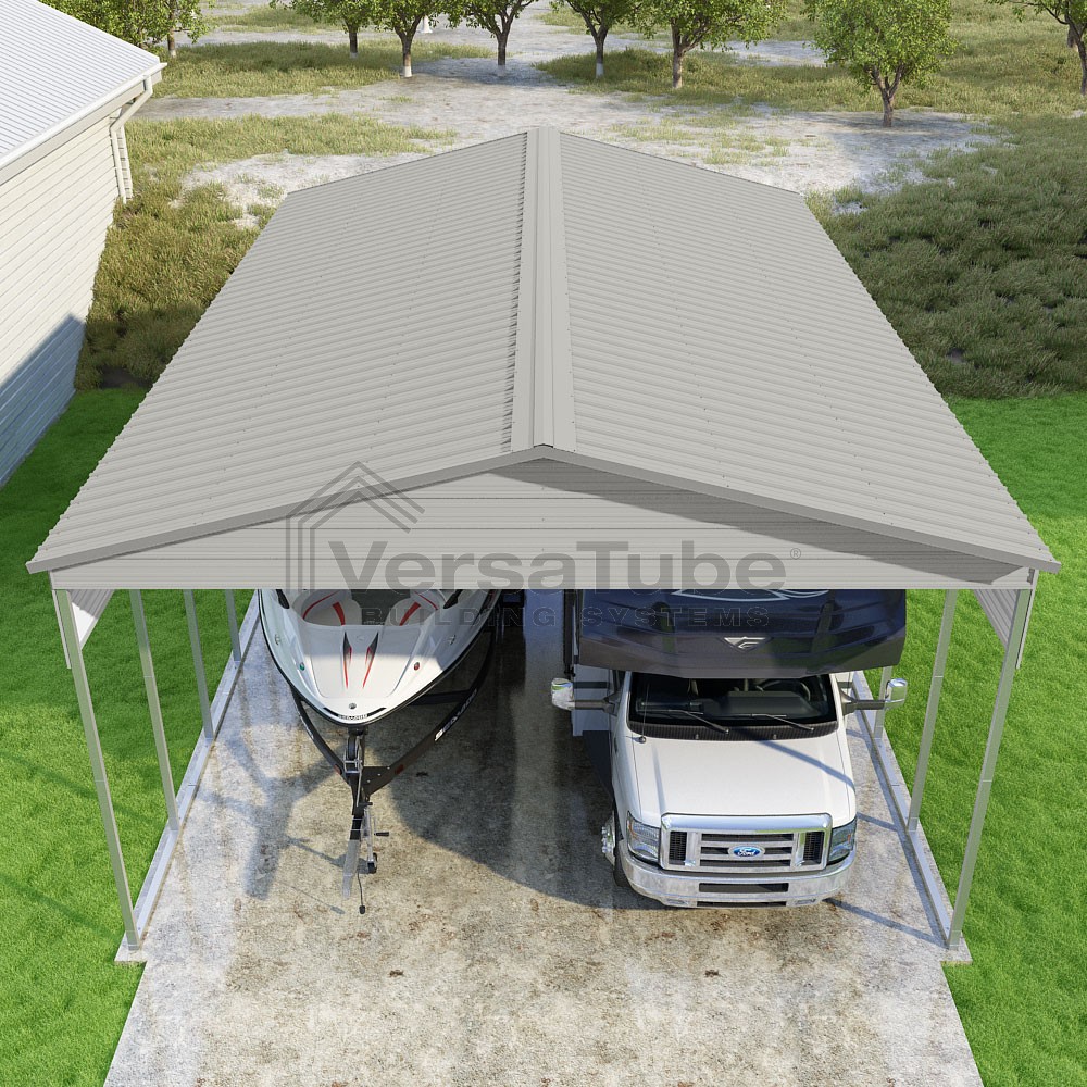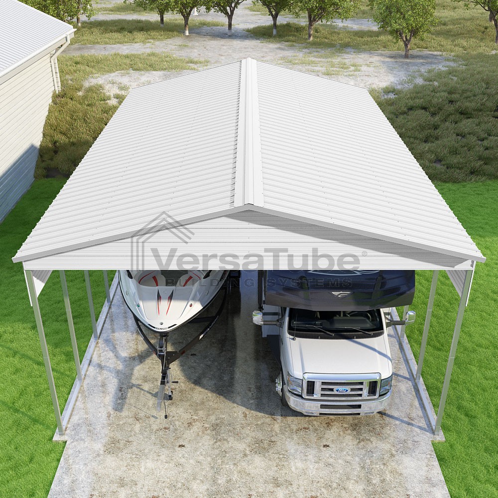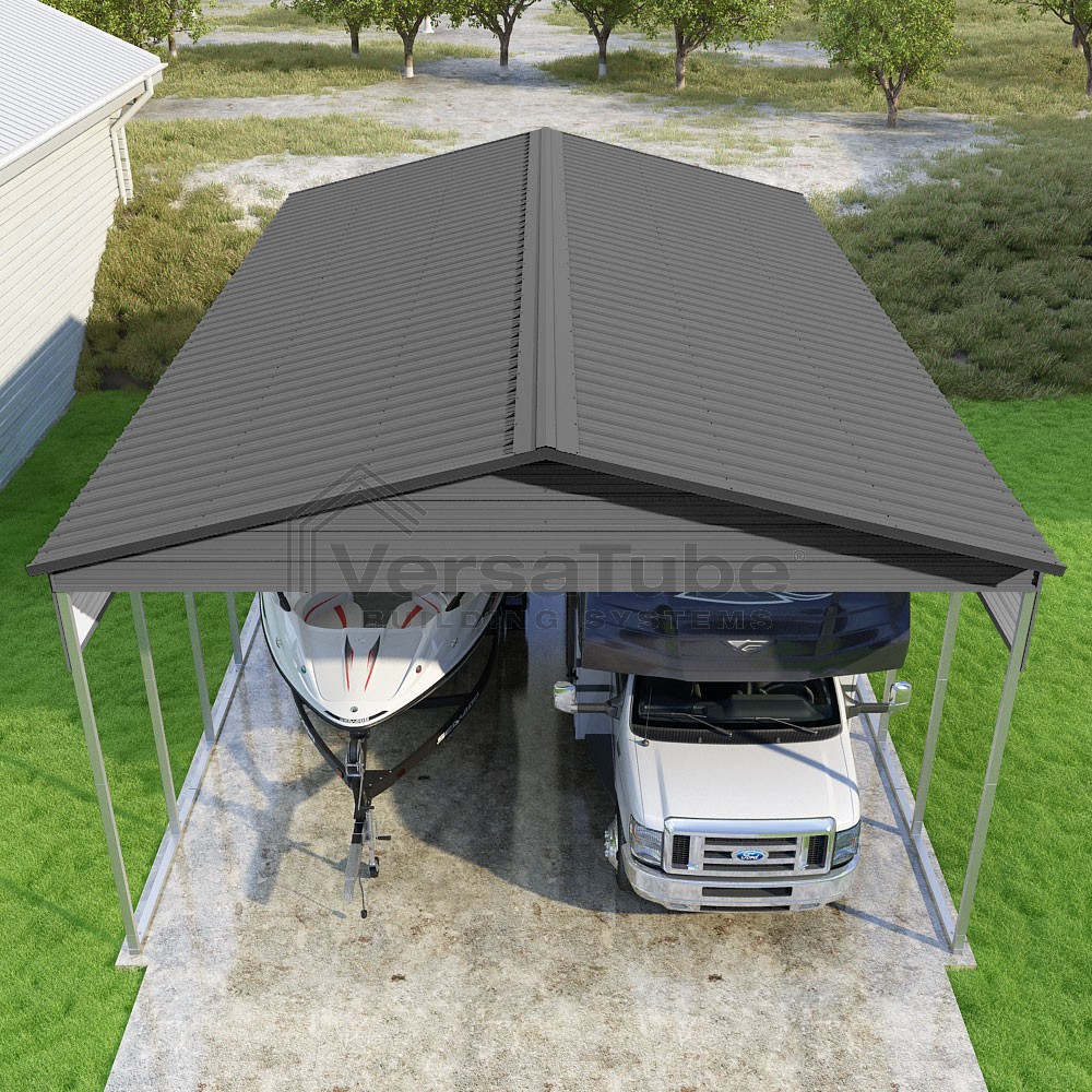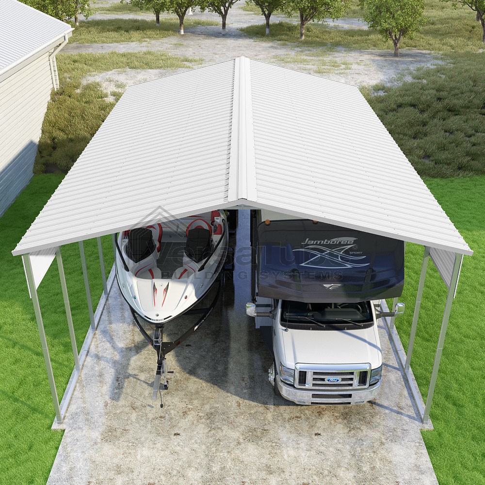 Pinnacle Series DIY carport kit features vertical sheet metal roof panels with ridge cap, gable and eave trim for an A-frame roof style and extended coverage on both ends.