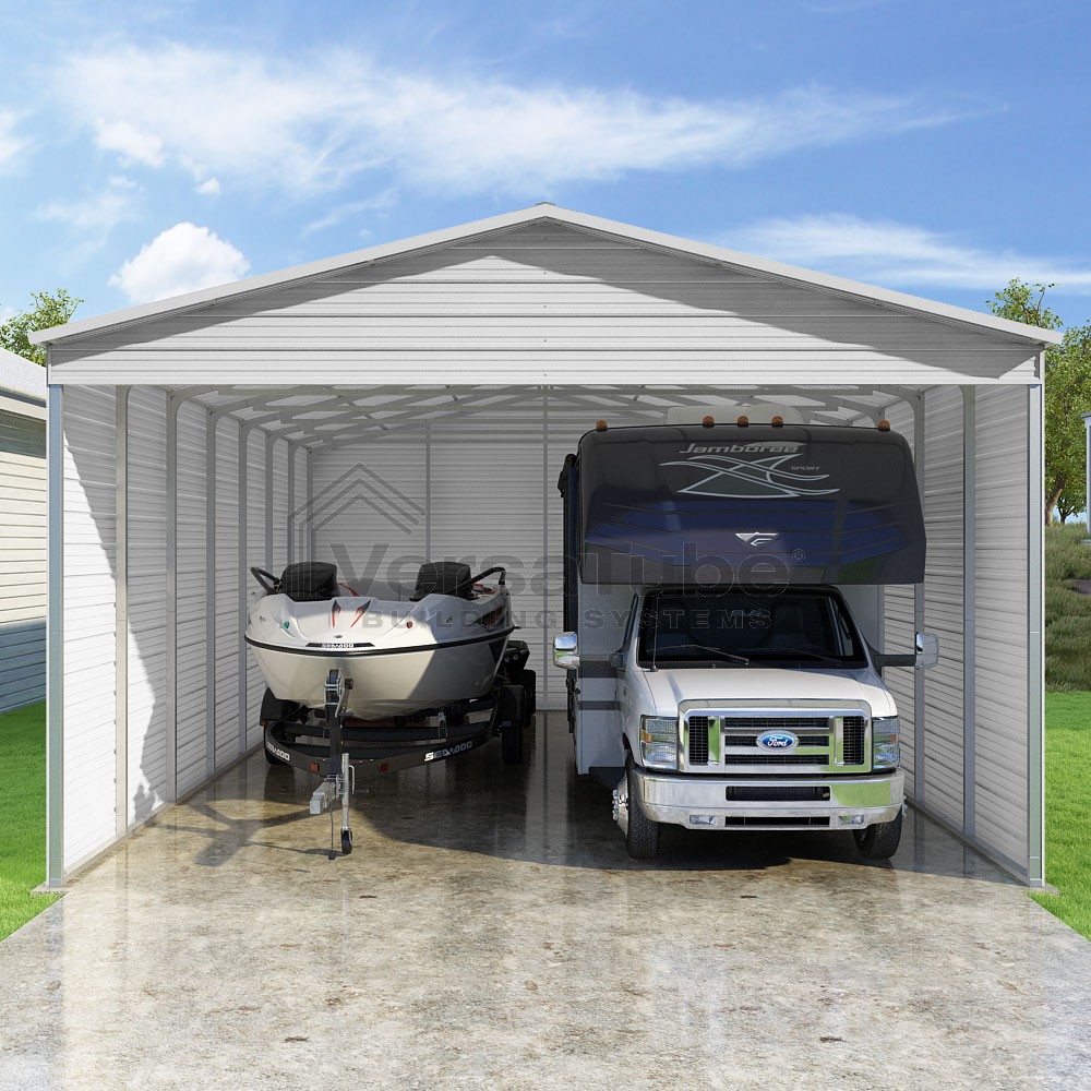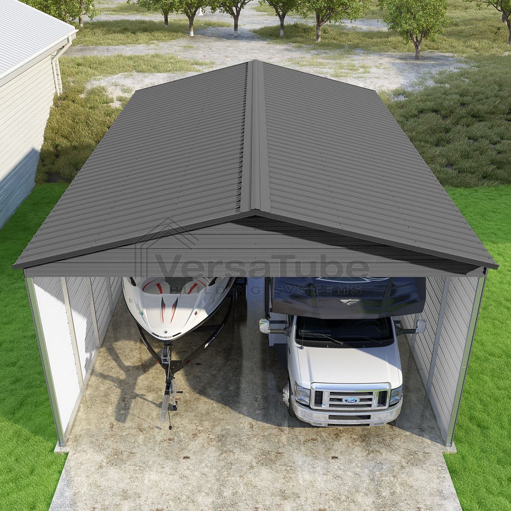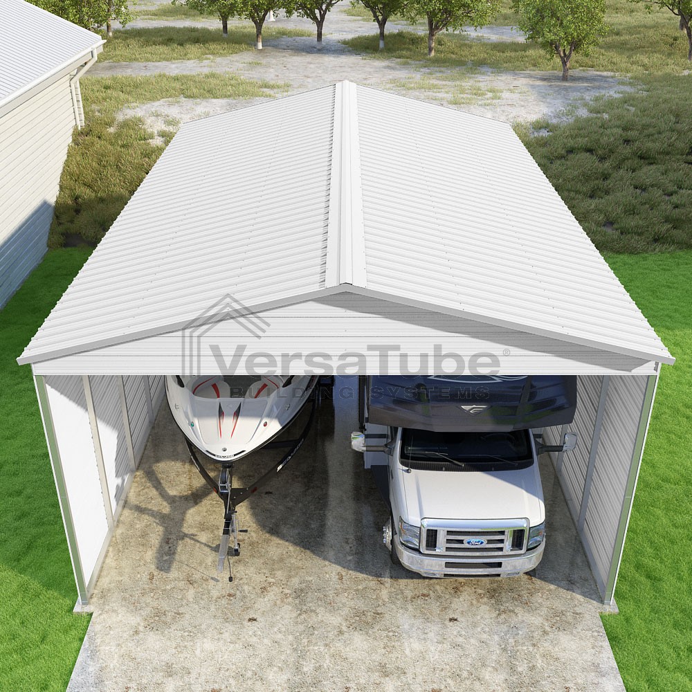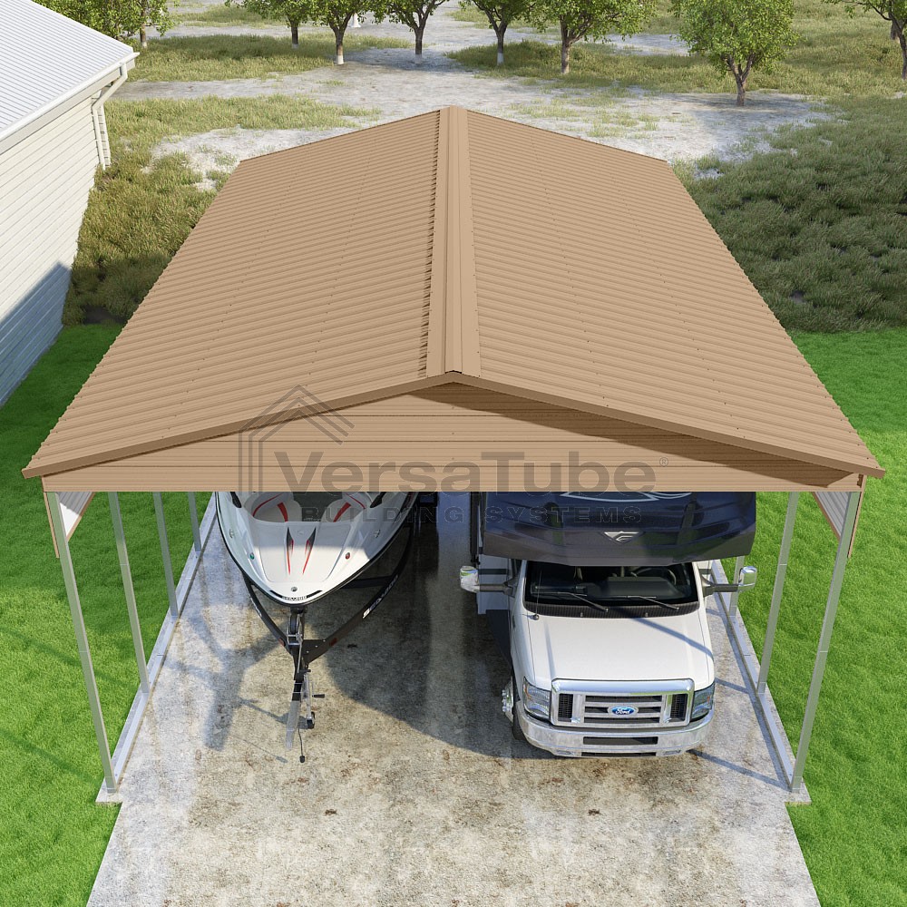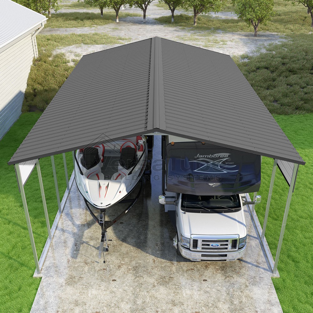 Pinnacle Series DIY carport kit features vertical sheet metal roof panels with ridge cap, gable and eave trim for an A-frame roof style and extended coverage on both ends.