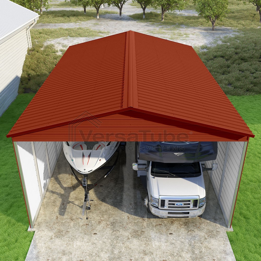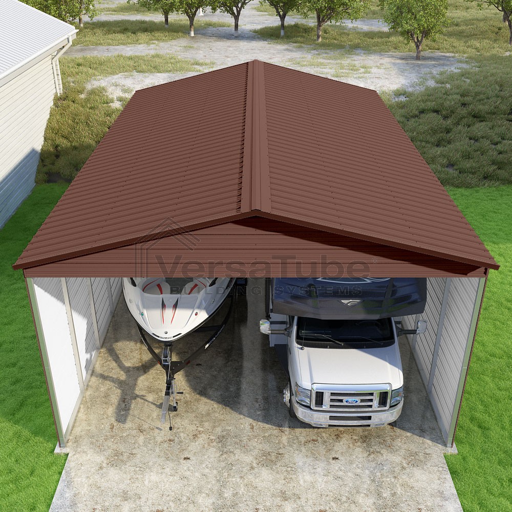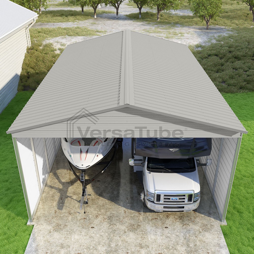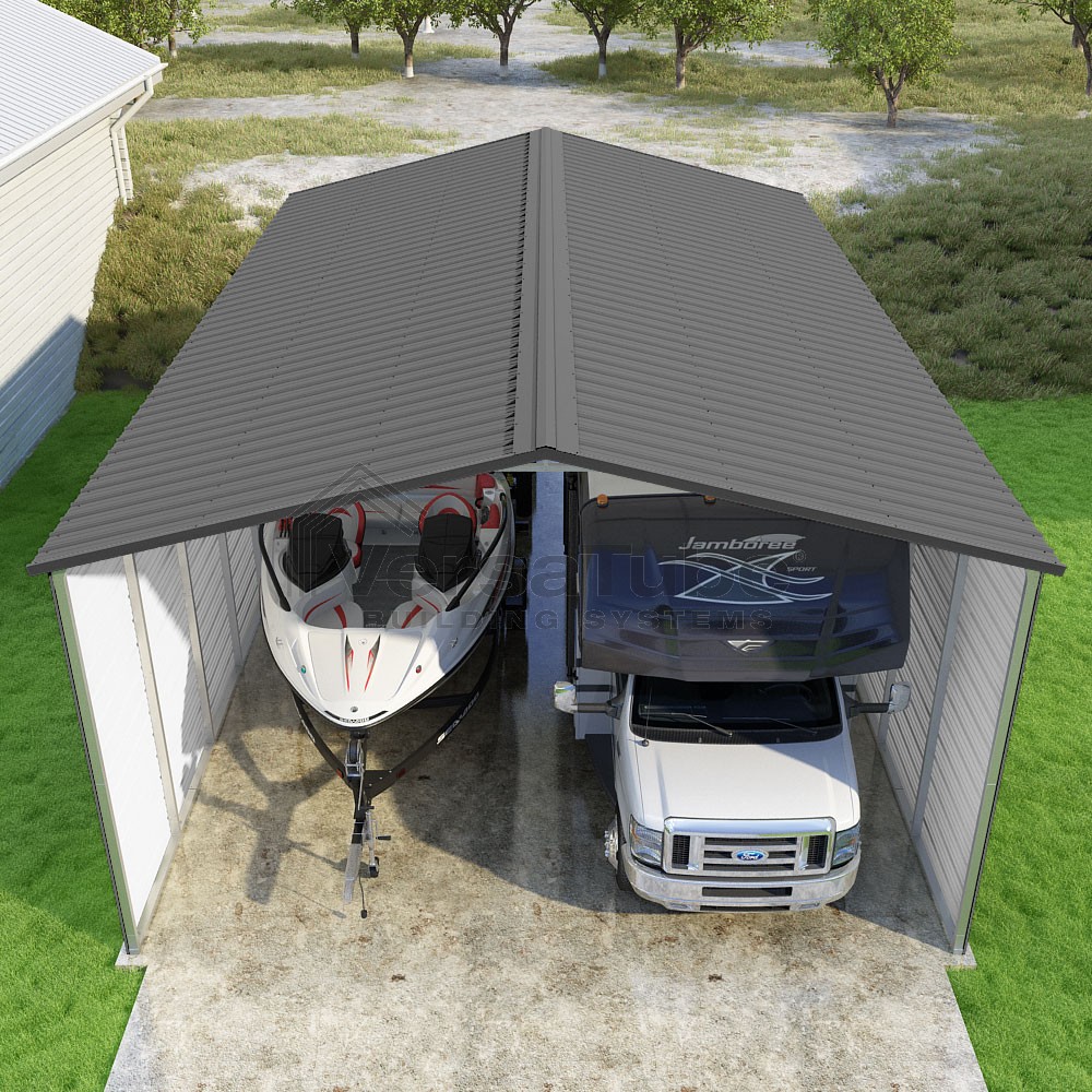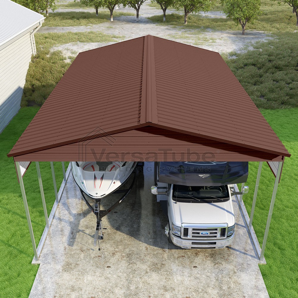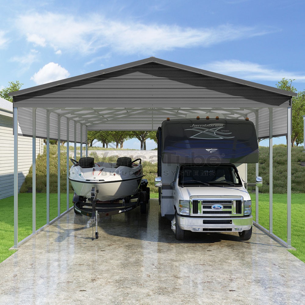 Pinnacle Series DIY carport kit features vertical sheet metal roof panels with ridge cap, gable and eave trim for an A-frame roof style and extended coverage on both ends.