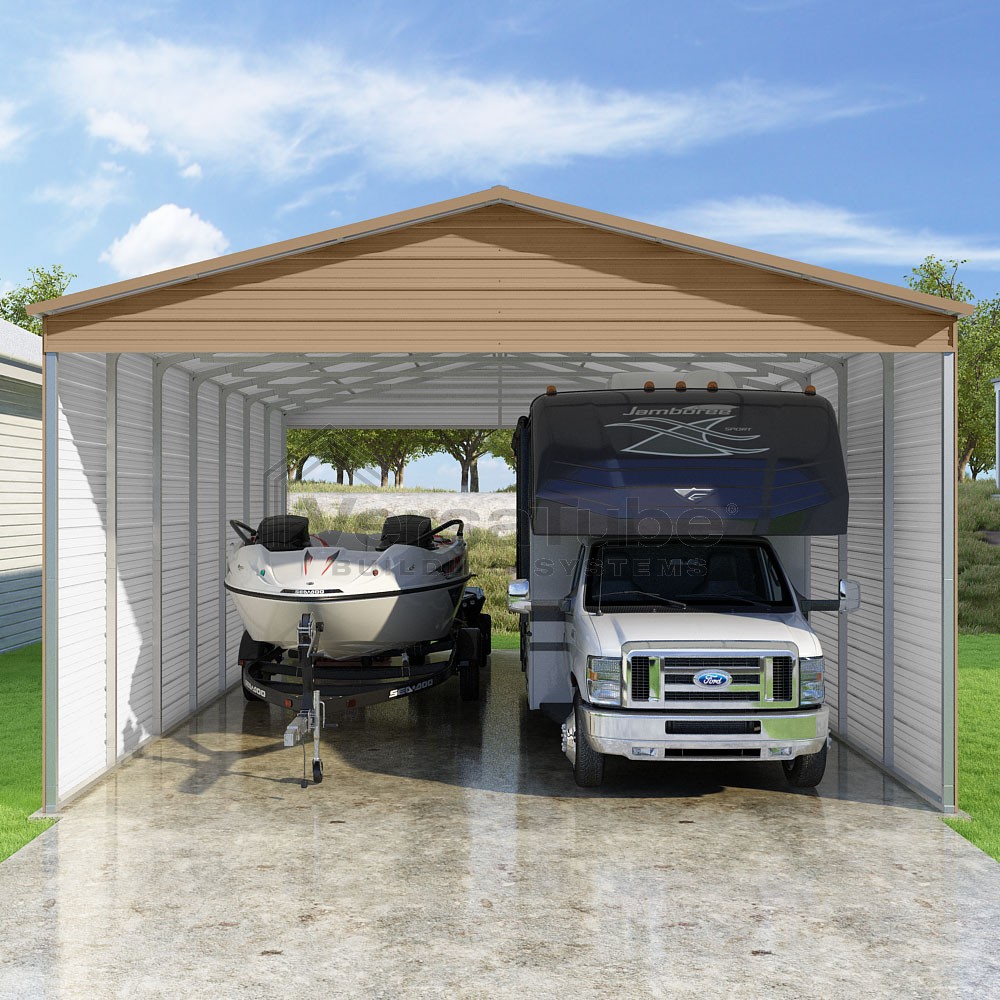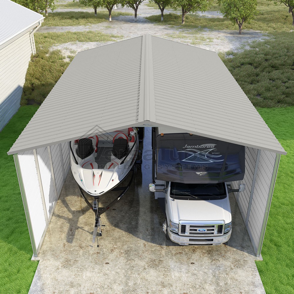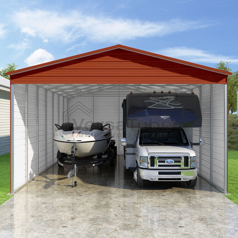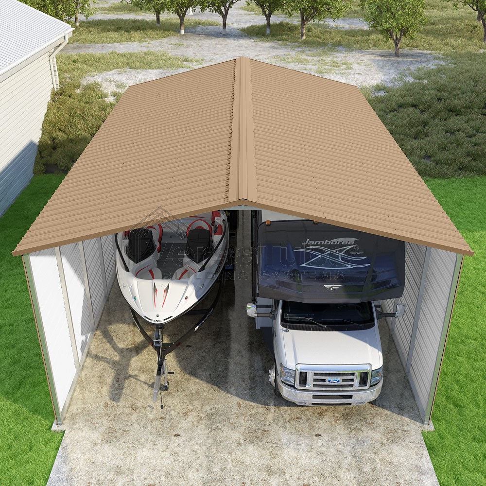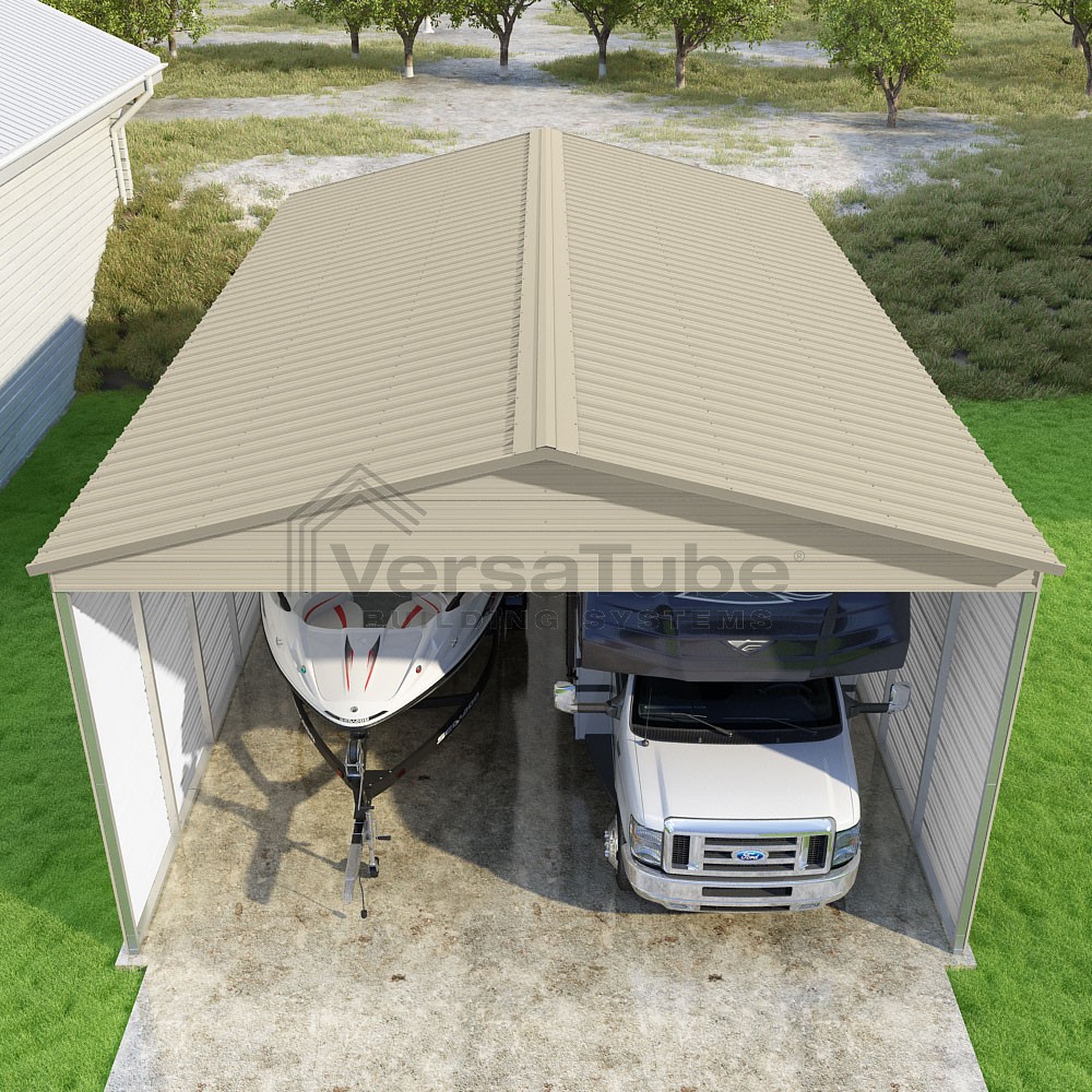 Pinnacle Series DIY carport kit features vertical sheet metal roof panels with ridge cap, gable and eave trim for an A-frame roof style and extended coverage on both ends.