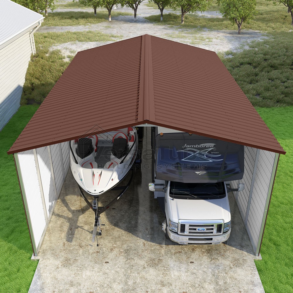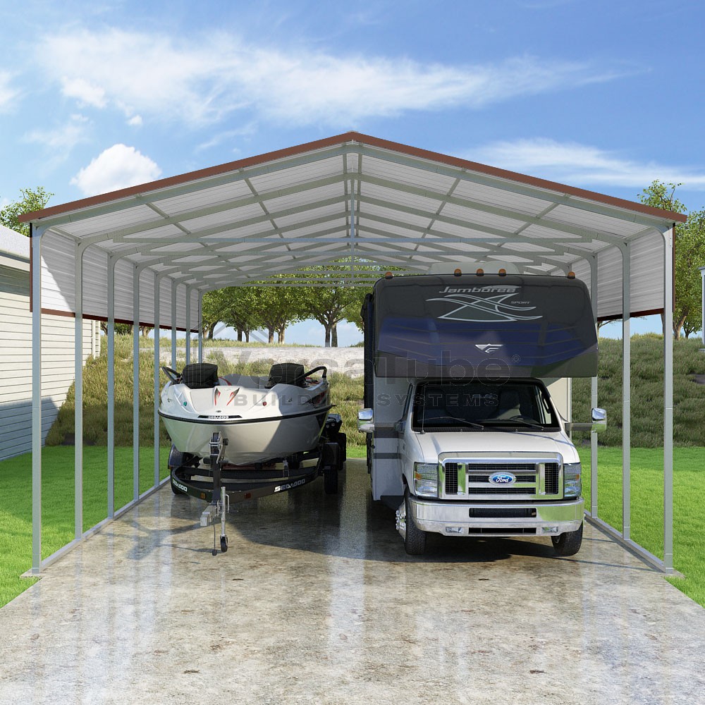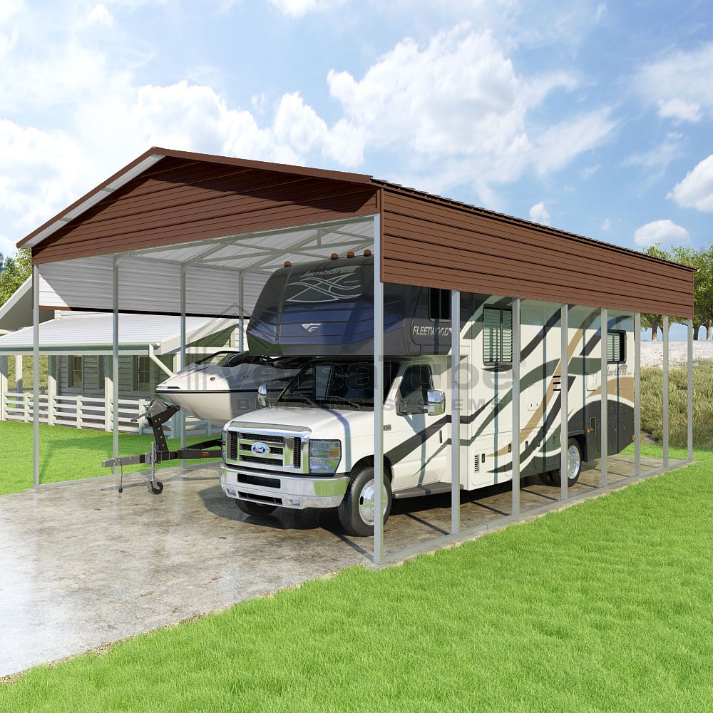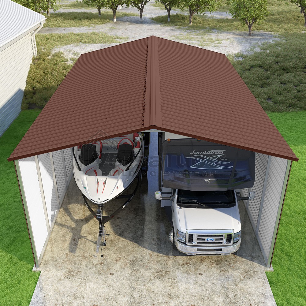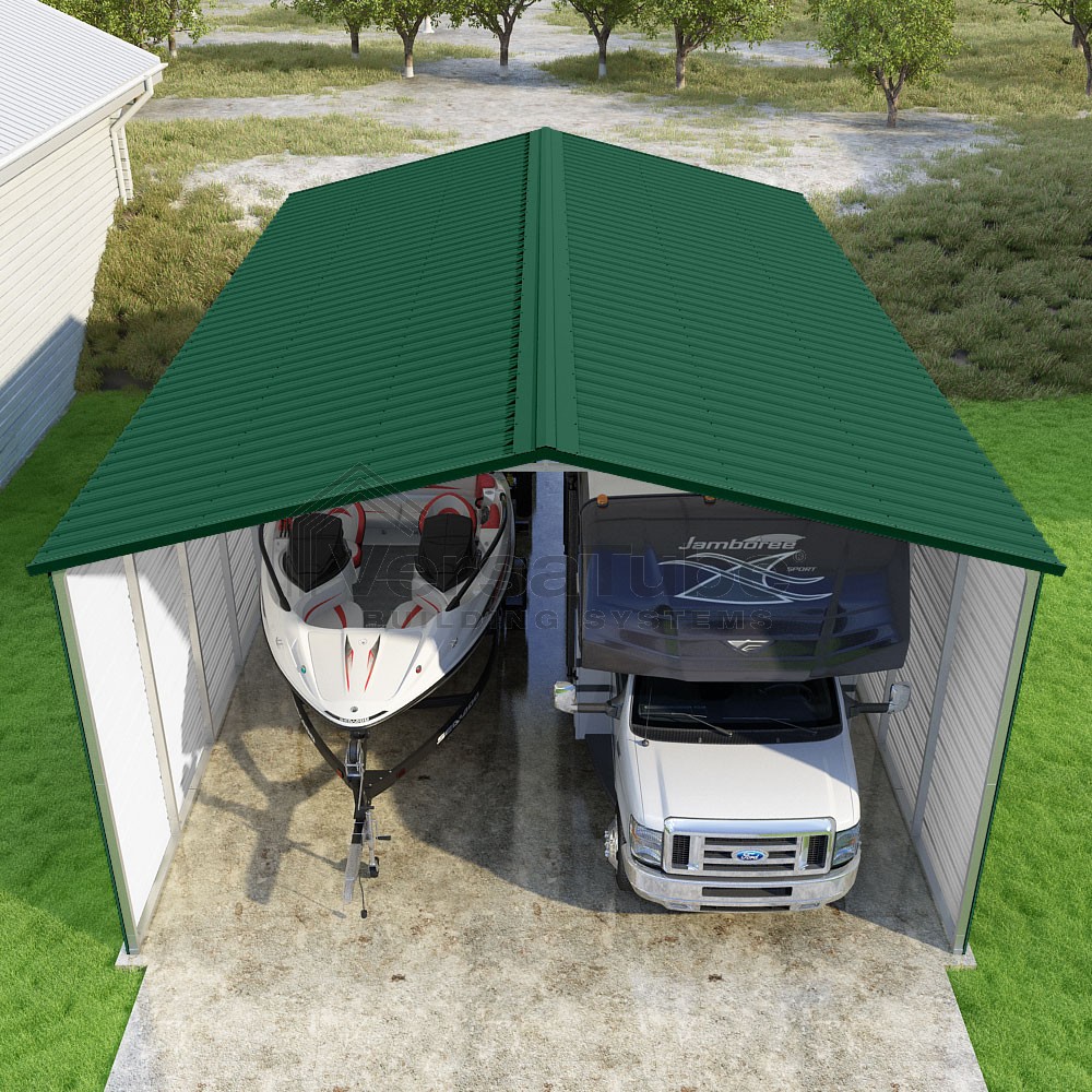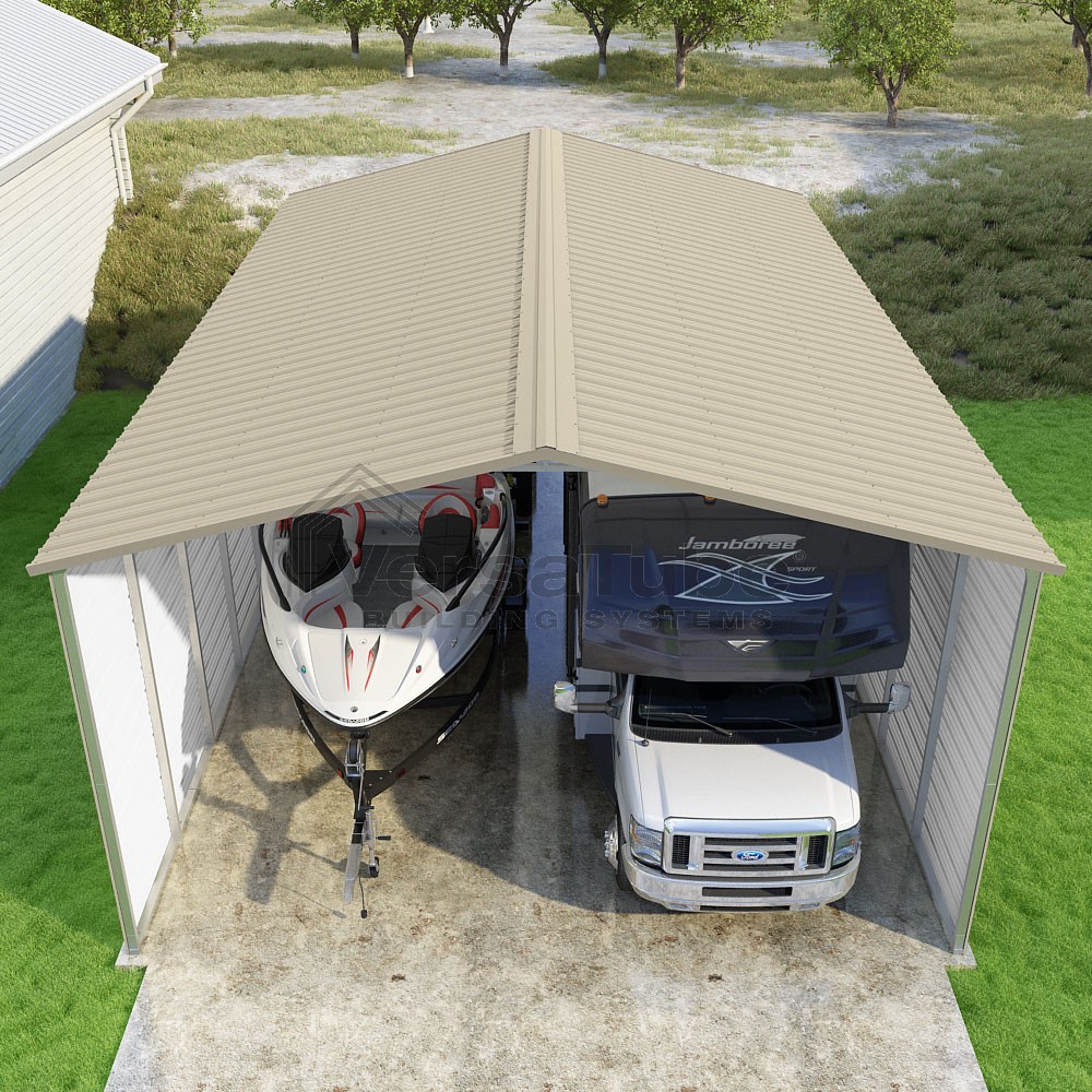 Pinnacle Series DIY carport kit features vertical sheet metal roof panels with ridge cap, gable and eave trim for an A-frame roof style and extended coverage on both ends.