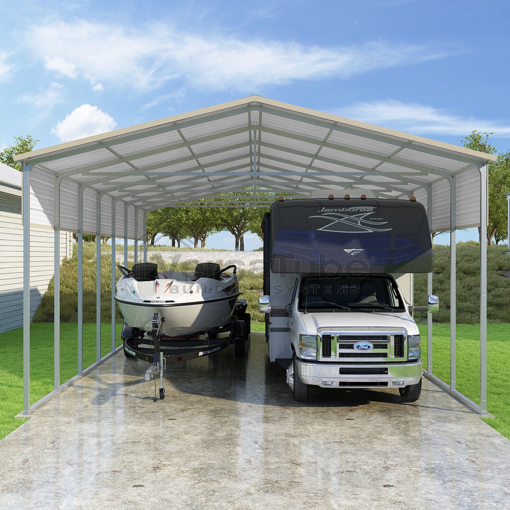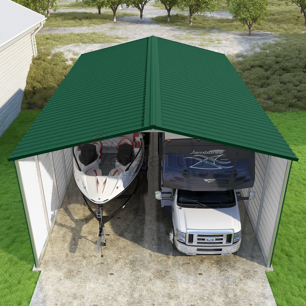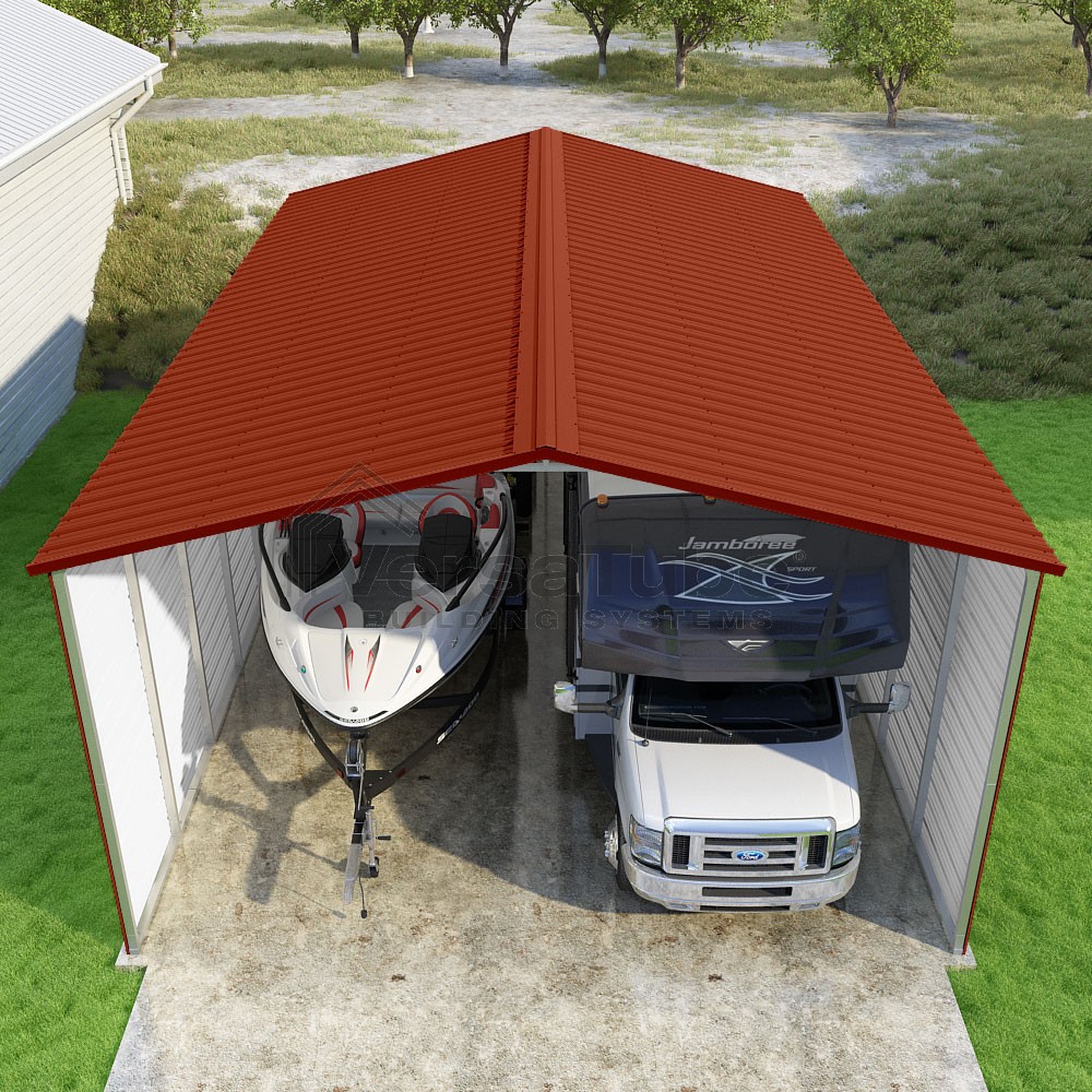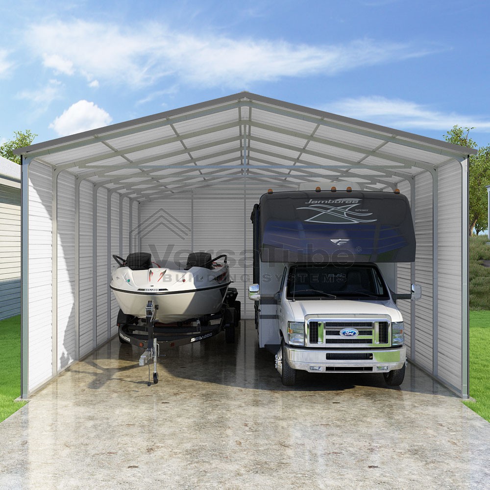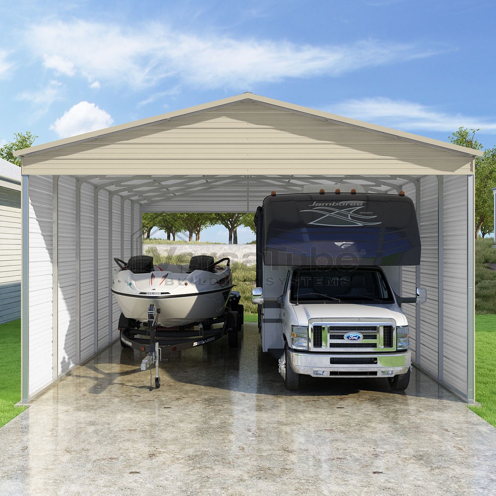 Pinnacle Series DIY carport kit features vertical sheet metal roof panels with ridge cap, gable and eave trim for an A-frame roof style and extended coverage on both ends.