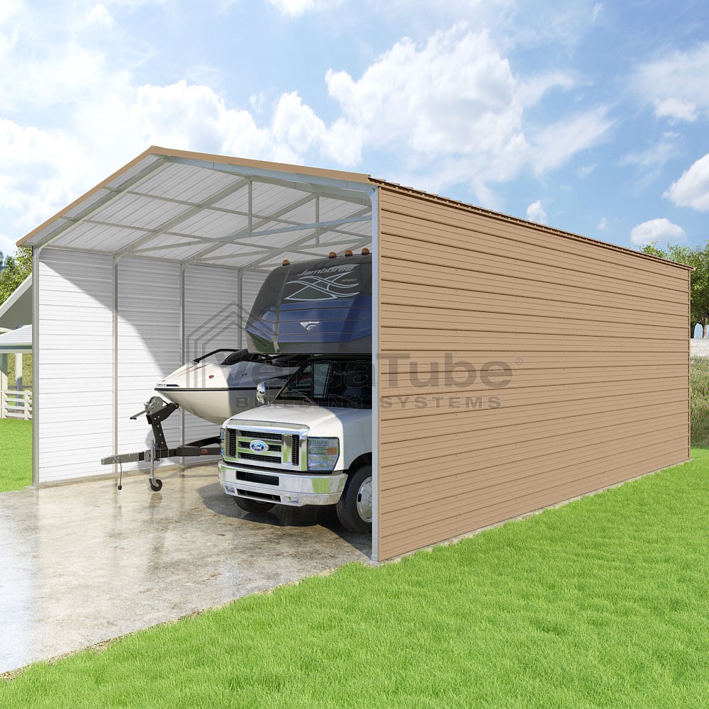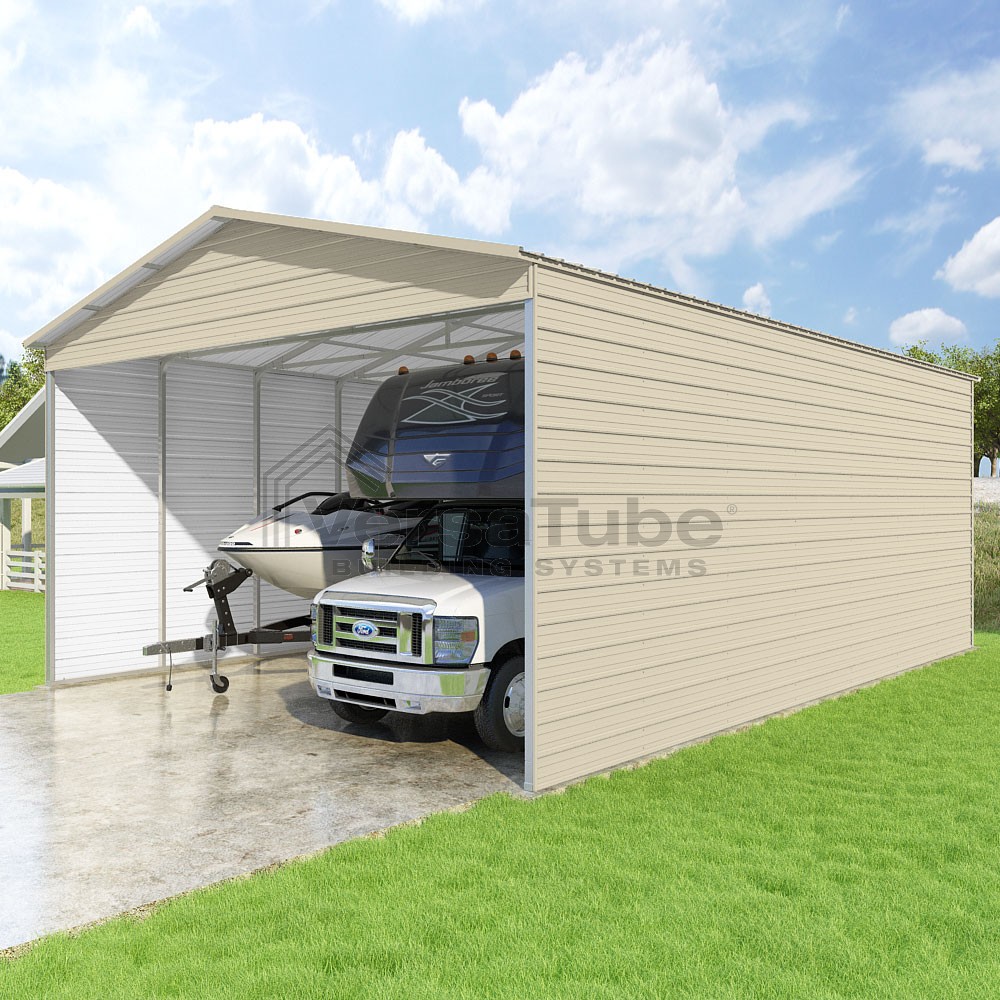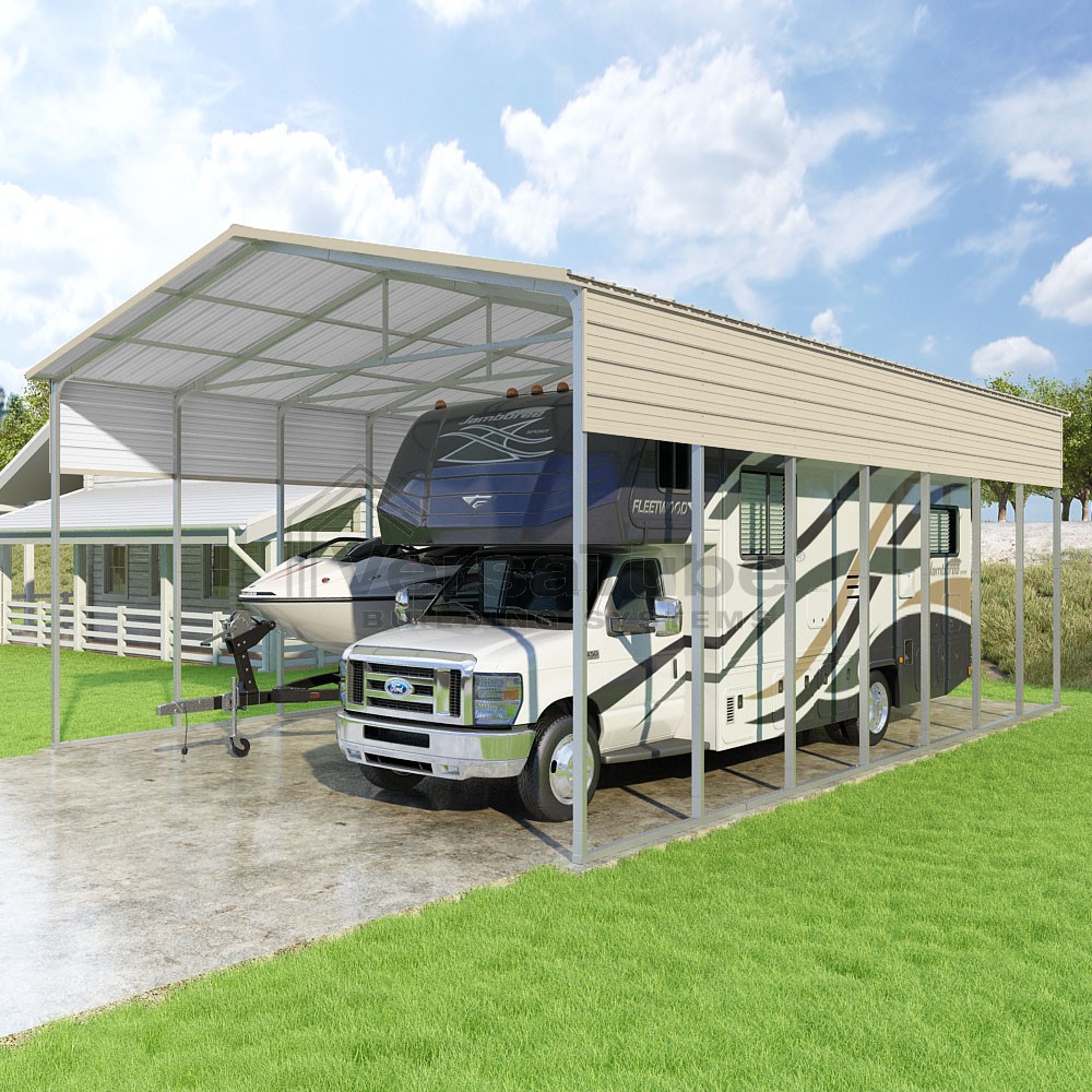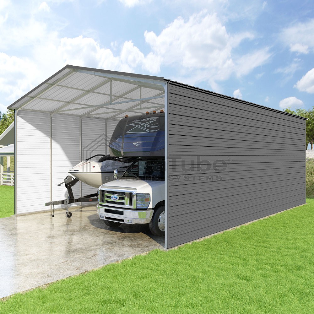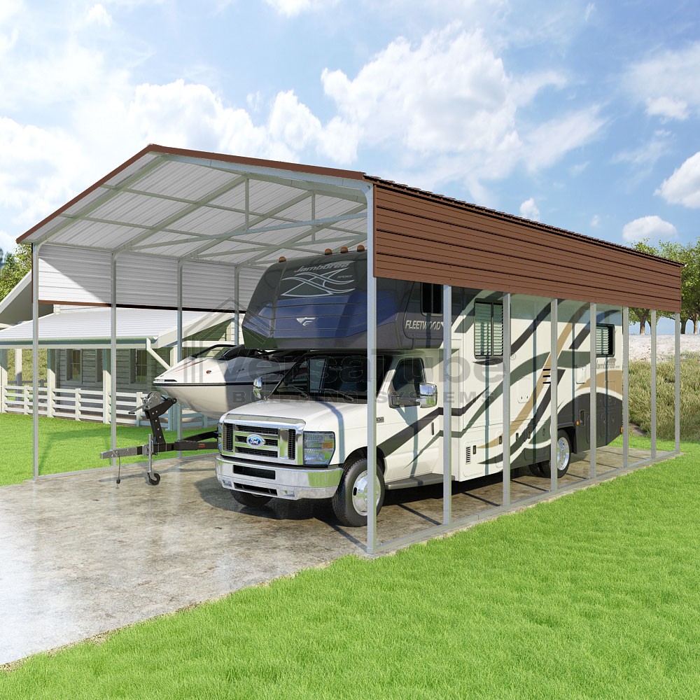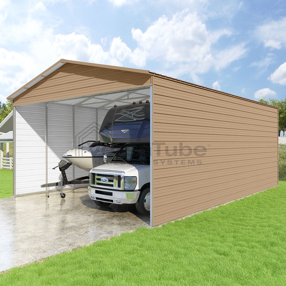 Pinnacle Series DIY carport kit features vertical sheet metal roof panels with ridge cap, gable and eave trim for an A-frame roof style and extended coverage on both ends.