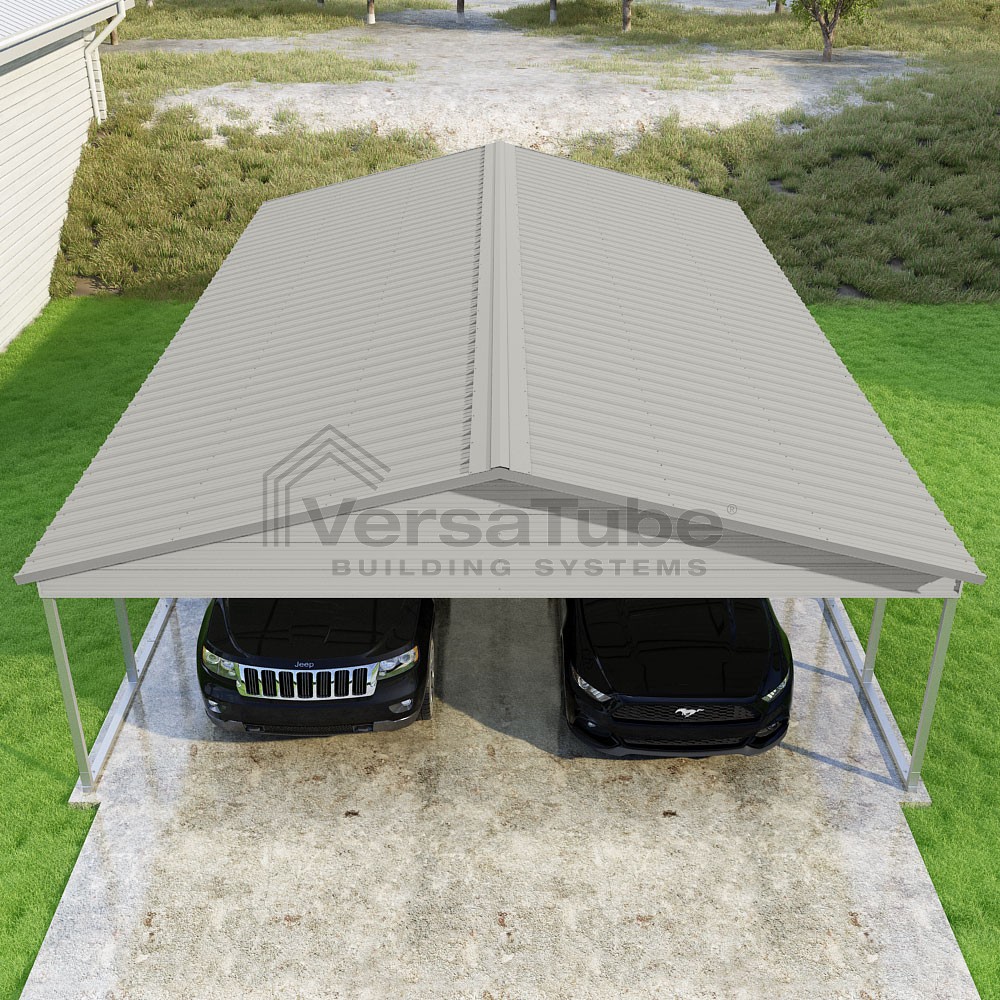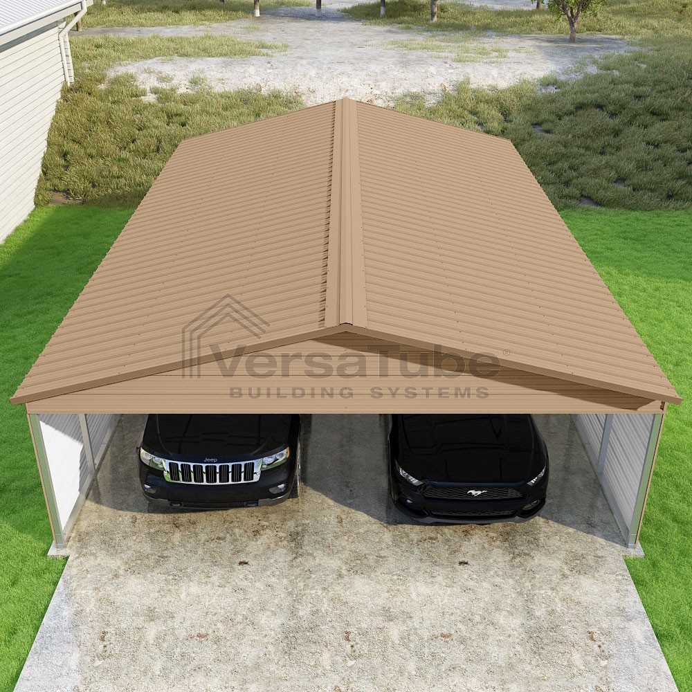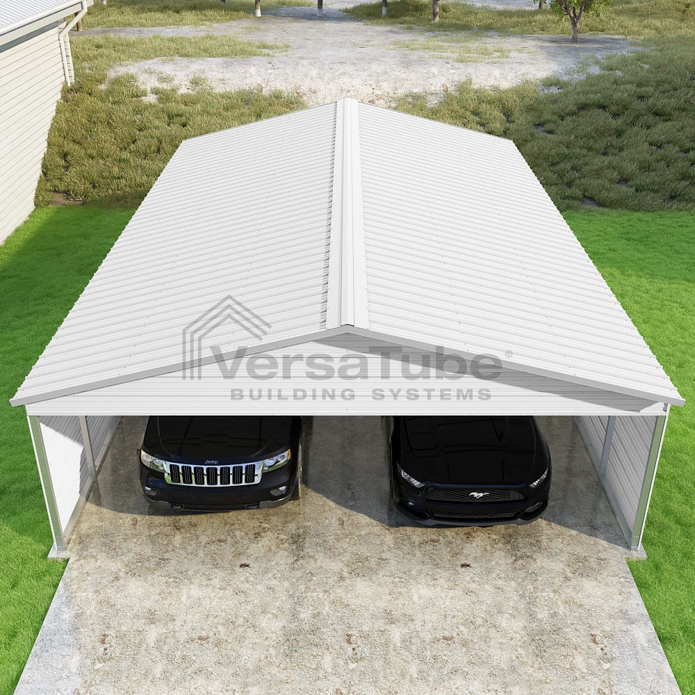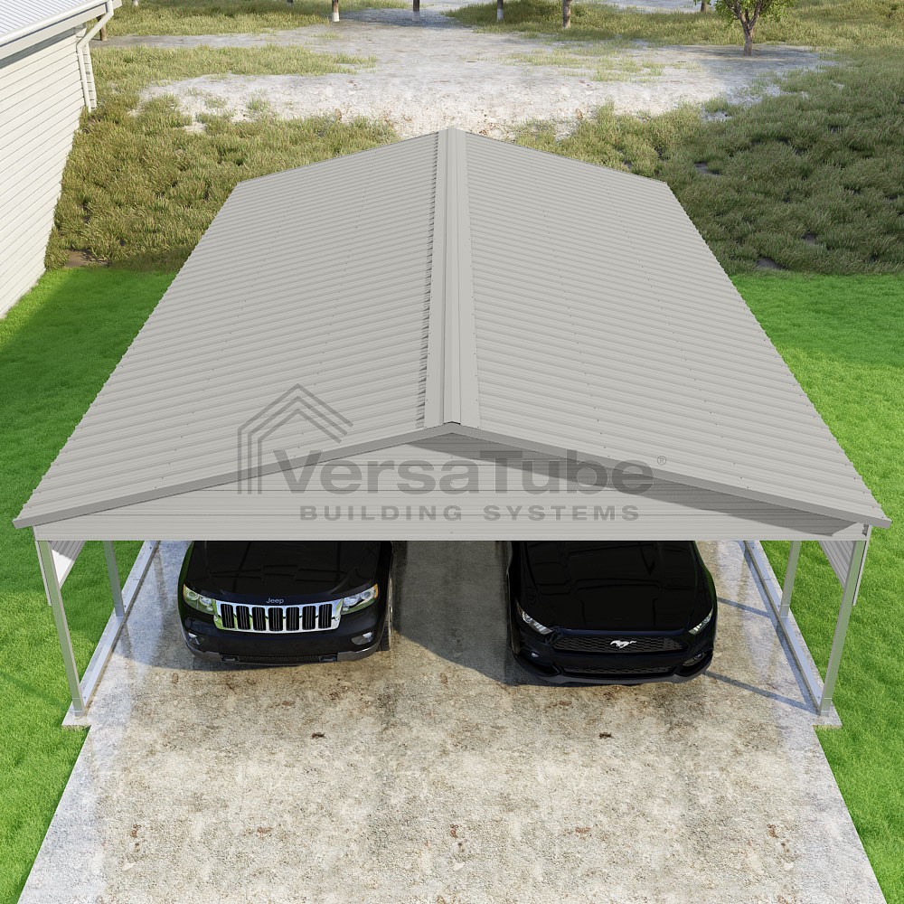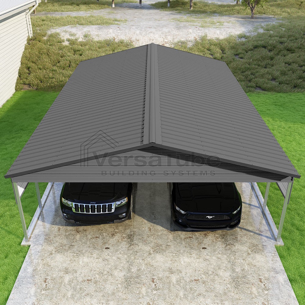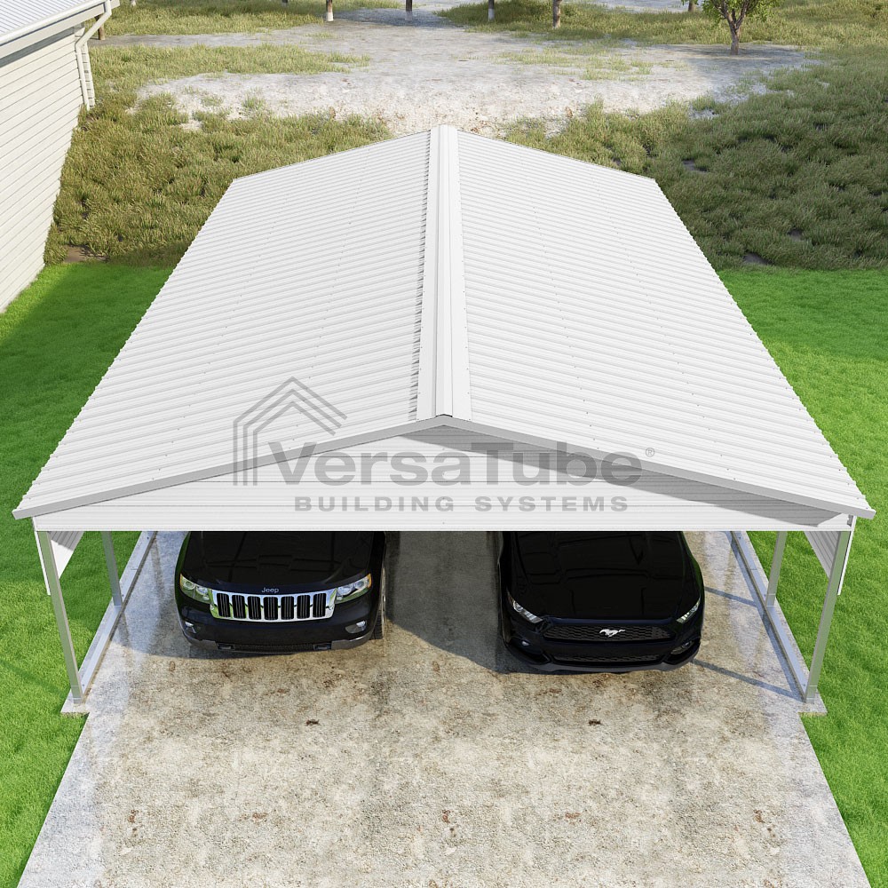 Pinnacle Series DIY carport kit features vertical sheet metal roof panels with ridge cap, gable and eave trim for an A-frame roof style and extended coverage on both ends.