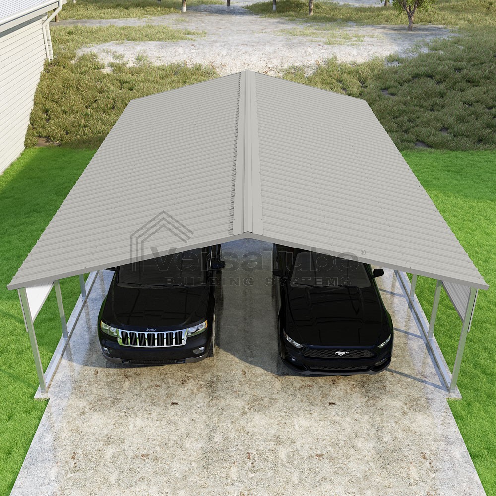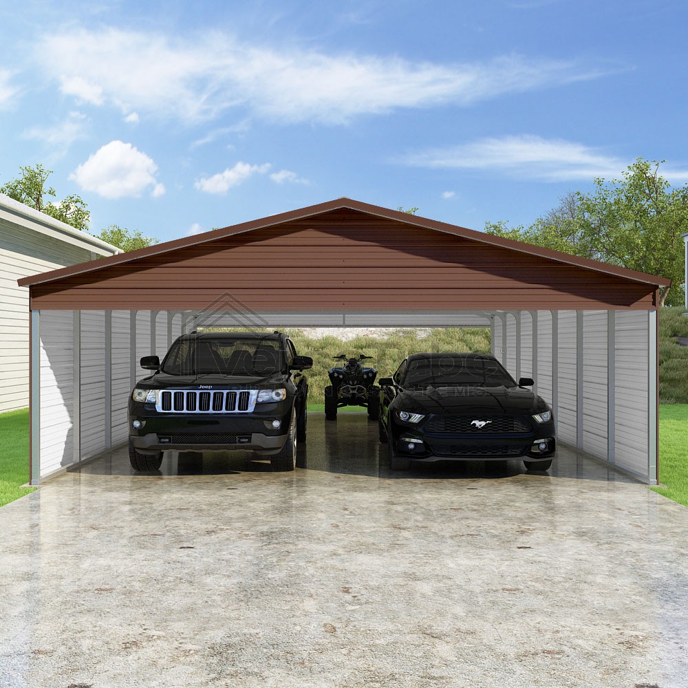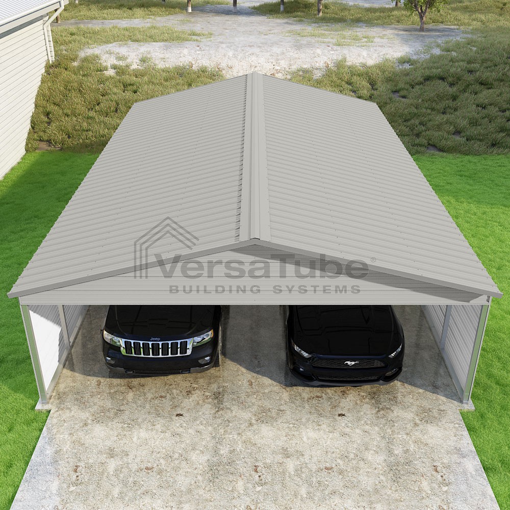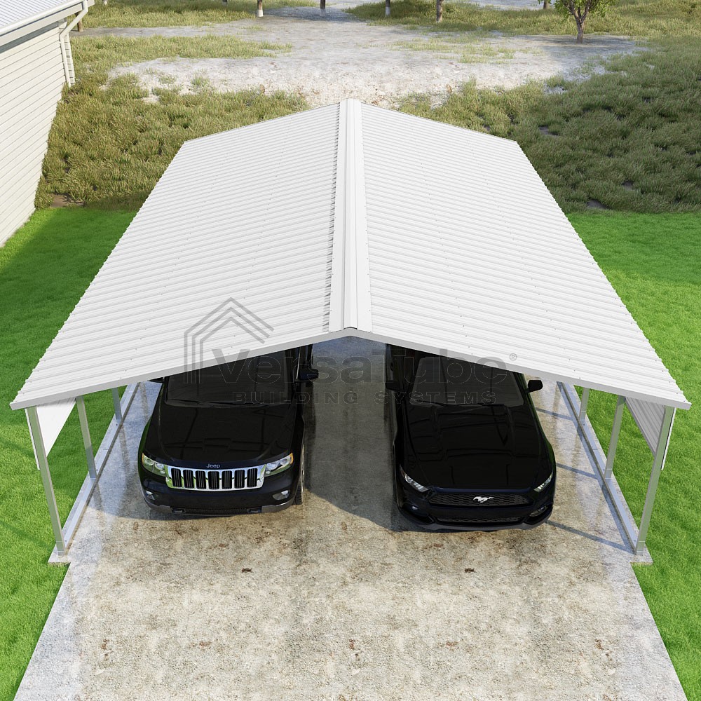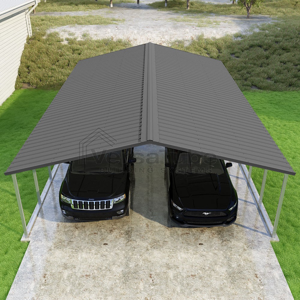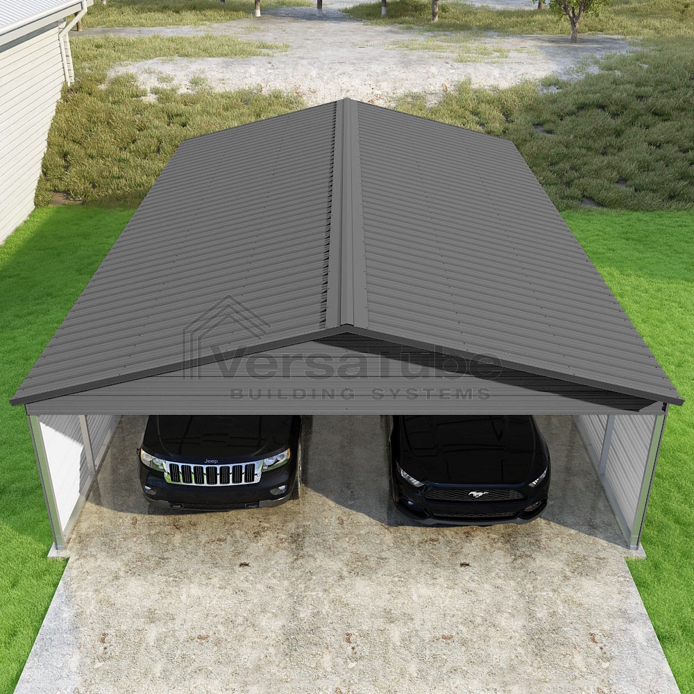 Pinnacle Series DIY carport kit features vertical sheet metal roof panels with ridge cap, gable and eave trim for an A-frame roof style and extended coverage on both ends.