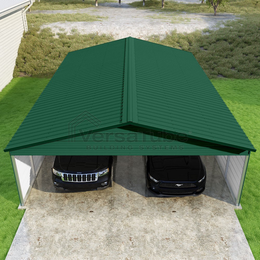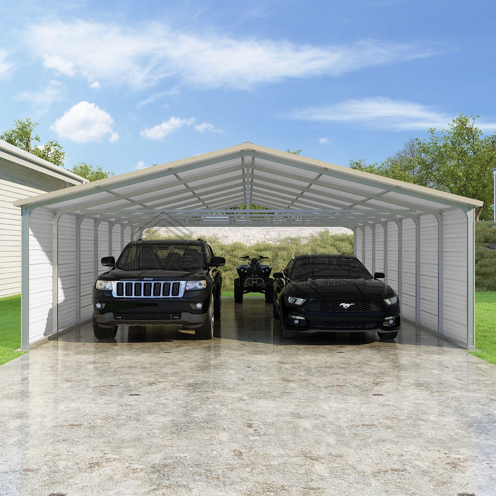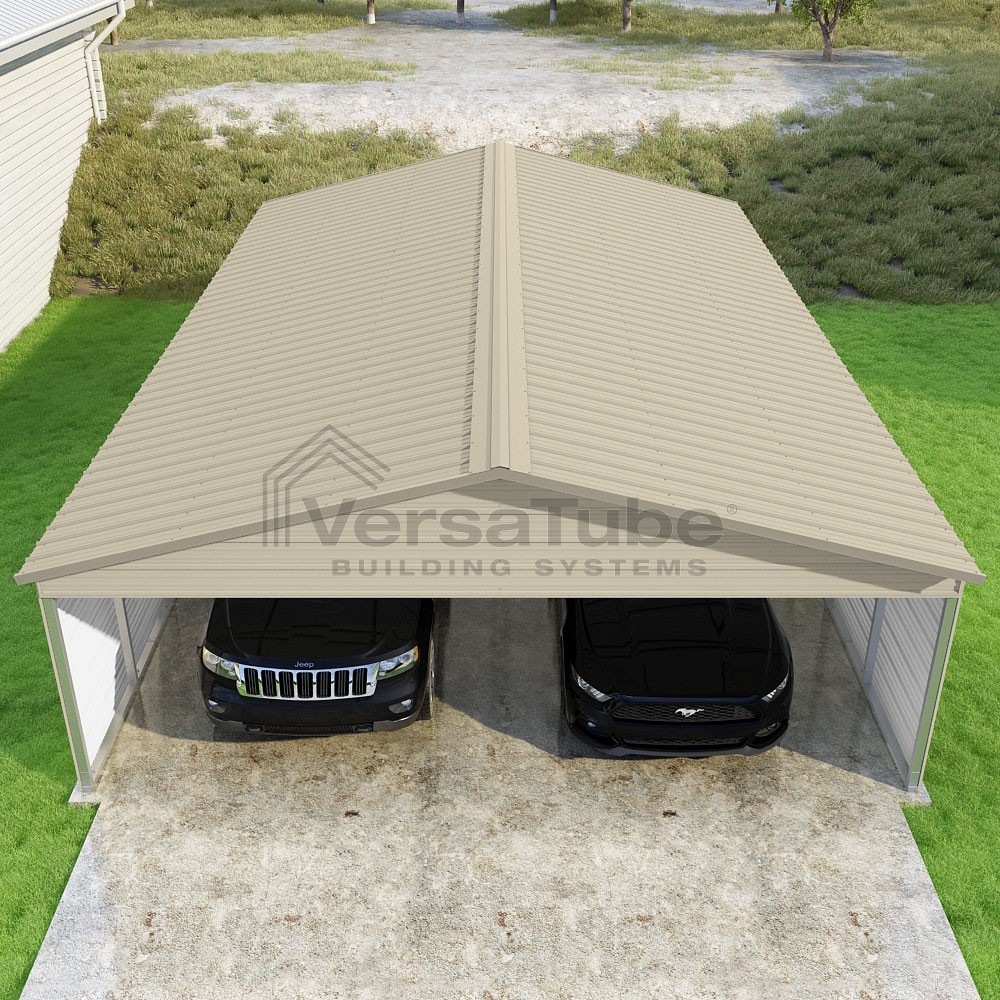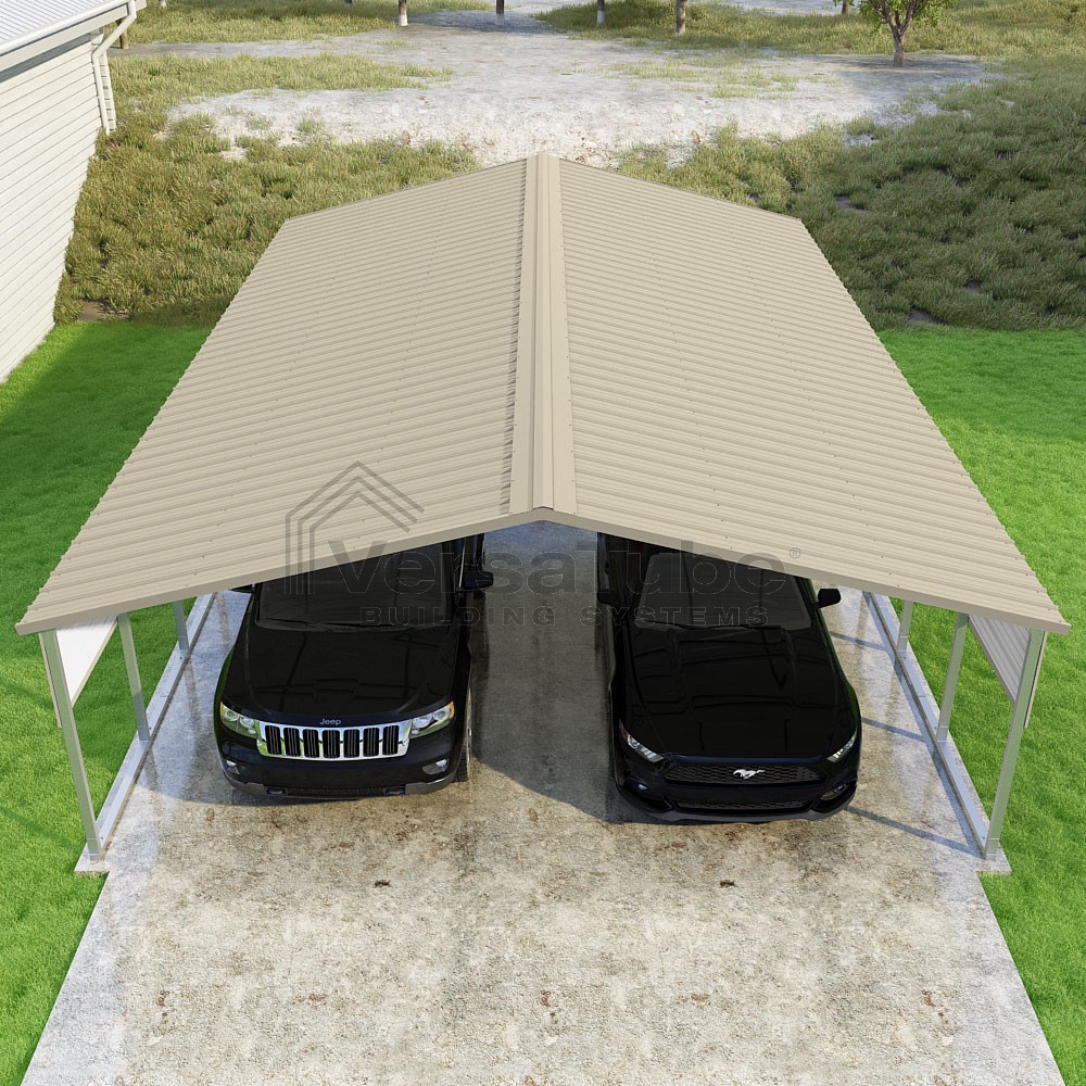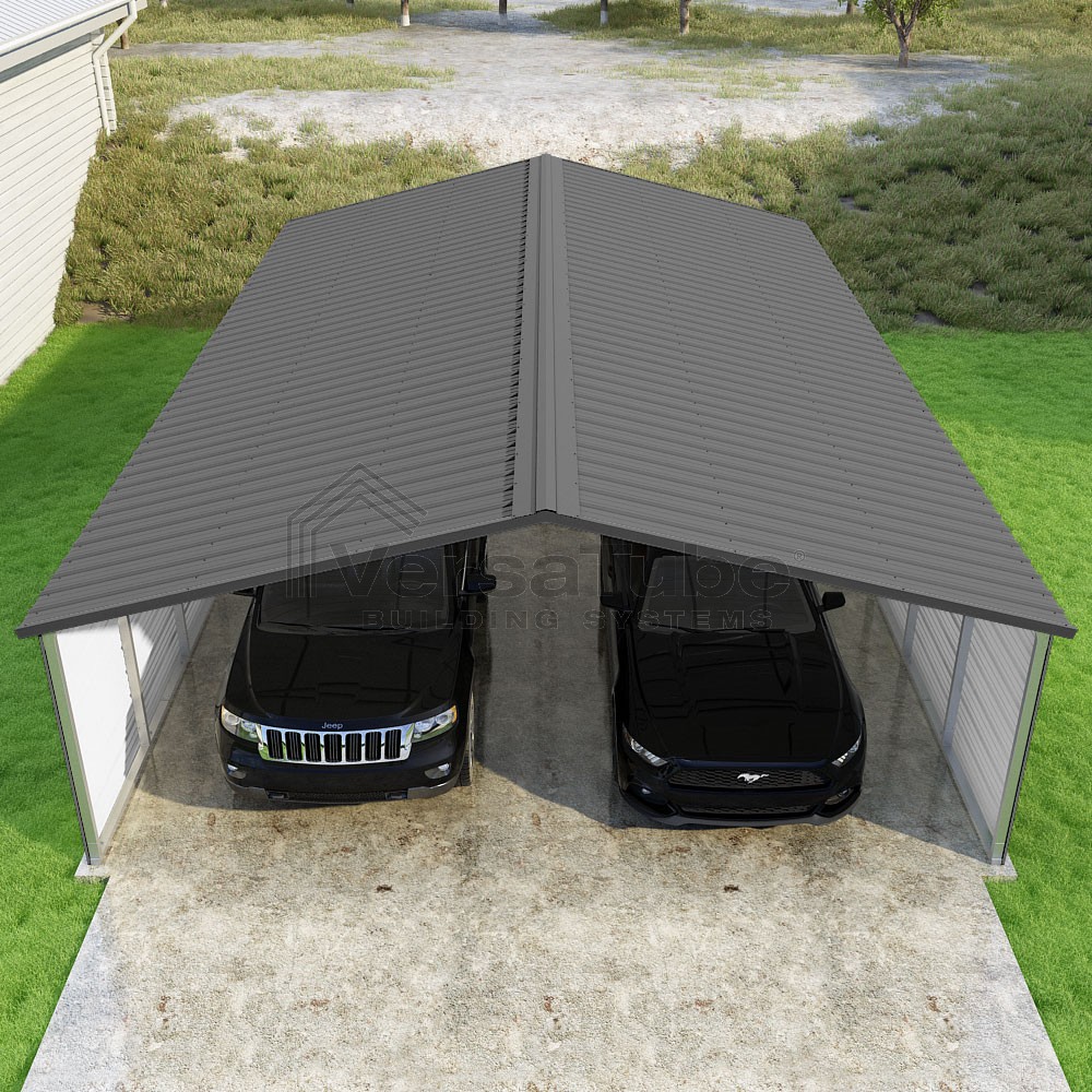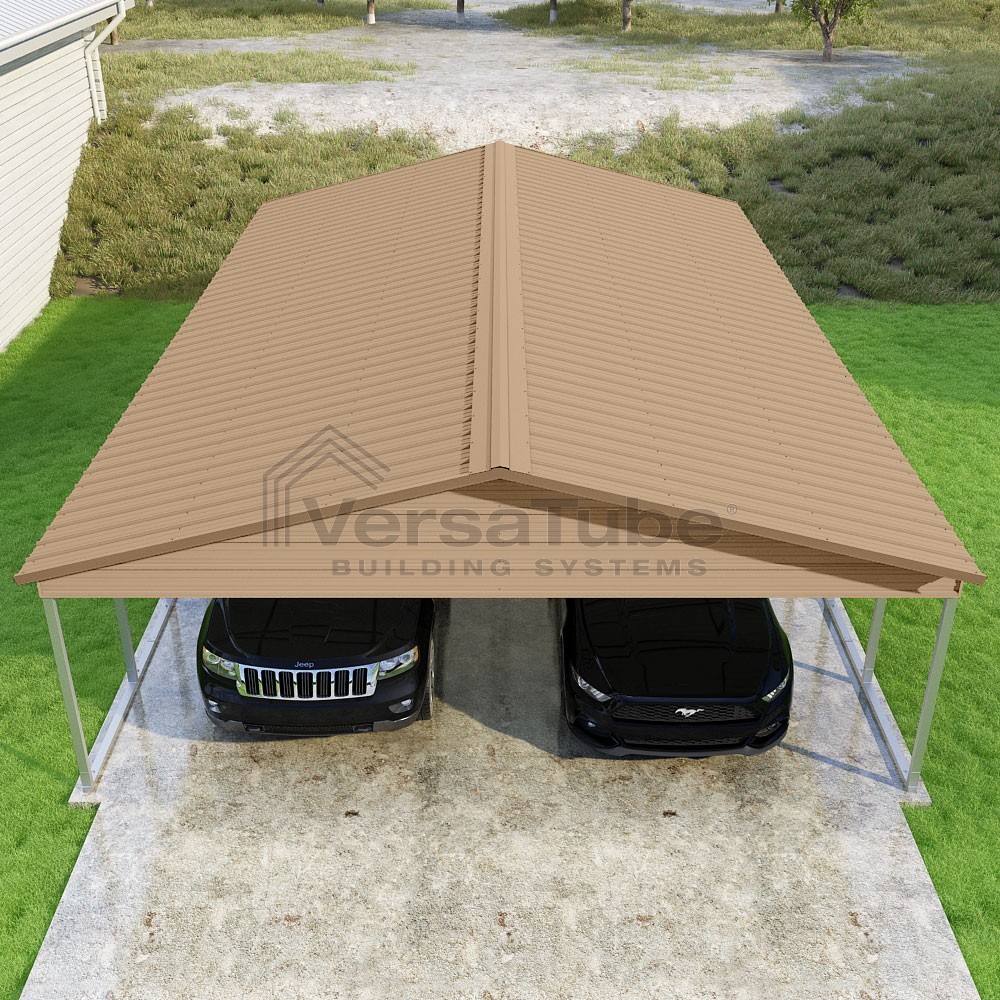Pinnacle Series DIY carport kit features vertical sheet metal roof panels with ridge cap, gable and eave trim for an A-frame roof style and extended coverage on both ends.