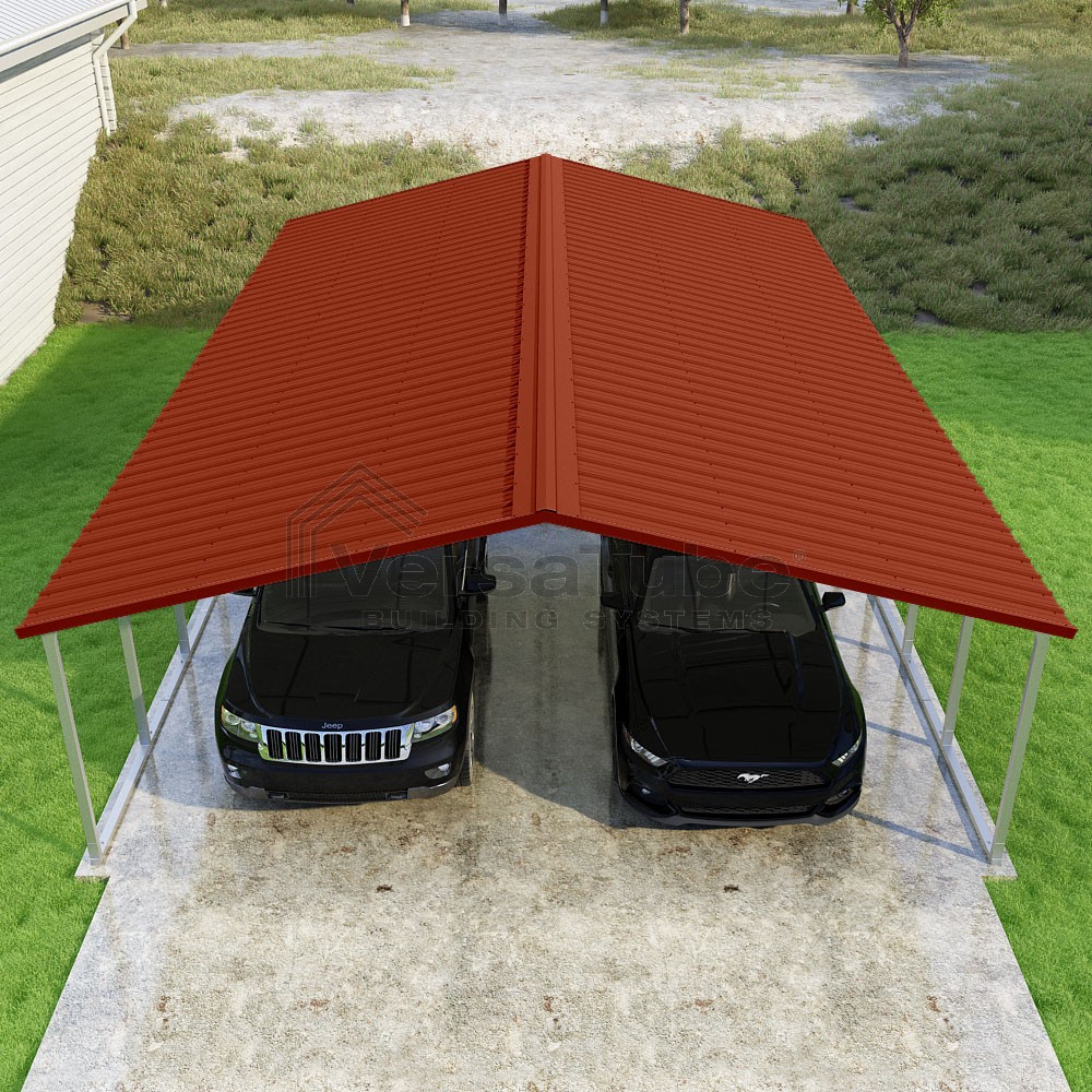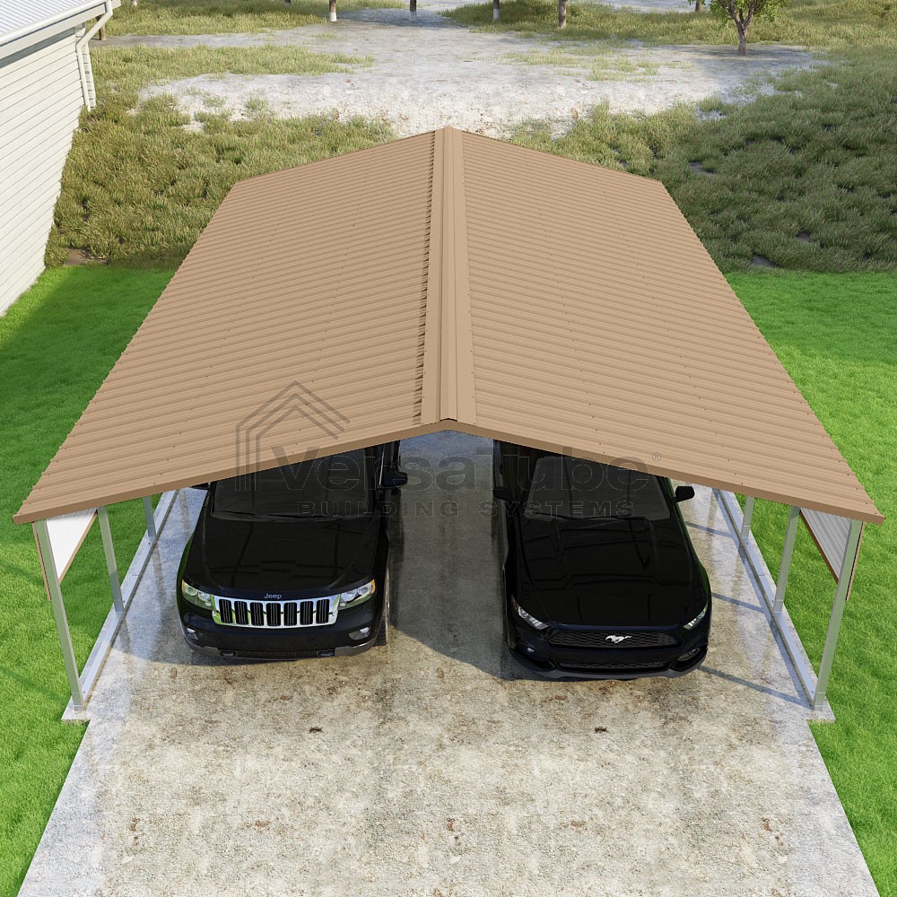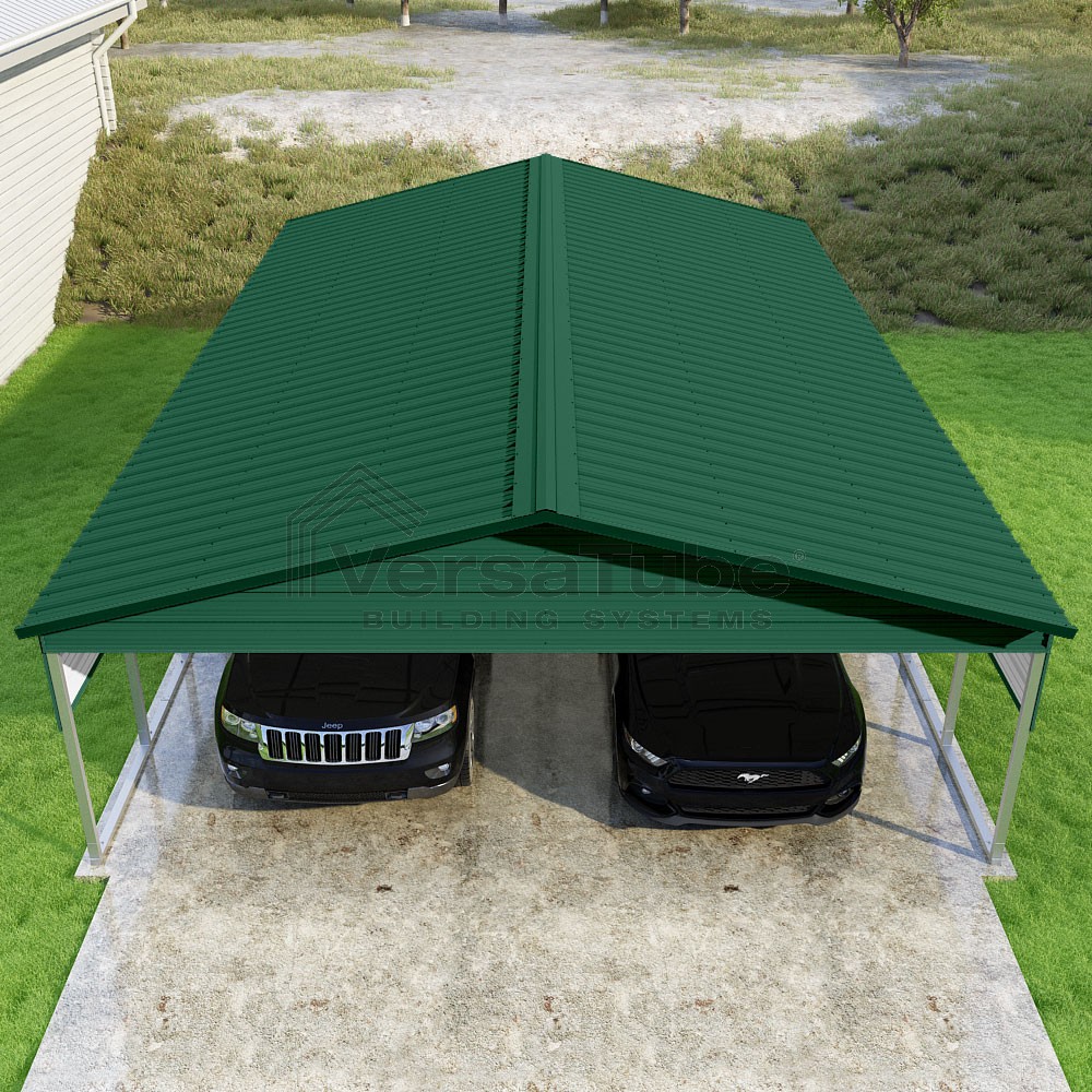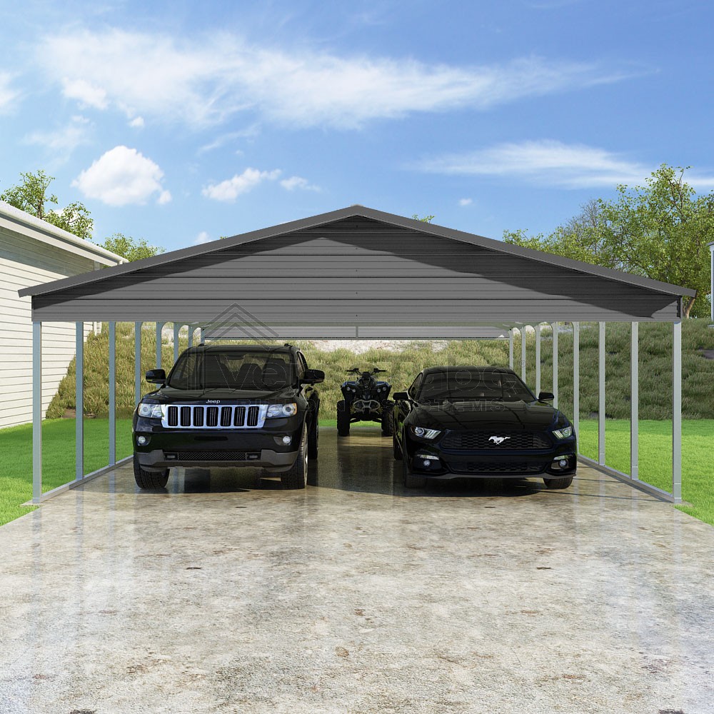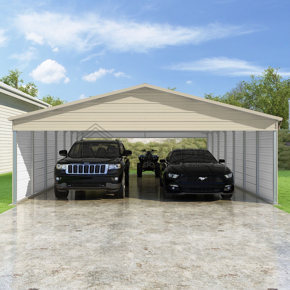 Pinnacle Series DIY carport kit features vertical sheet metal roof panels with ridge cap, gable and eave trim for an A-frame roof style and extended coverage on both ends.