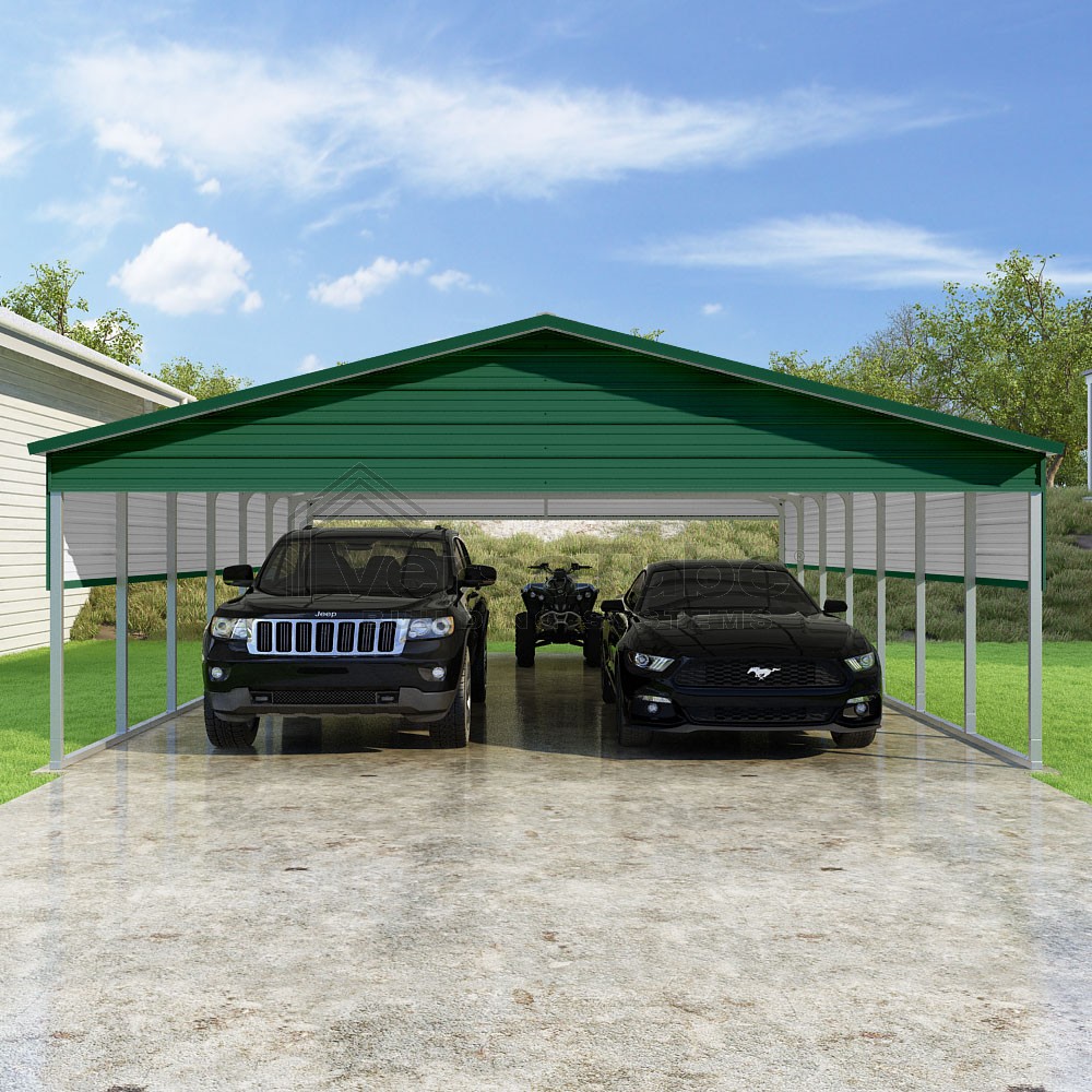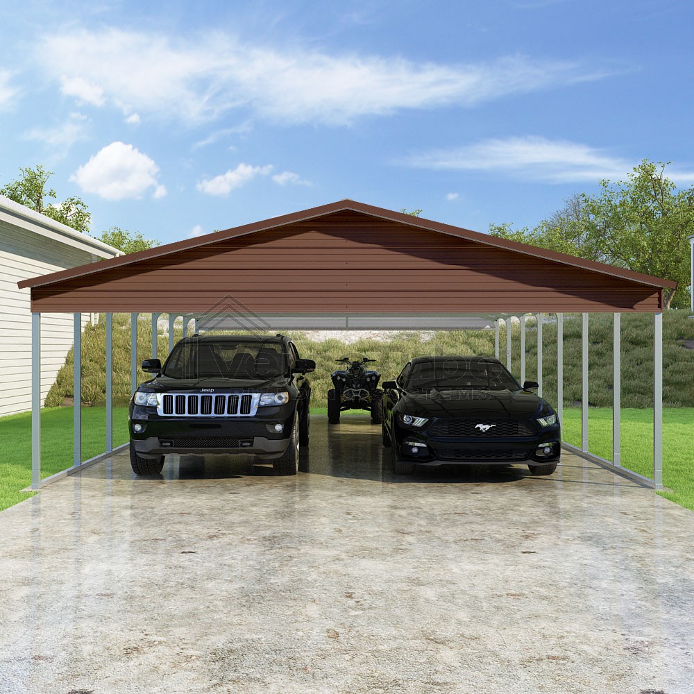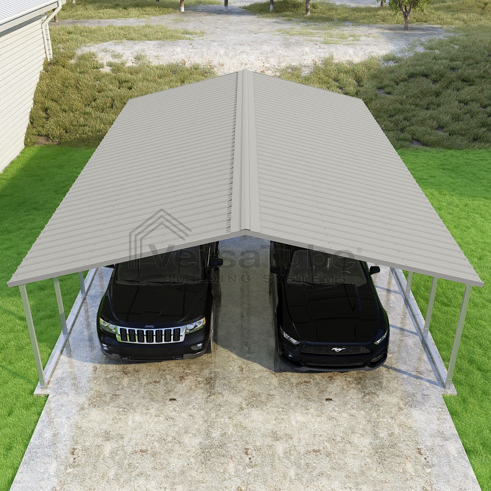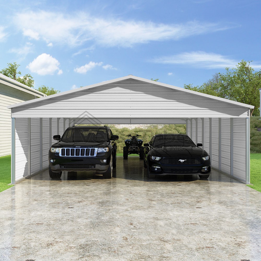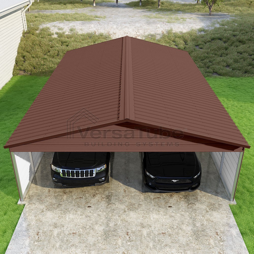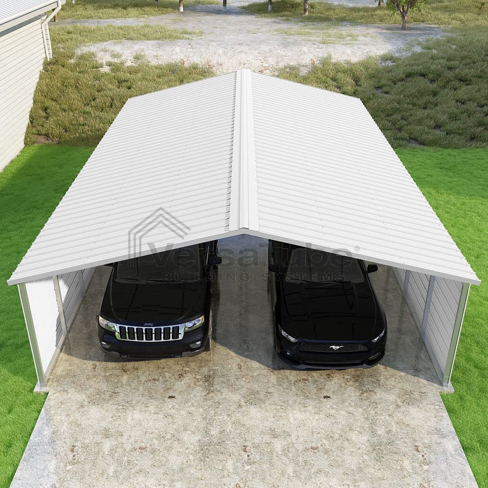 Pinnacle Series DIY carport kit features vertical sheet metal roof panels with ridge cap, gable and eave trim for an A-frame roof style and extended coverage on both ends.