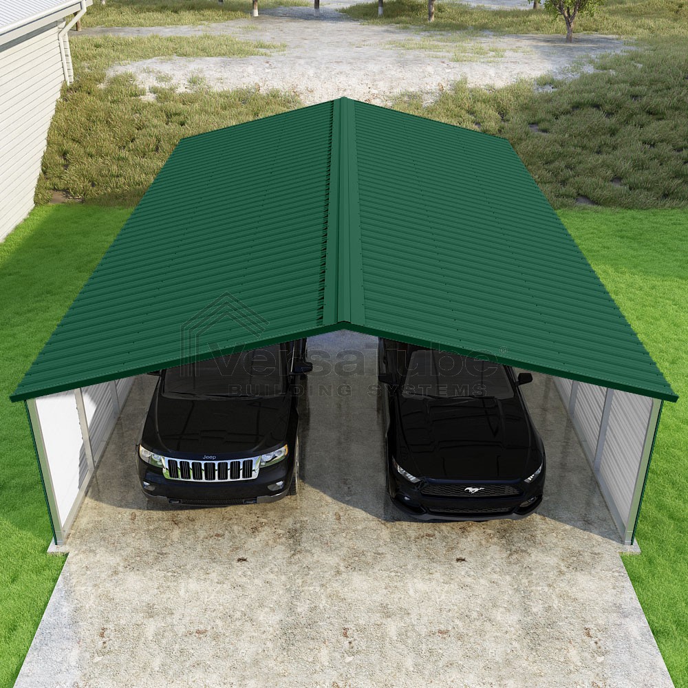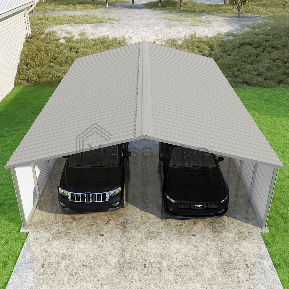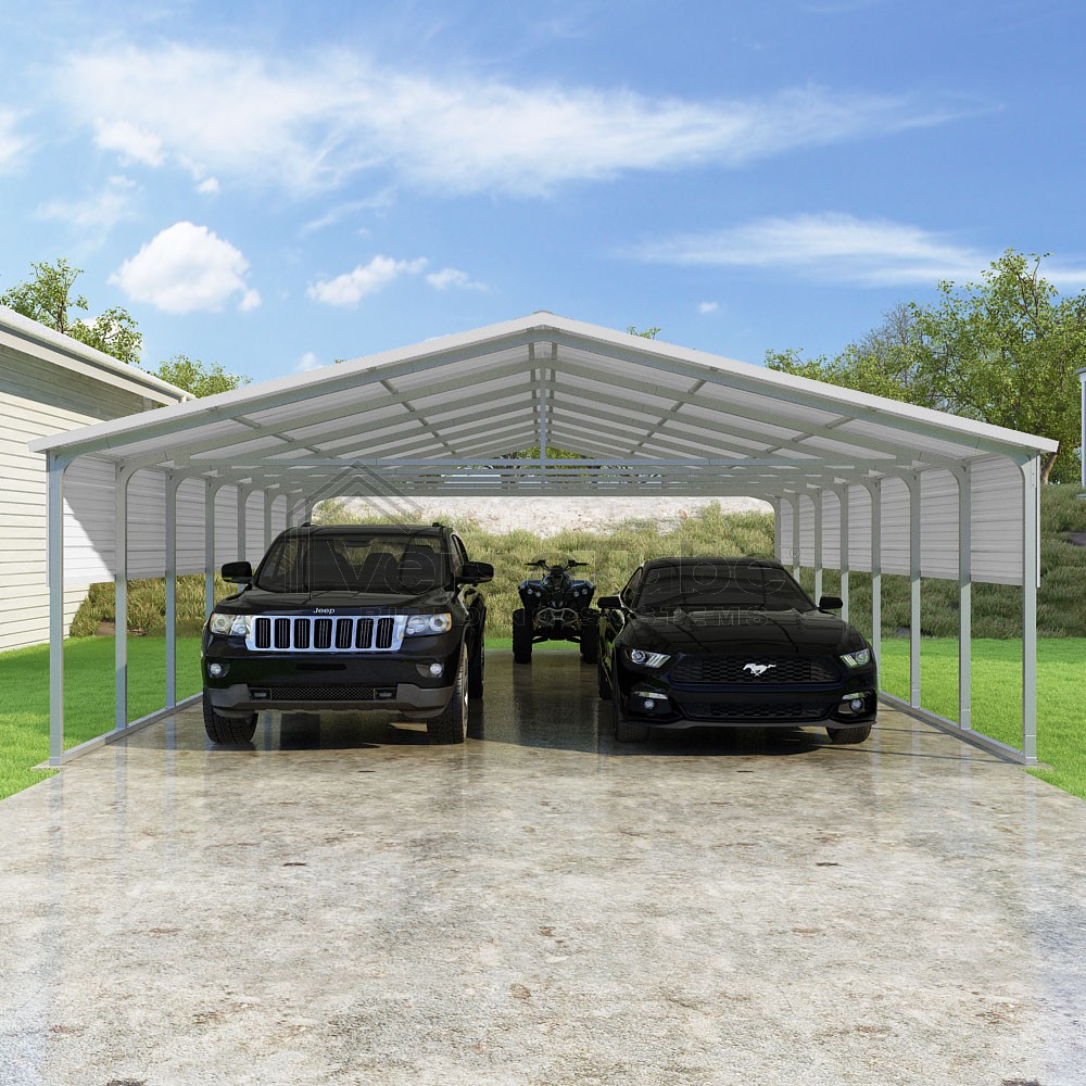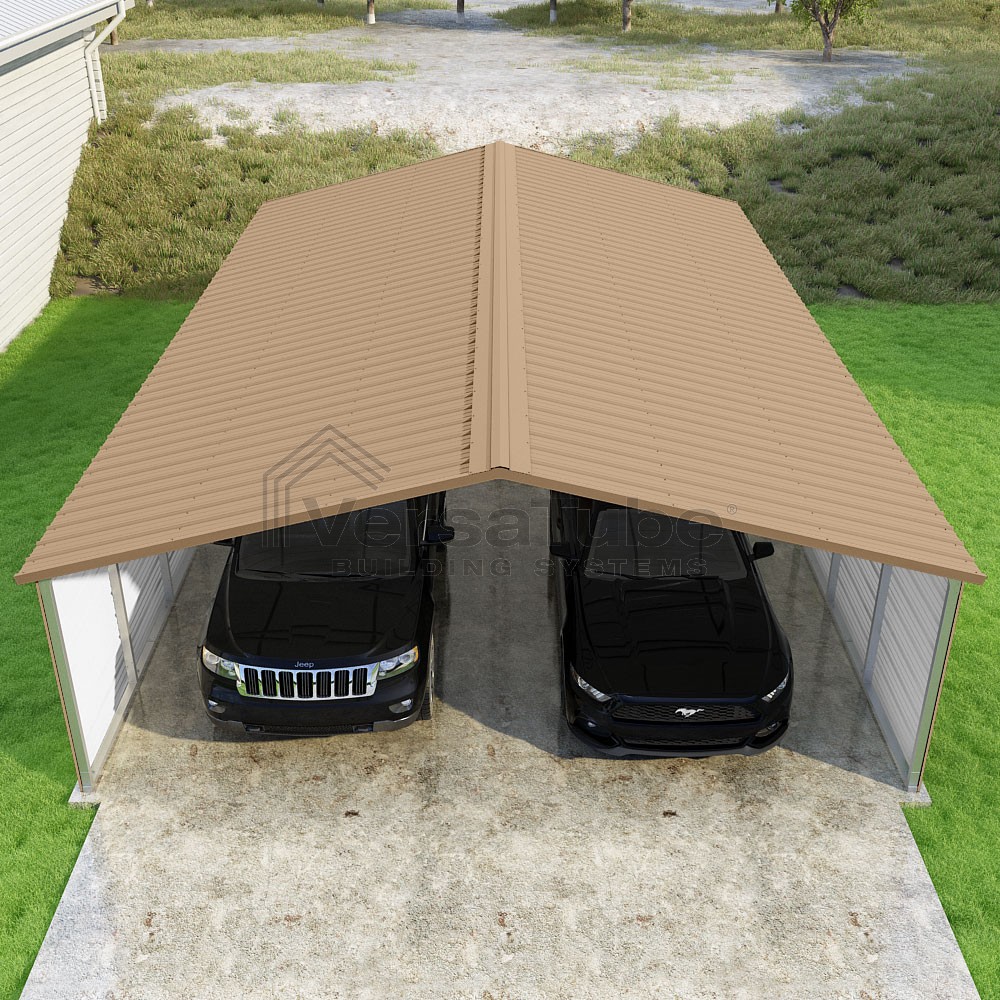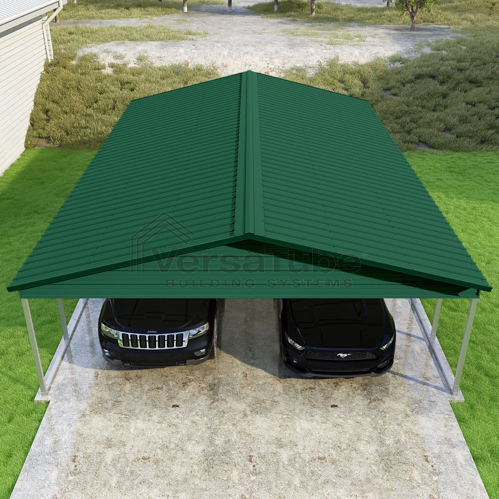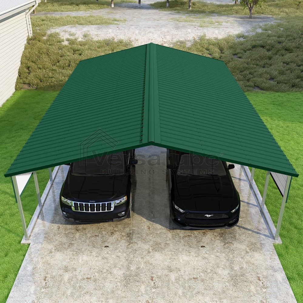 Pinnacle Series DIY carport kit features vertical sheet metal roof panels with ridge cap, gable and eave trim for an A-frame roof style and extended coverage on both ends.