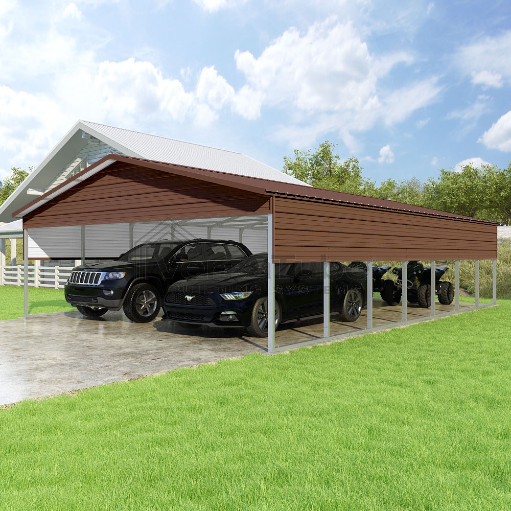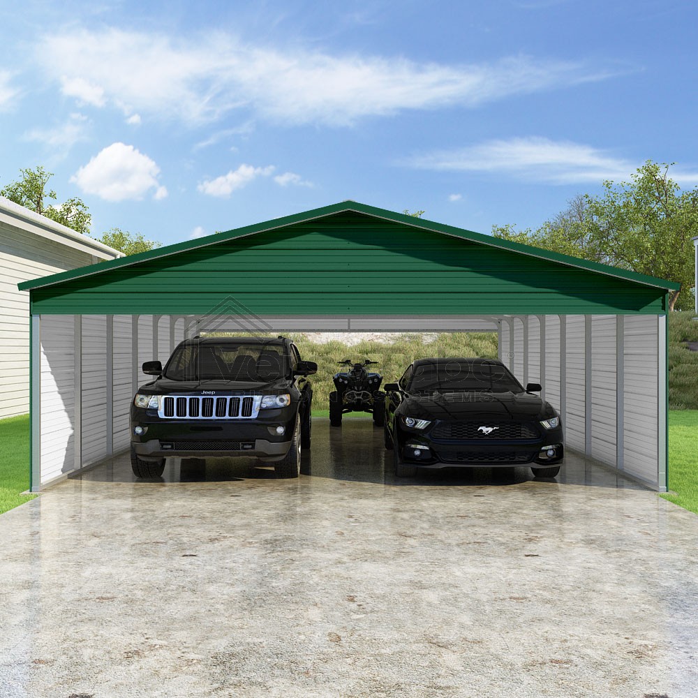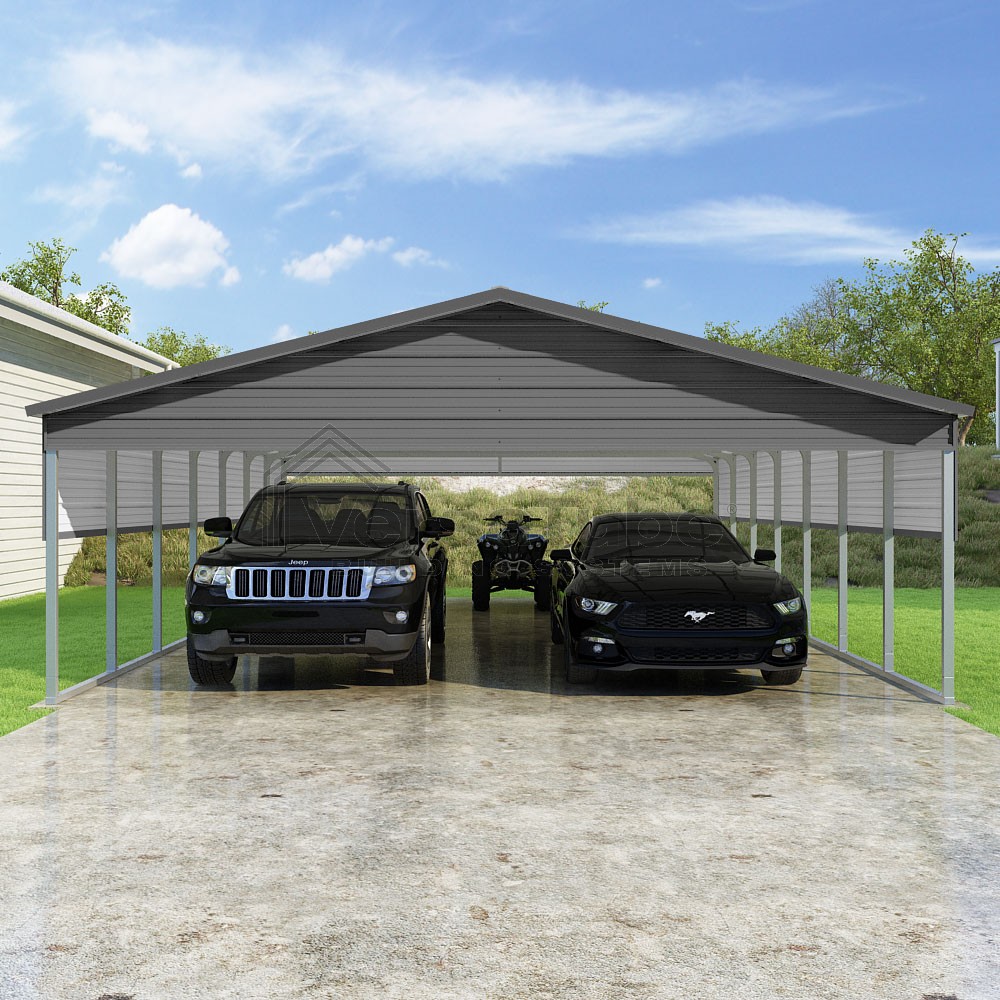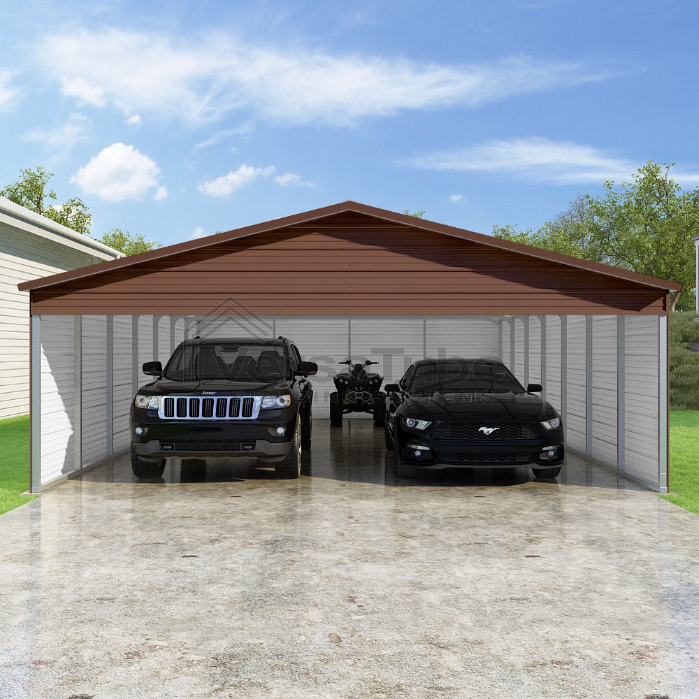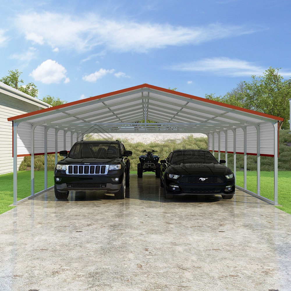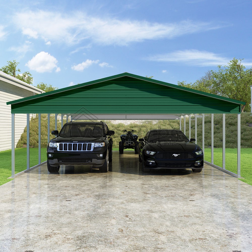 Pinnacle Series DIY carport kit features vertical sheet metal roof panels with ridge cap, gable and eave trim for an A-frame roof style and extended coverage on both ends.