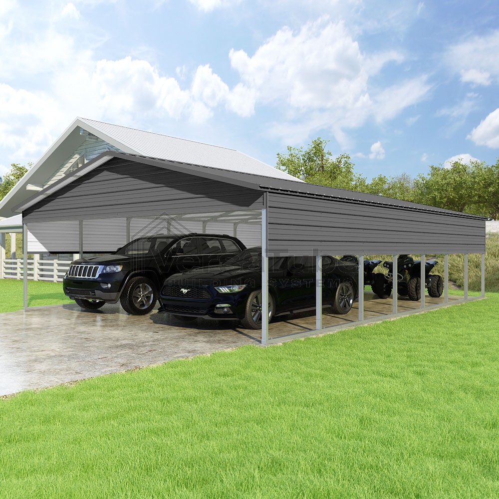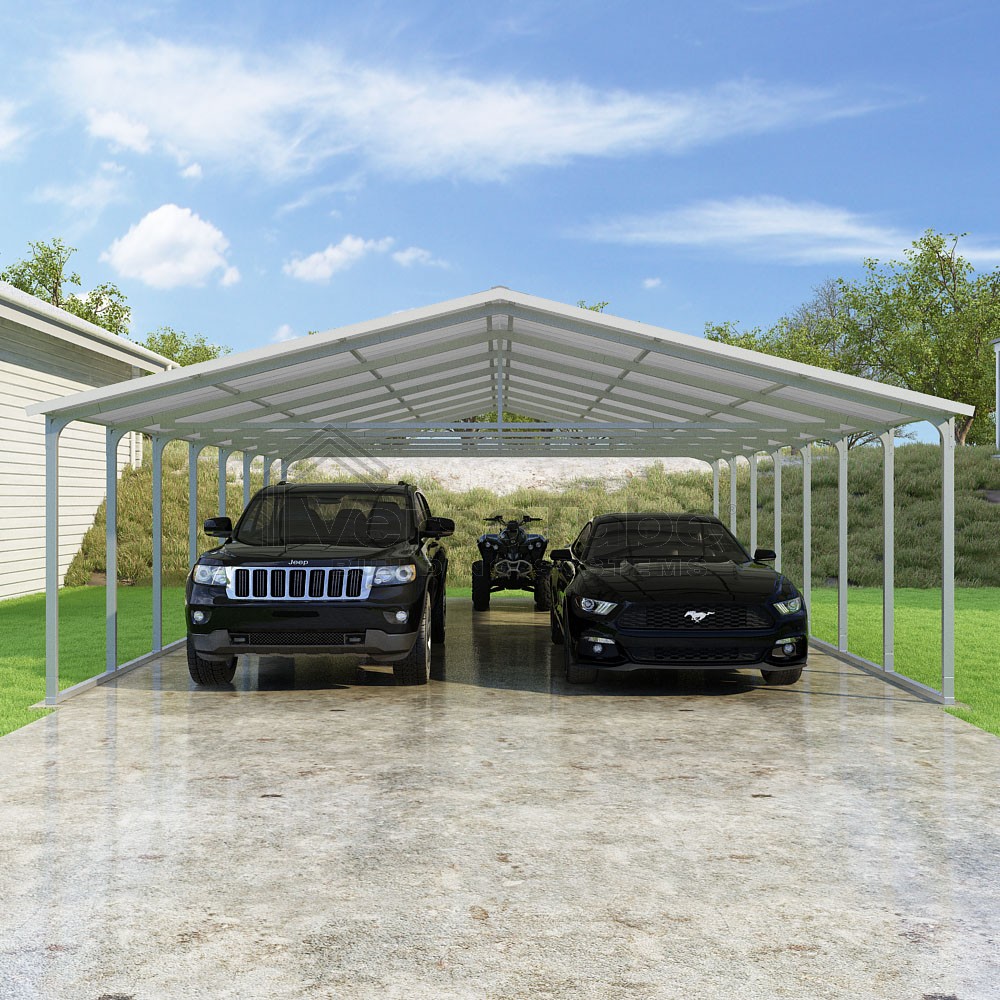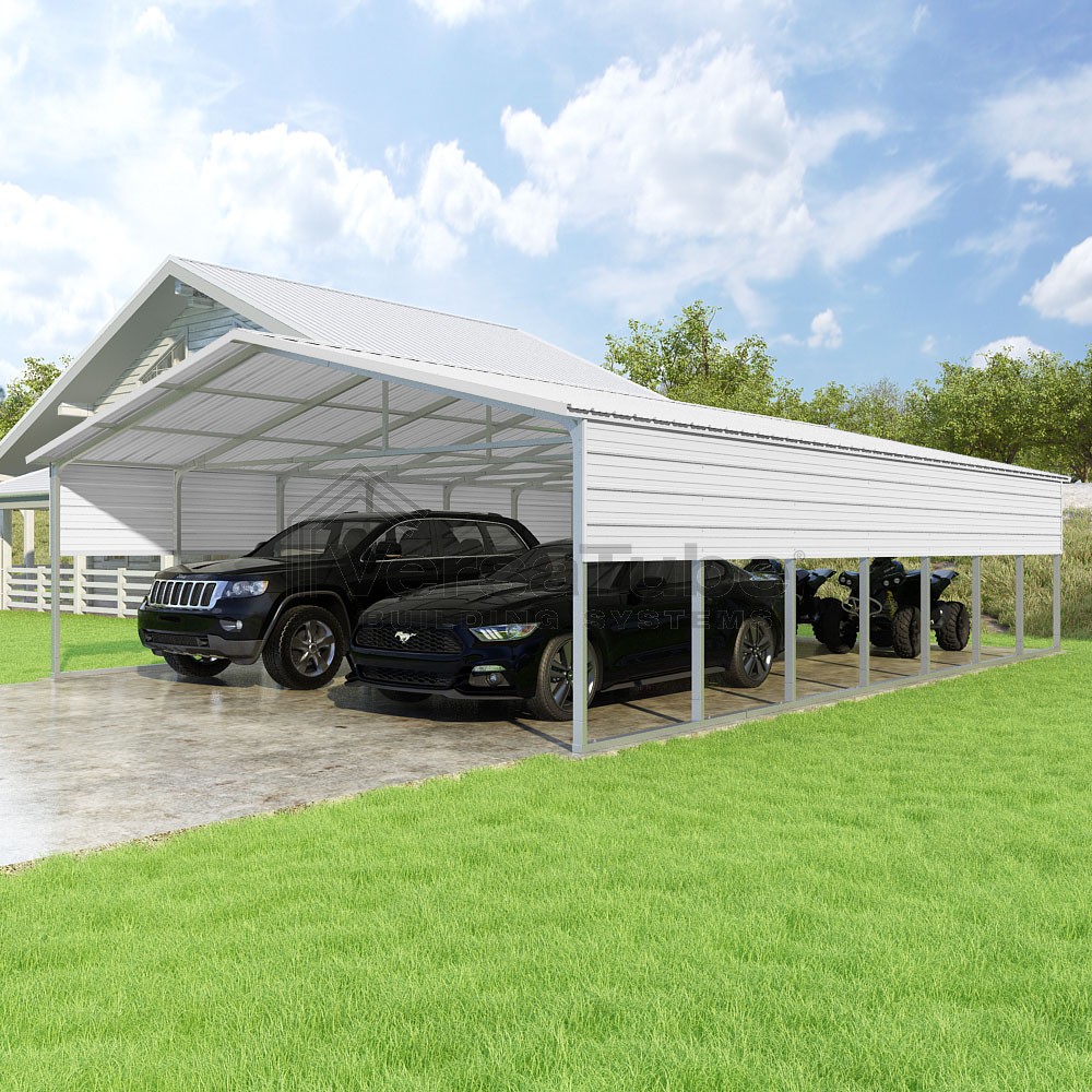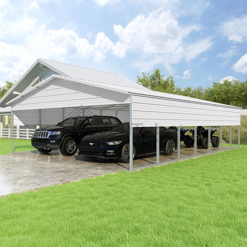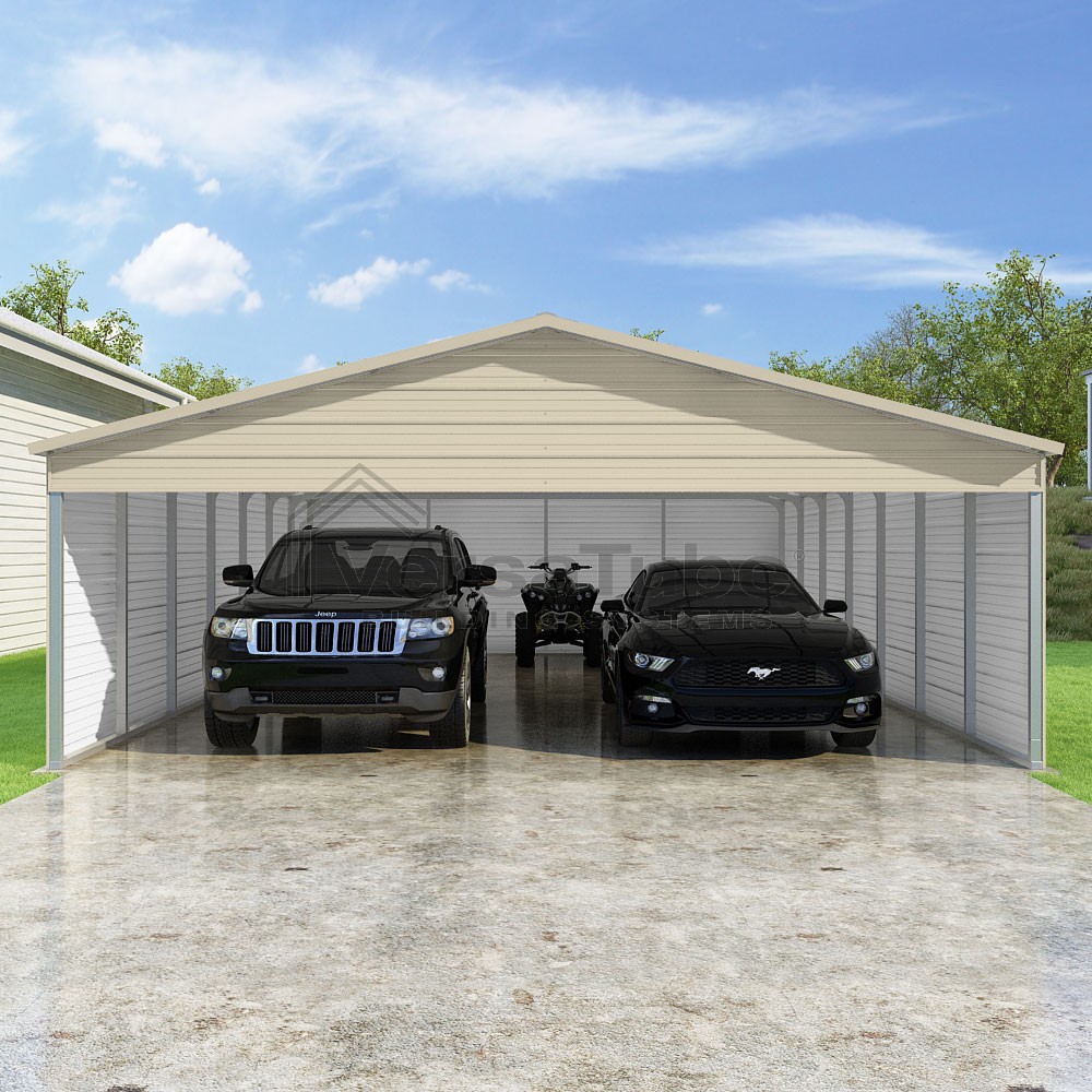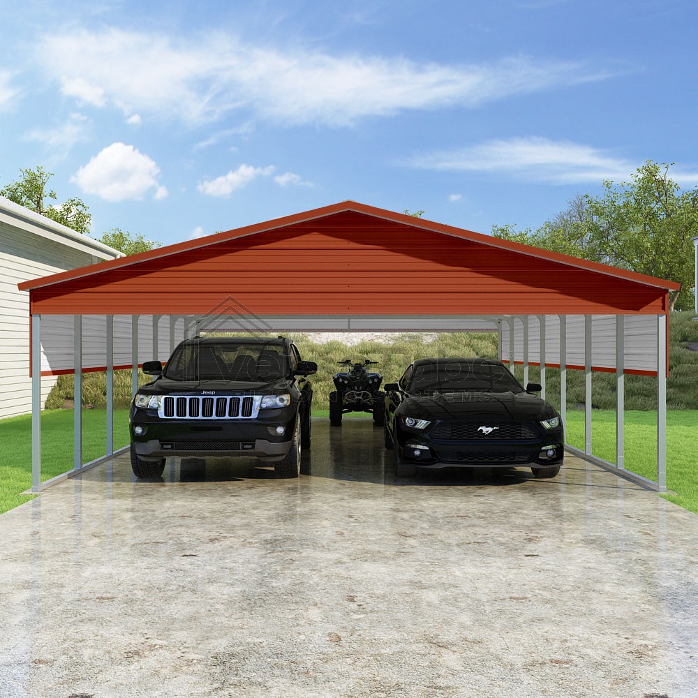 Pinnacle Series DIY carport kit features vertical sheet metal roof panels with ridge cap, gable and eave trim for an A-frame roof style and extended coverage on both ends.