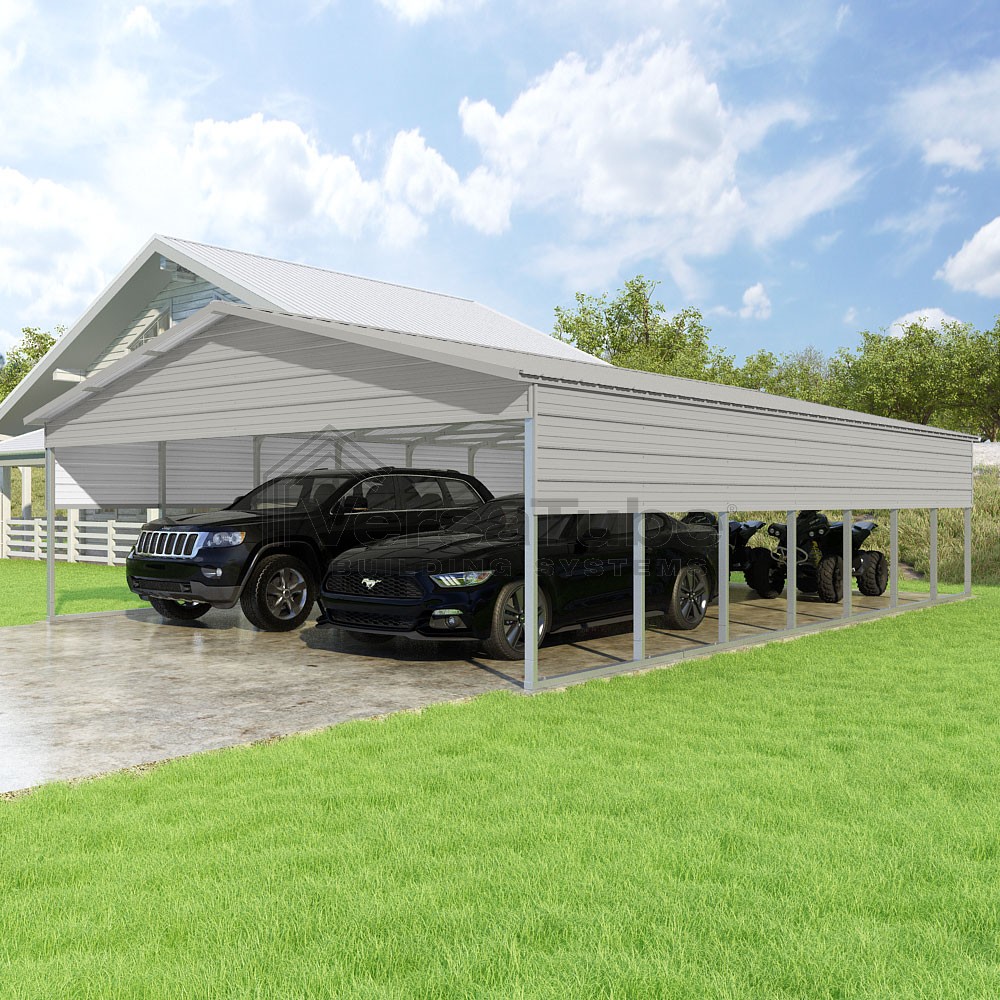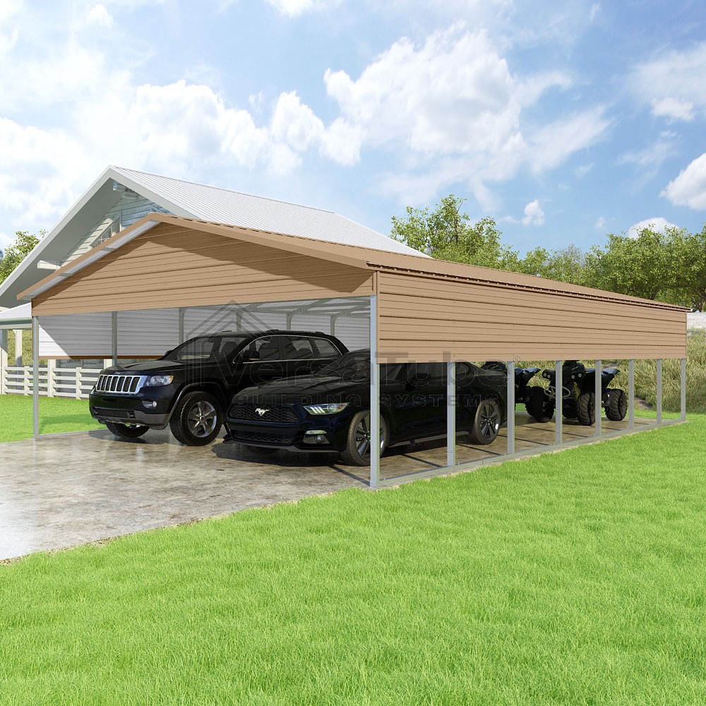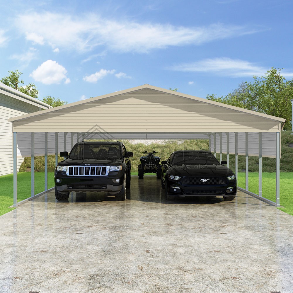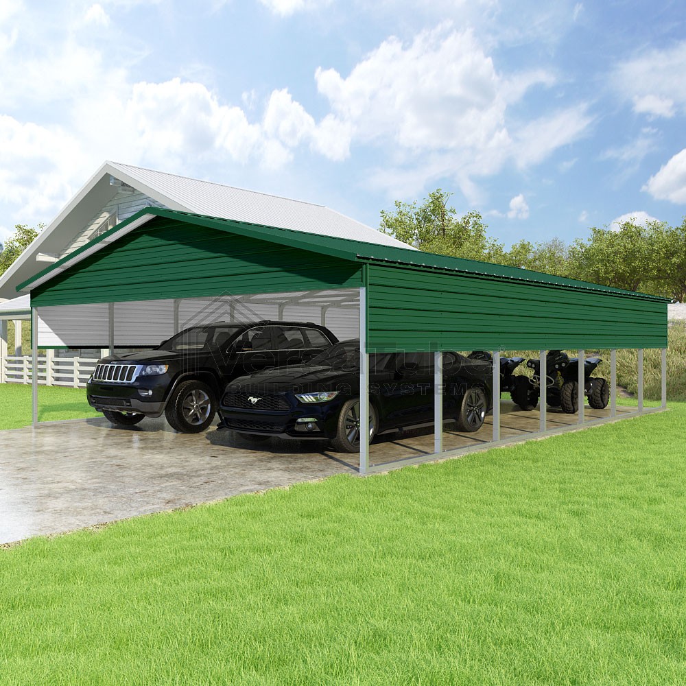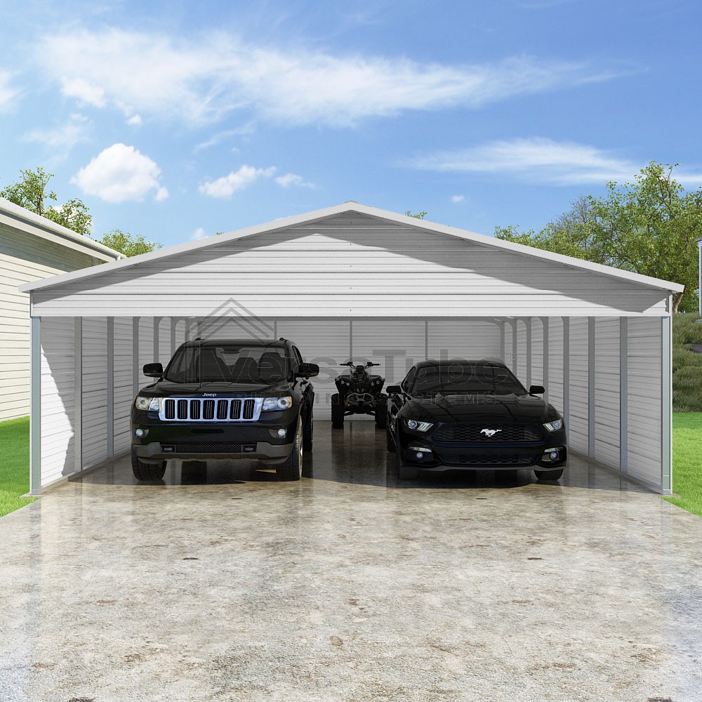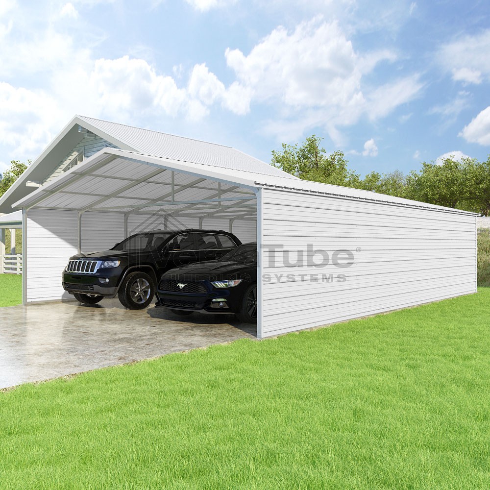Pinnacle Series DIY carport kit features vertical sheet metal roof panels with ridge cap, gable and eave trim for an A-frame roof style and extended coverage on both ends.
